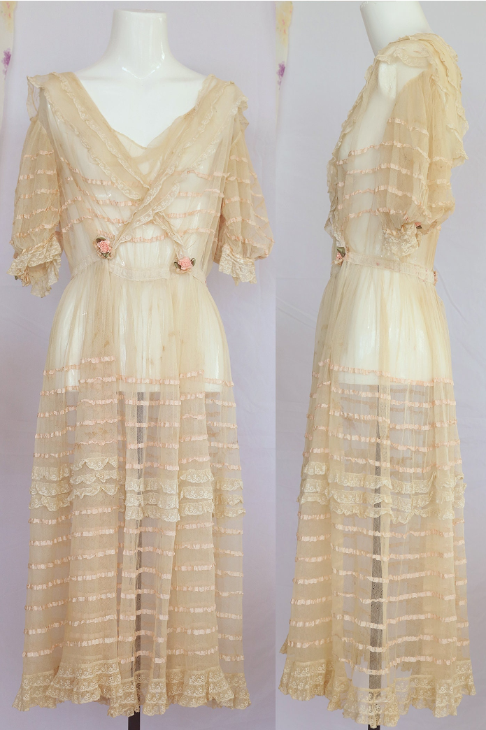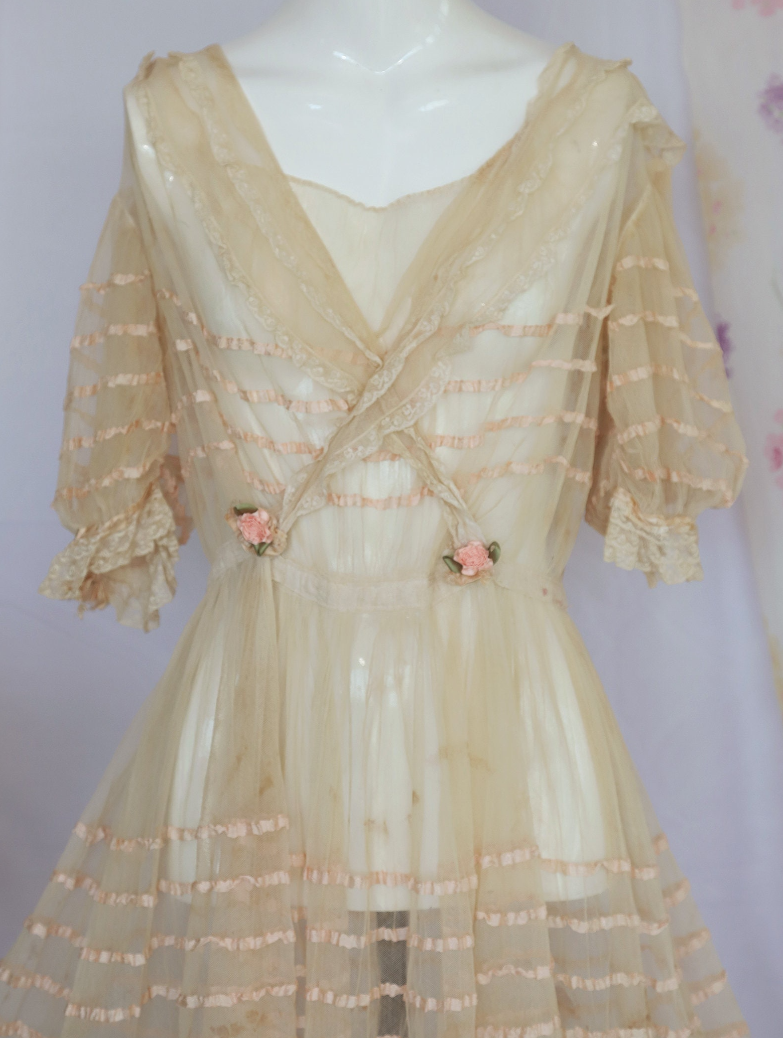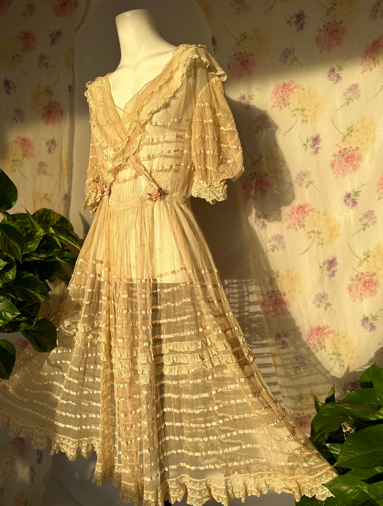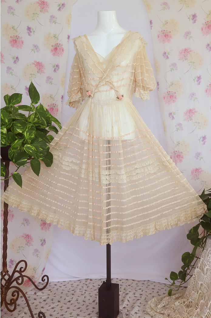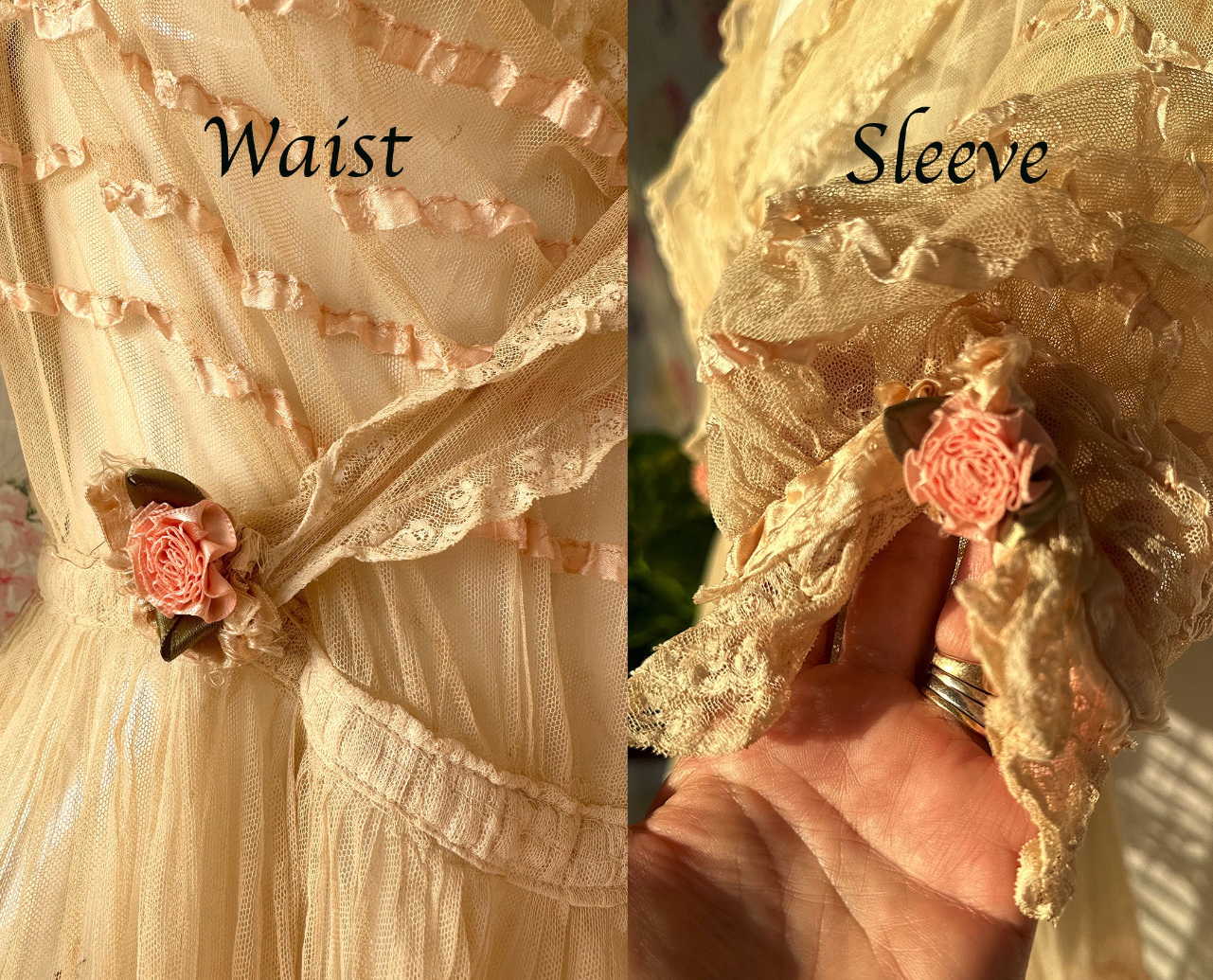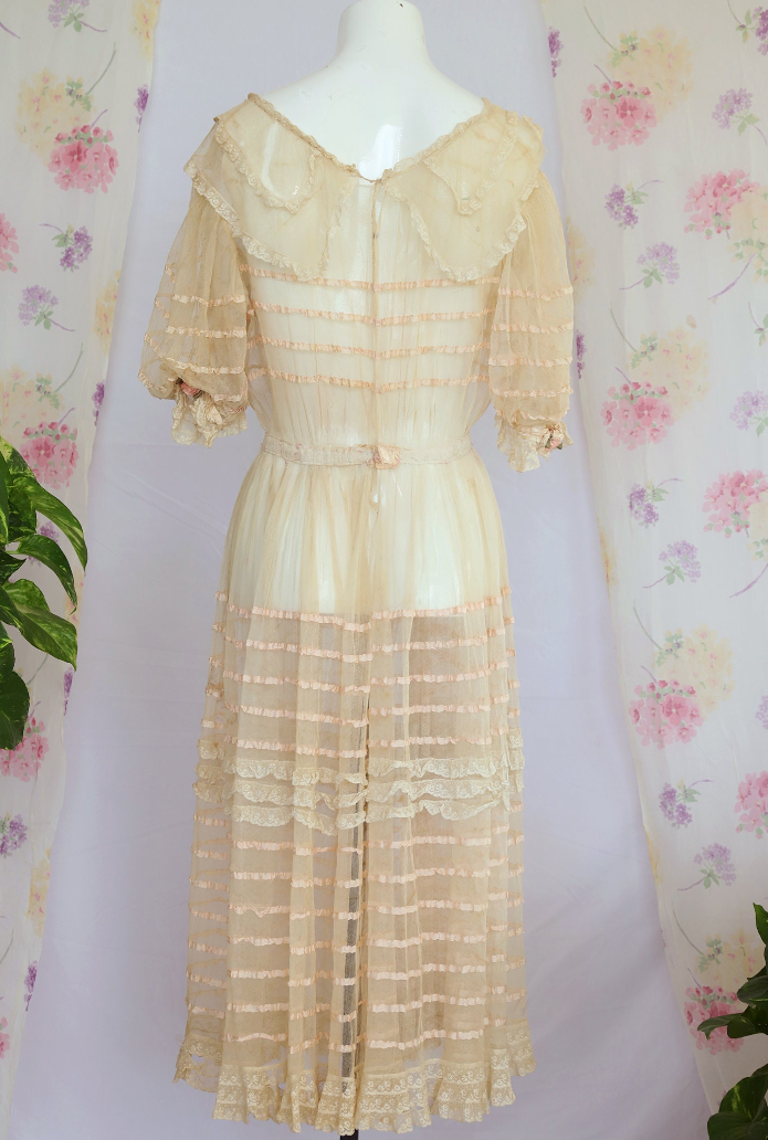 Rare Antique 1900's Peach Edwardian Sheer Netted, Ruffled, Ribboned, and Lace Party Dress. Absolutely magnificent, and hard to let go of! Beautifully romantic to the elbow Poet Sleeves with Peach Stain Lace and Peach Roses at the outside bottom of the sleeves. Gentle Ruffled Neckline with lace trim that Criss Cross across the breasts and end with two more gorgeous Peachy roses and green leaves. The skirt is wide and stunning also with the Peach ribbon throughout, and layers of Lace trim mid skirt and at the hemline. I did repairs at the shoulder where there were holes. There are some stains and discoloration which you can see clearly in the fifth image. They are under the waistline. I also made repairs to the back at the nape of the neck as the fabric separated by the snaps. It is intact now. All original snaps are working and intact. There are some small holes in the left sleeve. I did not try to repair them, as I felt it was too risky. This dress with its few flaws is still unbelievably beautiful and in amazing condition considering it's age.