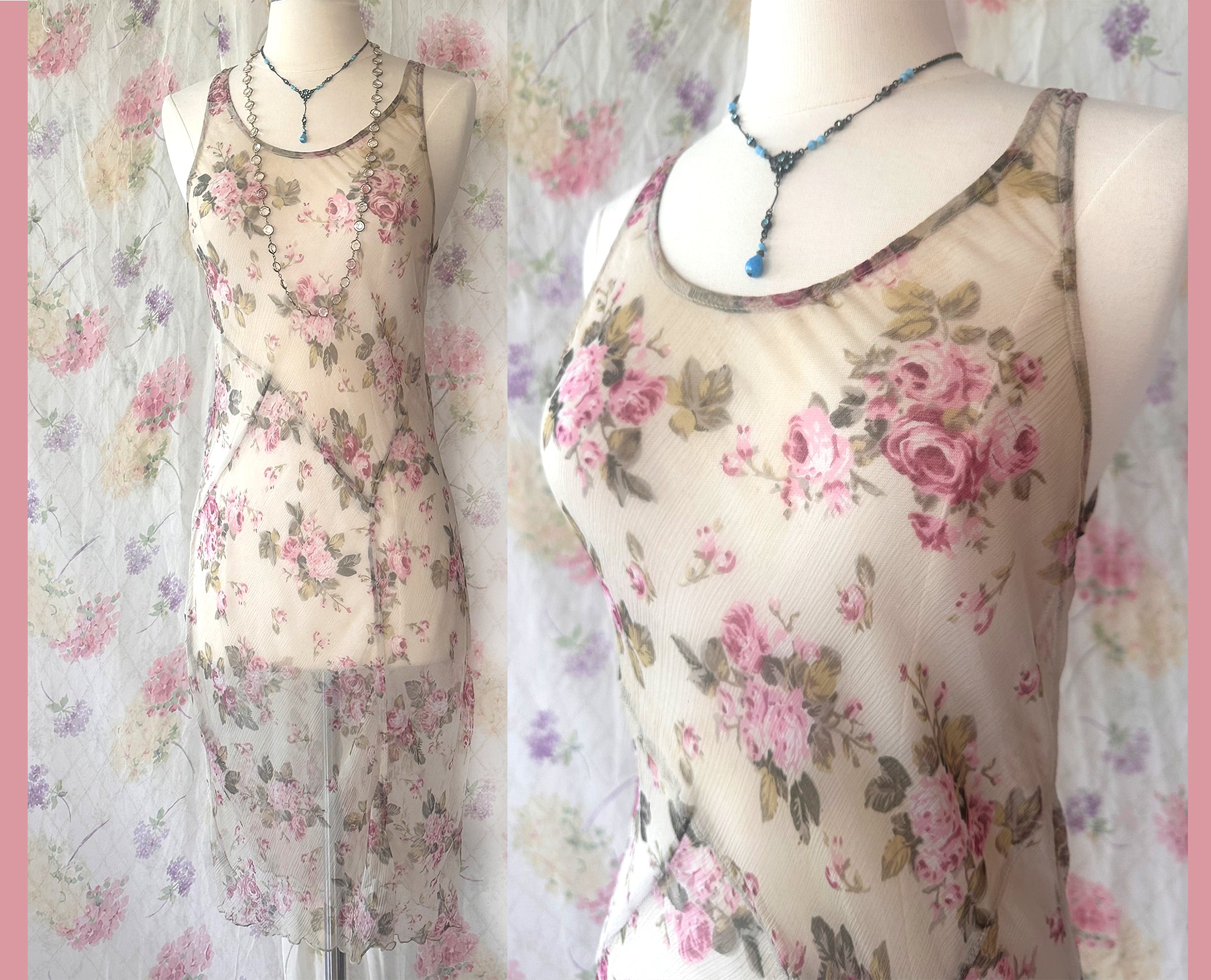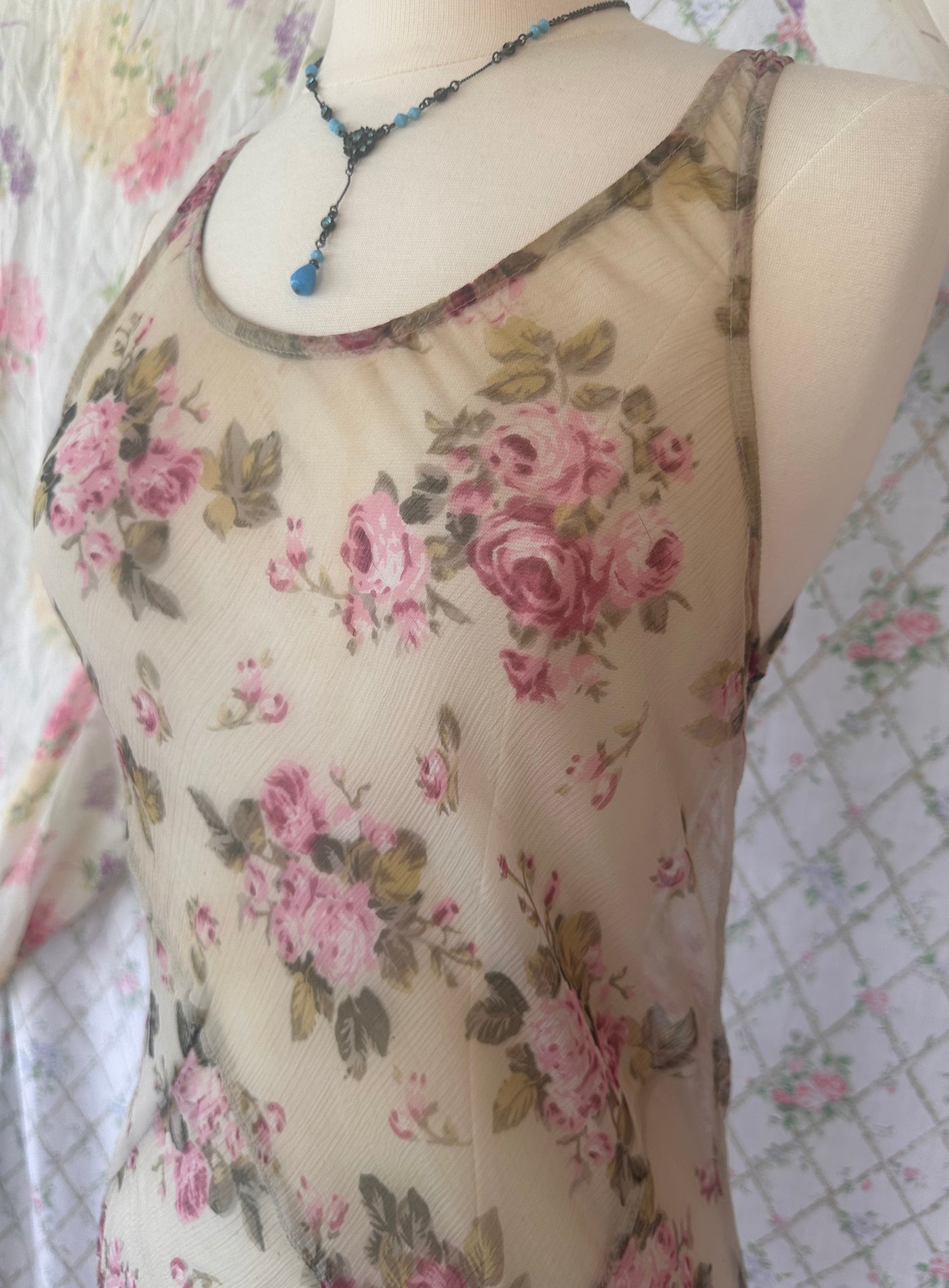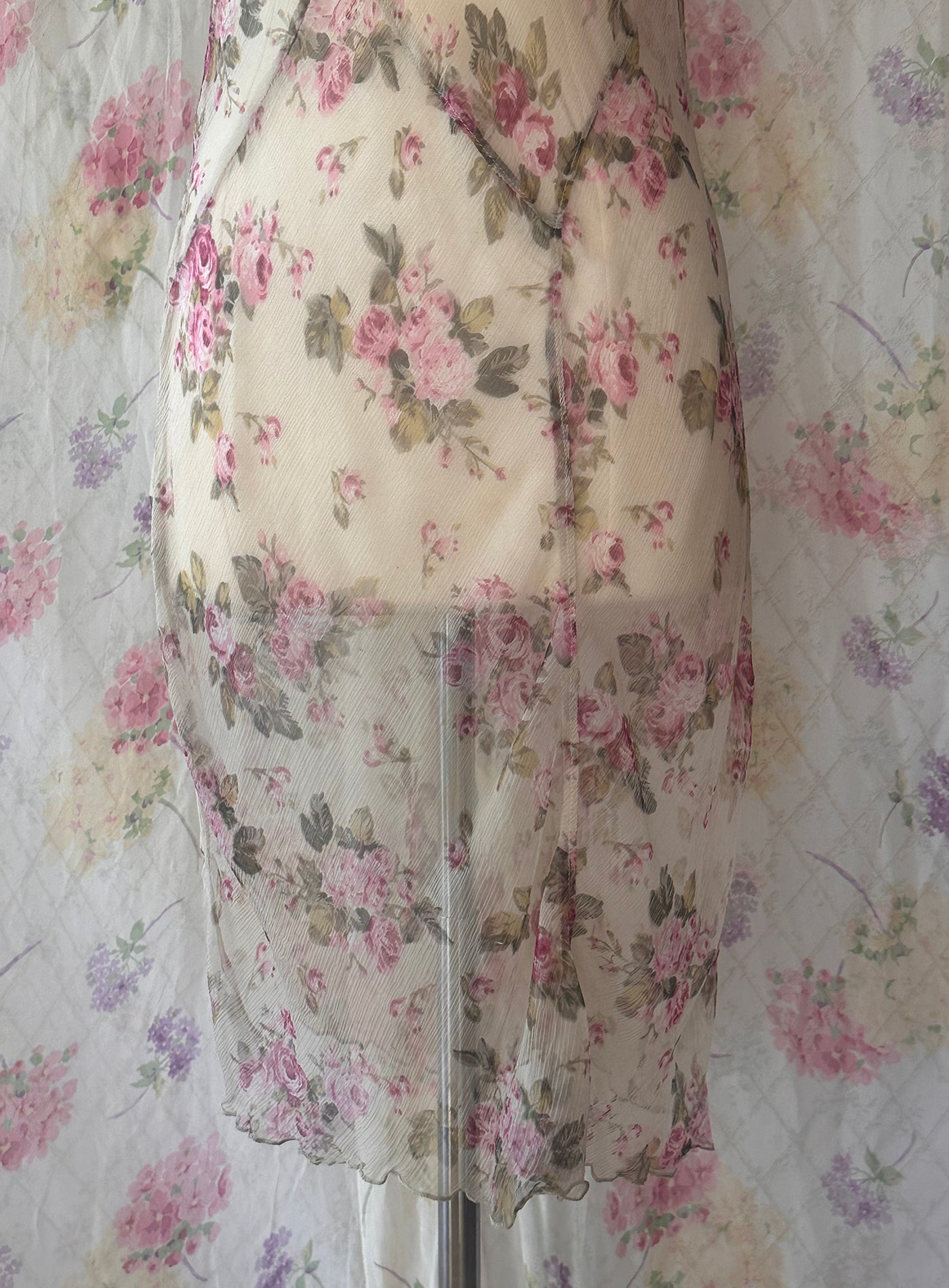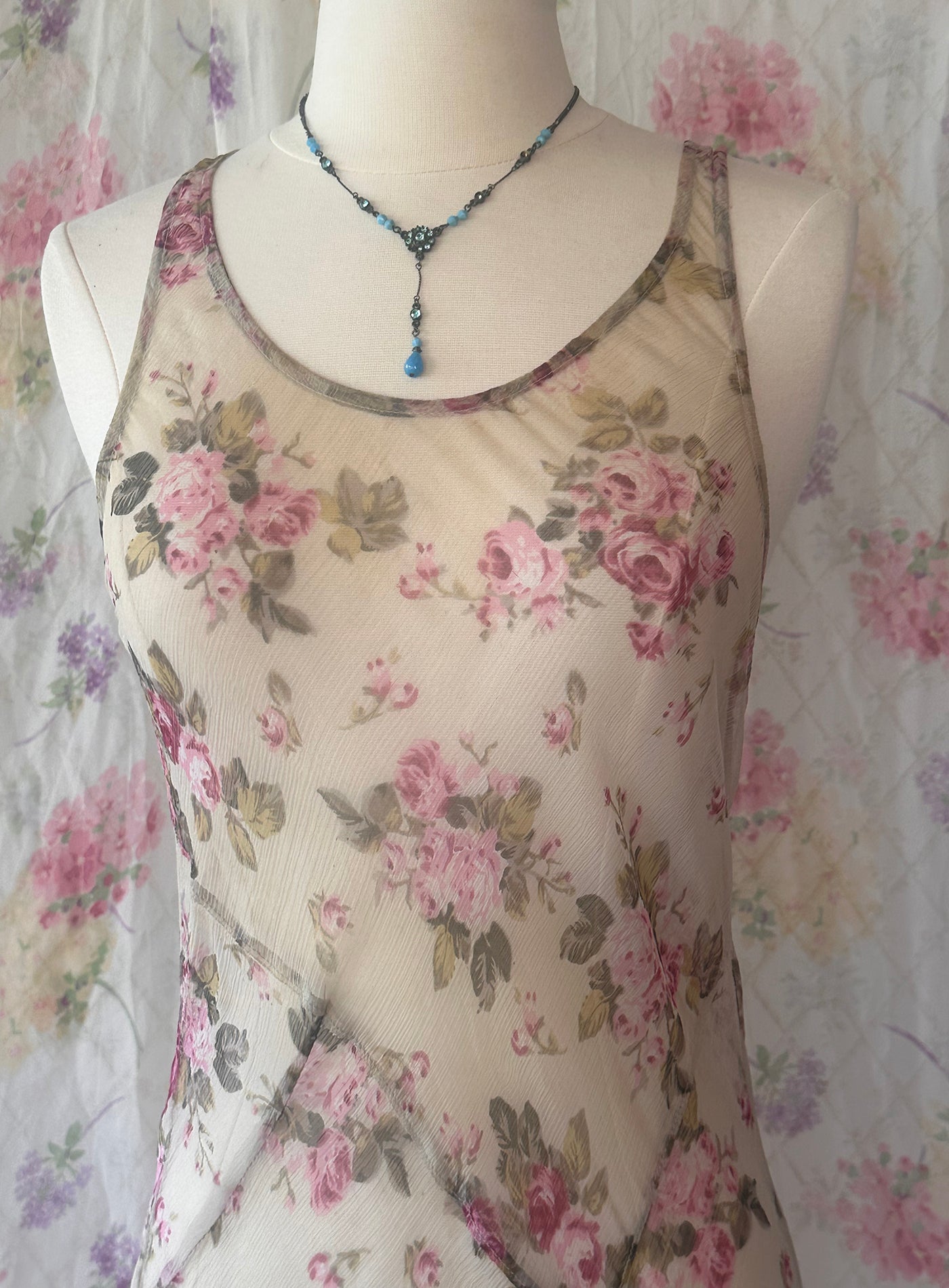 Stunning Floral Sheer Silk Chiffon Vintage 1930s One Of A Kind Slip Slinky Dress with magnificent Bouquets of Pink Roses on a Light Green Background. Scoop Neck. Cut on the Bias, with lovely Decorative V Waist. This dress does have give, I measured pulling material to it's widest dimensions. Wear a light slip underneath for more coverage. Or use under another sheer dress so that the flowers show through.