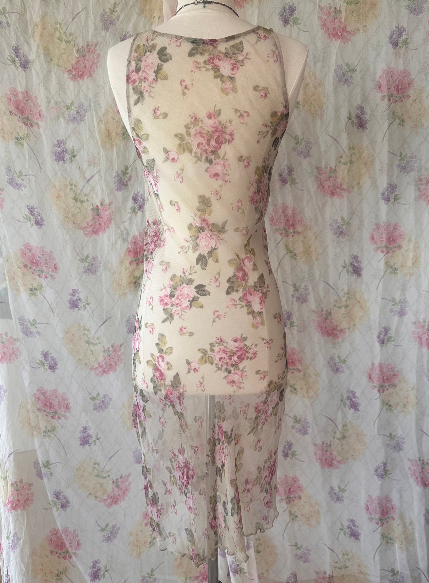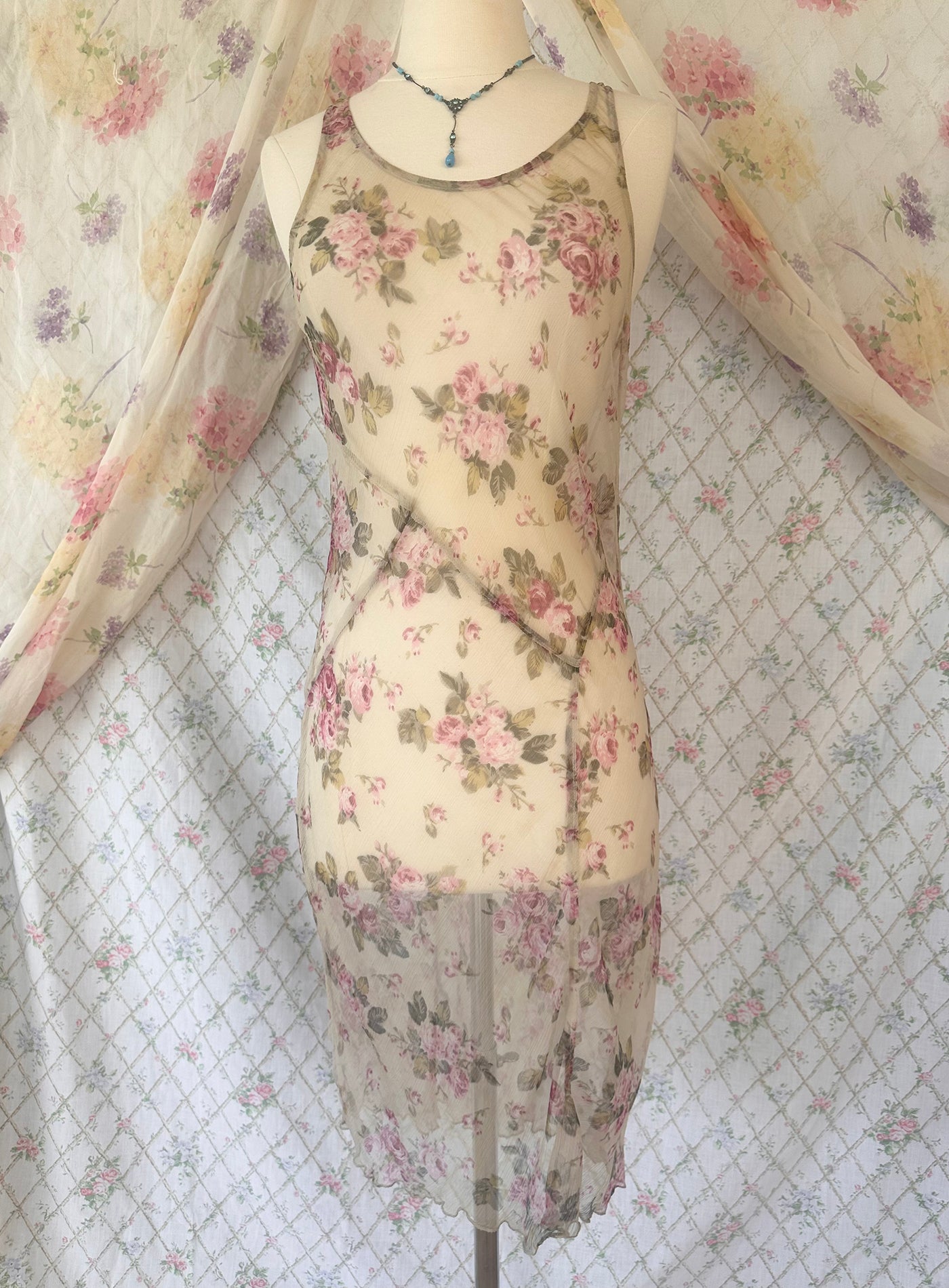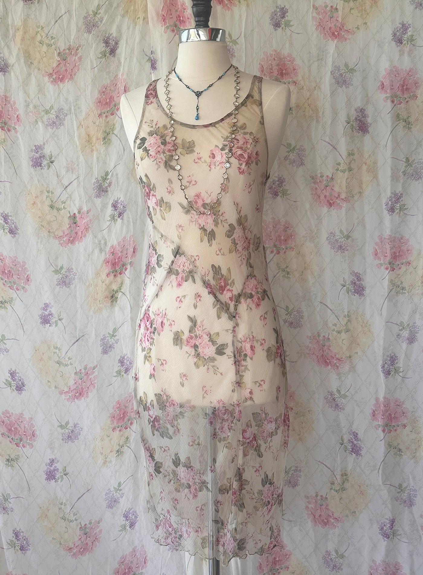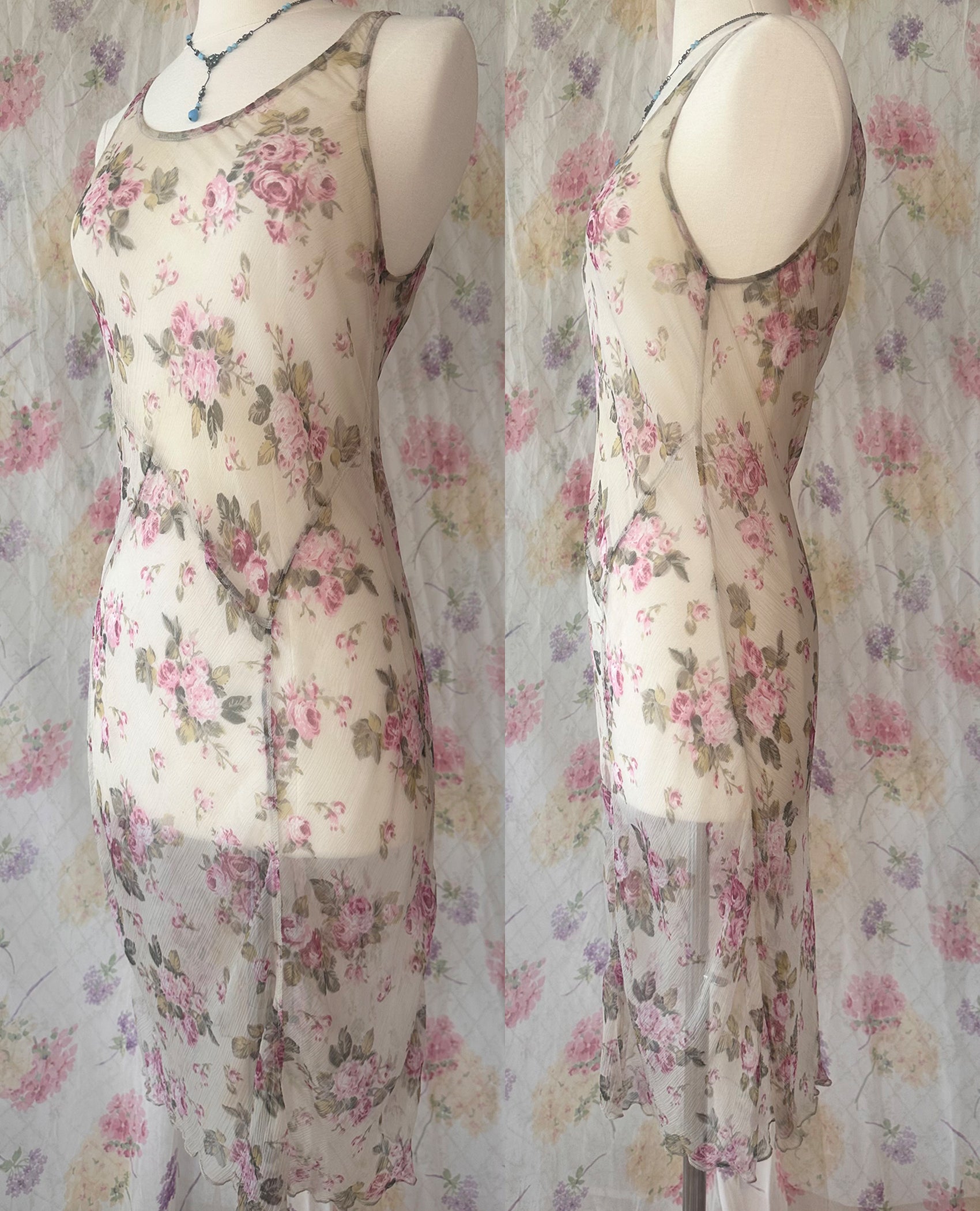 Stunning Floral Sheer Silk Chiffon Vintage 1930s One Of A Kind Slip Slinky Dress with magnificent Bouquets of Pink Roses on a Light Green Background. Scoop Neck. Cut on the Bias, with lovely Decorative V Waist. This dress does have give, I measured pulling material to it's widest dimensions. Wear a light slip underneath for more coverage. Or use under another sheer dress so that the flowers show through.