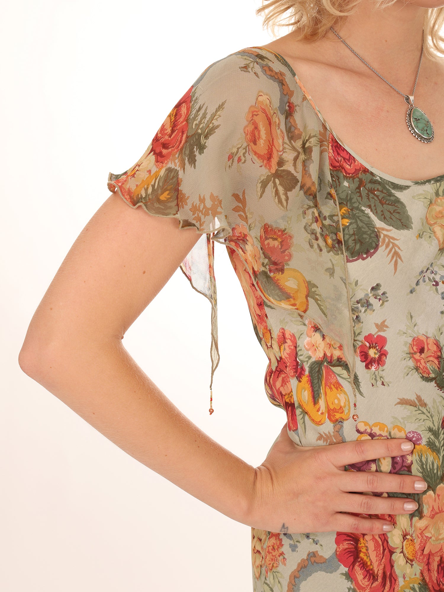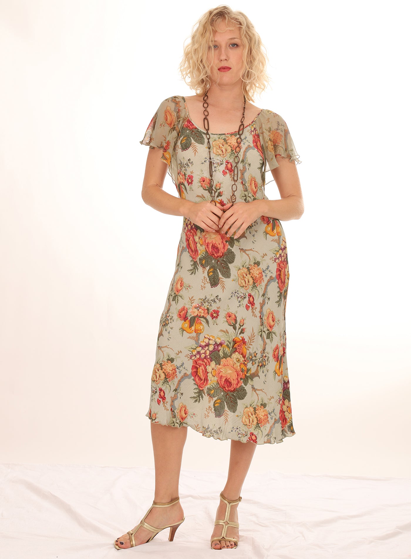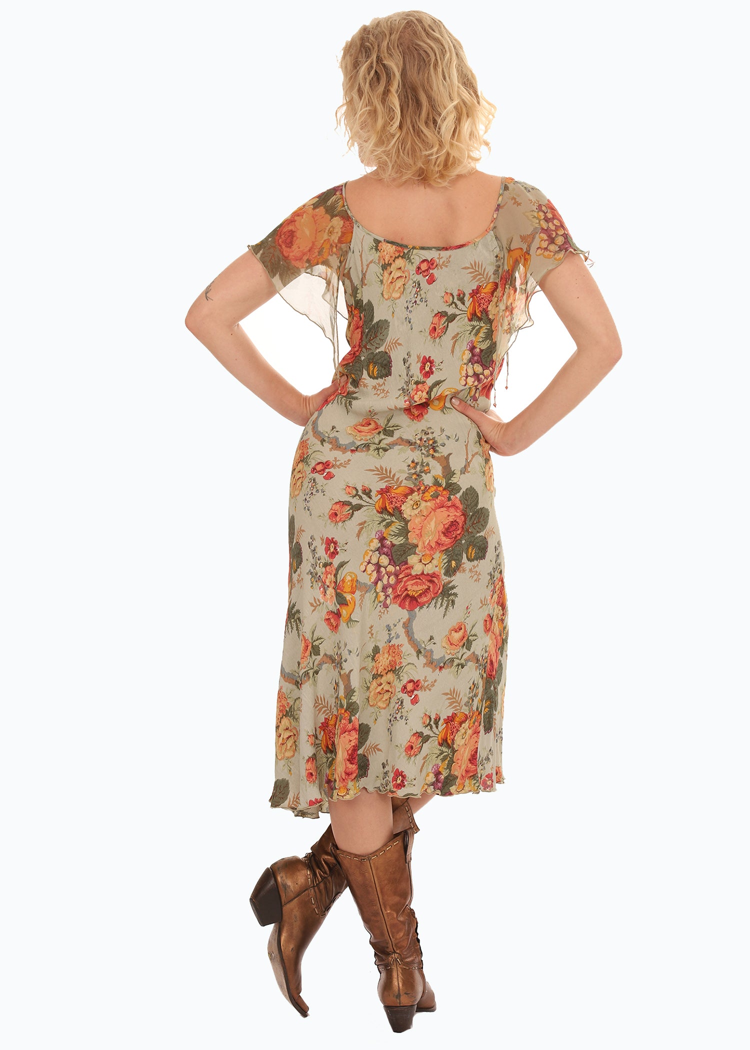 Vintage 1980s Green Rose Floral Flutter Sleeve Dress with gorgeous bouquets of Roses in shades of Orange, Yellow, and Green, with small beading and end of sleeves. Lightweight flowy Rayon fabric. Dress up with heels or with a pair of boots.