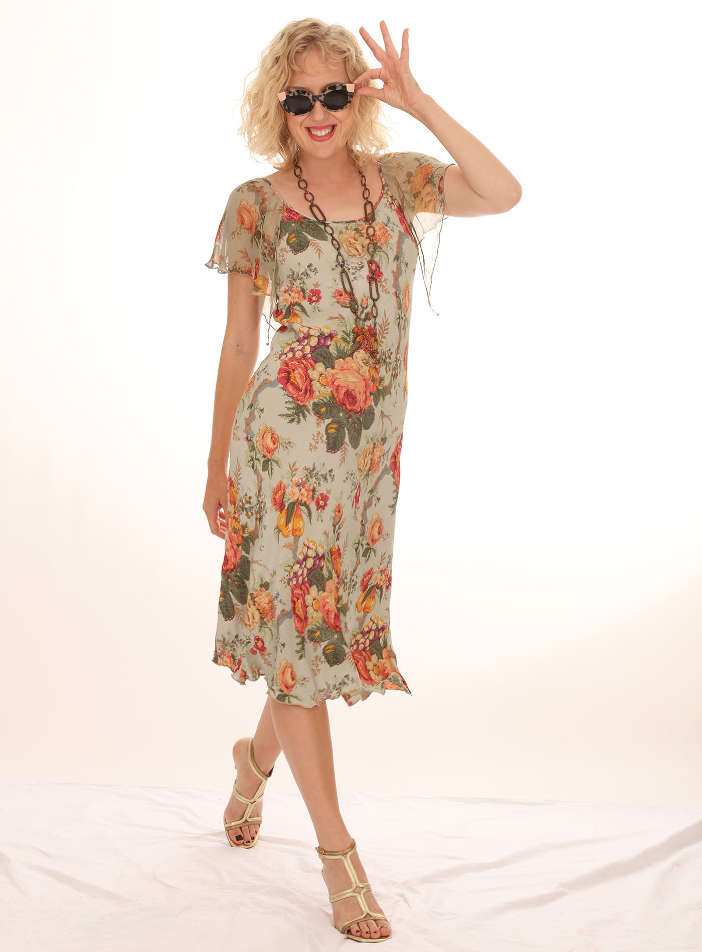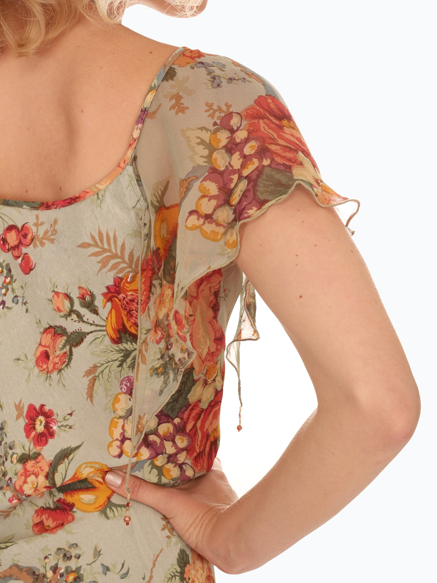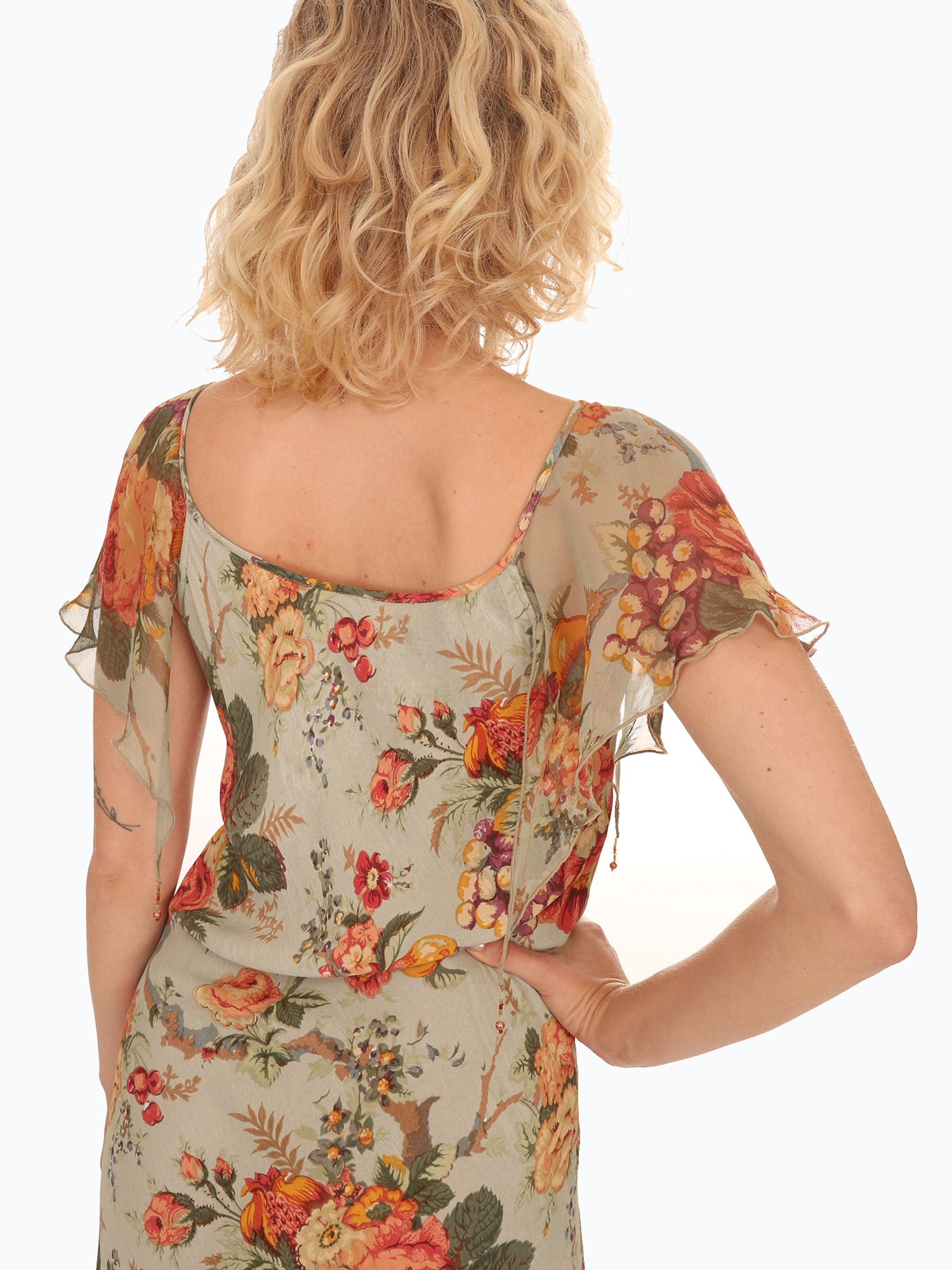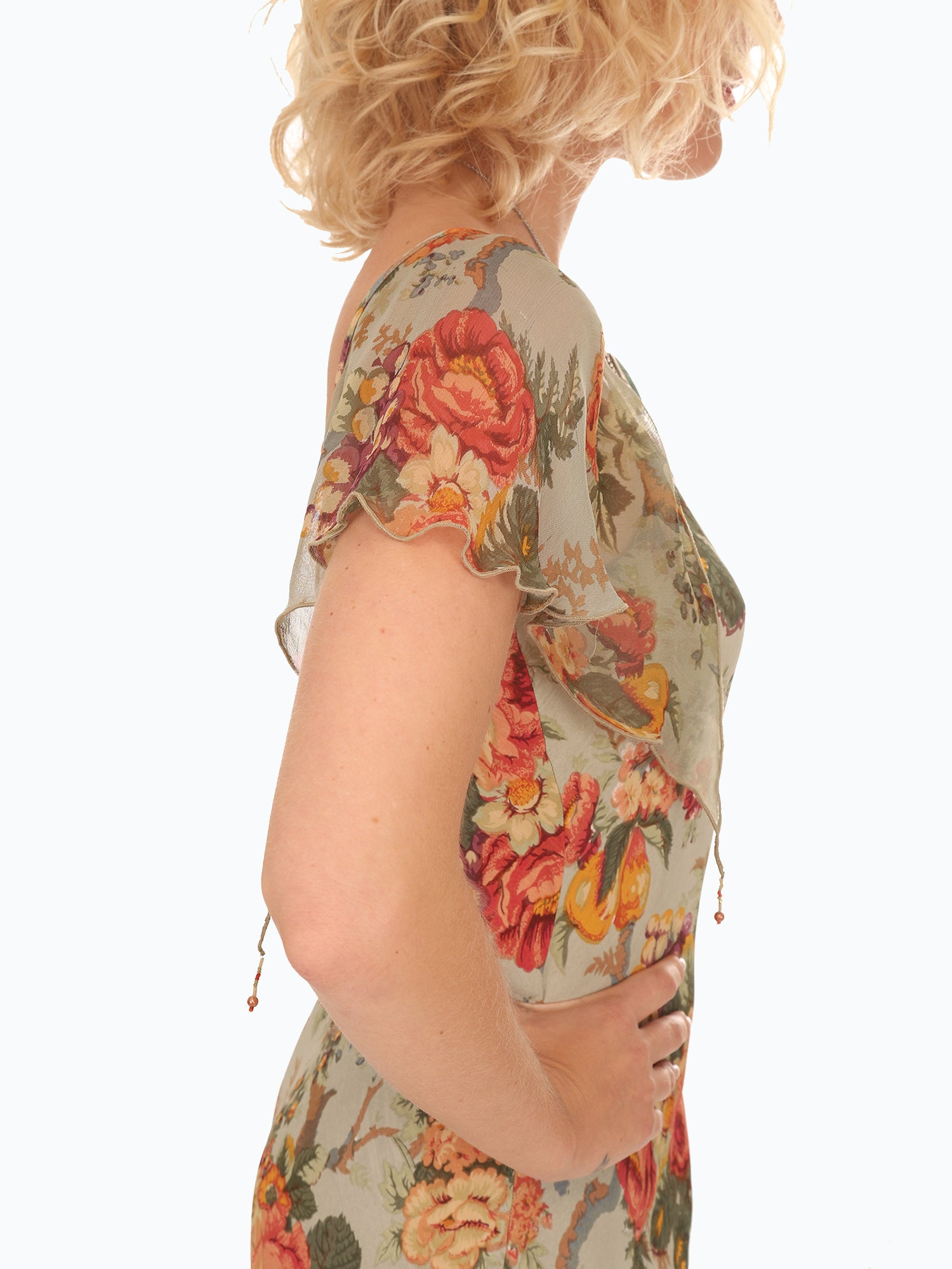 Vintage 1980s Green Rose Floral Flutter Sleeve Dress with gorgeous bouquets of Roses in shades of Orange, Yellow, and Green, with small beading and end of sleeves. Lightweight flowy Rayon fabric. Dress up with heels or with a pair of boots.