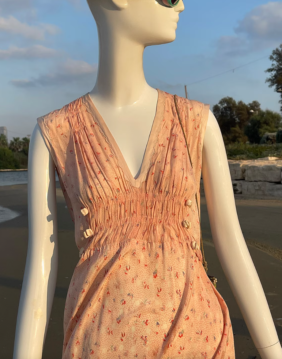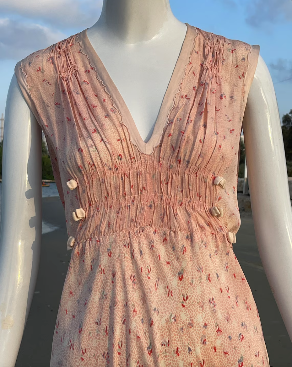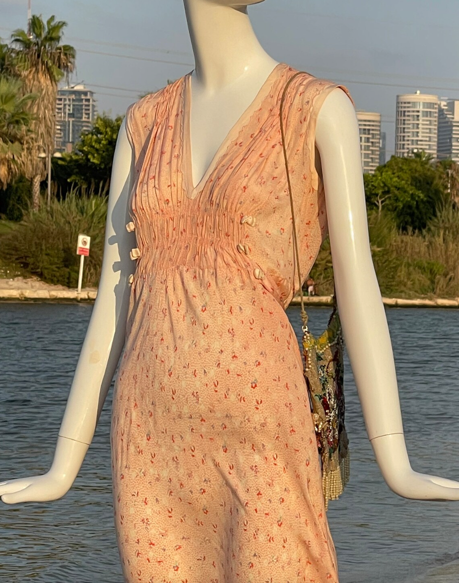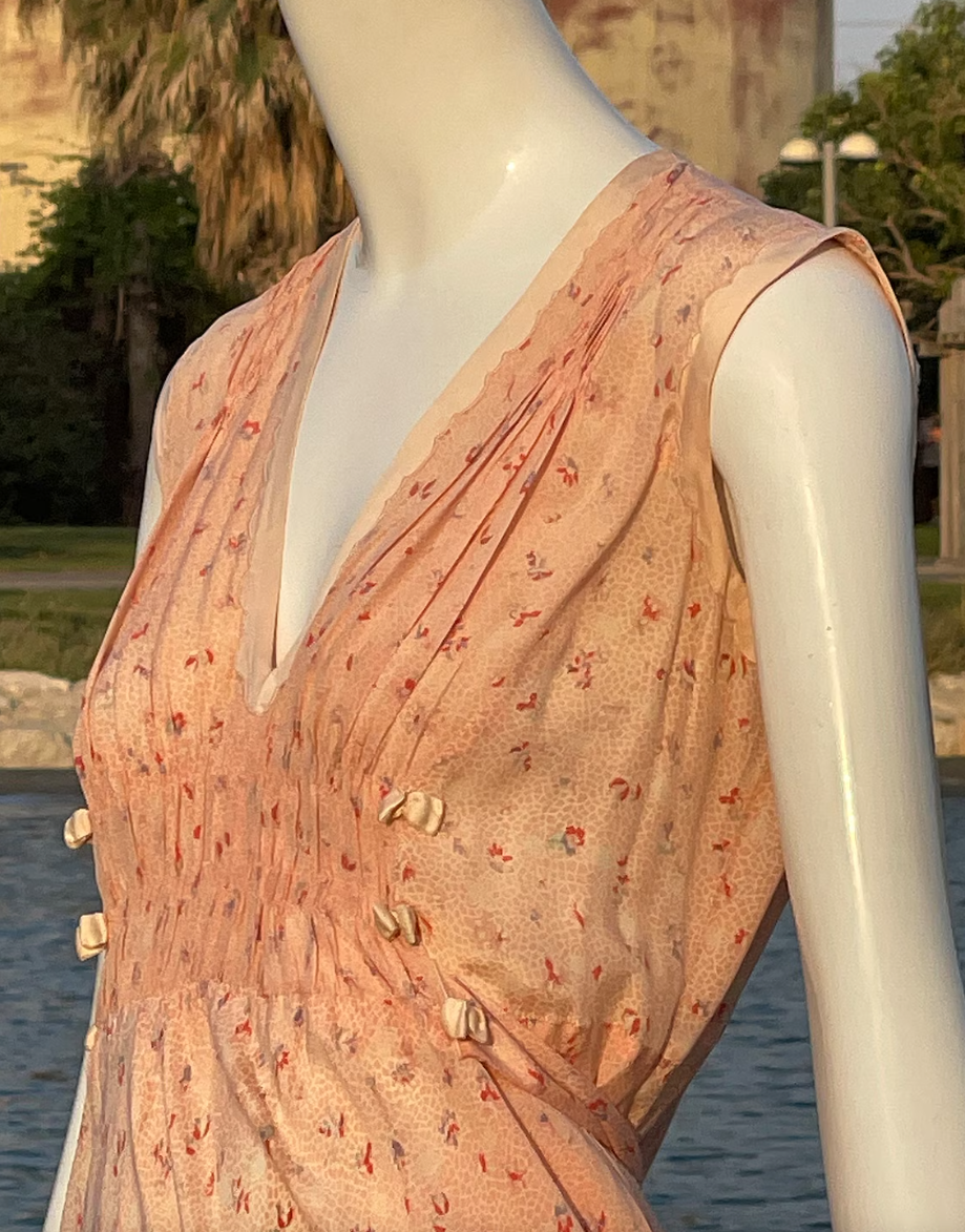 Vintage 1940s Peach Floral Tie Back Slip On Dress with Beautiful Detail. V Neck with Gorgeous Puckered Apron beneath the breast decorated with small peach satiny bows. Also puckered at the shoulders. Just an incredible piece. So light and flowy and feels so great on. Light, airy and so ultra feminine. **PLEASE NOTE THIS DRESS IS NOT RETURNABLE. Please feel free to ask me any questions and check measurements against your body measurements to assure a proper fit.**