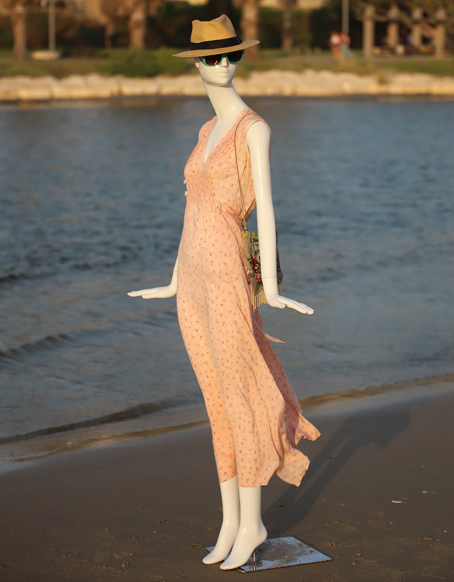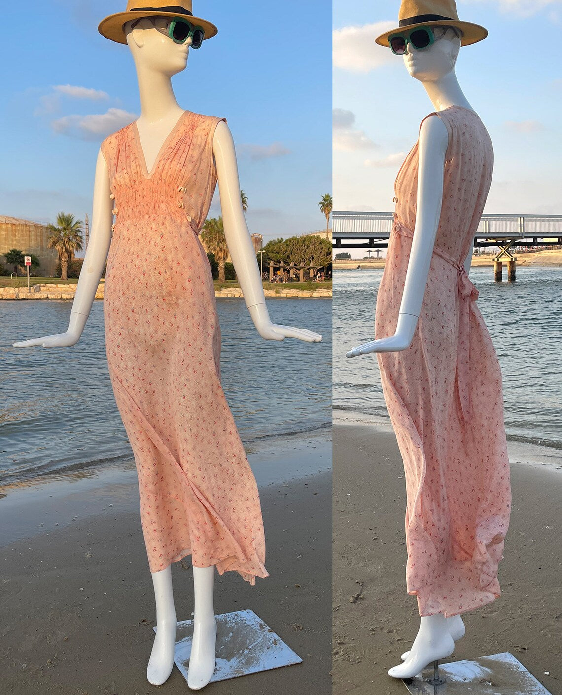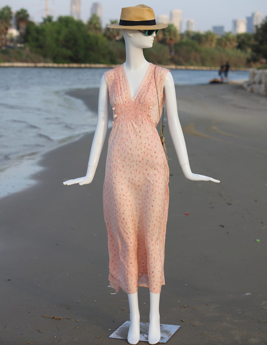 Vintage 1940s Peach Floral Tie Back Slip On Dress with Beautiful Detail. V Neck with Gorgeous Puckered Apron beneath the breast decorated with small peach satiny bows. Also puckered at the shoulders. Just an incredible piece. So light and flowy and feels so great on. Light, airy and so ultra feminine. **PLEASE NOTE THIS DRESS IS NOT RETURNABLE. Please feel free to ask me any questions and check measurements against your body measurements to assure a proper fit.**
