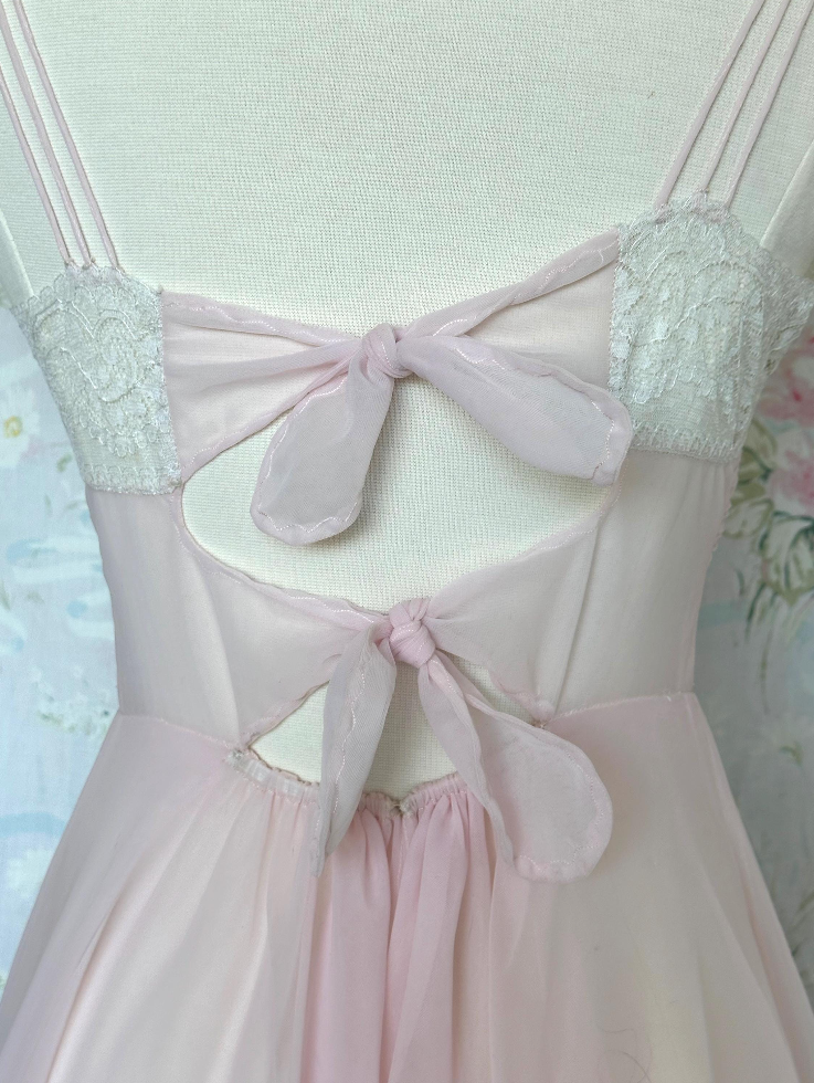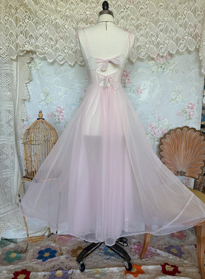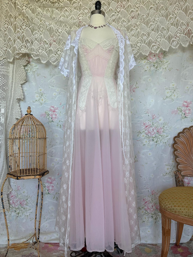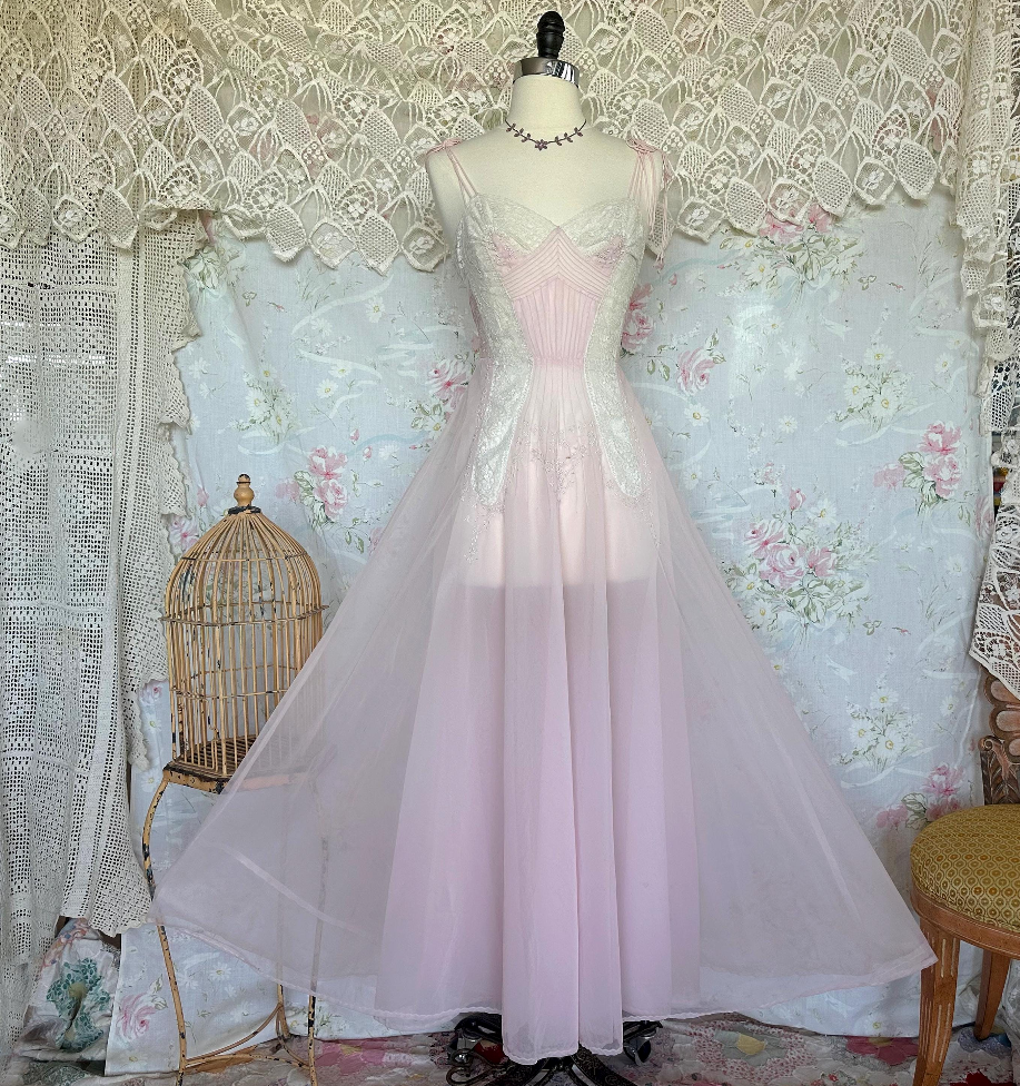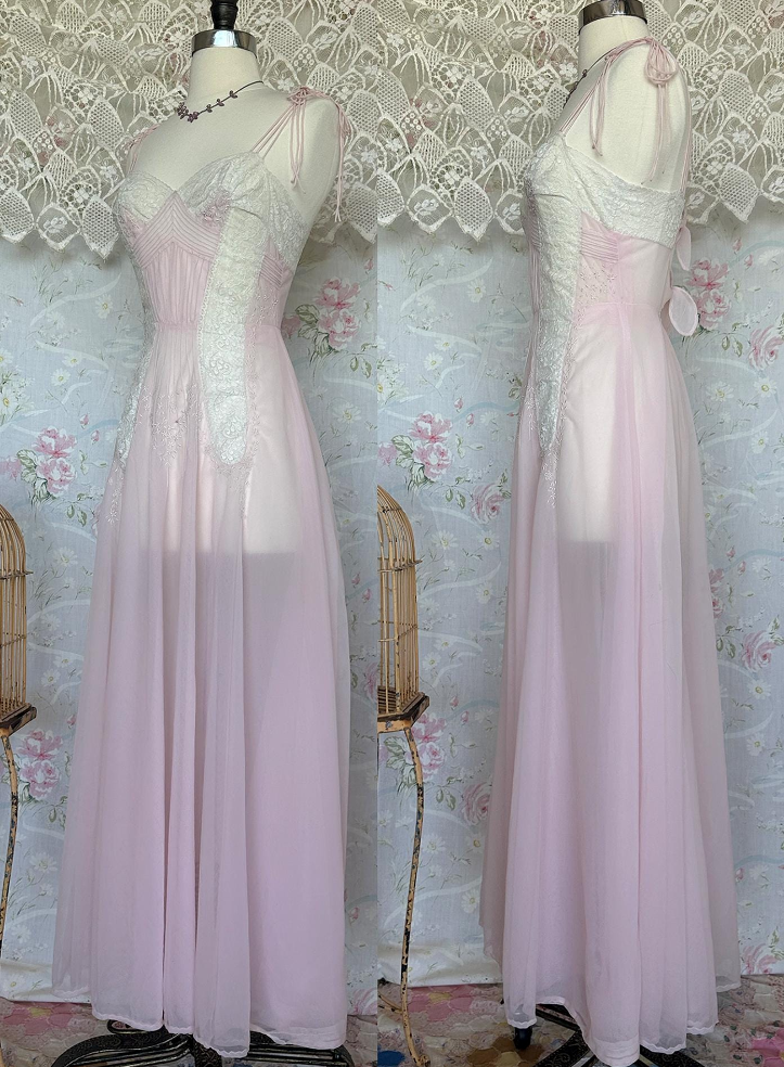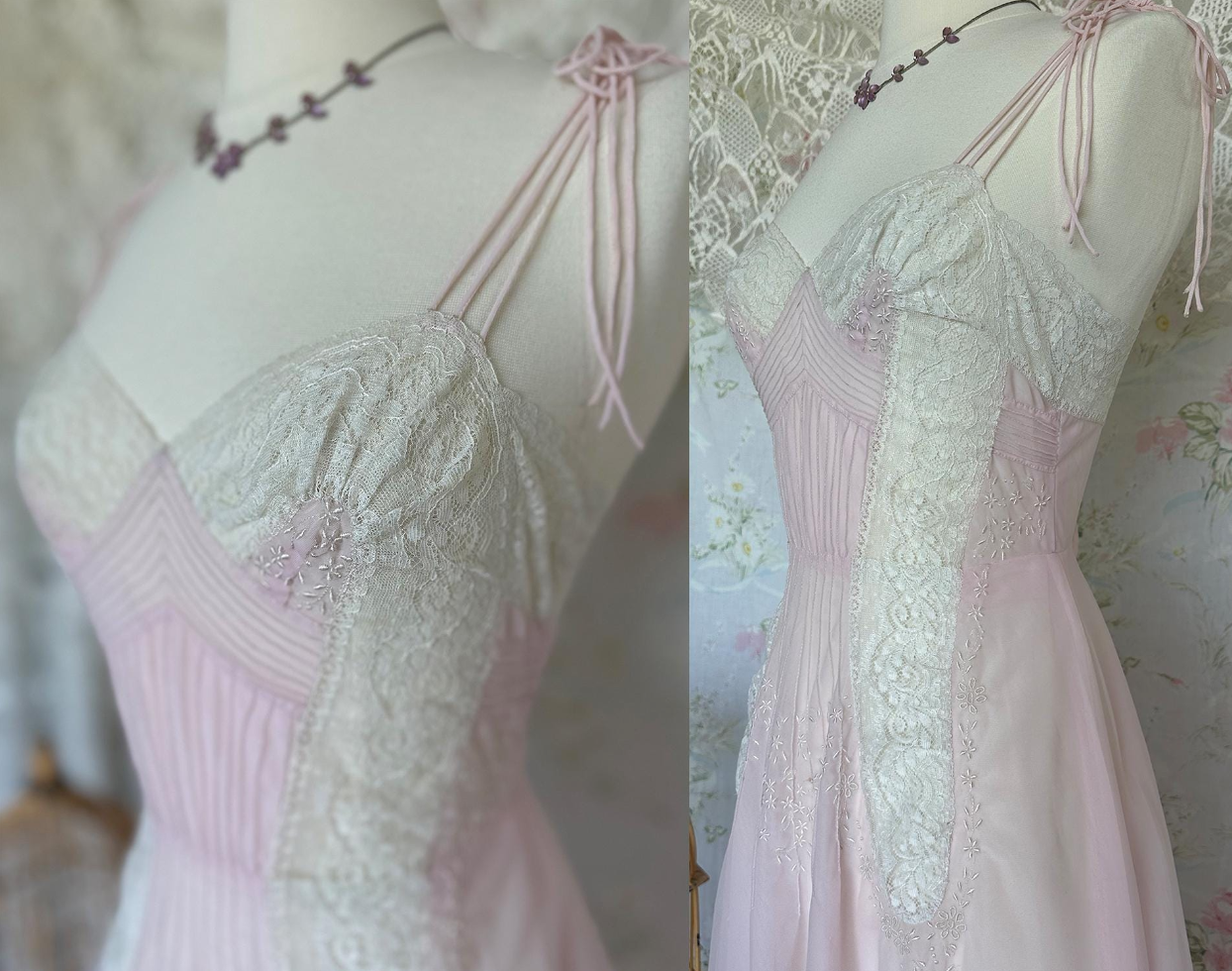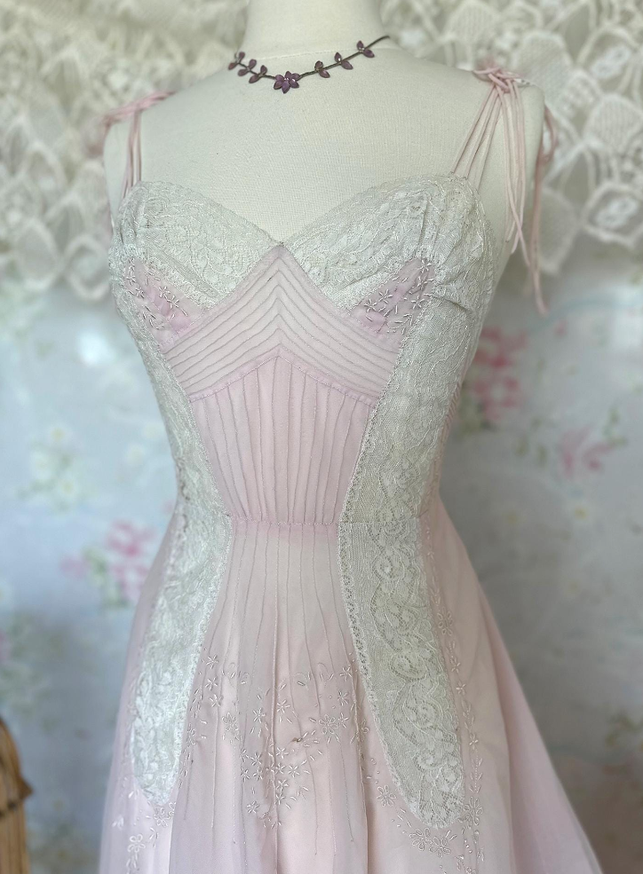 Vintage 1940s Ballet Pink Pleated Lace with Floral Embroidered flowers, triple spaghetti straps that tie at the top with fitted bodice that open up into a beautiful full sweep skirt, sweetheart lace Neckline with stunning gentle pleating to the waist, open back that ties together with two bows. There is some elastic in the back waist and a hook closure. One of the most beautiful nightgown, slips I have ever encountered. Too beautiful to keep in the bedroom really! I also show with a lace duster robe that will be sold separately. So beautiful you will want to keep it out to look at it. I have had it out in my living room for weeks!