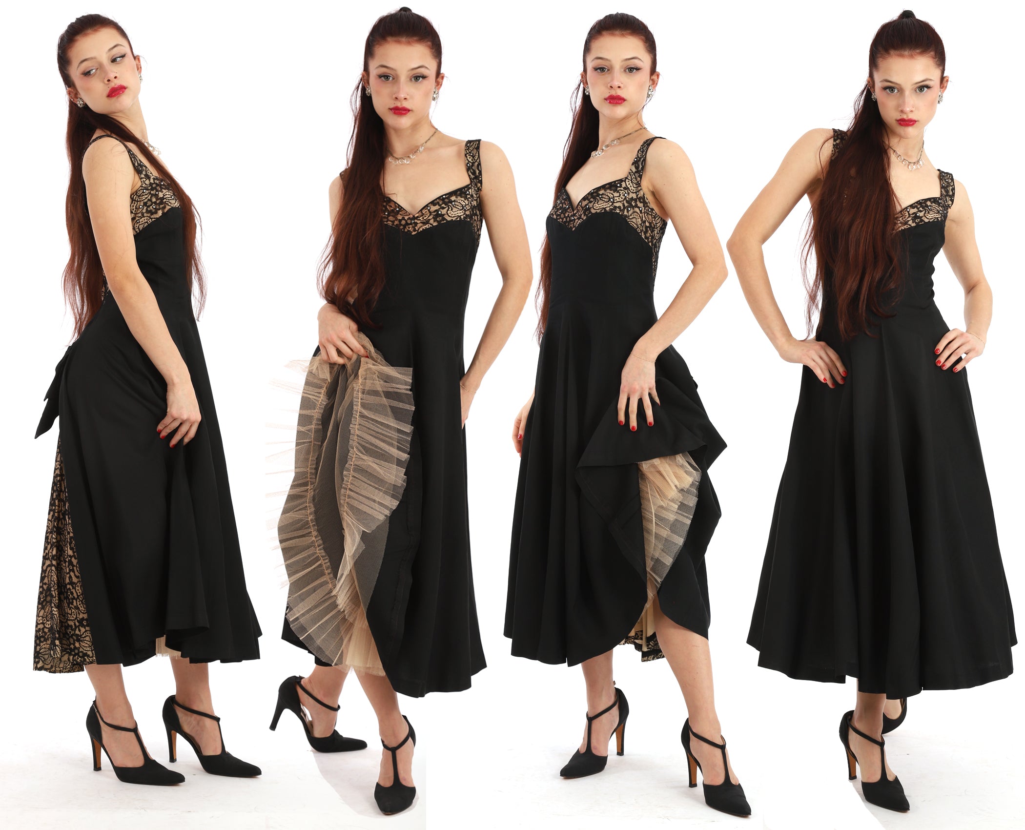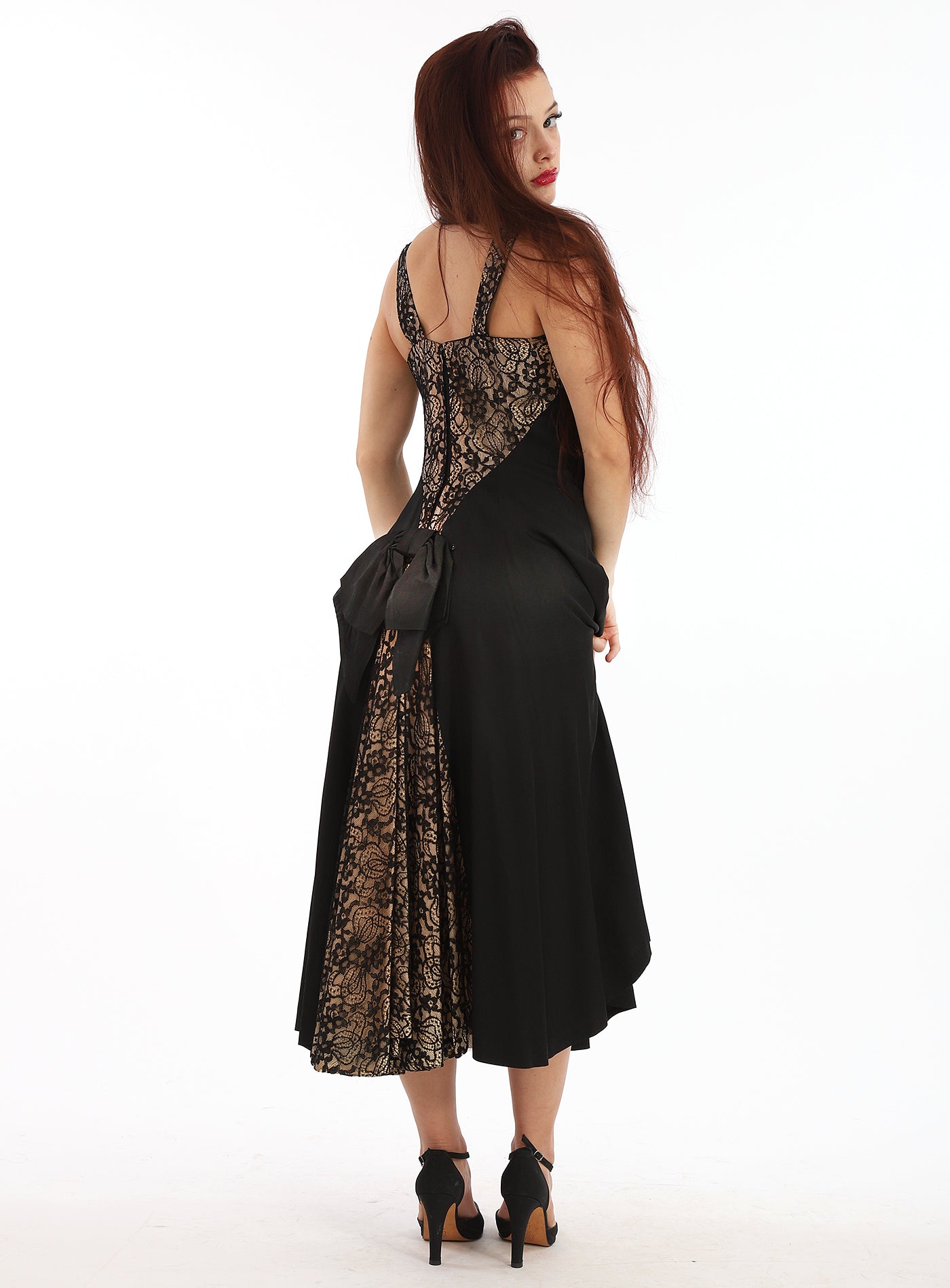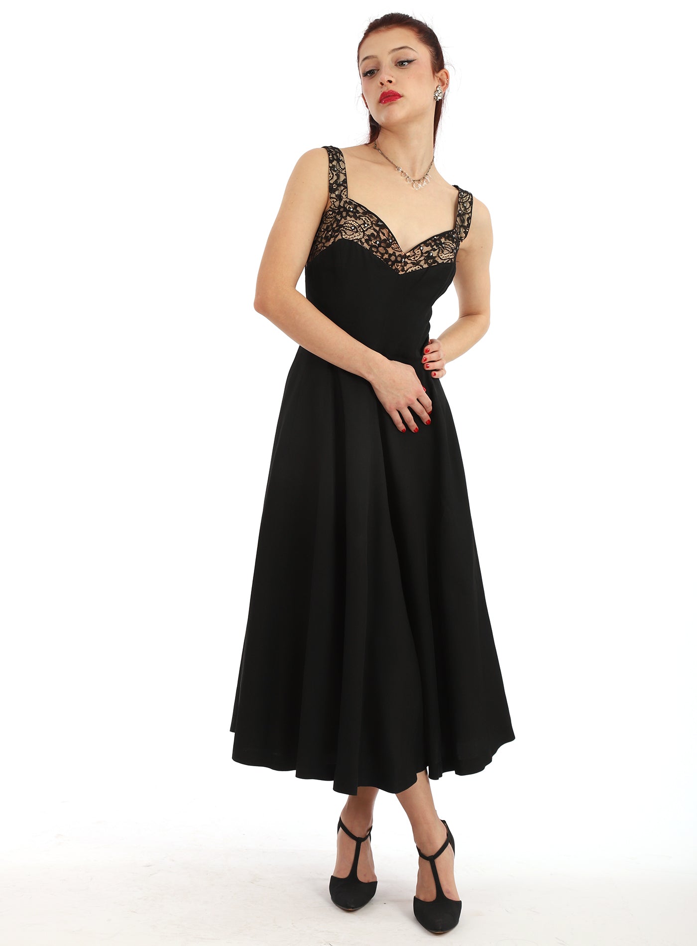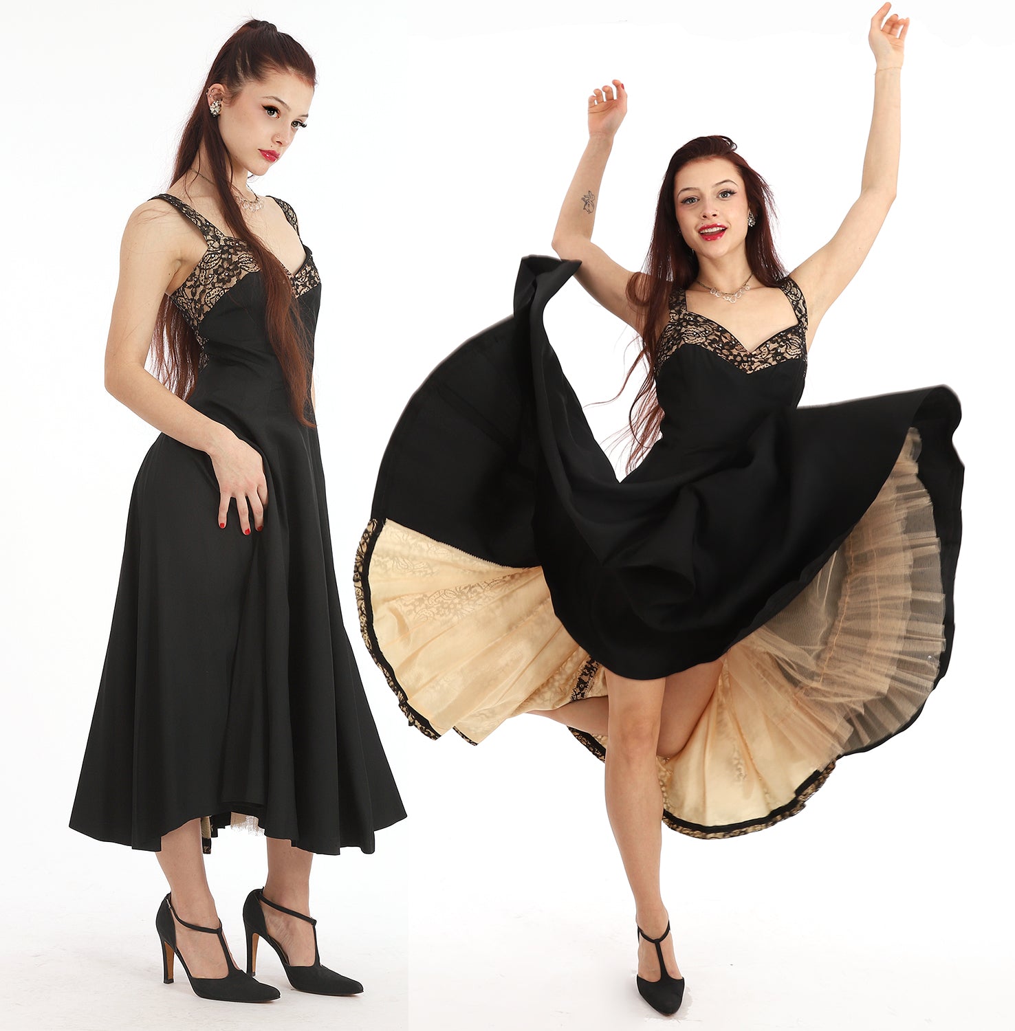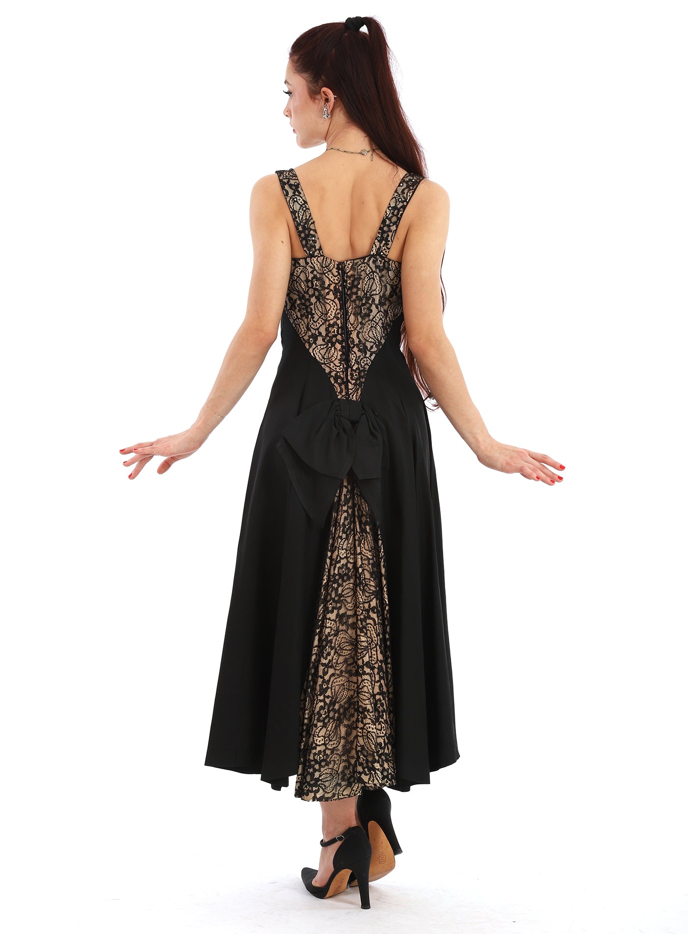 Vintage 1950s Lilli Diamond Black Lace Dress with Lace with Sweetheart Neckline that fits tight on the bodice then cascades into a wide flowy lace inset skirt, with a gorgeous lace trimmed back where the lace falls to mid back. There is a large beautiful bow at the back waist and inset lace in the back of skirt. As you can see in the movement photos the lace is wide and gorgeous. There is a tulle underskirt as you can see in the next to last photo. There are scattered small rhinestones set in black sequins in the lace on the front and in the straps. This dress zips up the back and the zipper is in good working condition. I have had this dress for over thirty years, and had to wait until I had my beautiful model and ballet student Mallory to model it. Please read measurements carefully as this dress is not returnable. This dress is absolutely stunning and in incredible condition for it's age. So elegant, feminine and gorgeous. If you have any questions please feel free to contact me.