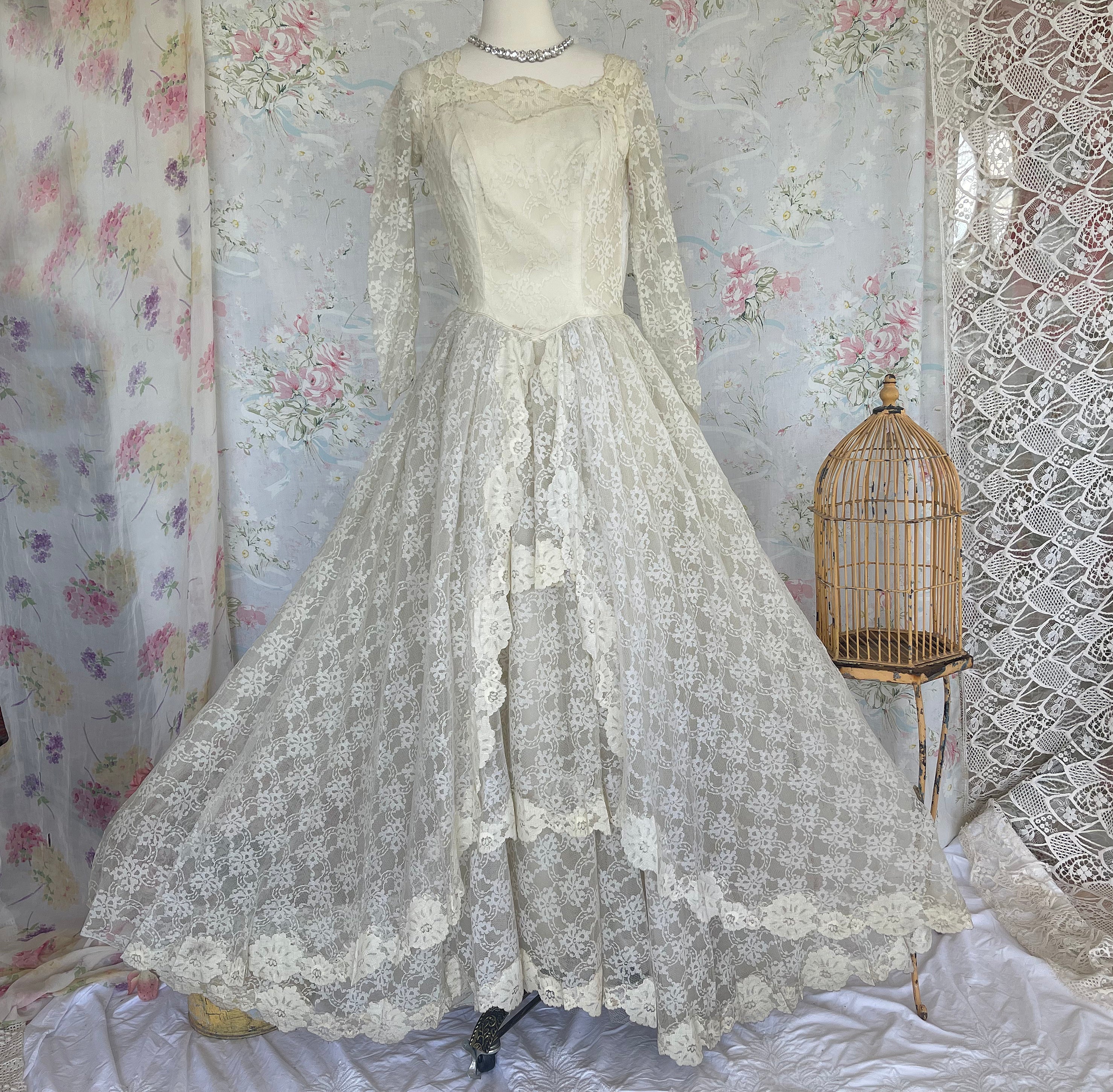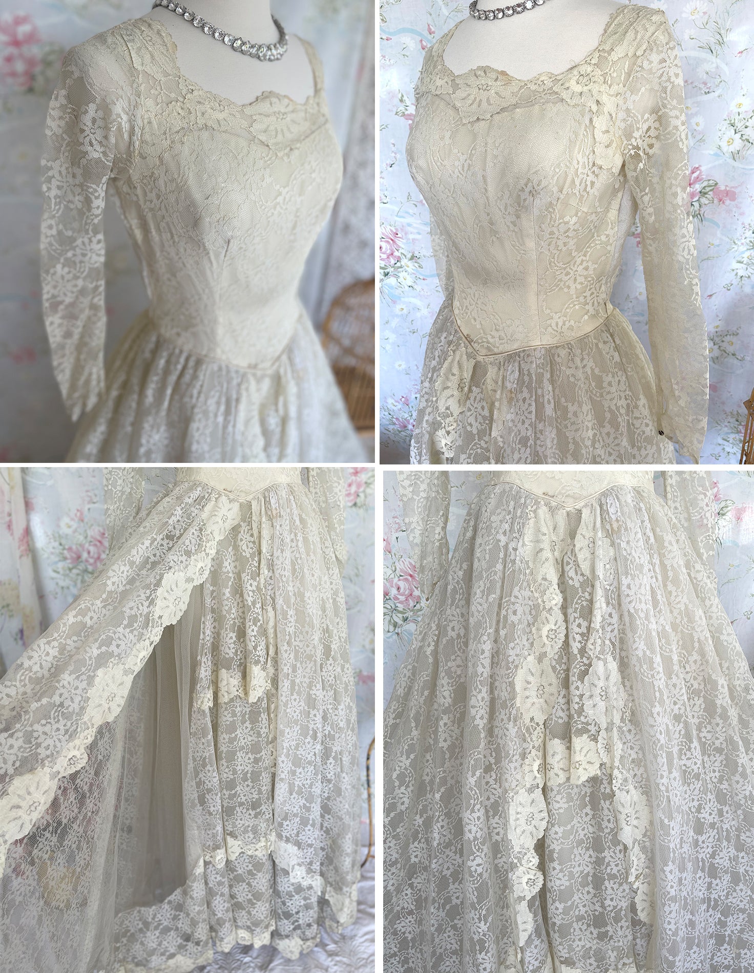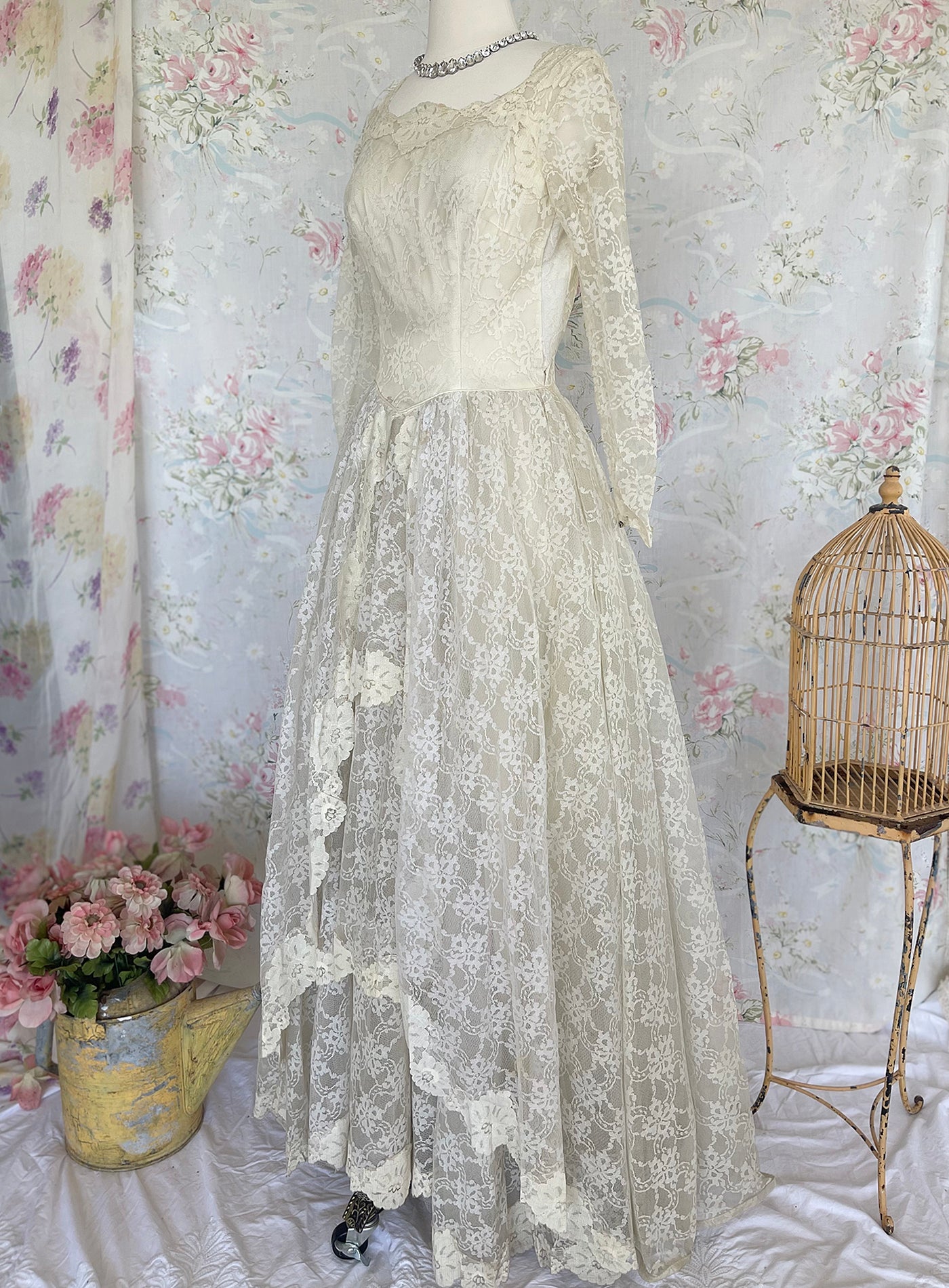 Vintage 1950s Lace Off White Princess Wedding Dress. Gorgeous scalloped neckline, darted bust, angel wings of lace at front with full sweep skirt, with different levels of lace. Tulle underskirt and acetate lining throughout except for the sleeves which are sheer lace and have snaps at the end. Tutu waist. Lovely V back with long zipper closure. Add a veil, or beautiful crown and step into fairy land. So whimsical. Just a magically romantic dress.