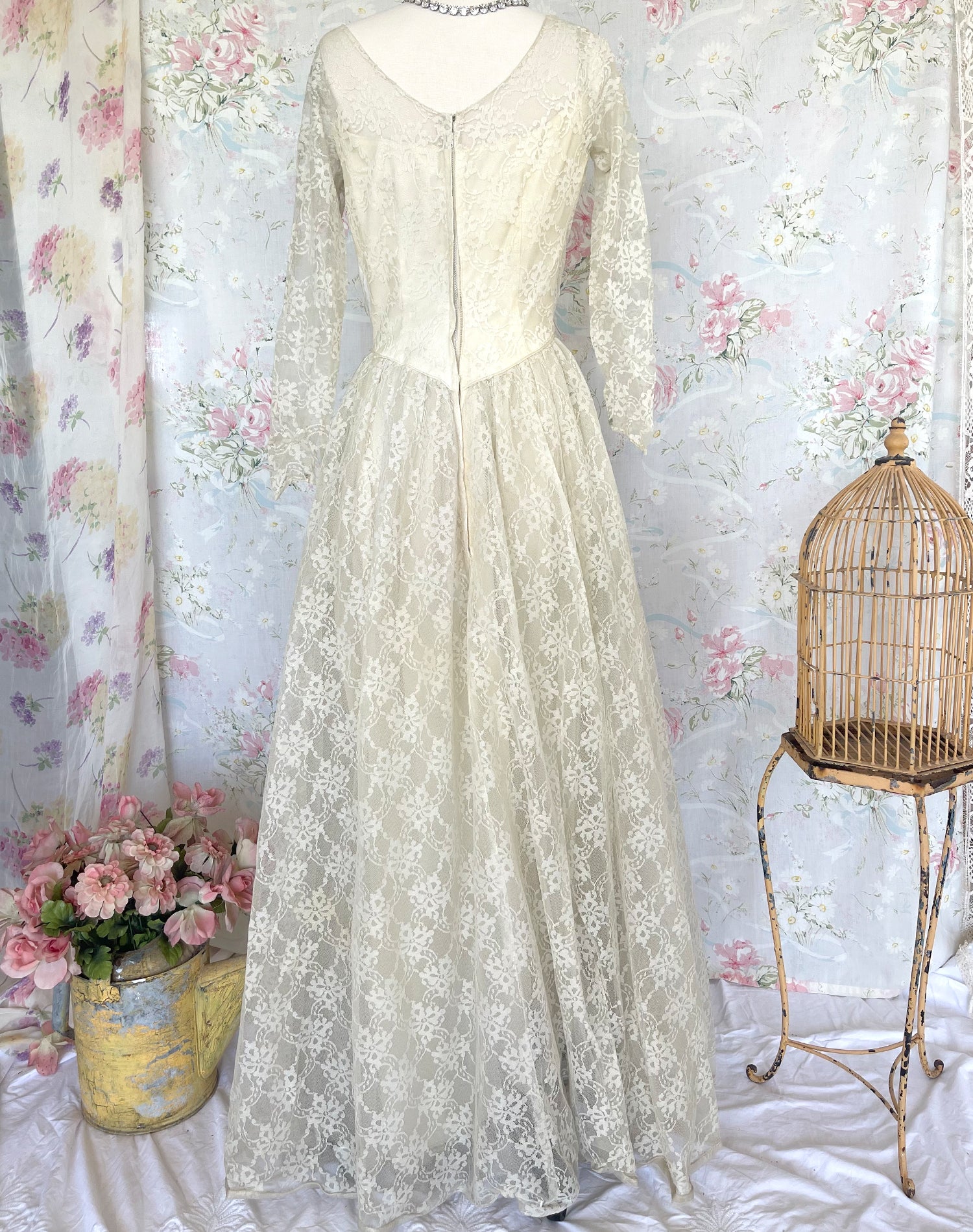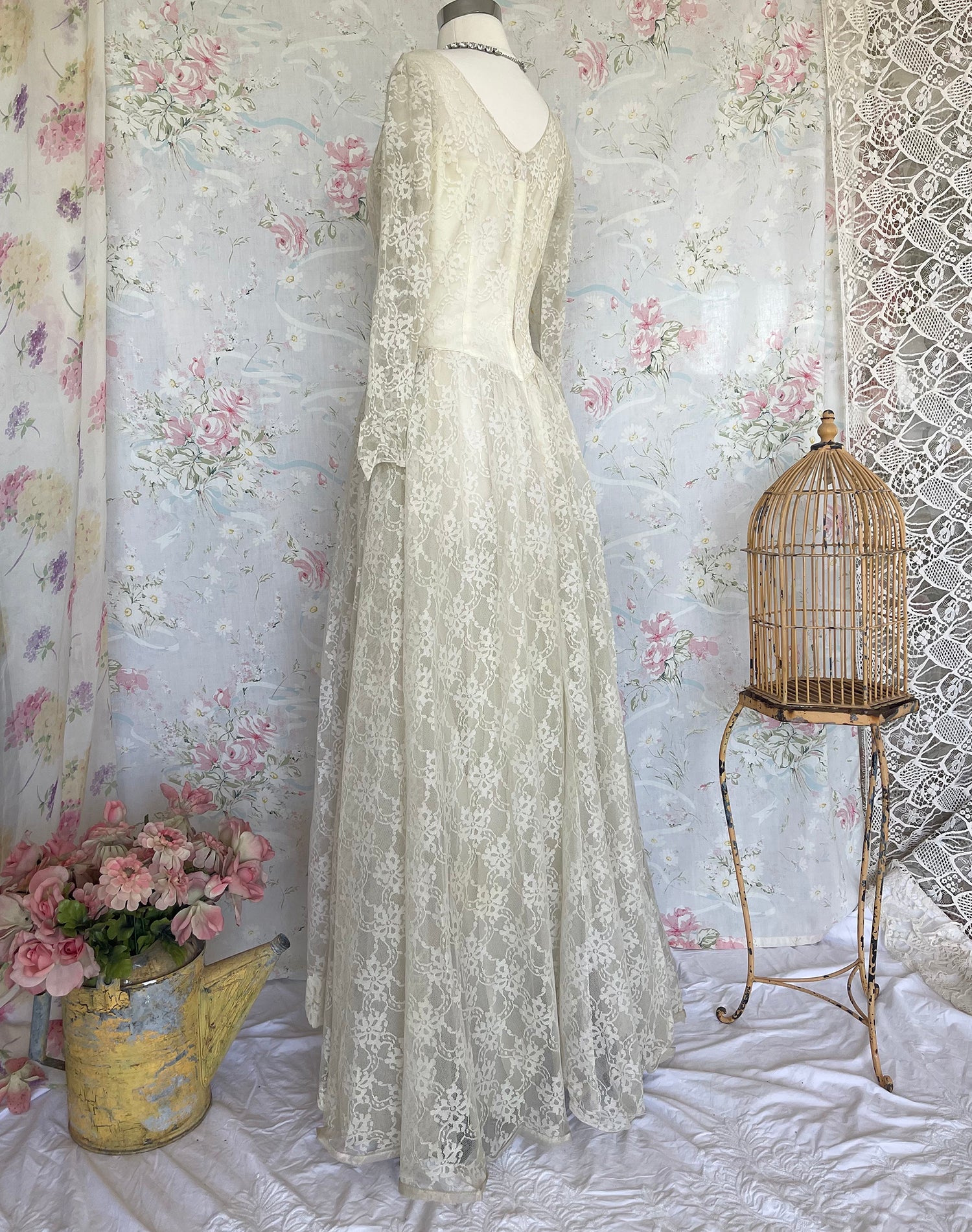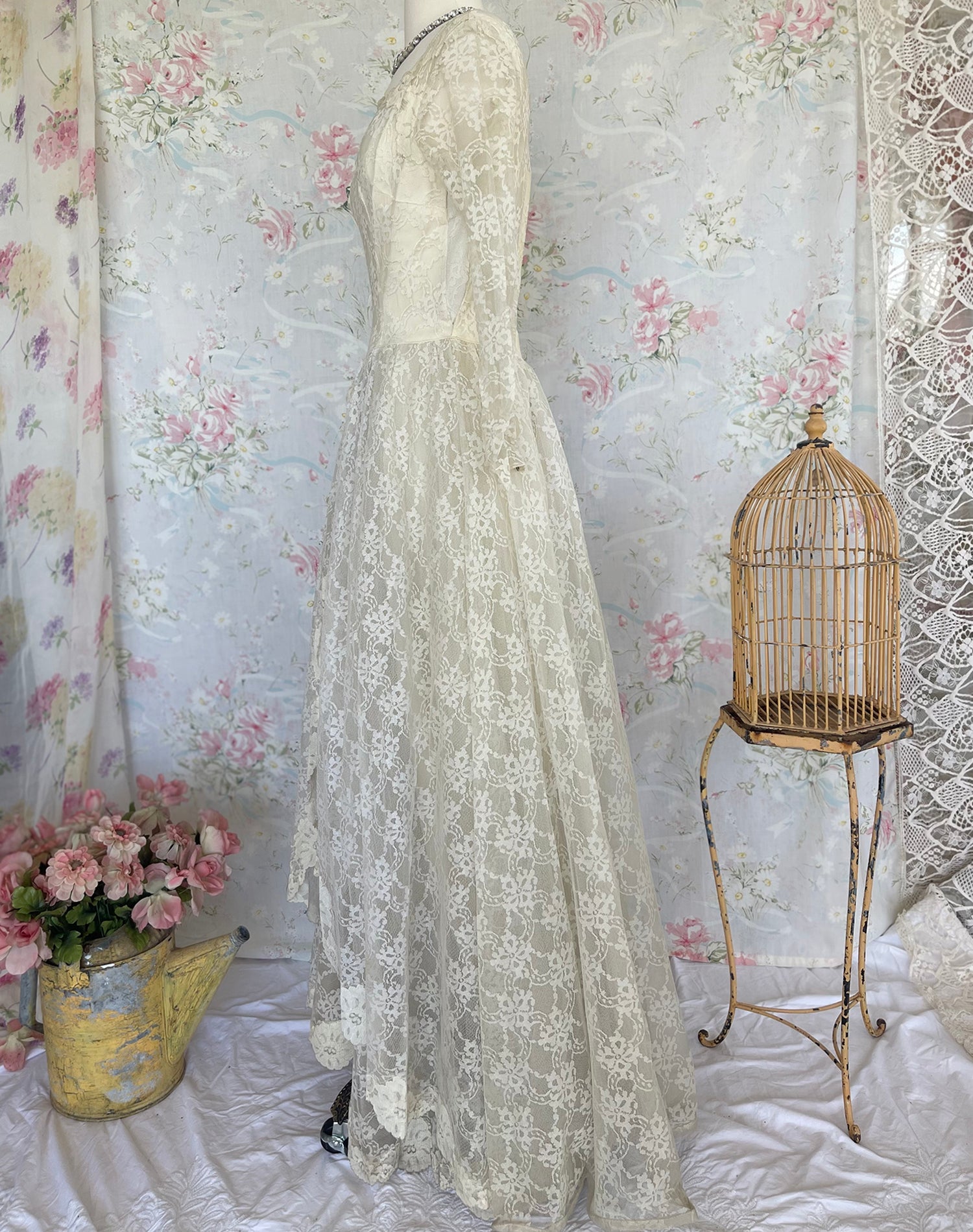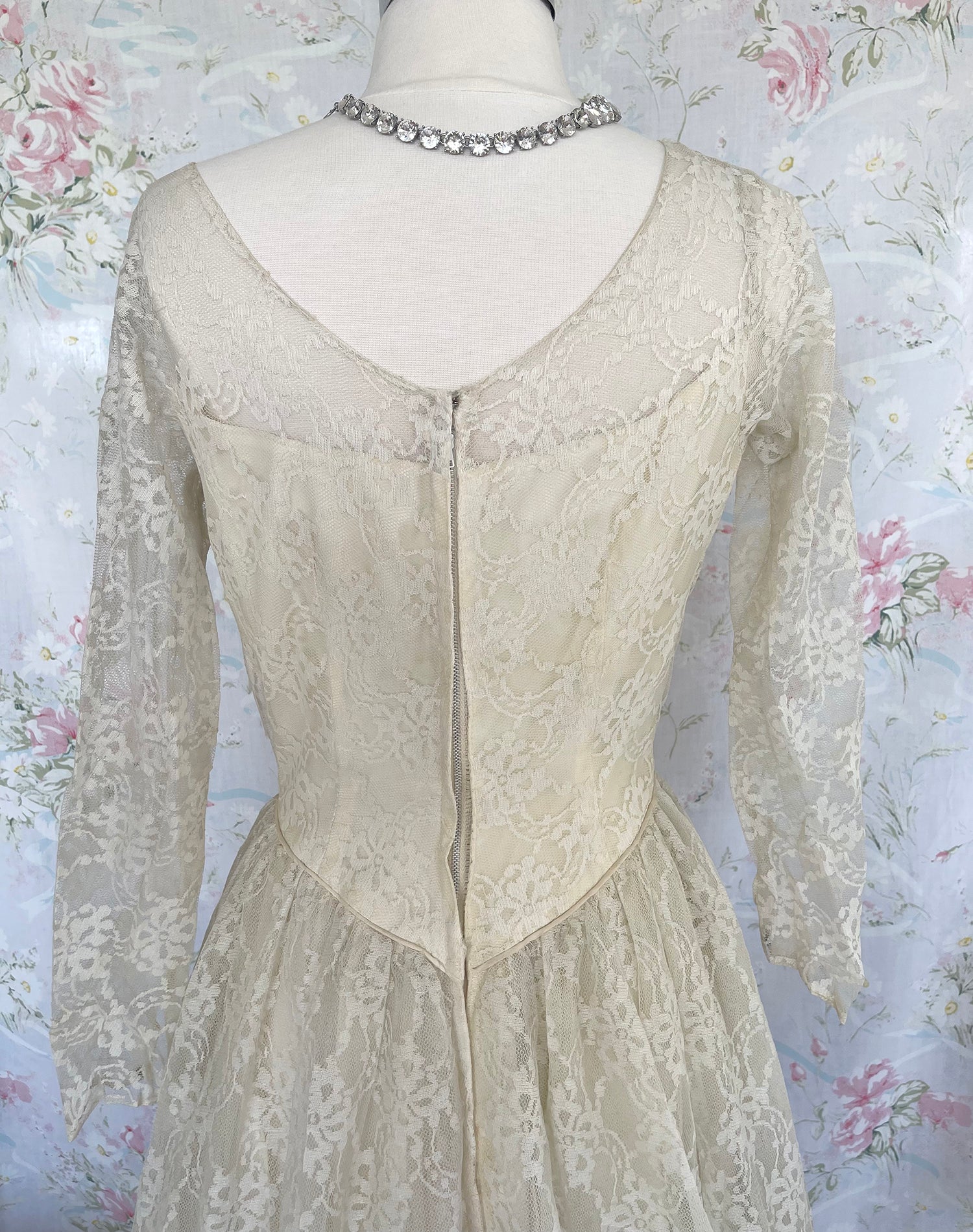 Vintage 1950s Lace Off White Princess Wedding Dress. Gorgeous scalloped neckline, darted bust, angel wings of lace at front with full sweep skirt, with different levels of lace. Tulle underskirt and acetate lining throughout except for the sleeves which are sheer lace and have snaps at the end. Tutu waist. Lovely V back with long zipper closure. Add a veil, or beautiful crown and step into fairy land. So whimsical. Just a magically romantic dress.