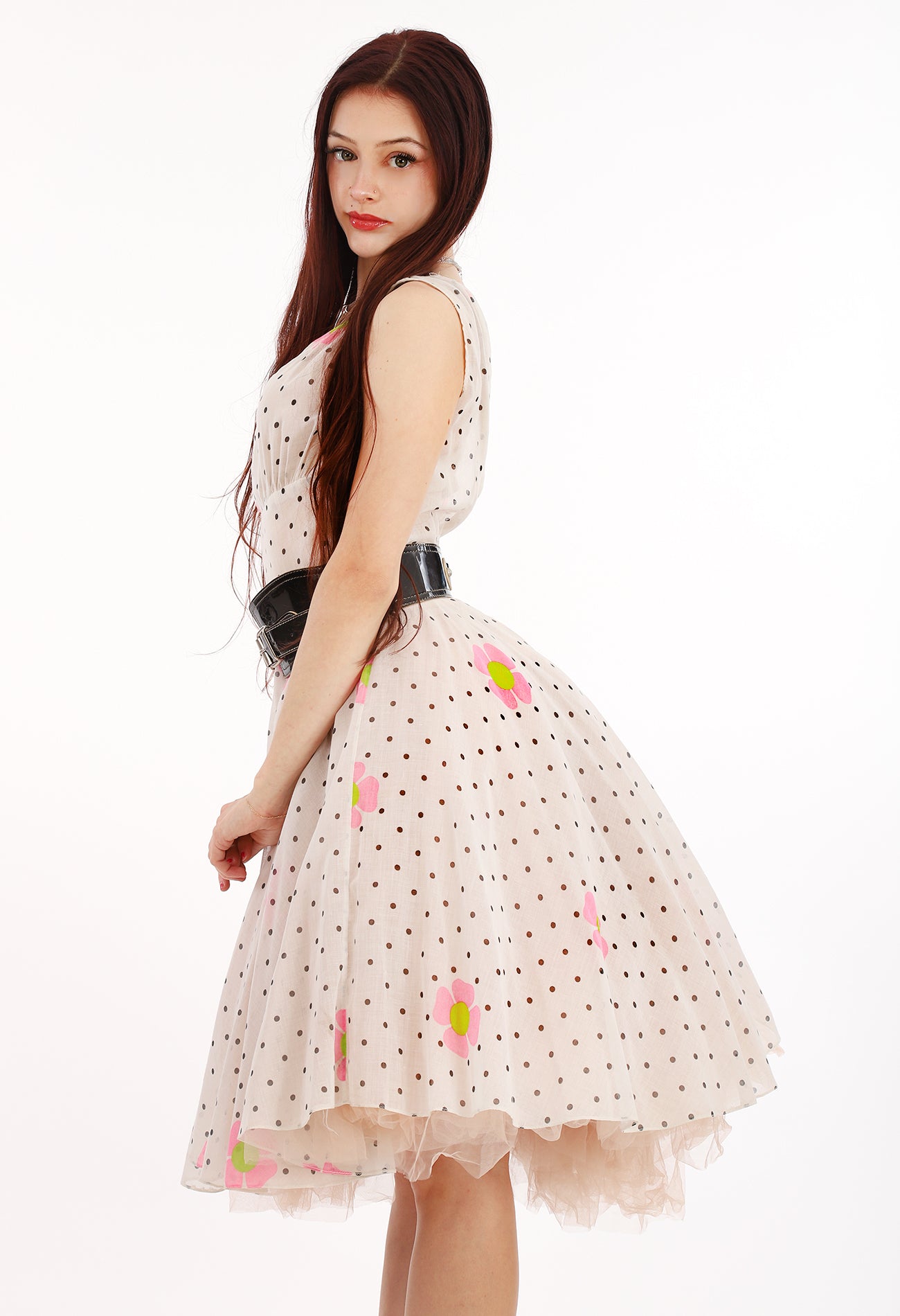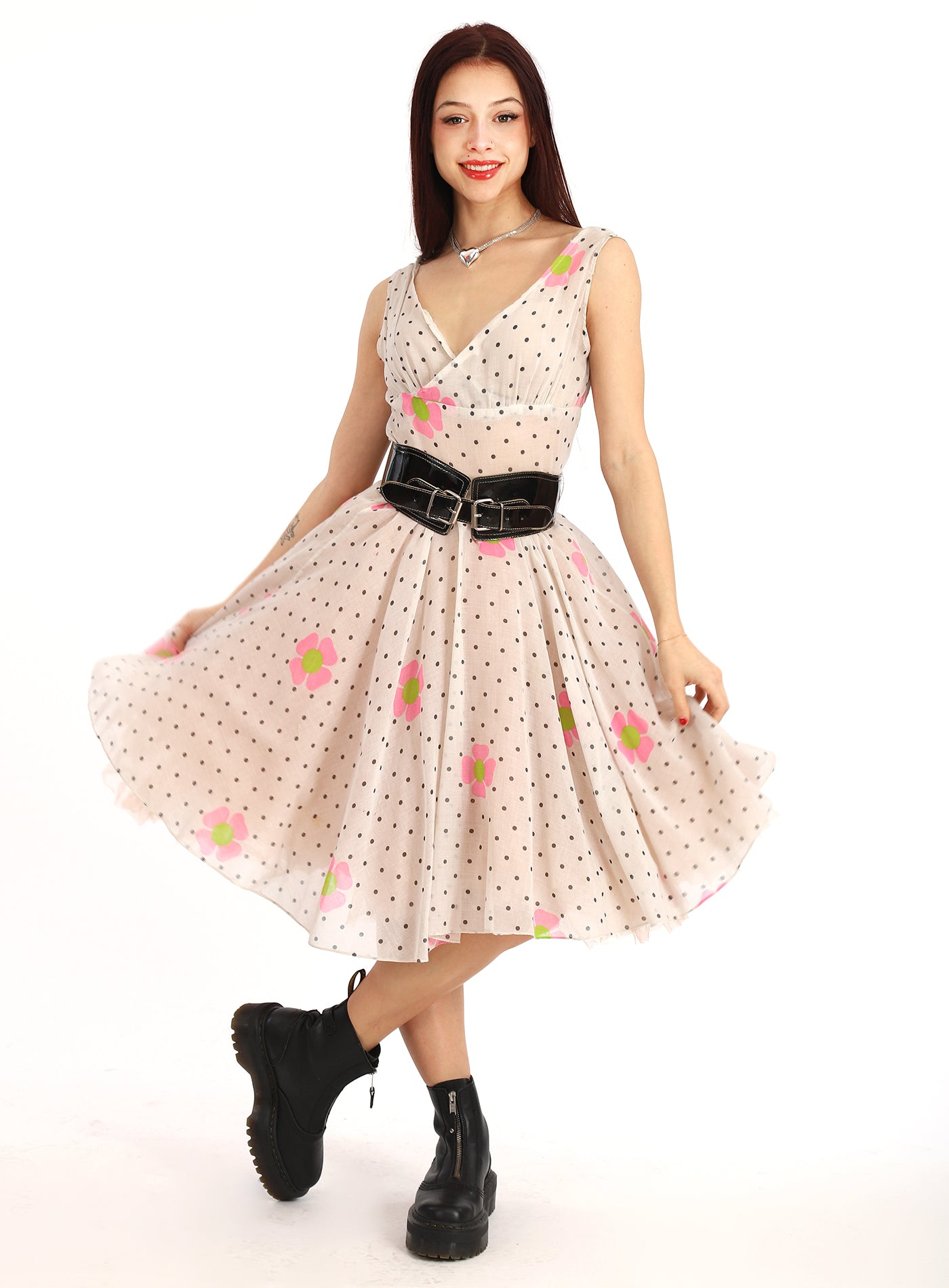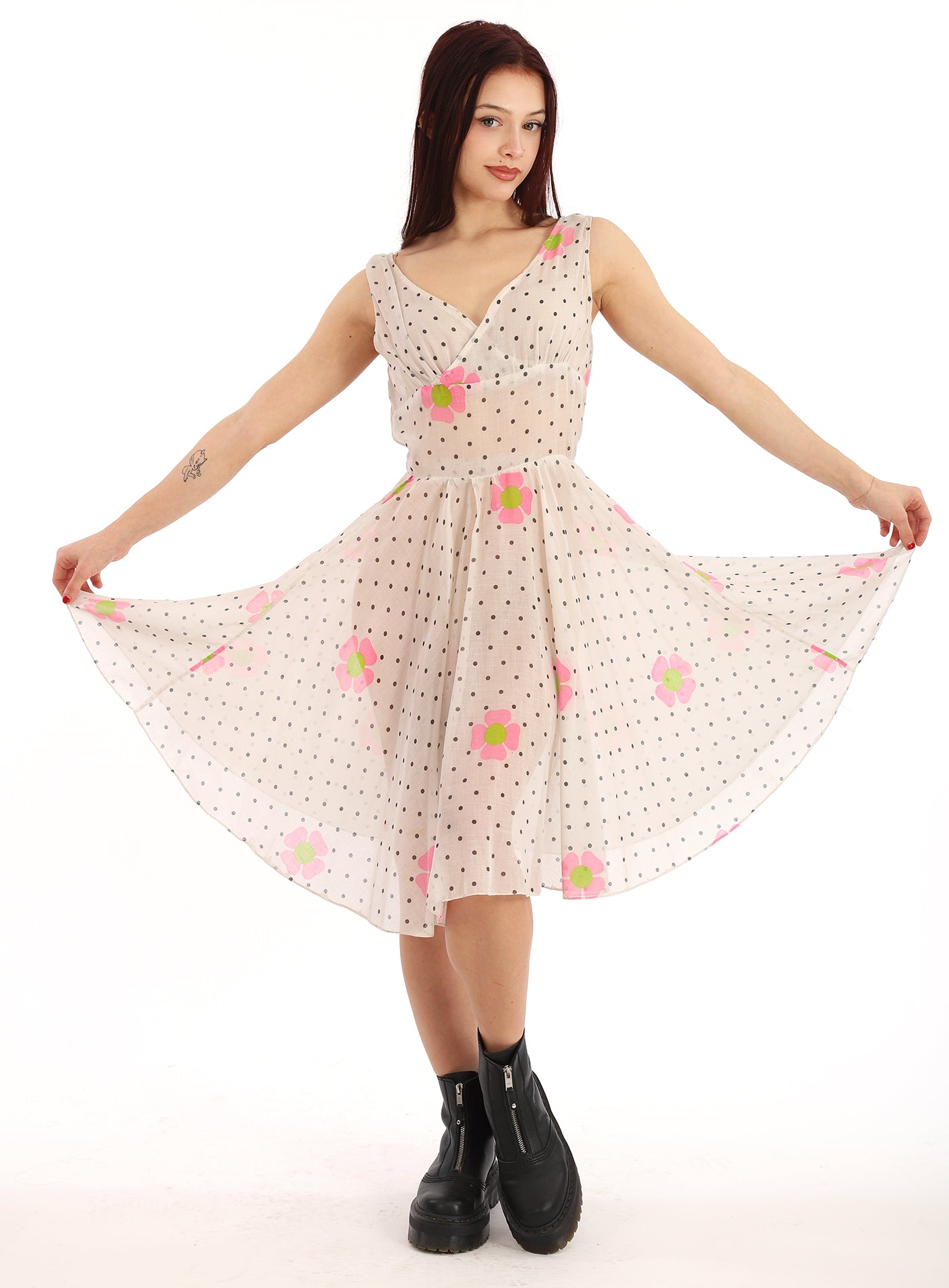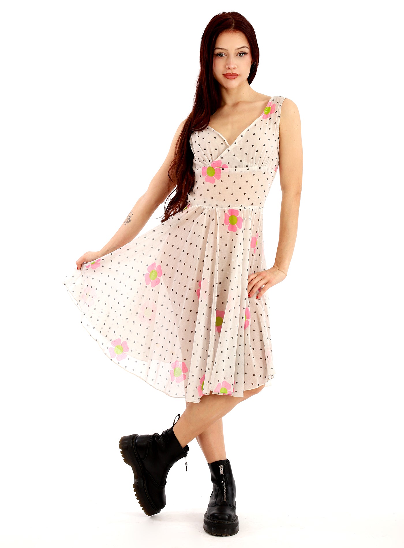 Vintage 50, 60s Sheer White Organza Fit and Flare Mod Floral Swing Dress with Bubble Gum Pink and Lime Flowers and Polka Dots throughout. Definitely a One Of A Kind as it appears to be hand made. No Label. I just fell in love with this print and dress, so sweet, sexy and unique. Beautiful Sweetheart V neck, tight waist, and full flare skirt. A winner and spectacular dress.