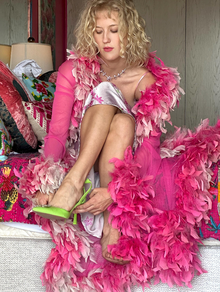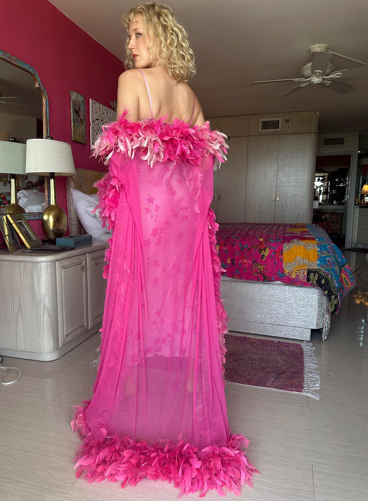 Vintage 1960s Fuchsia Pink Feather Boa Duster Robe with Feathers in Shades of Fuchsia and Light Pink with a sheer Fuchsia Robe. One size. So much fun to wear over a slinky dress, with a pair of jeans, or for a fun night in your boudoir! Slinky, sexy in the most amazing colors.