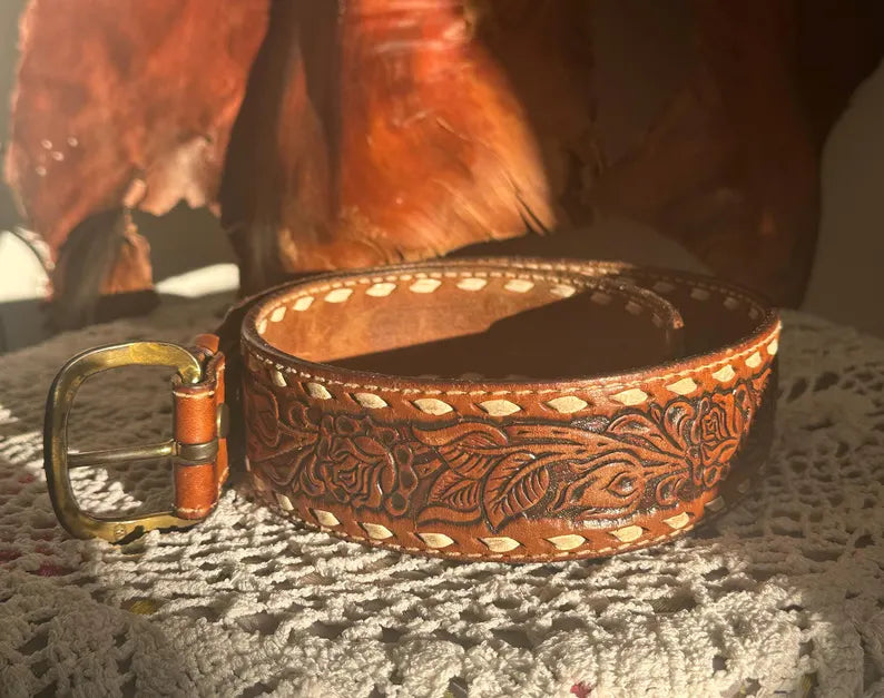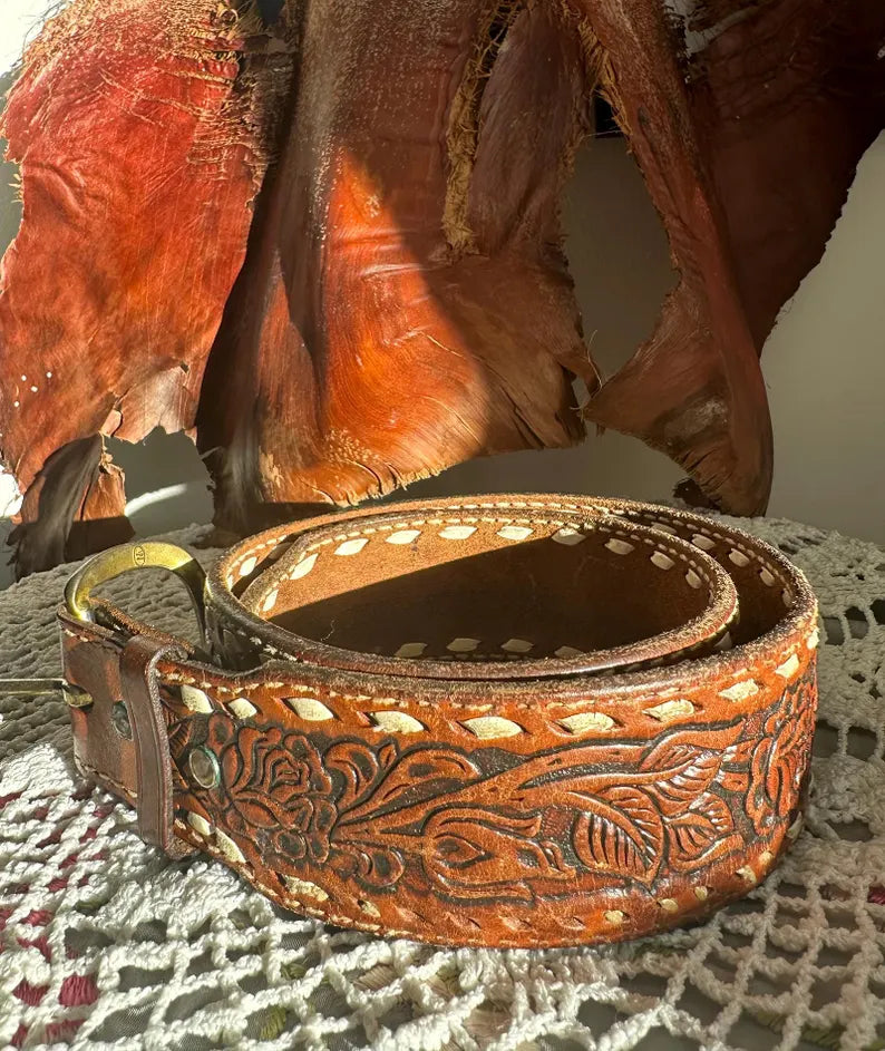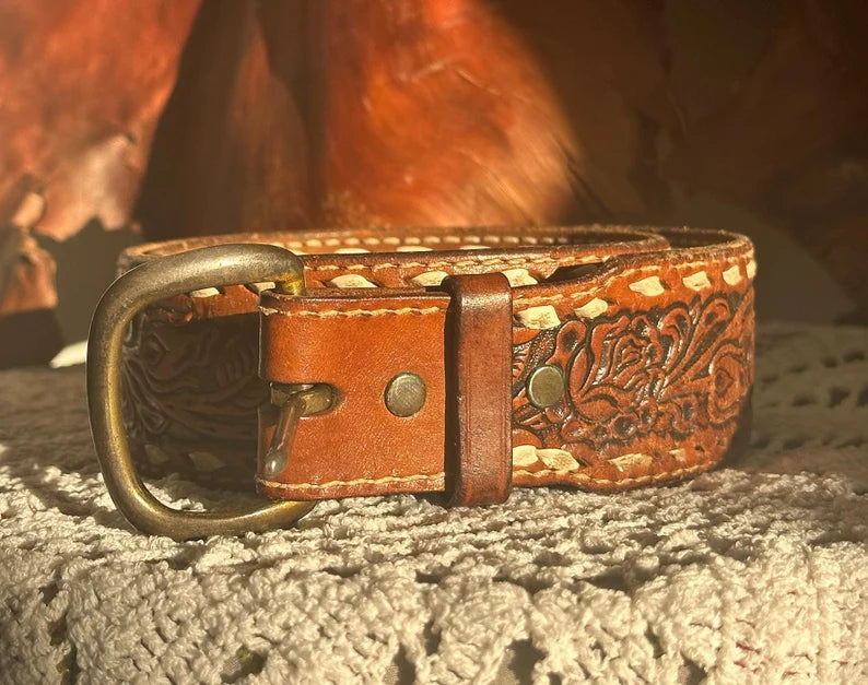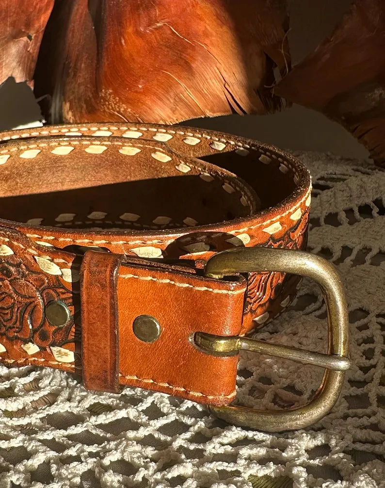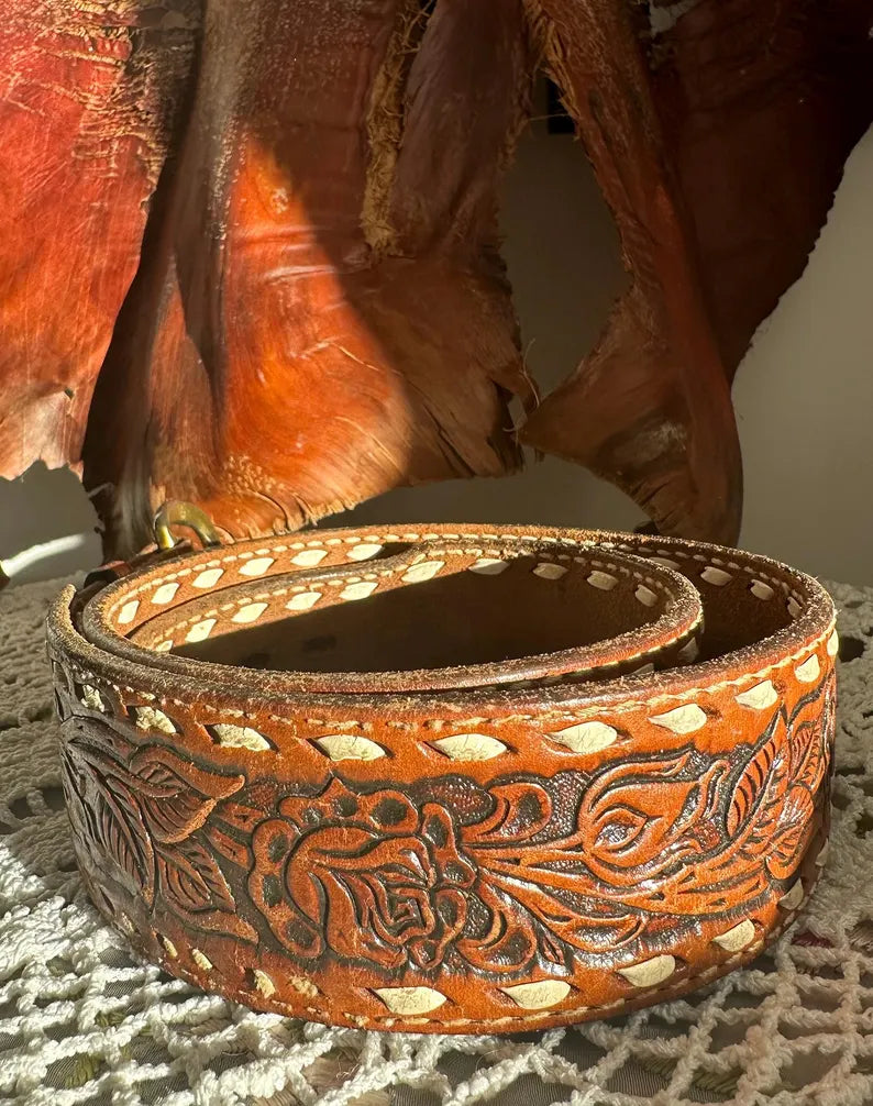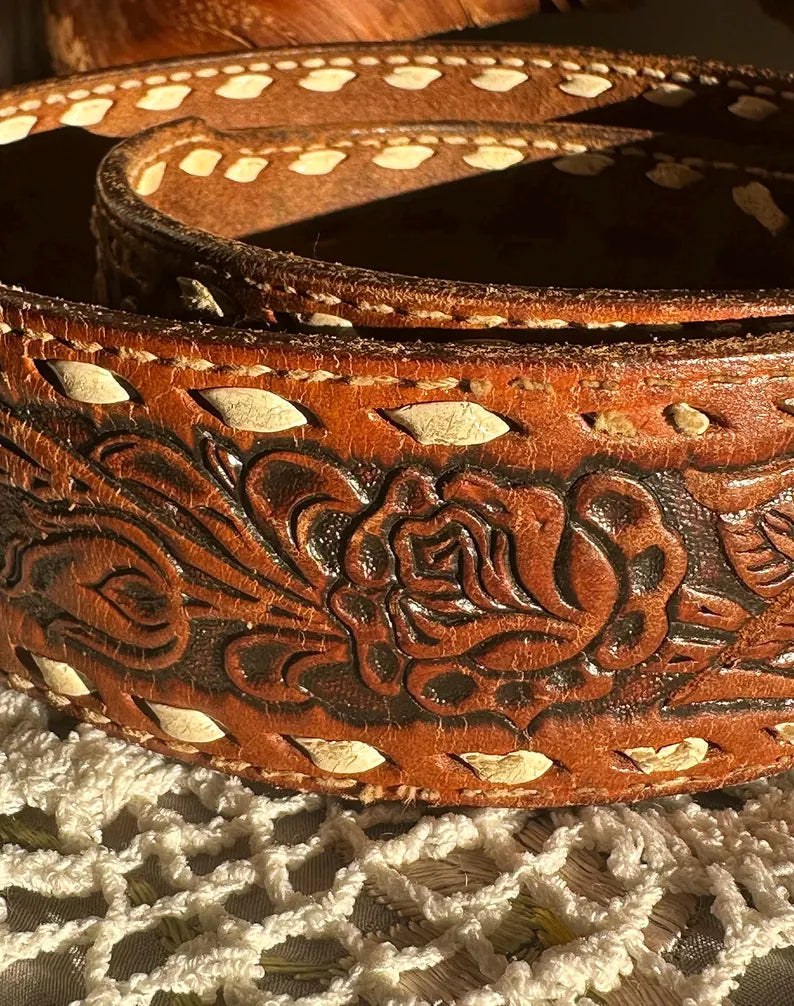 Vintage 1970s Cognac Brown Tooled Rose Floral Tooled Belt with White Leather Threading and Bronze Buckle. There is a name on the inside but it's hard for me to read.