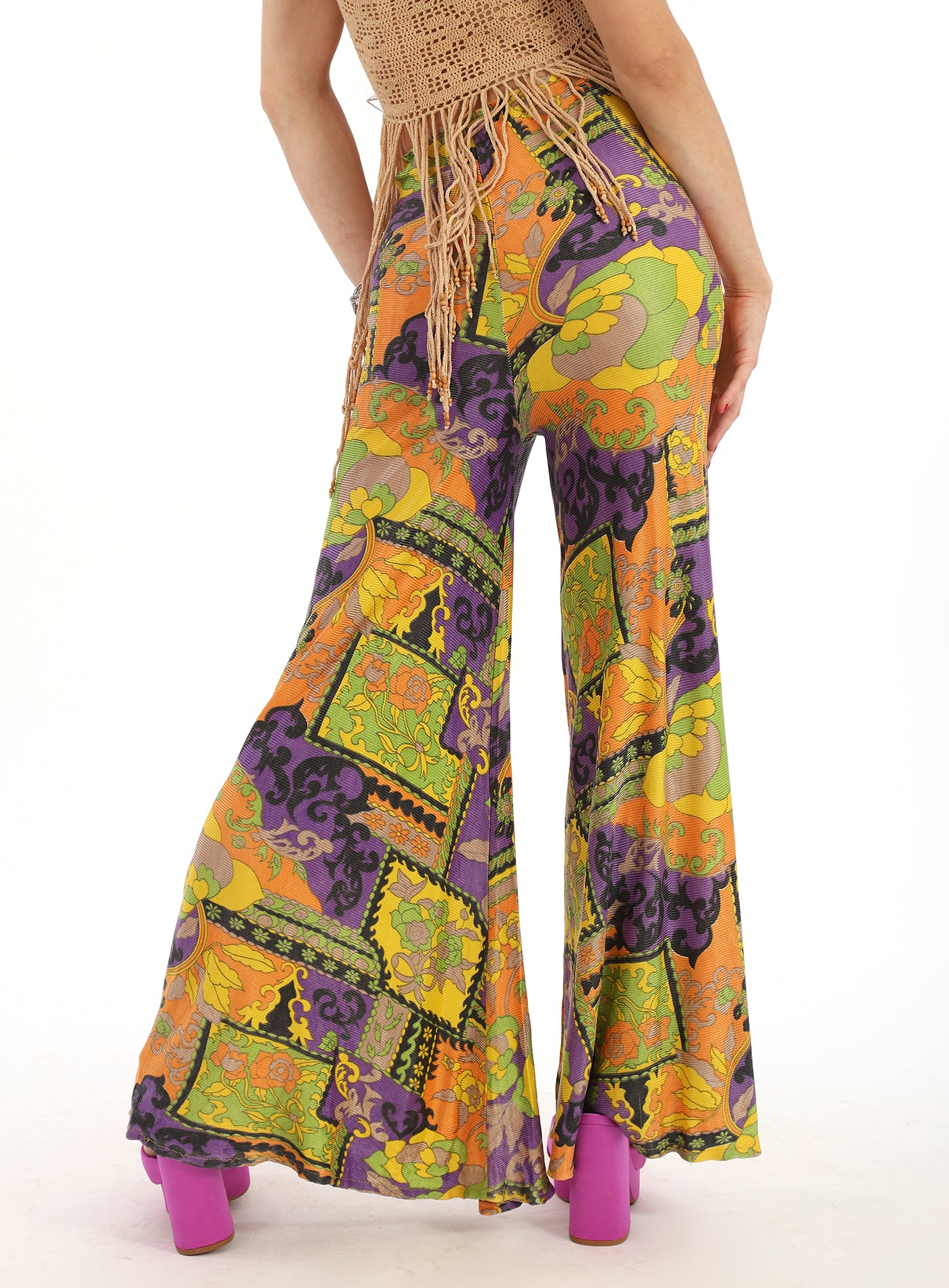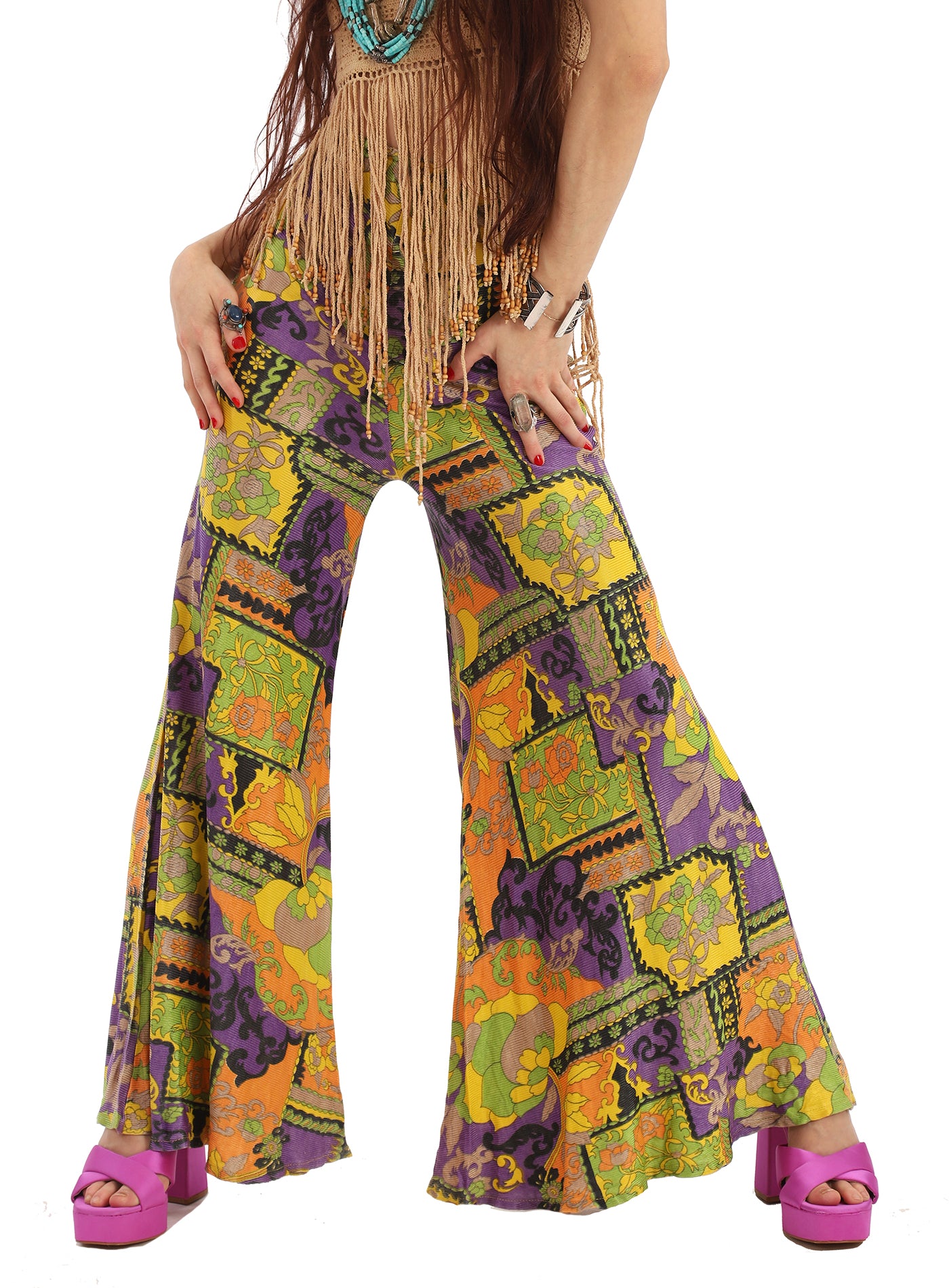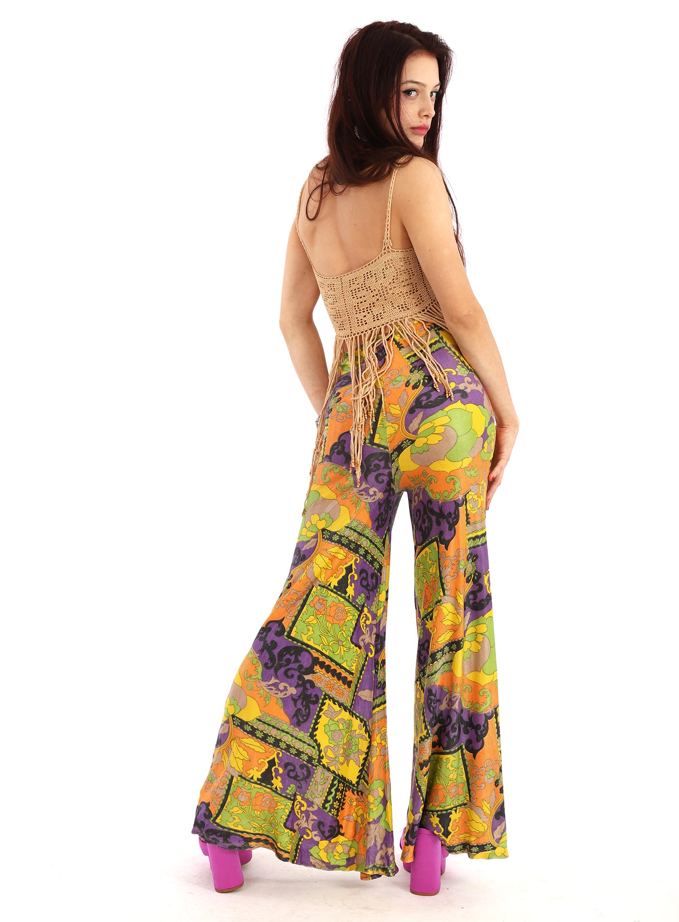 1970s Hippie Psychedelic High Waisted Bell Bottom Palazzo pants with elasticized waist. Totally Woodstock era. So soft! I have had these forever. Super cool, made of a shiney, ribbed lightweight acetate. Great if you are looking to put together a retro 70s look as a costume or just to wear everyday! The material is stretchy! The label says size medium, but the elastic is definitely not a medium. Put a bigger elastic elastic inside, and they could probably fit a medium.