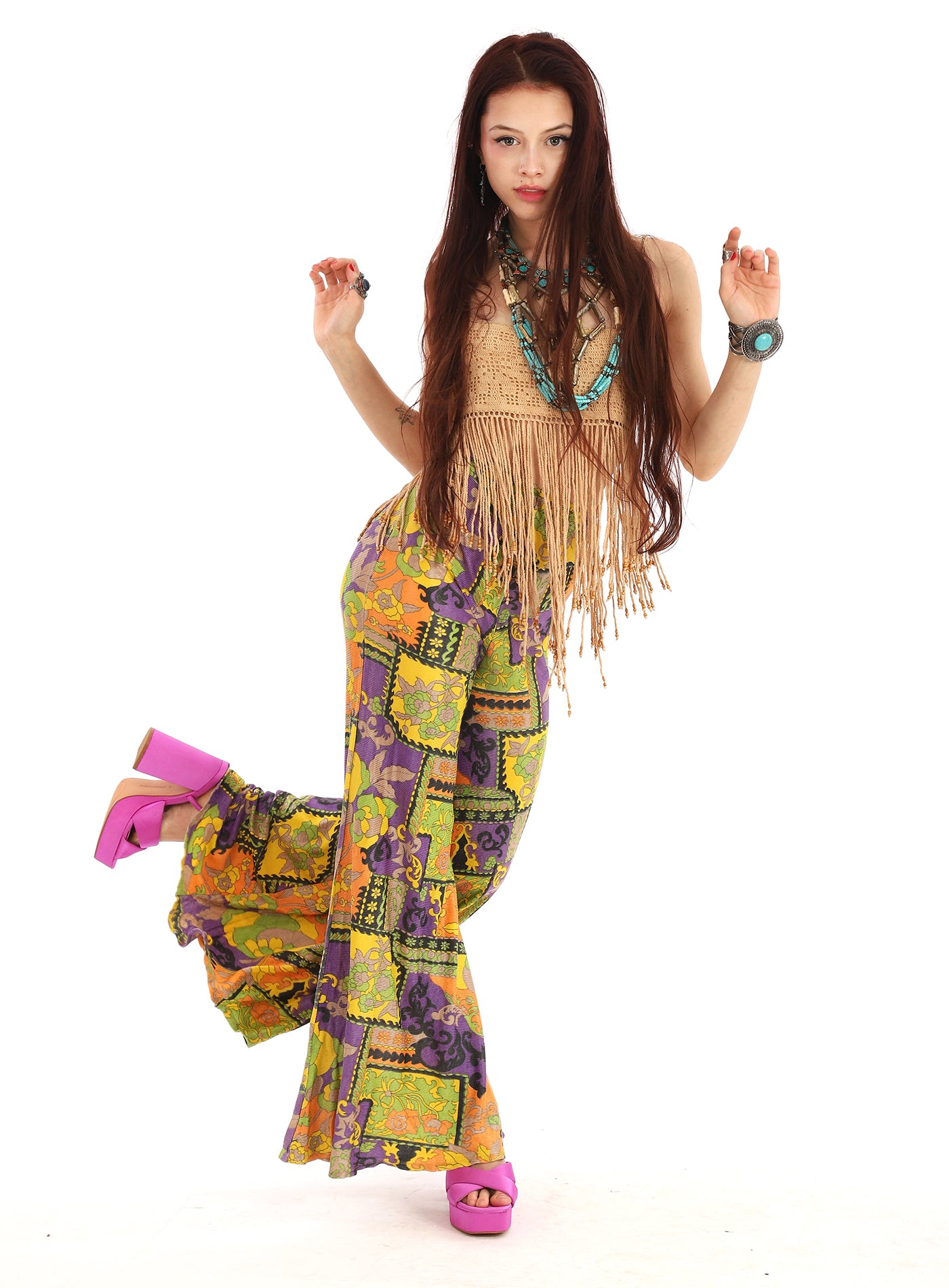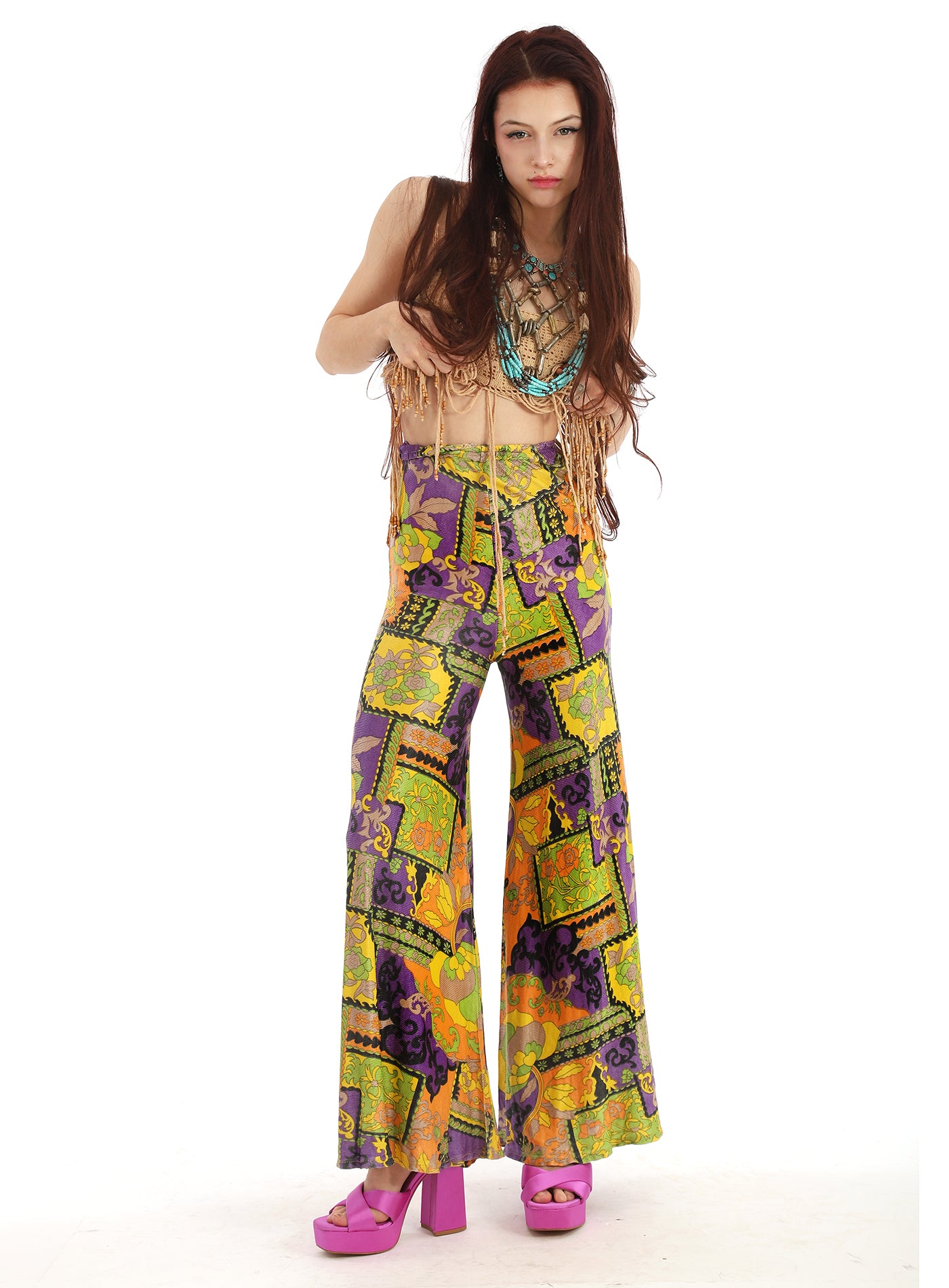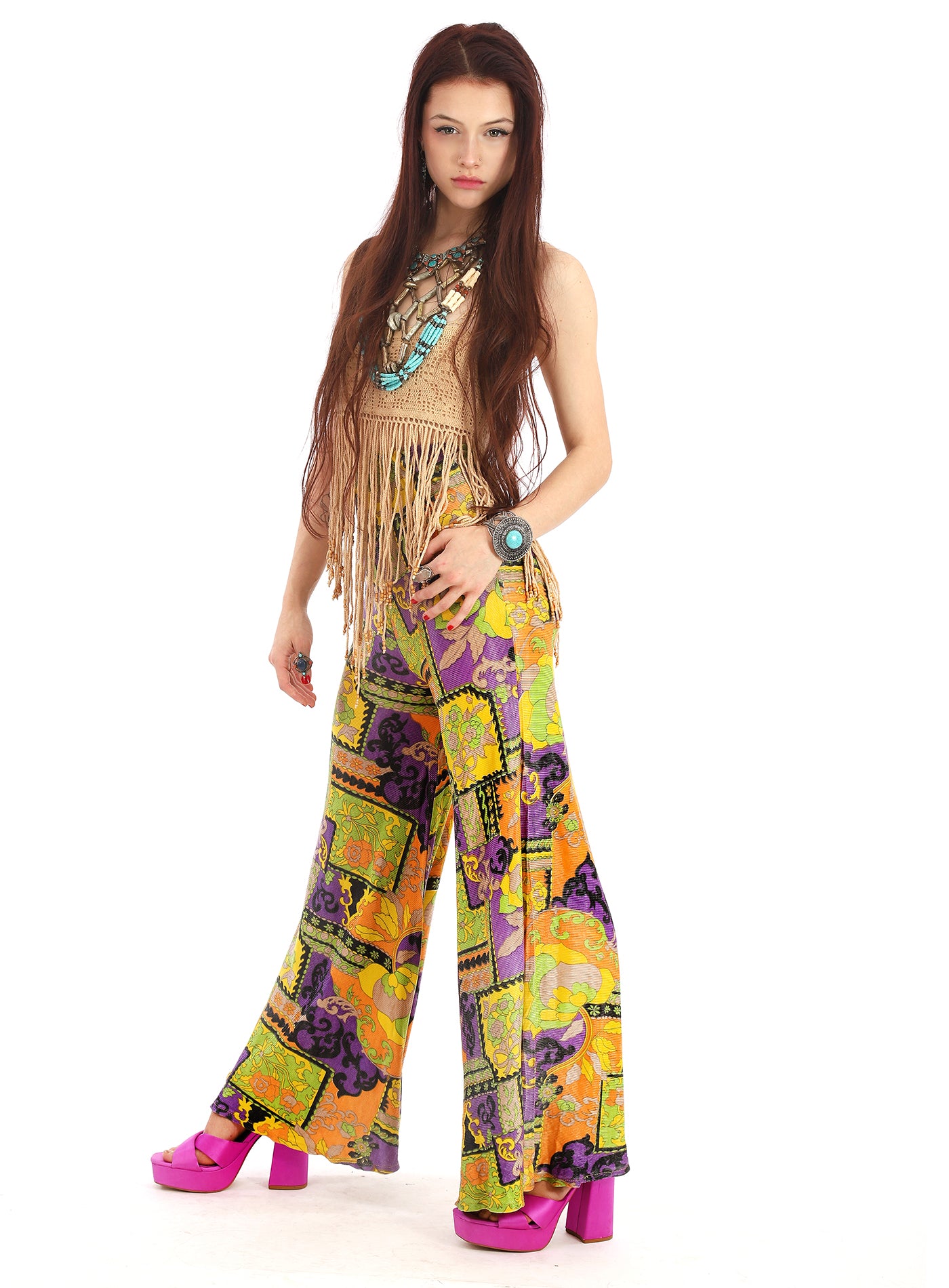 1970s Hippie Psychedelic High Waisted Bell Bottom Palazzo pants with elasticized waist. Totally Woodstock era. So soft! I have had these forever. Super cool, made of a shiney, ribbed lightweight acetate. Great if you are looking to put together a retro 70s look as a costume or just to wear everyday! The material is stretchy! The label says size medium, but the elastic is definitely not a medium. Put a bigger elastic elastic inside, and they could probably fit a medium.