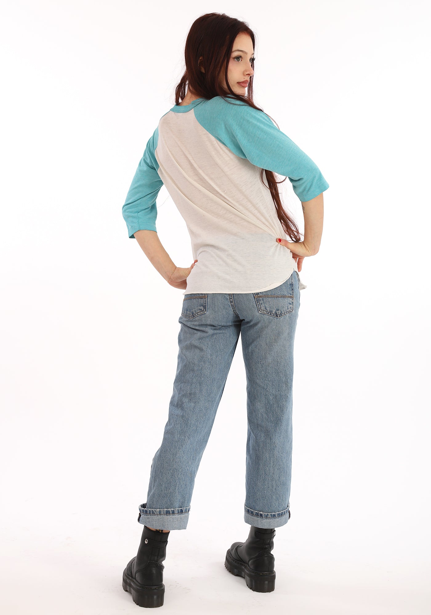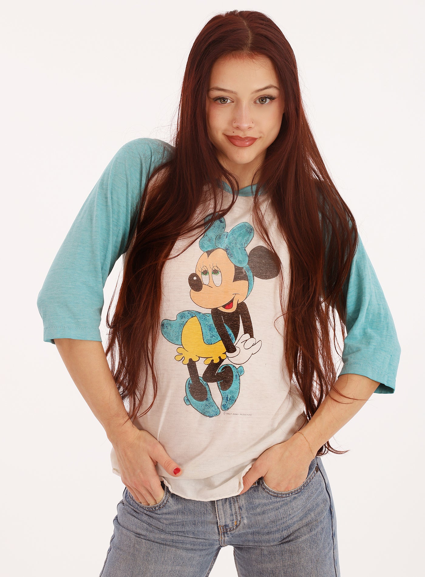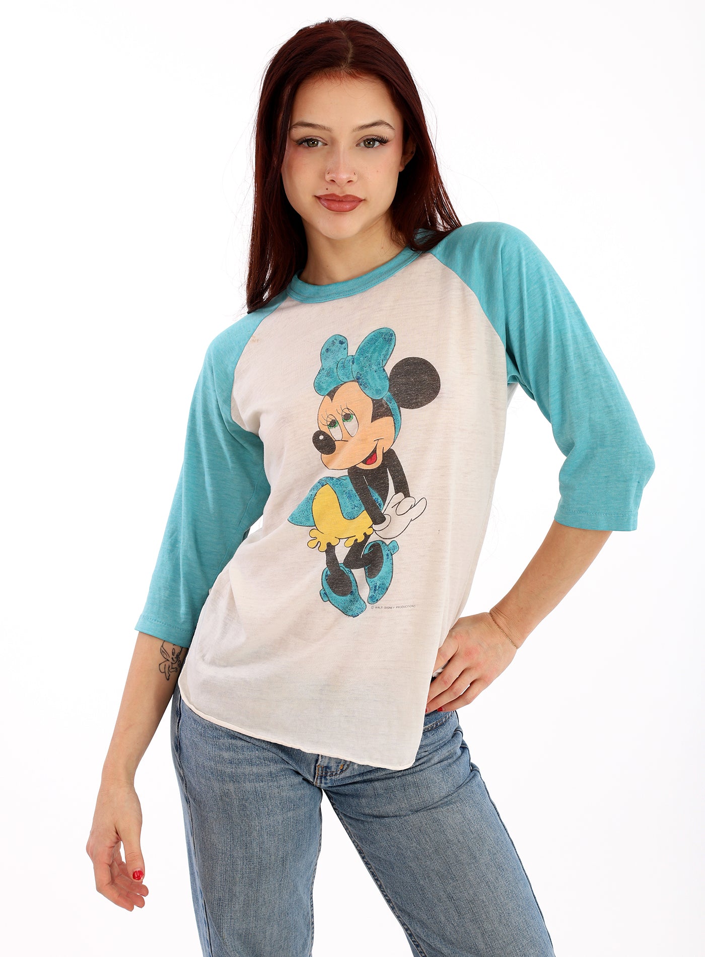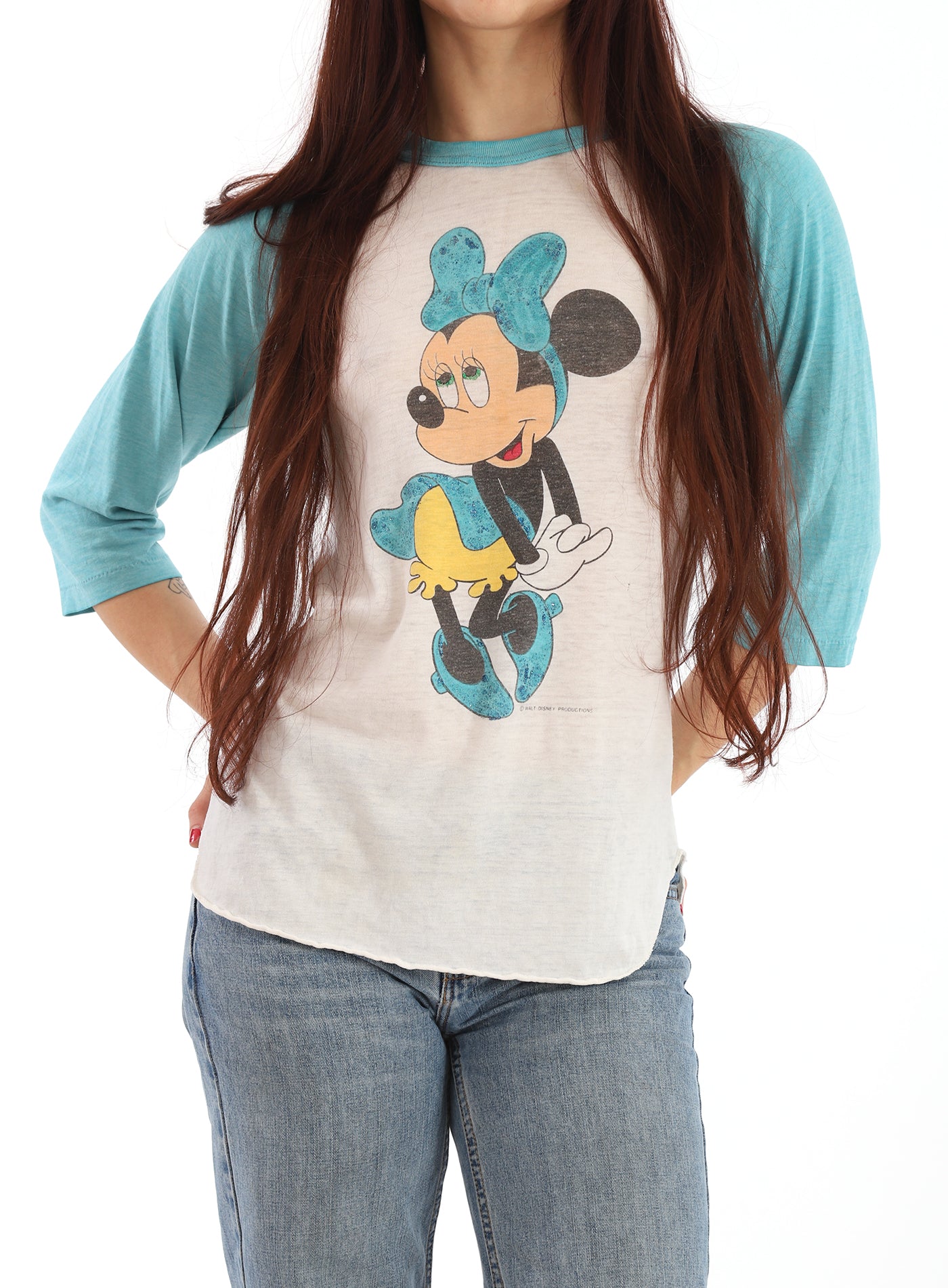 Vintage 1970s Turquoise and White Minnie Mouse Disney Tissue soft T-Shirt with three quarter sleeves and scalloped sides. Very Very good condition. A few age discolorations spots at right front shoulder, otherwise primo! Tag says medium but will easily fit a smaller gal like our model Mallory, and has plenty of give for a bit larger size woman.