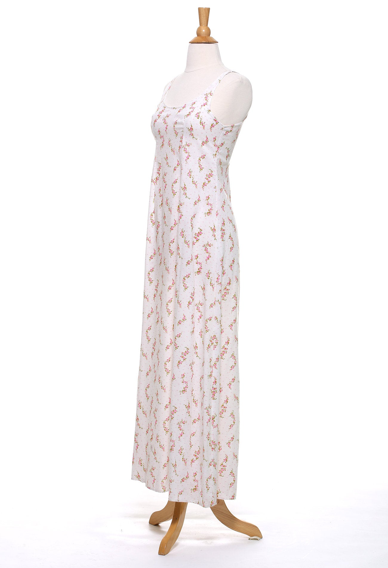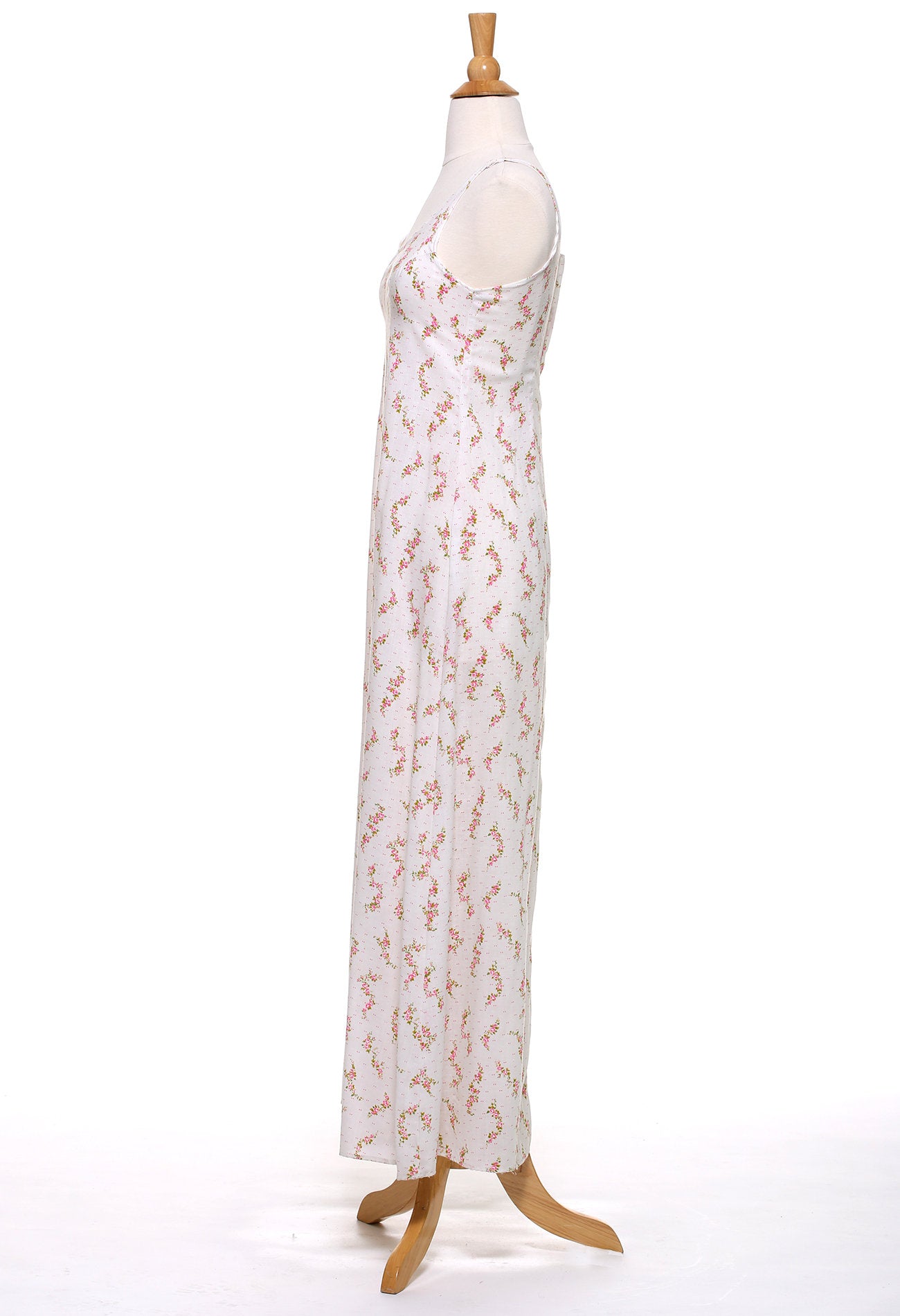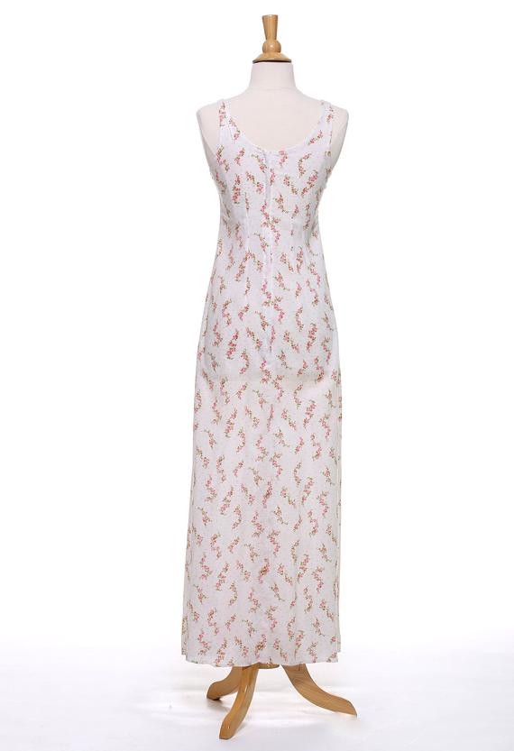 Item Details: Measured Flat Color: White with Pink Floral Detail Label: None Tag Size: None Fits Best: Small to Medium Depending On Desired Fit Fabric: Cotton Pit to Pit Width: 16" Arm Opening: 10" Waist: 14" Length: 54" Condition: Excellent