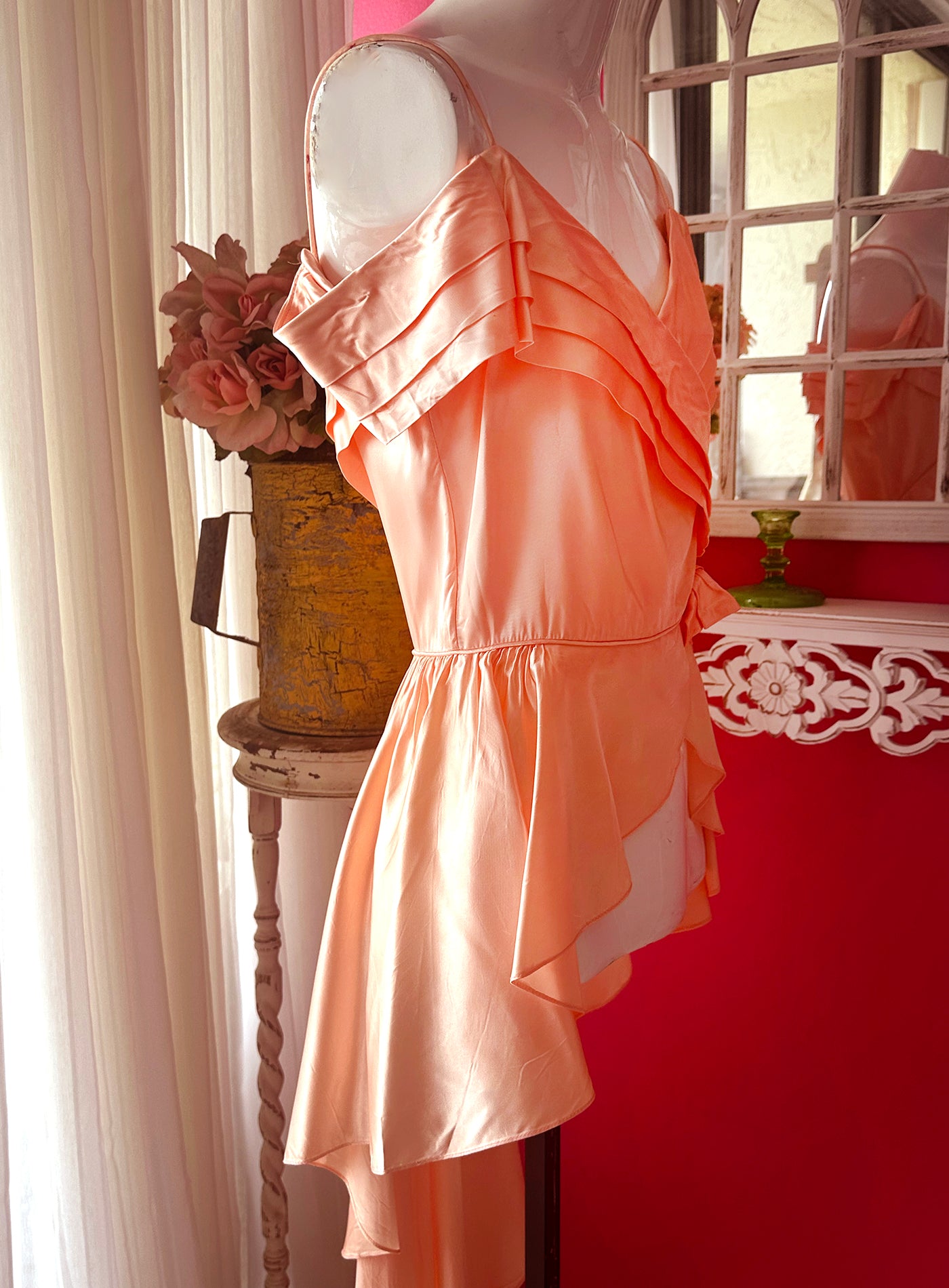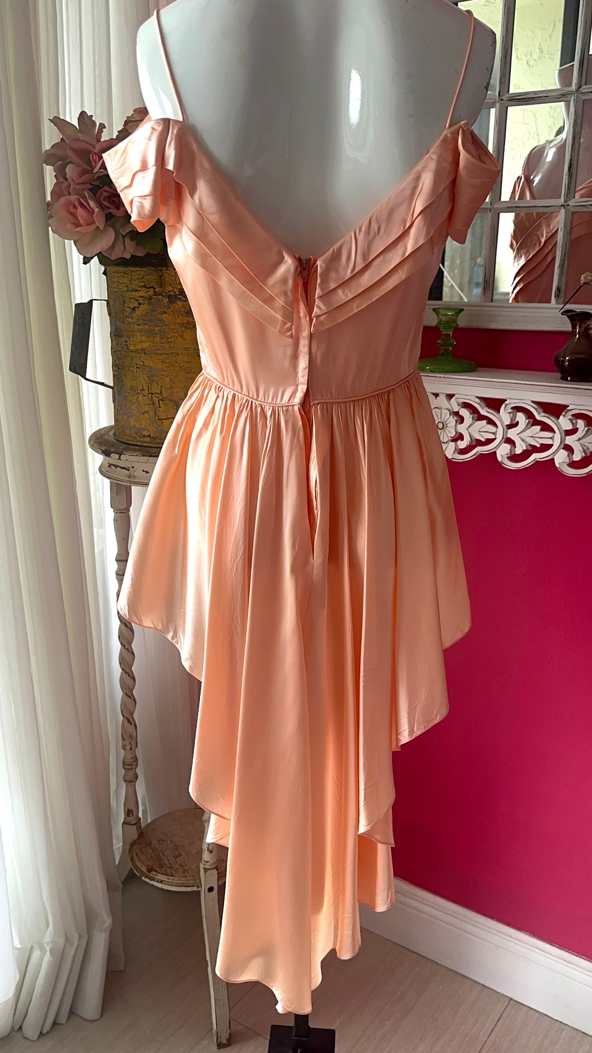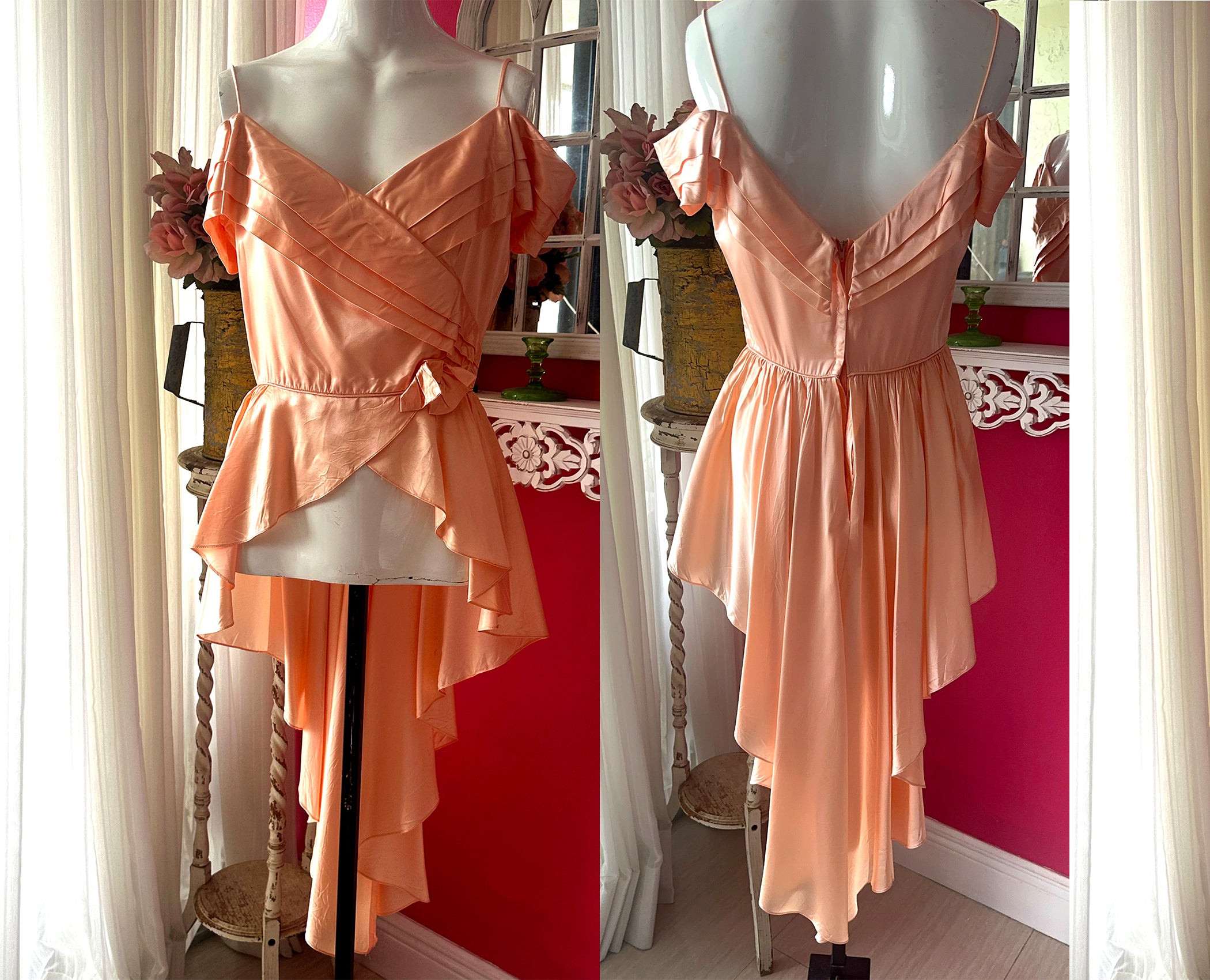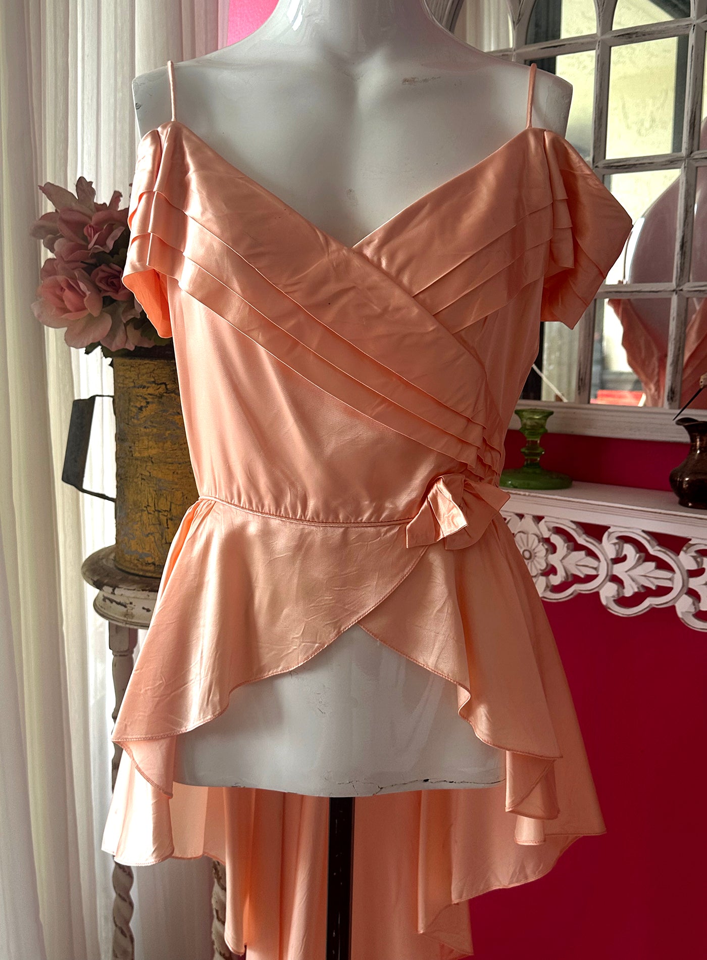 Vintage 1970s Peach Satin Reworked Off Shoulder Top with beautiful pleated Draped Bustline. Fitted at the waist then drapes out into wings that are shorter at the front and sweeps around the back into a whimsical flowy long tuxedo like skirt.Gorgeous low V Back. I bought this and knowing what I wanted to do to it to make it more unique. There was a short skirt that I. felt took away from this top, and that this way it would be amazing with a pair of pants or skirt underneath so that it really showed the beauty of the front wing like front. I cut out the skirt but kept the zipper in the back so you could still get into it. The peachy color is so gorgeous and reminiscent of 1930s silk slips. The sleeves are lovely and there is a bow at the left side of the waist. It is n very good condition but there are a few slices in the back of the skirt which I noted in the last image. As there is so much draping in the back it is barely noticeable and the dress is intact.
