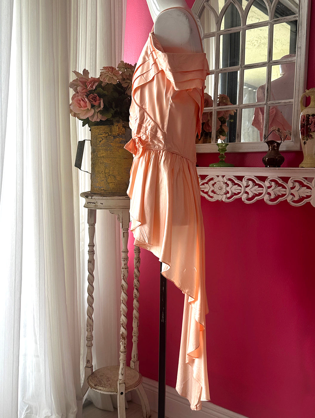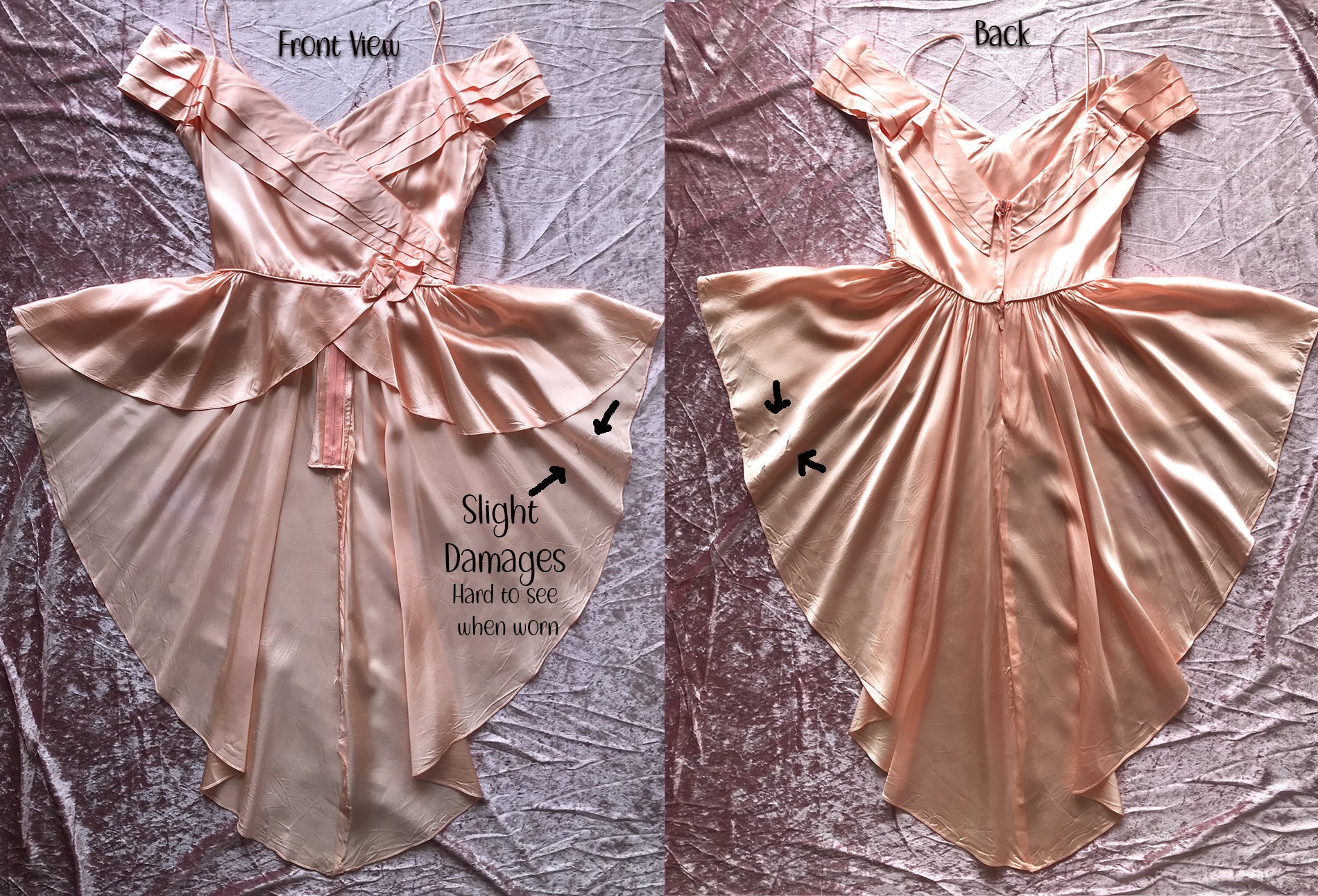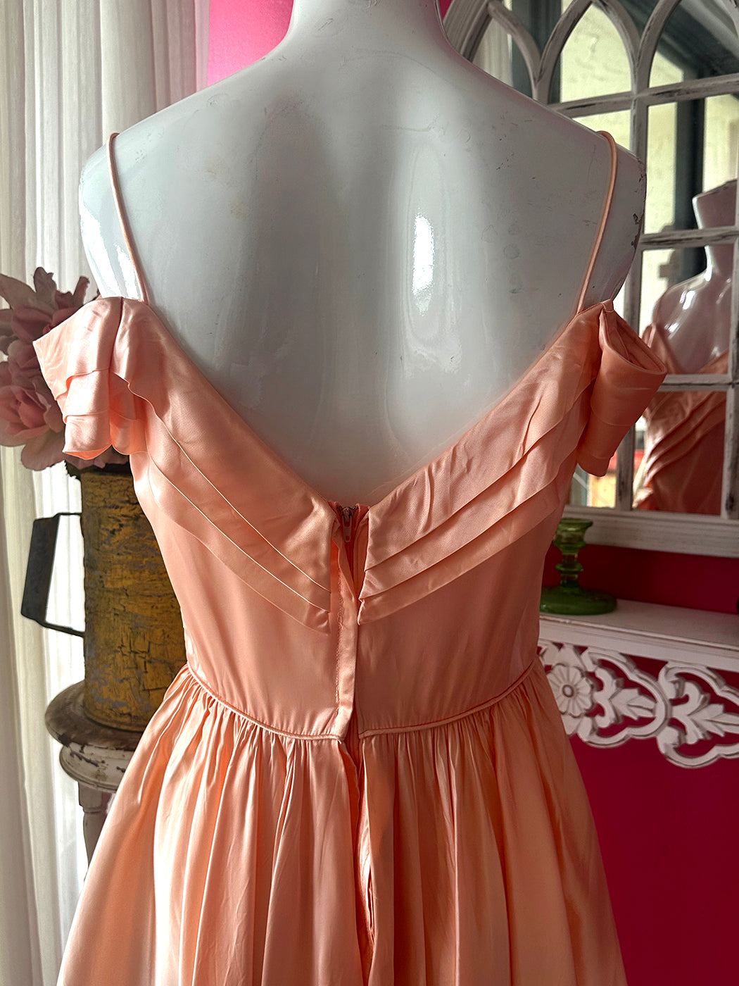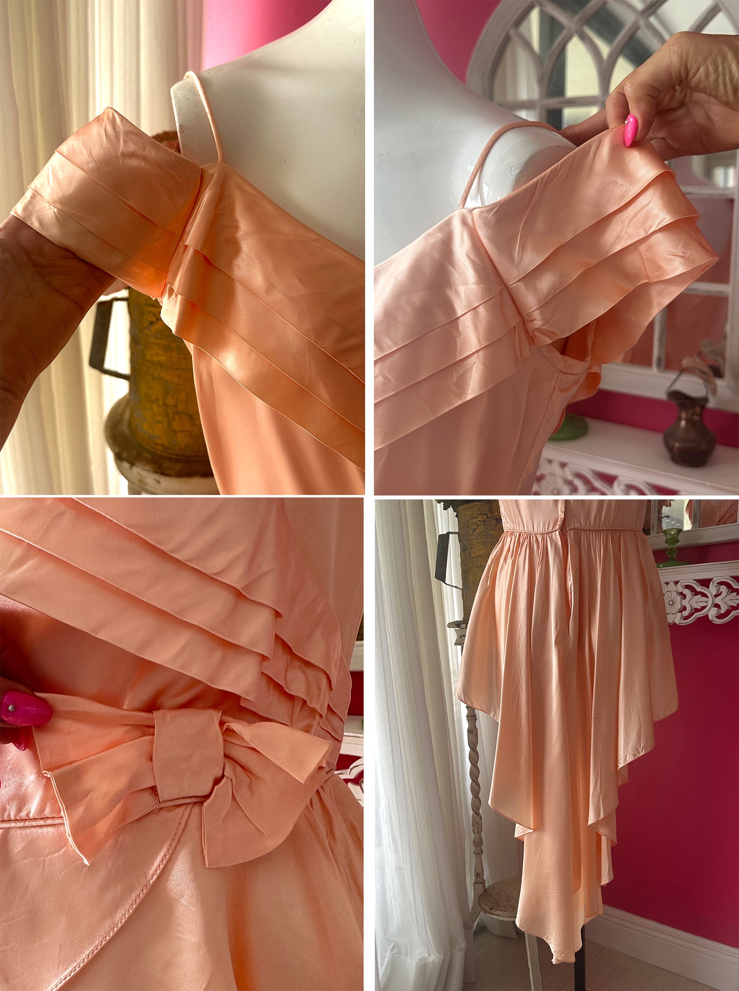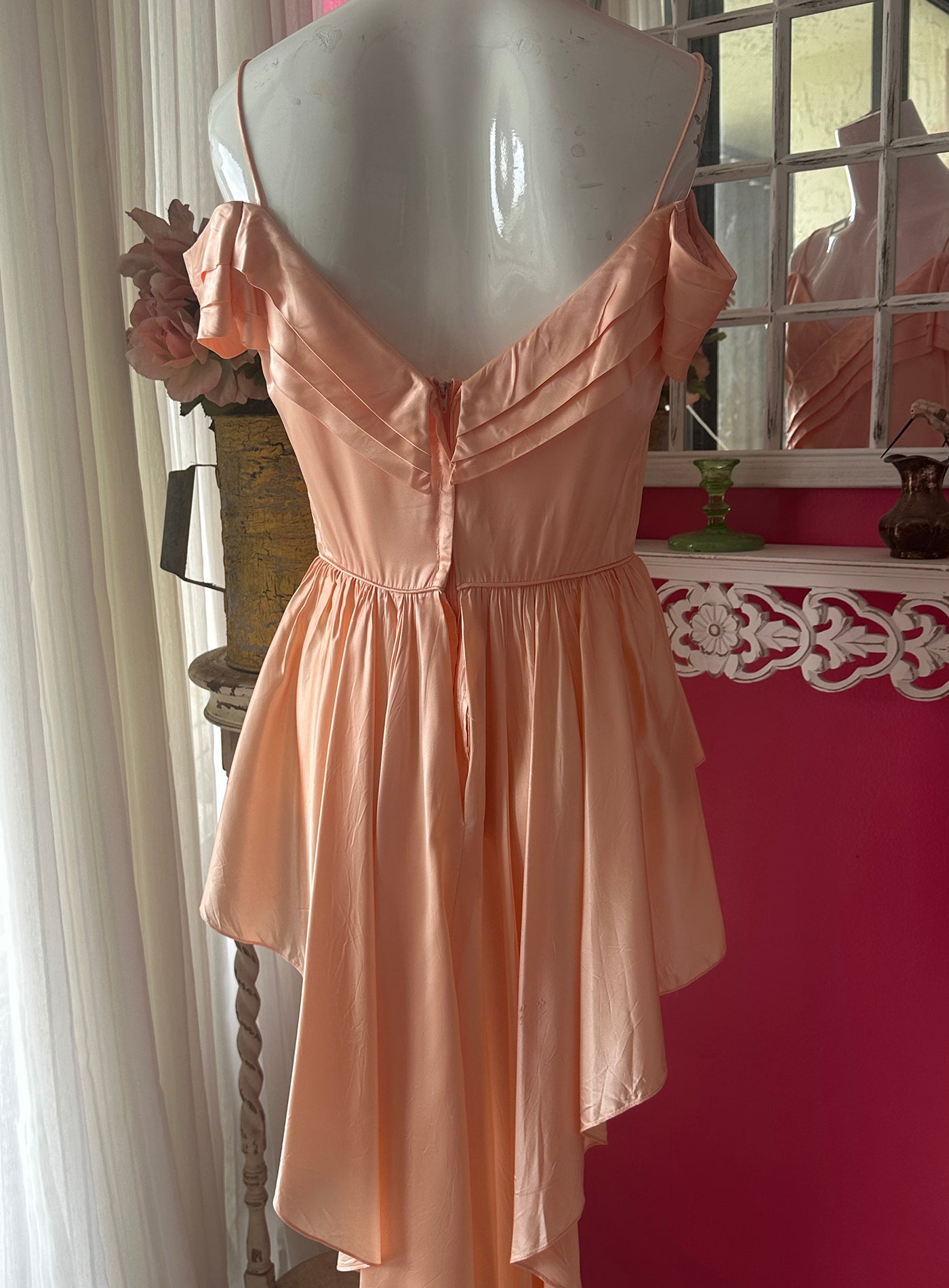 Vintage 1970s Peach Satin Reworked Off Shoulder Top with beautiful pleated Draped Bustline. Fitted at the waist then drapes out into wings that are shorter at the front and sweeps around the back into a whimsical flowy long tuxedo like skirt.Gorgeous low V Back. I bought this and knowing what I wanted to do to it to make it more unique. There was a short skirt that I. felt took away from this top, and that this way it would be amazing with a pair of pants or skirt underneath so that it really showed the beauty of the front wing like front. I cut out the skirt but kept the zipper in the back so you could still get into it. The peachy color is so gorgeous and reminiscent of 1930s silk slips. The sleeves are lovely and there is a bow at the left side of the waist. It is n very good condition but there are a few slices in the back of the skirt which I noted in the last image. As there is so much draping in the back it is barely noticeable and the dress is intact.
