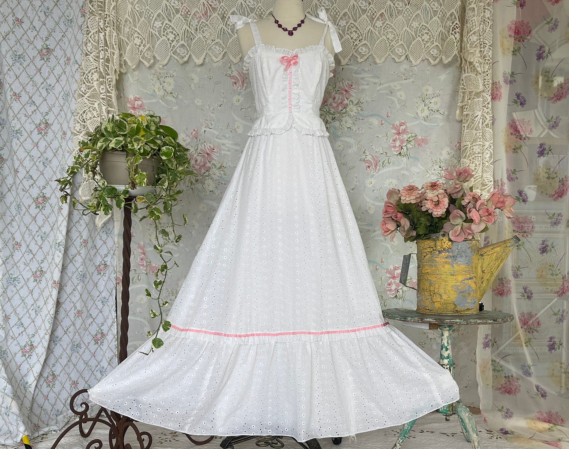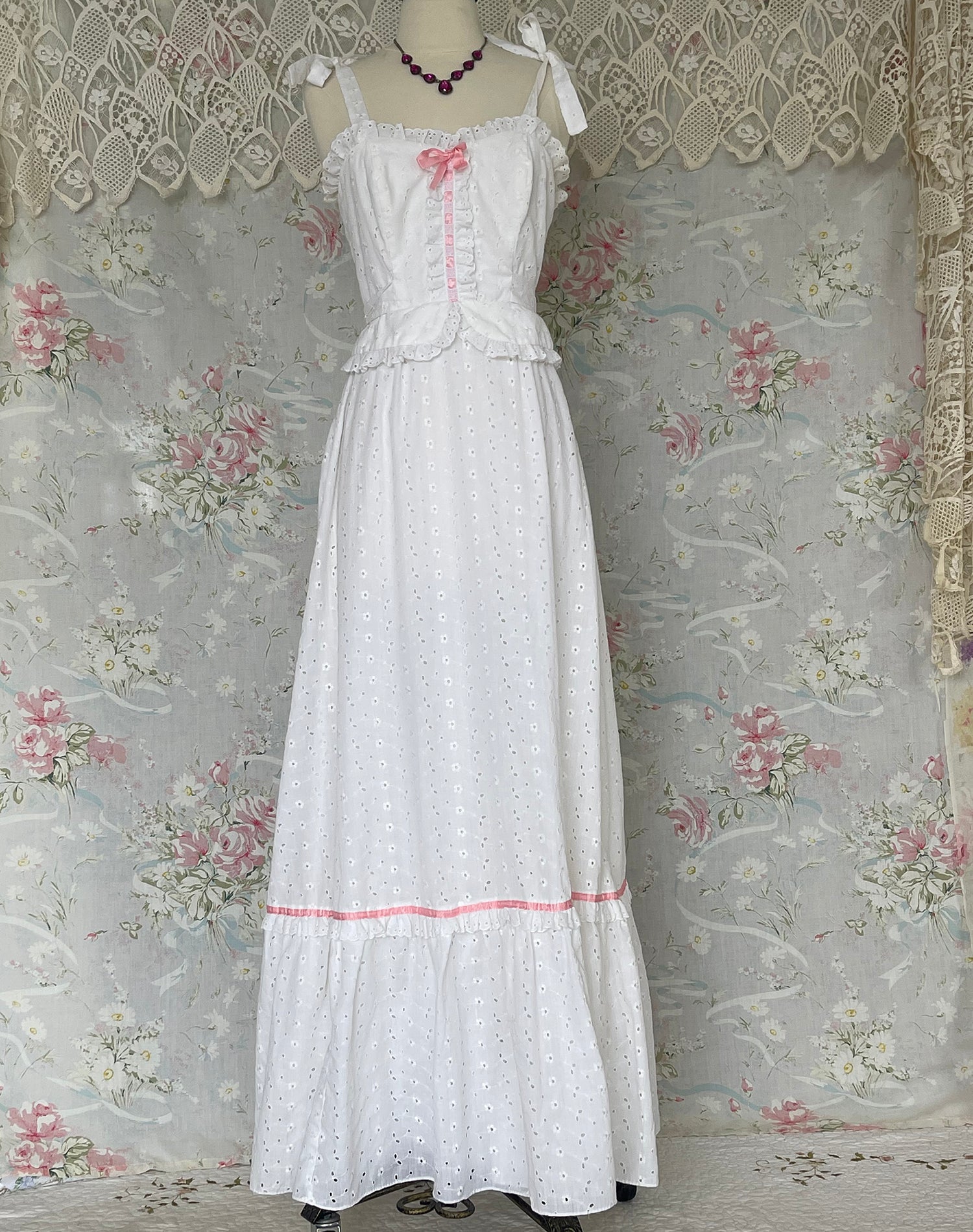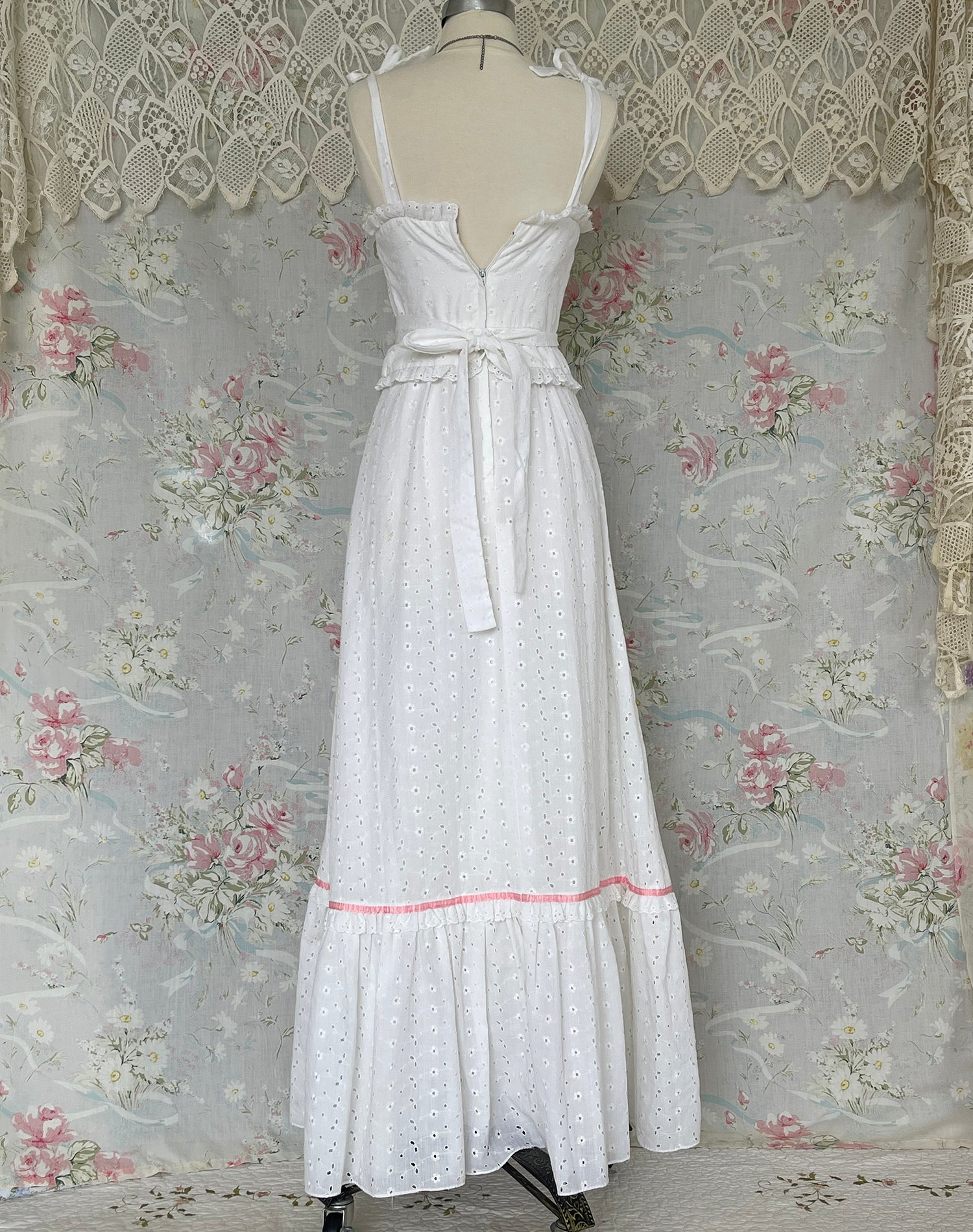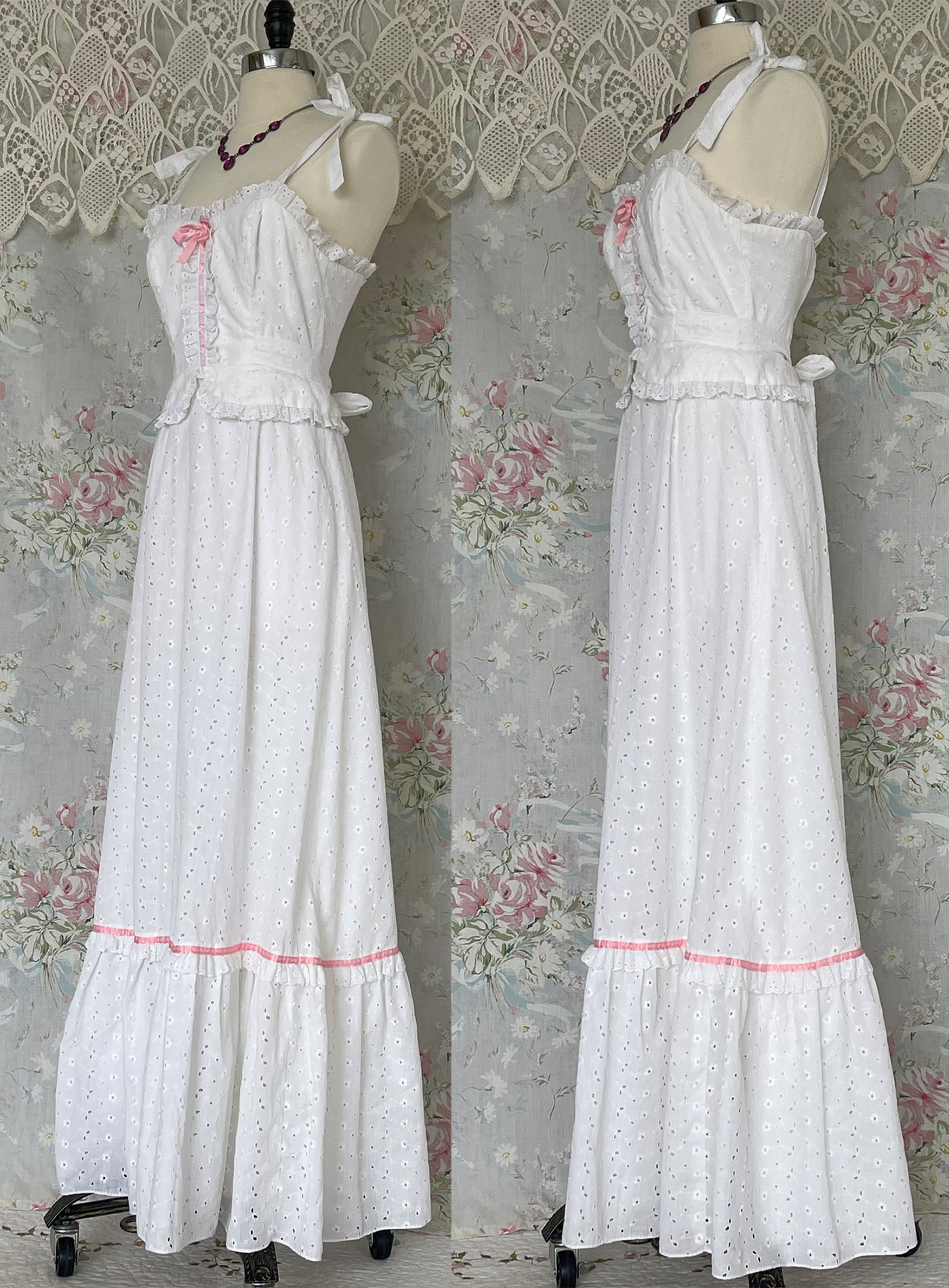 Vintage 1970's White and Pink Eyelet Full Swing Prairie Maxi Dress in Jessica McClintock Style with Pink Satiny Ribbon at the Corset Like Top and above the Ruffled hemline. Perfect for a Boho Wedding! Fully lined. The back has a long zipper which is in great working condition. The dress was just a bit small for my mannequin. There are Tie's at the top as straps. In a soft vintagey cotton. The lining appears to be acetate and is the hem is tattered but can be fixed if you want it to be, otherwise in fabulous condition.