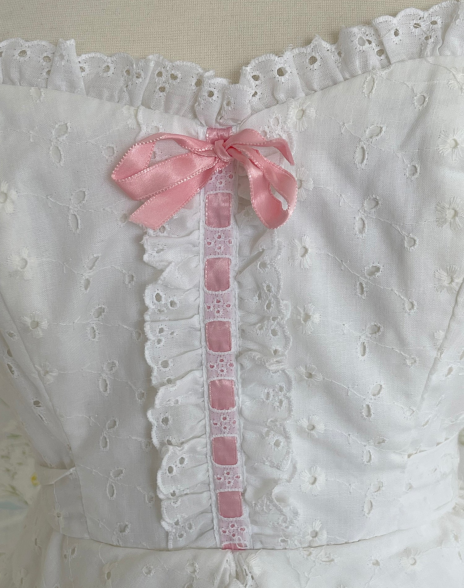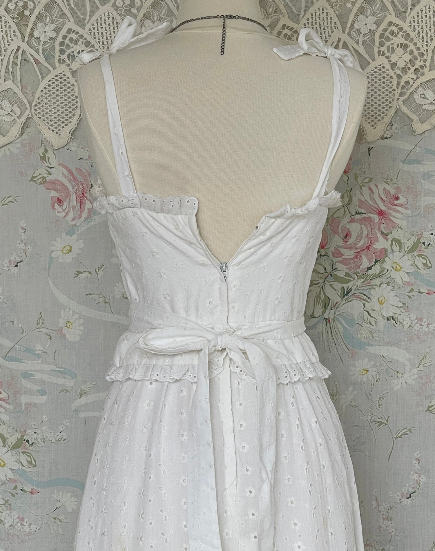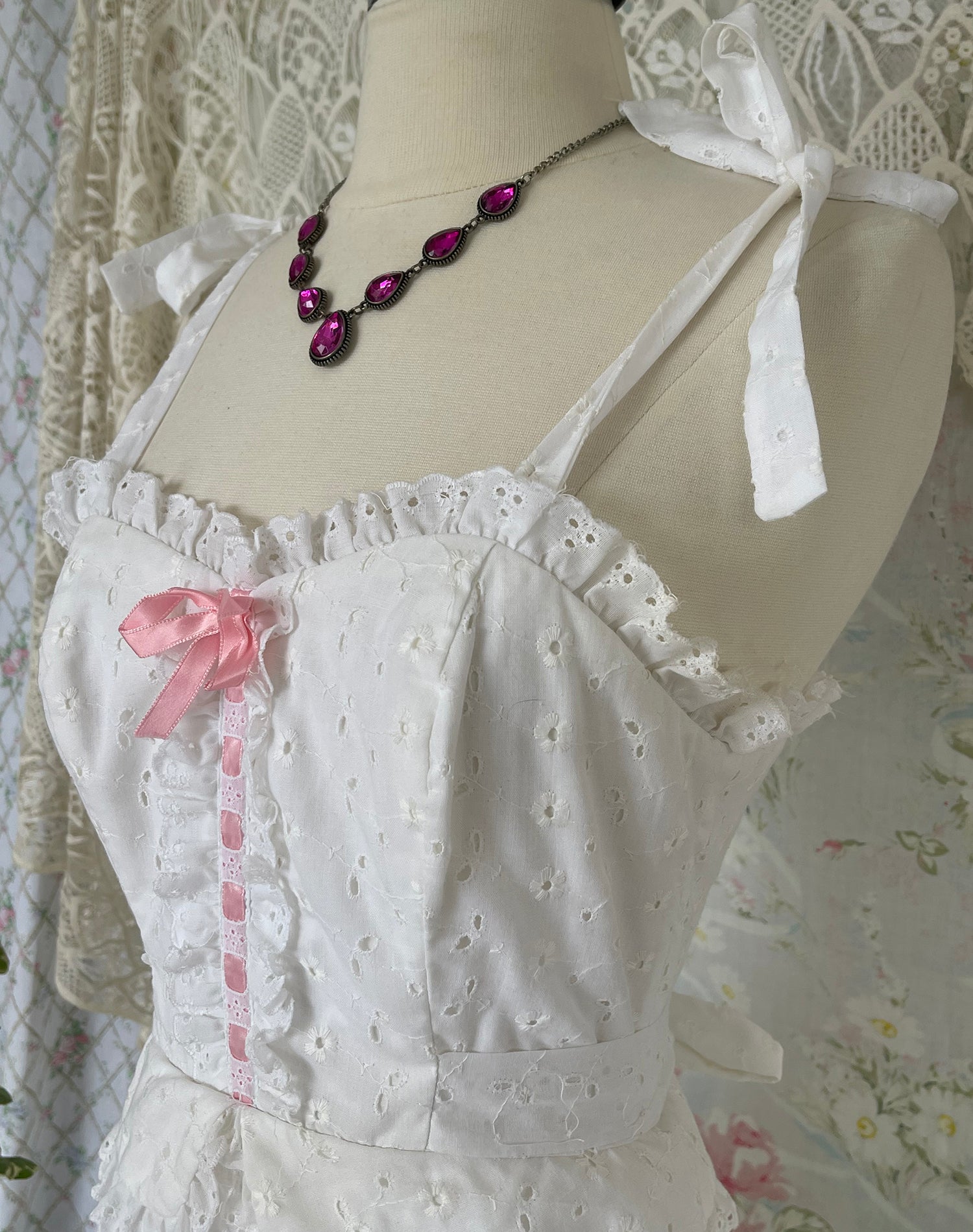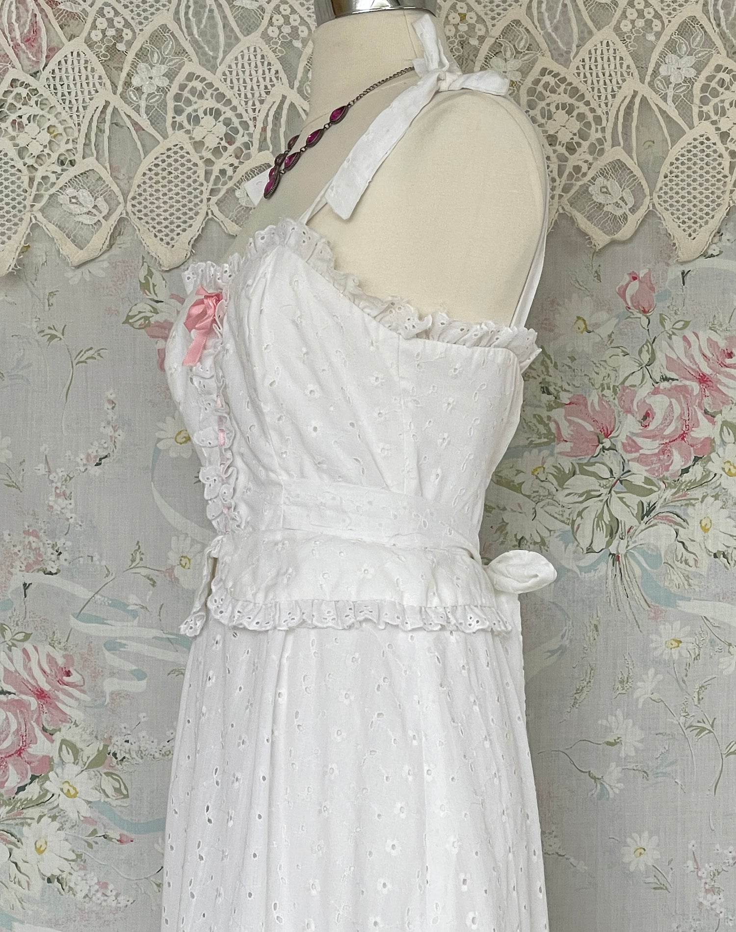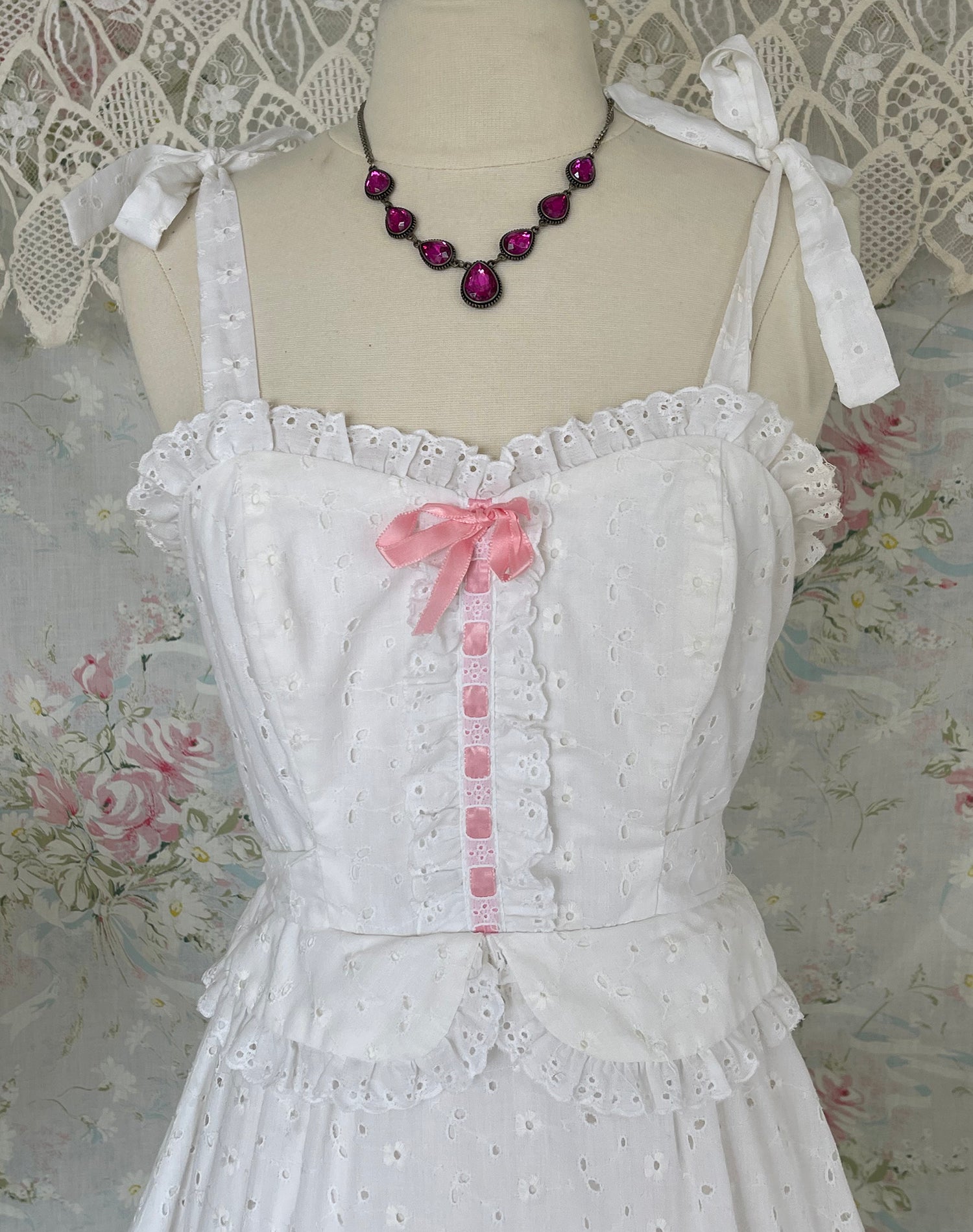 Vintage 1970's White and Pink Eyelet Full Swing Prairie Maxi Dress in Jessica McClintock Style with Pink Satiny Ribbon at the Corset Like Top and above the Ruffled hemline. Perfect for a Boho Wedding! Fully lined. The back has a long zipper which is in great working condition. The dress was just a bit small for my mannequin. There are Tie's at the top as straps. In a soft vintagey cotton. The lining appears to be acetate and is the hem is tattered but can be fixed if you want it to be, otherwise in fabulous condition.