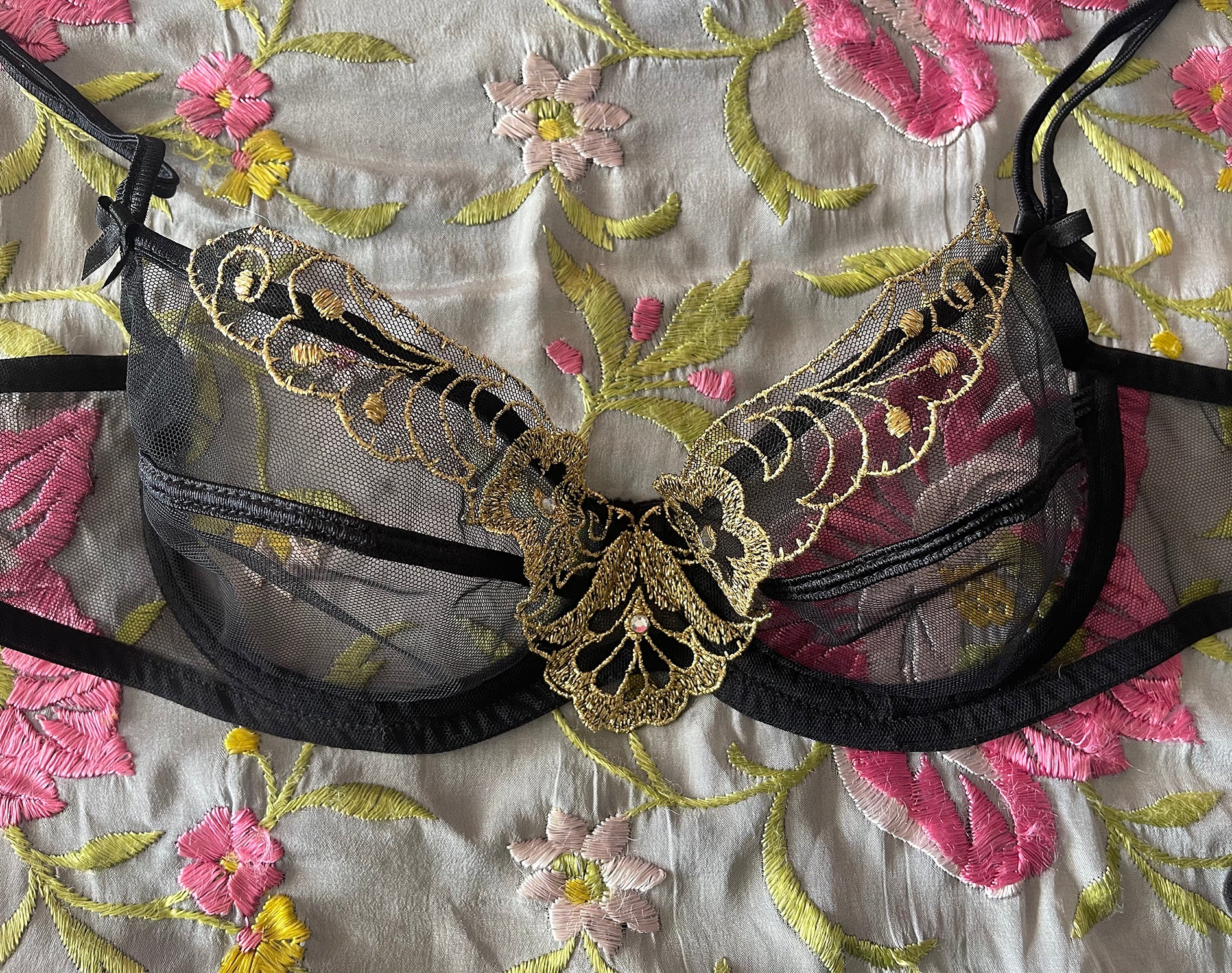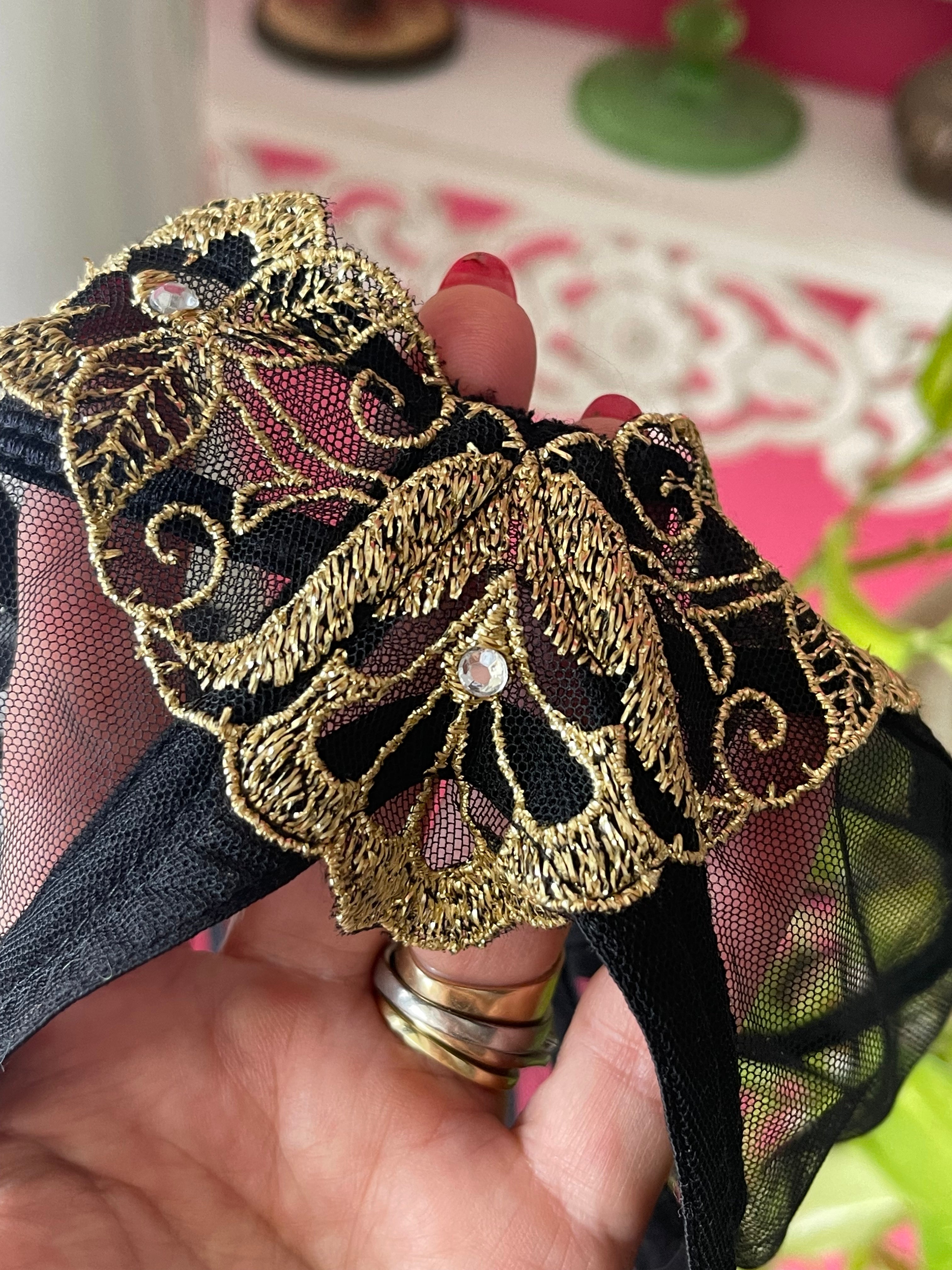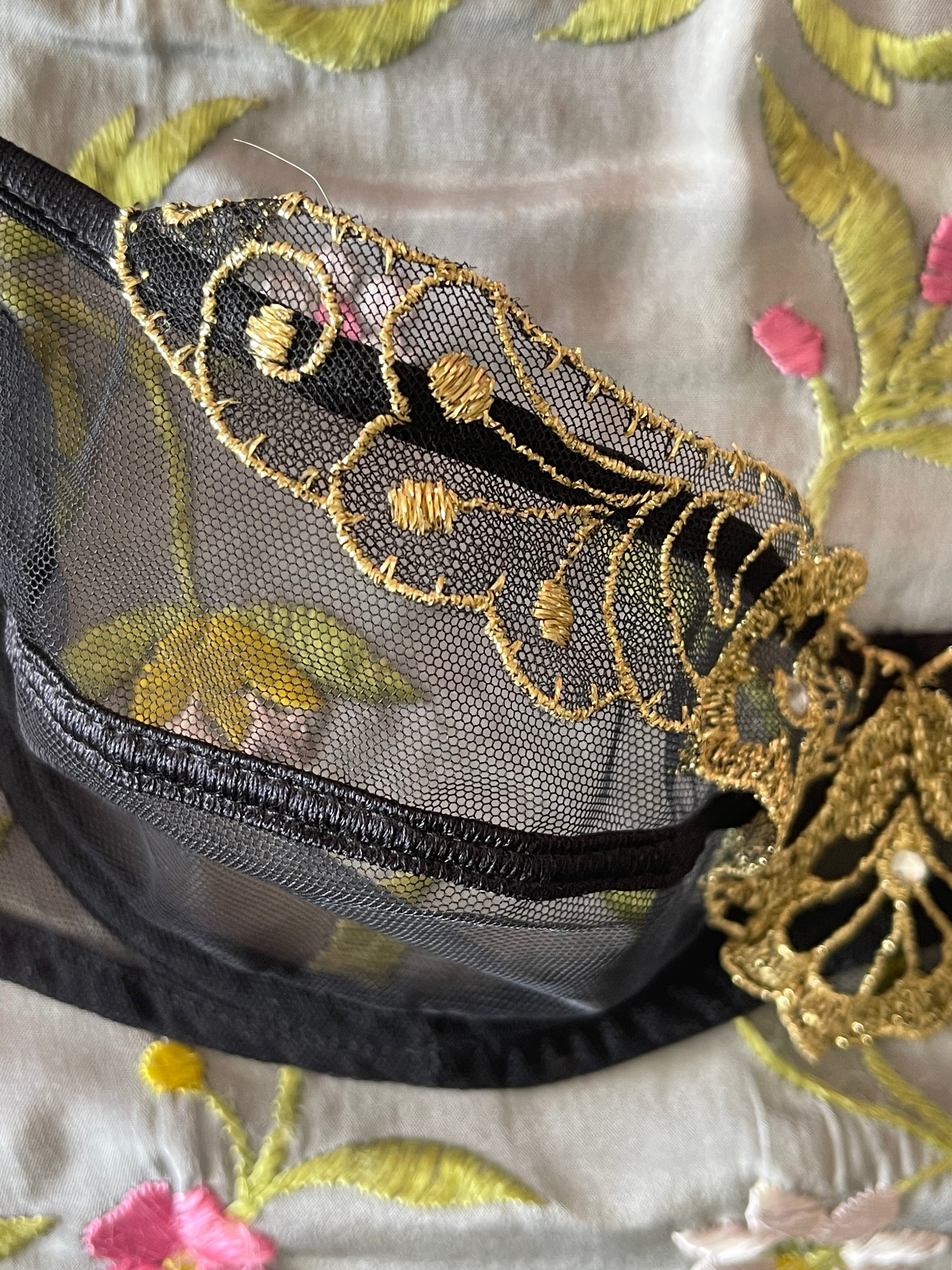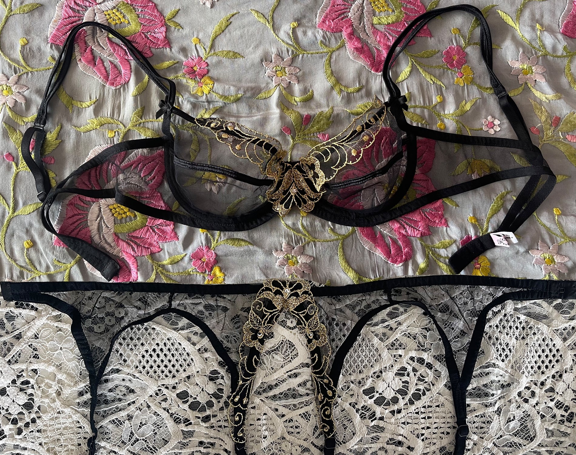 Vintage Sheer Mesh 1980s Black and Gold Agent Provocateur Bra and Garter Size 34 B Rhinestone Set. Bra and Garter are embellished with Metallic Gold Embroidered Threads. 100 % Nylon. Made in France. Bra has underwire. Worn once.