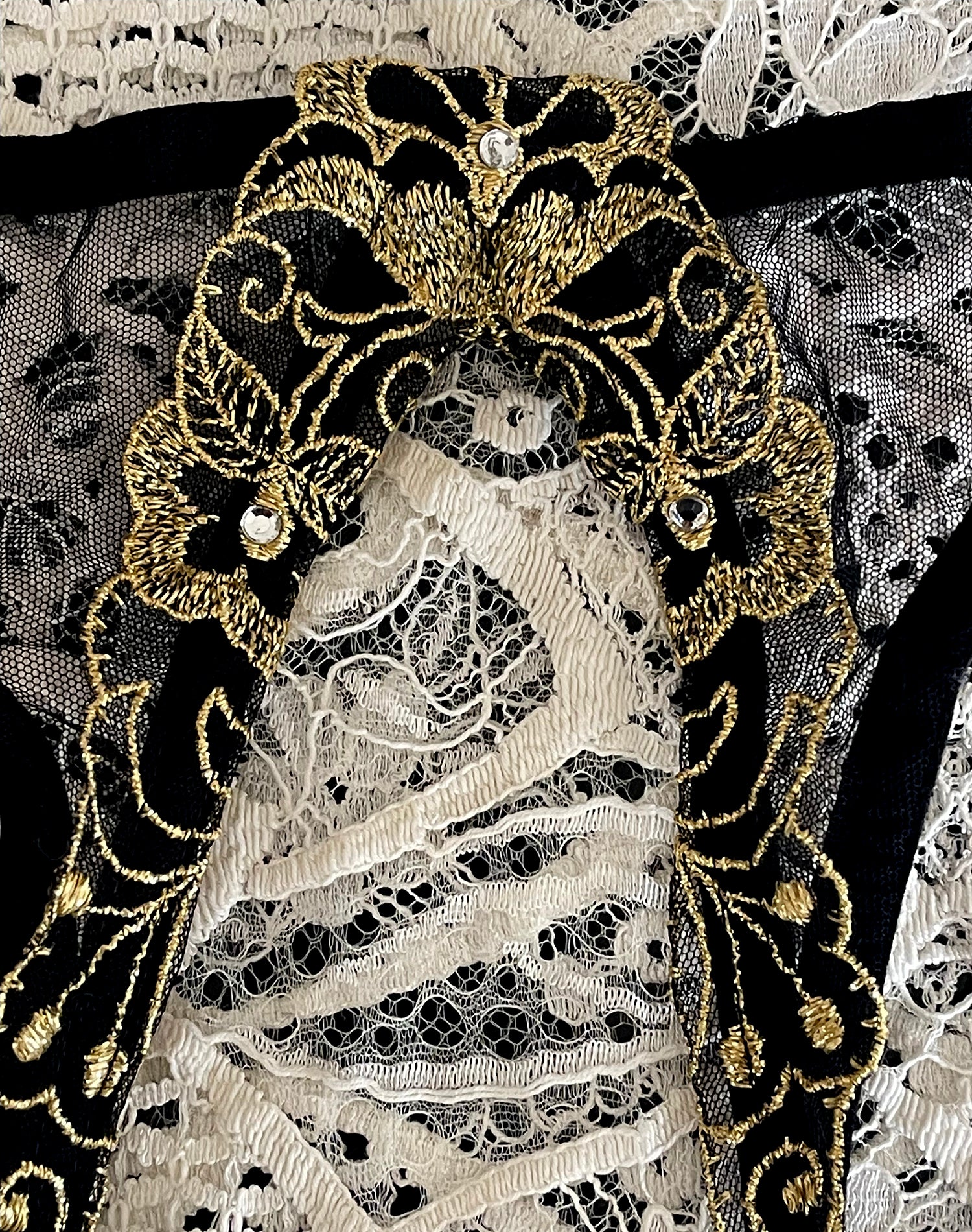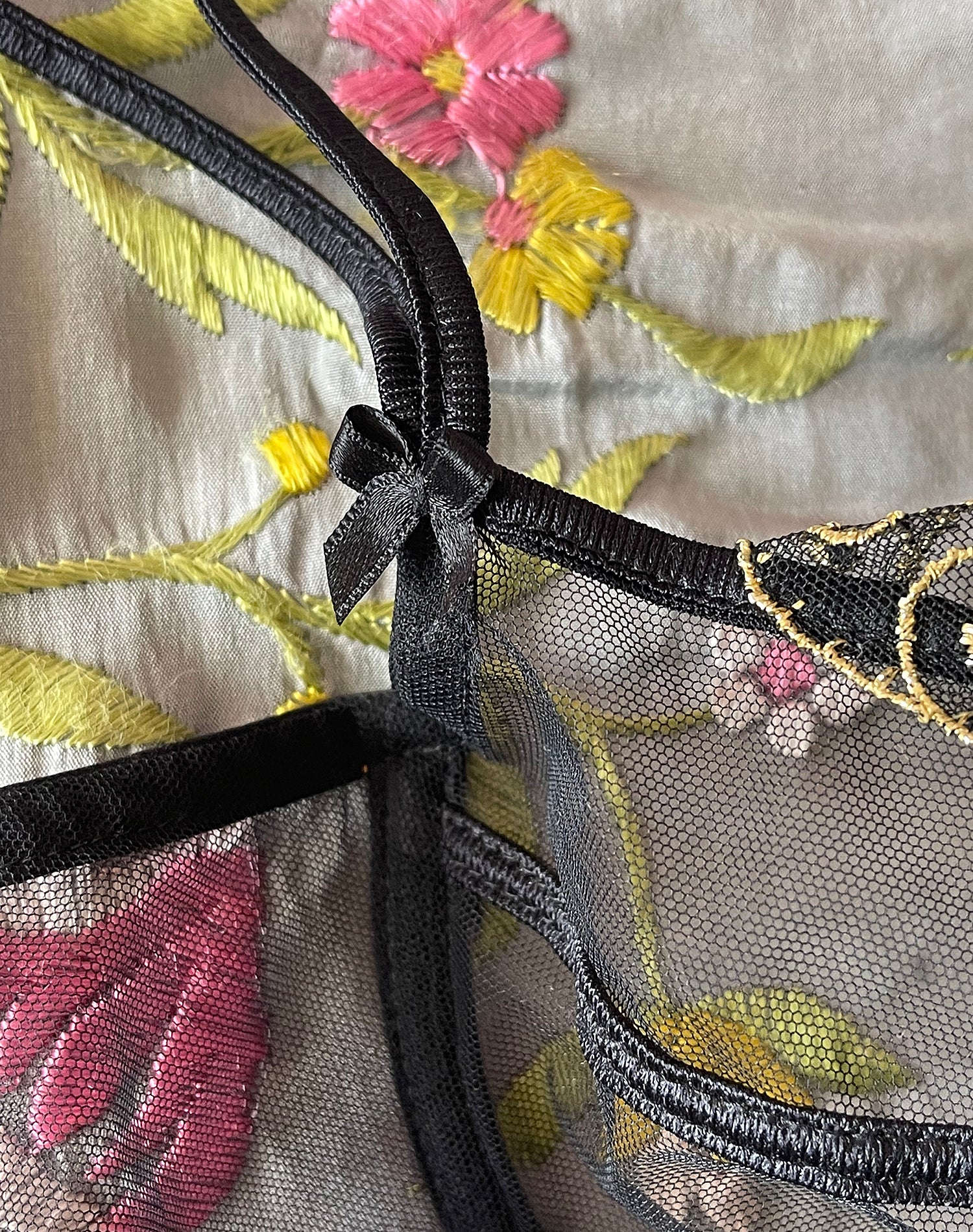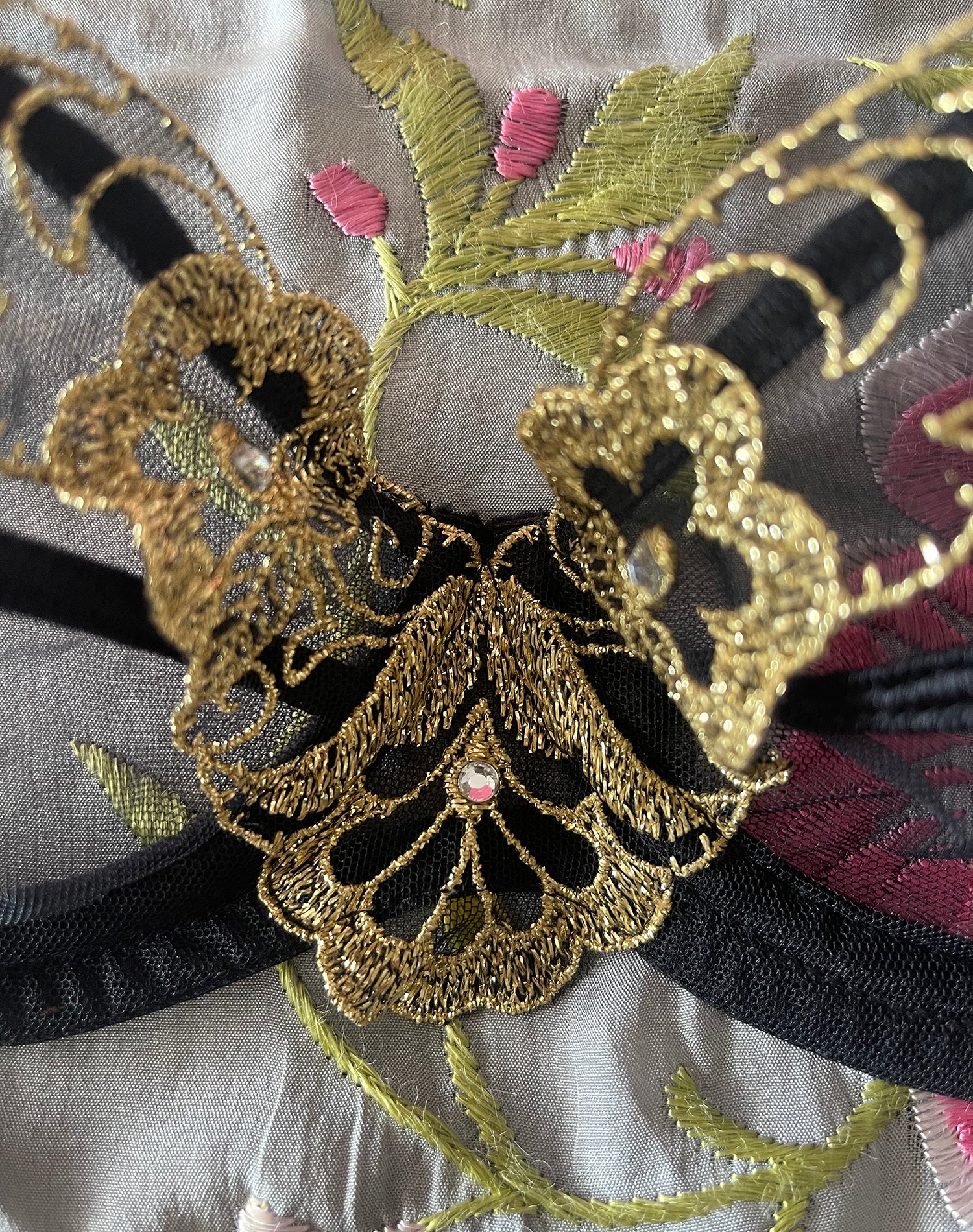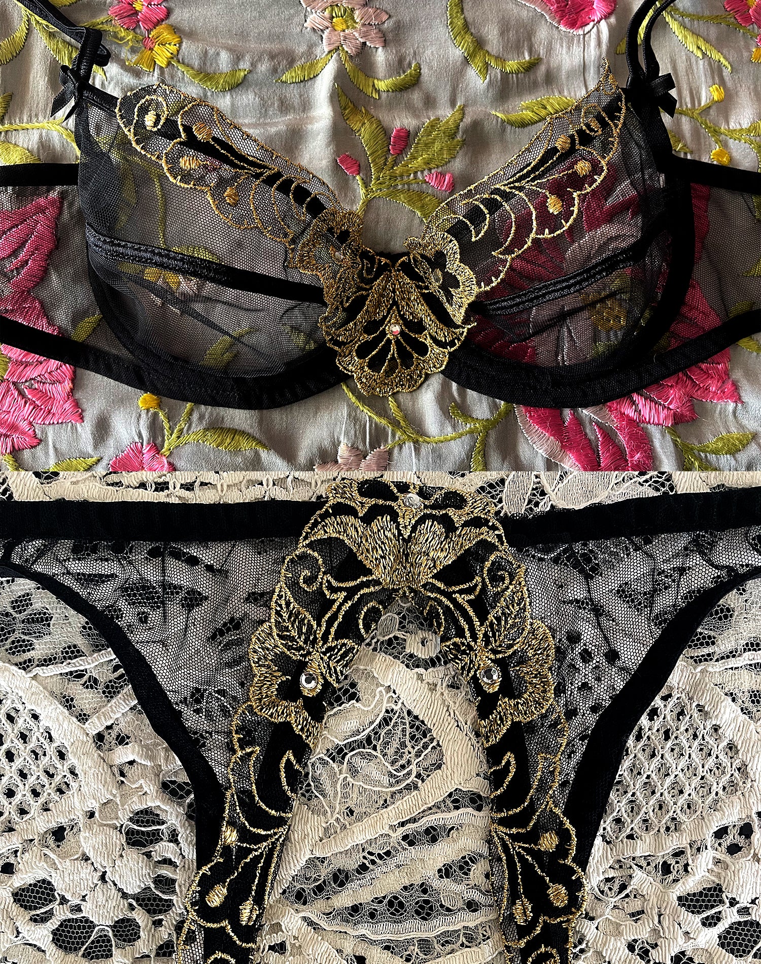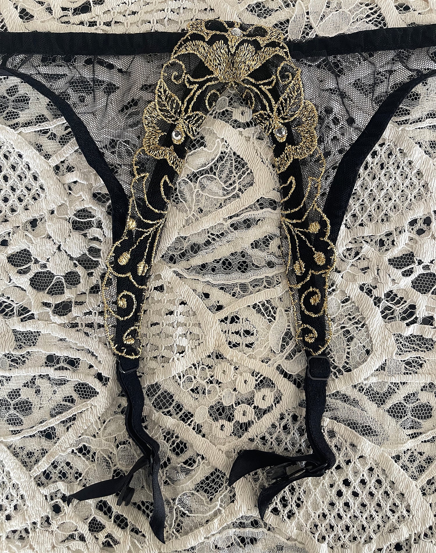 Vintage Sheer Mesh 1980s Black and Gold Agent Provocateur Bra and Garter Size 34 B Rhinestone Set. Bra and Garter are embellished with Metallic Gold Embroidered Threads. 100 % Nylon. Made in France. Bra has underwire. Worn once.