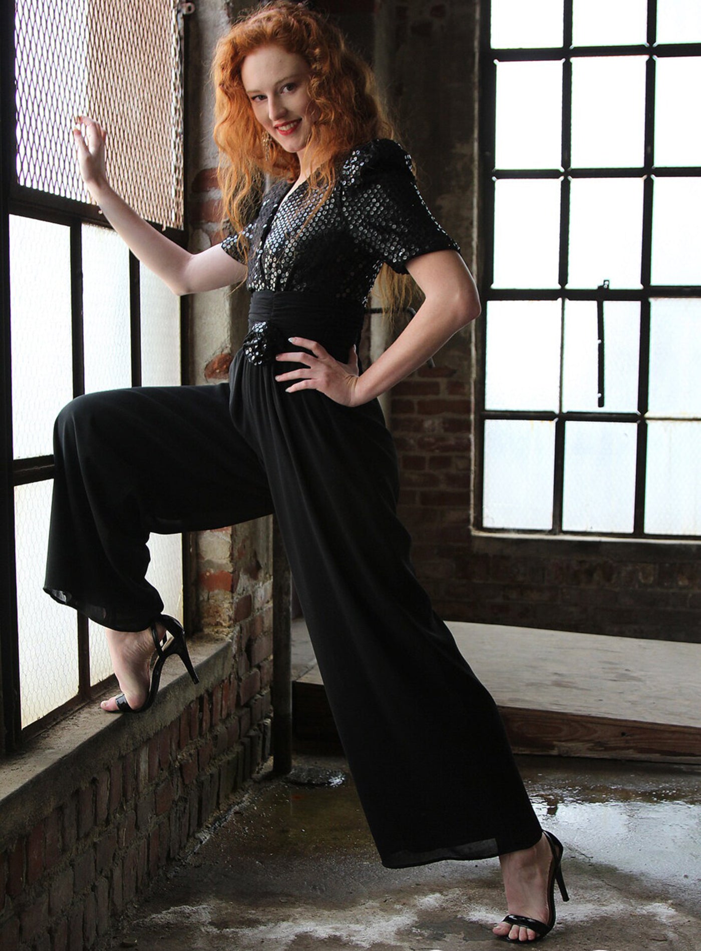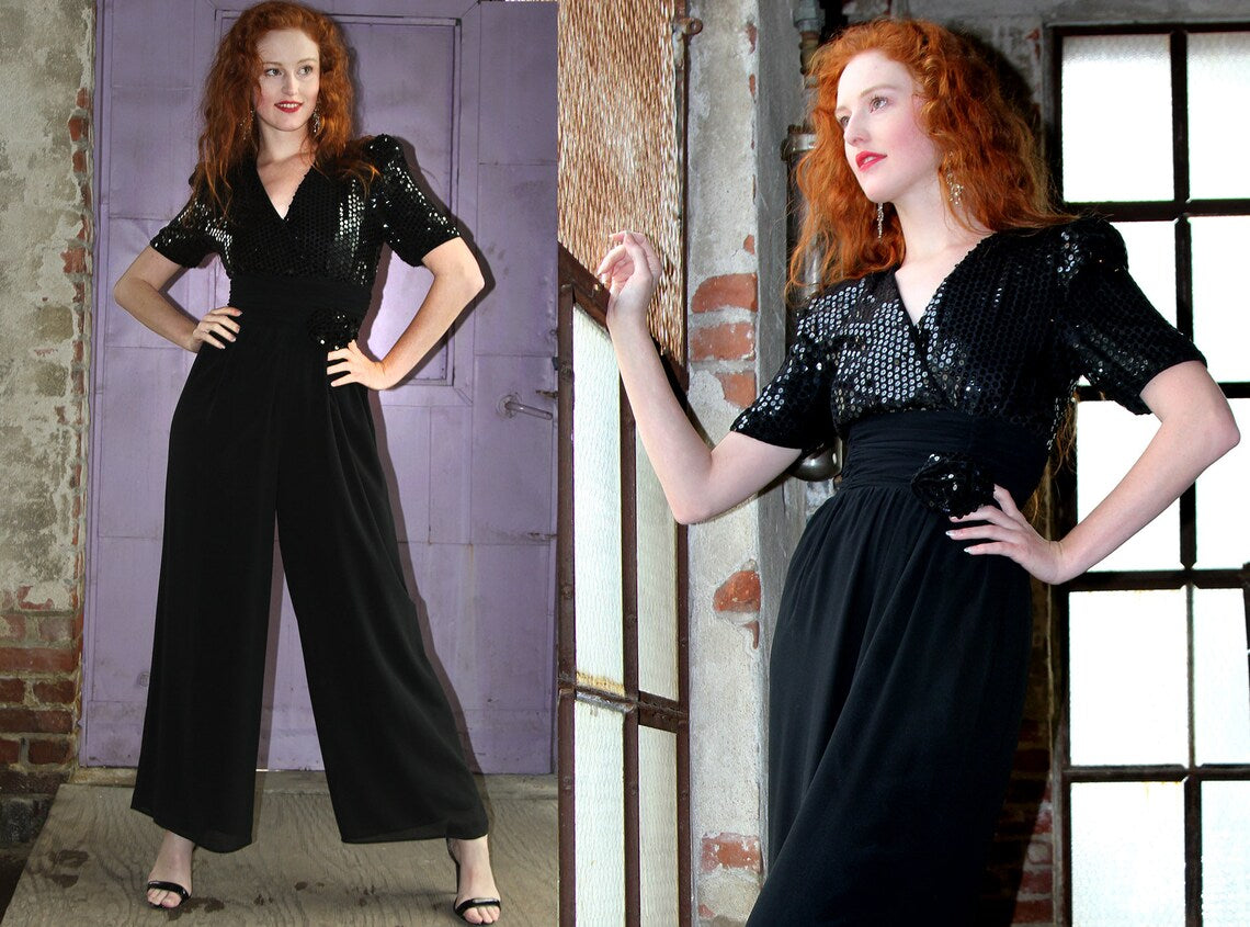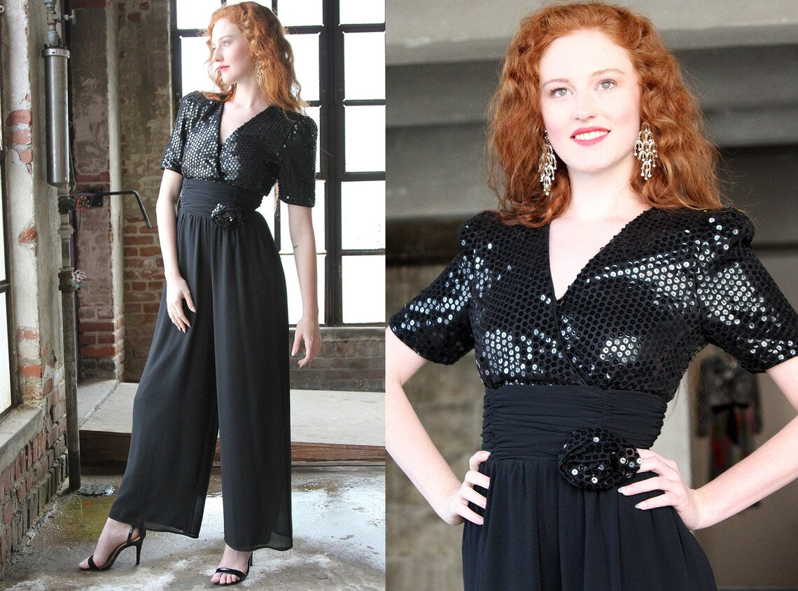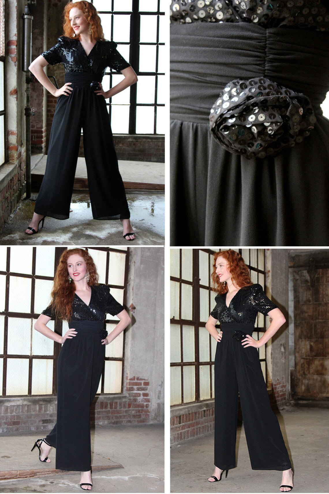 Vintage 1980s Black Sequin Cumber Bun Ruched Onesie Jumpsuit with Sequin V Neck Neckline, Sequin Floral Rose Embellishment at waist, Sheer Lined Wide Leg pants. Zips up the back. Chic and elegant and so easy to wear! Wear with a great pair of heels or high heeled boots. Throw on a great pair of earrings that sparkle a plenty and your ready for a great night out on the town or for a cocktail party! Such a great find!