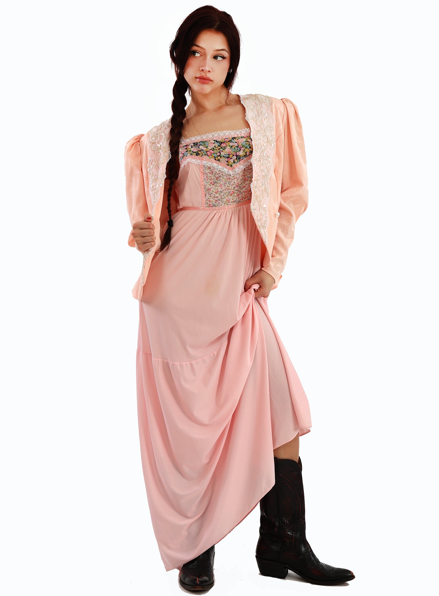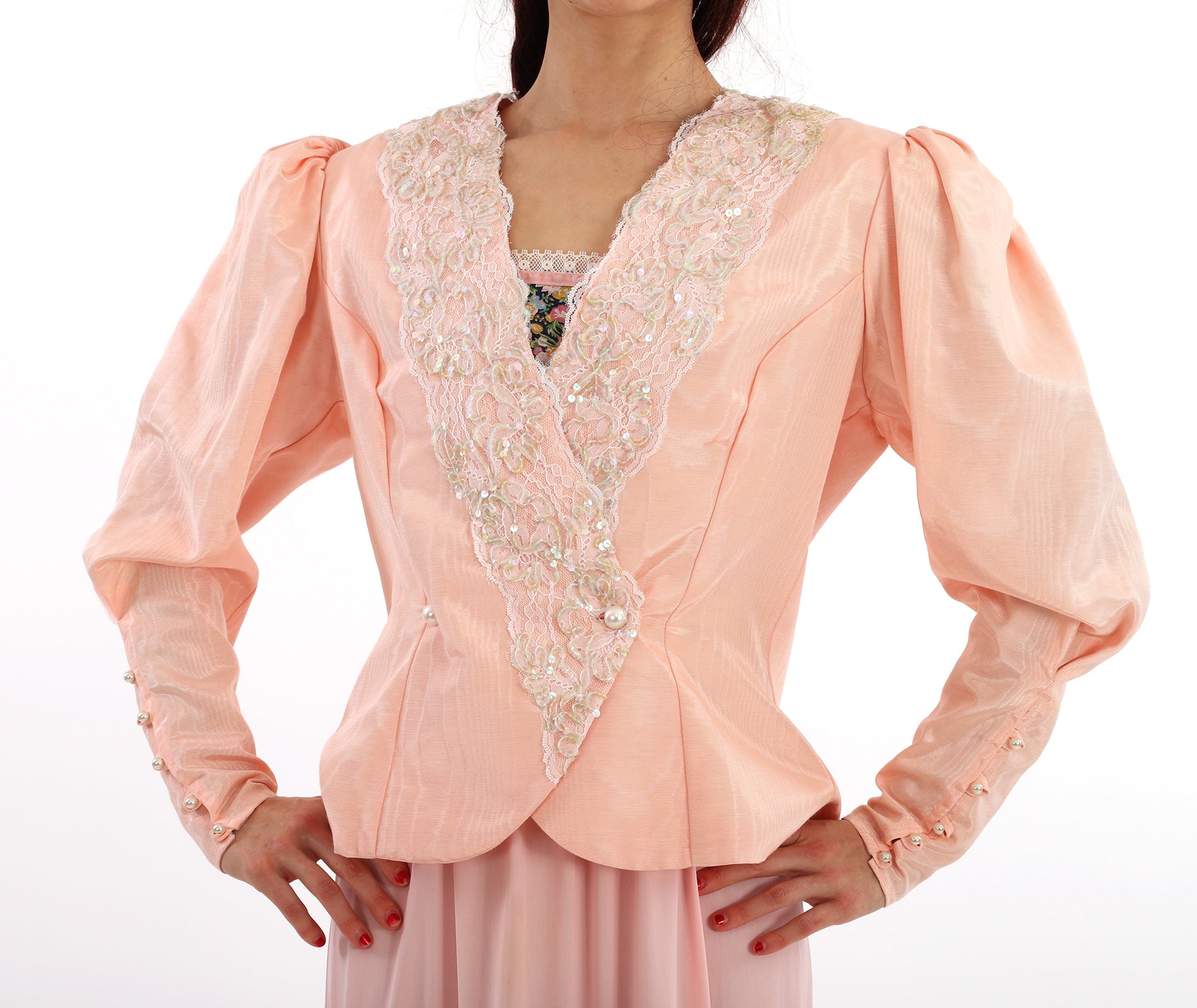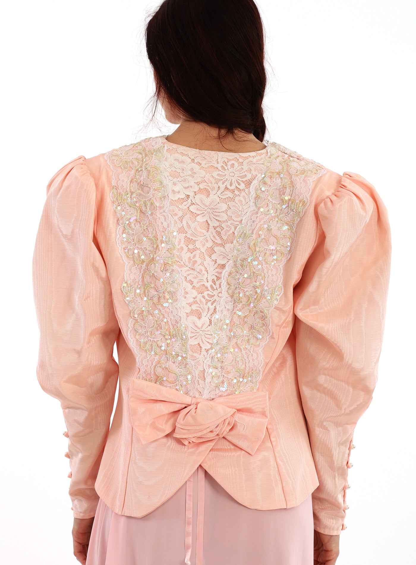 Vintage 1980s Jessica McClintock Pink Lace Sequined Poet Puff Sleeve Jacket with Tapered Sleeves with buttons that run from elbow to wrist, a beautiful Rose Bow at the back, and has a gentle split at the hemline in the back. Has a gentle peplum waist and the jacket crosses over the chest with lace and sequin embellishments and two large Pearlized buttons at the waist and the end of the sleeves. Shoulder pads. Lovely Scalloped back with Rose embellished bow. The fabric has a lovely sheen to it. In excellent condition. Great with a vintage dress, or a pair of jeans. Such a gorgeous ballet peachy pink color. Great as shown with a vintage slip dress, but would also look so cool with a pair of jeans!