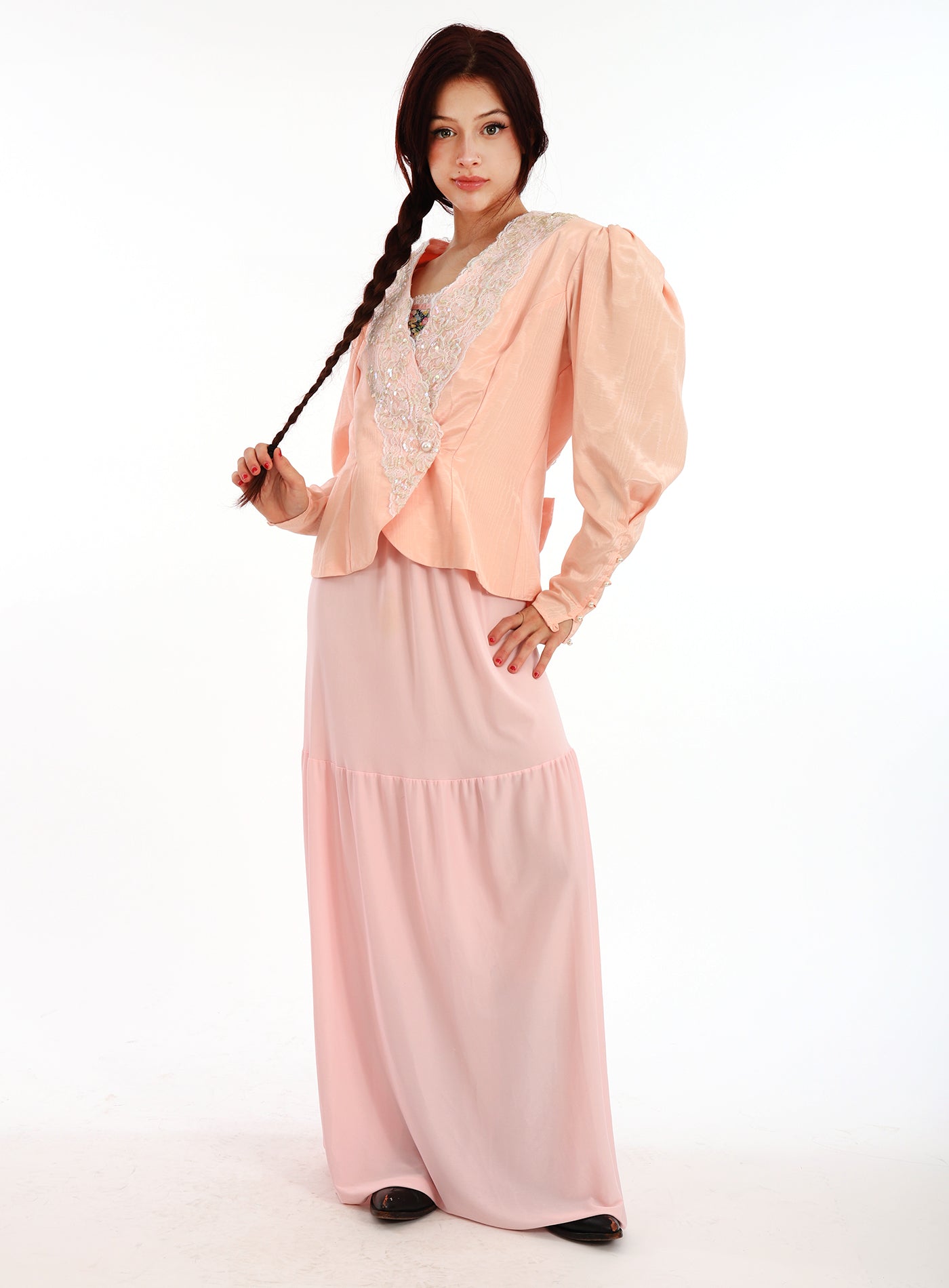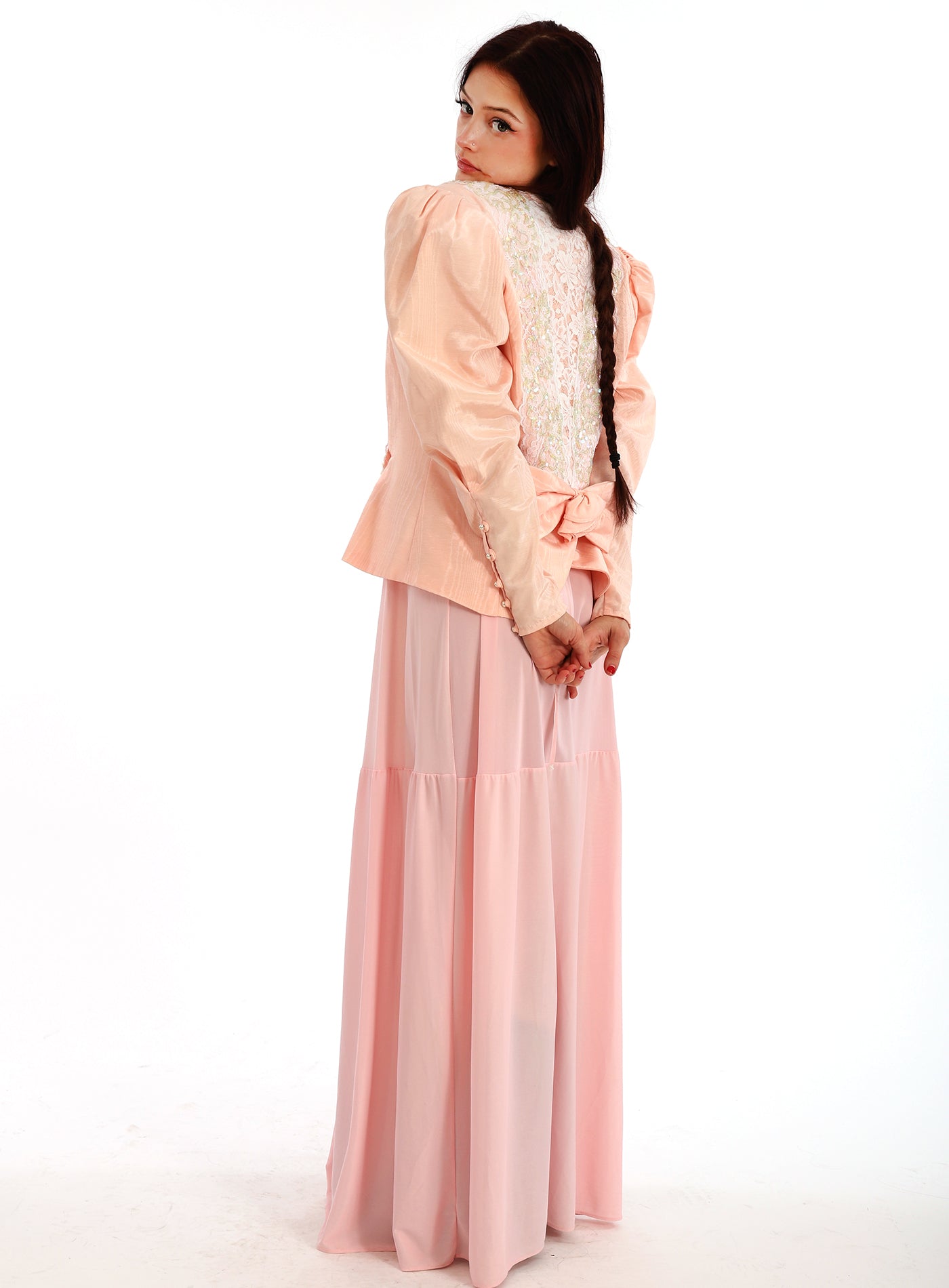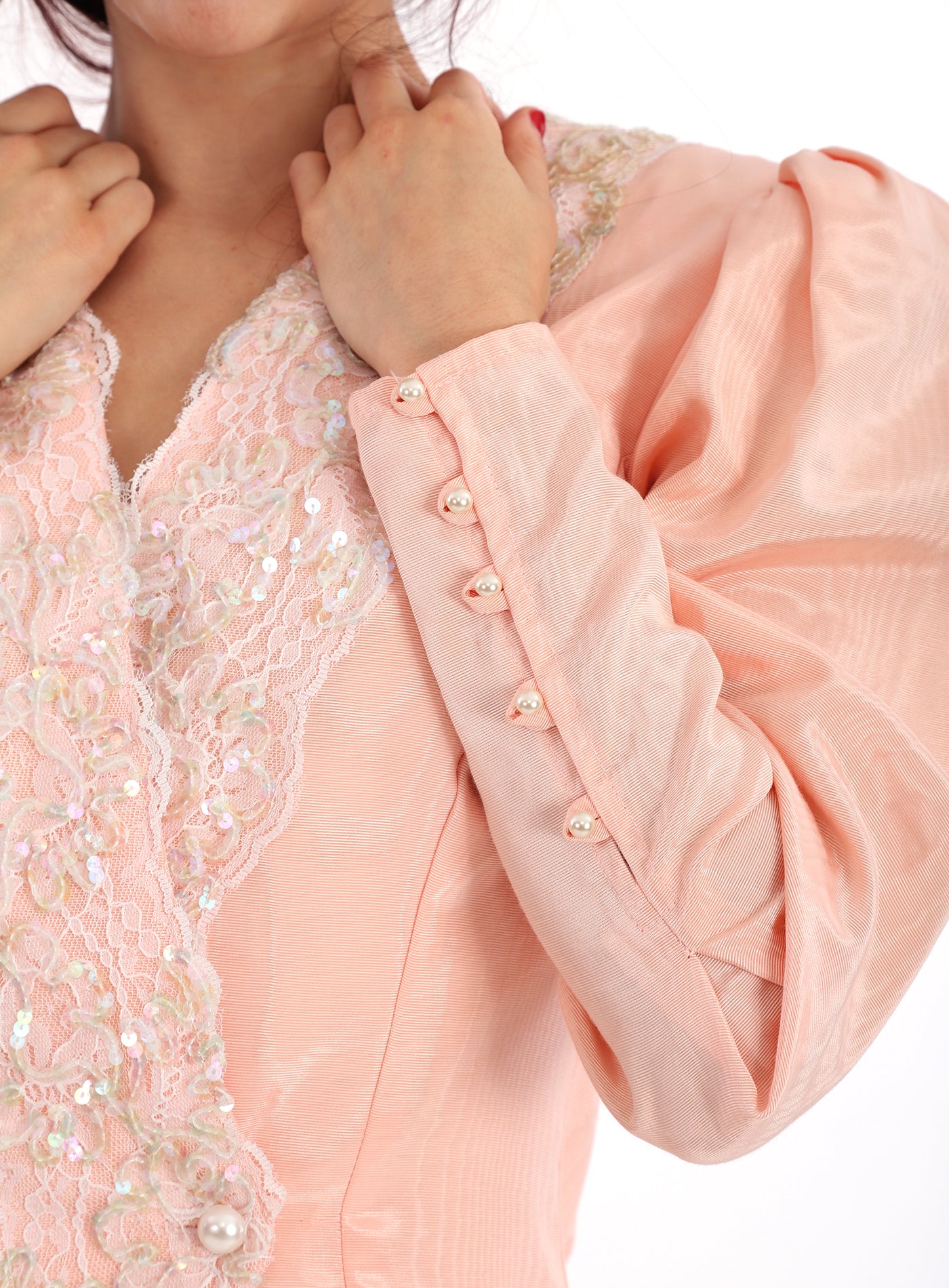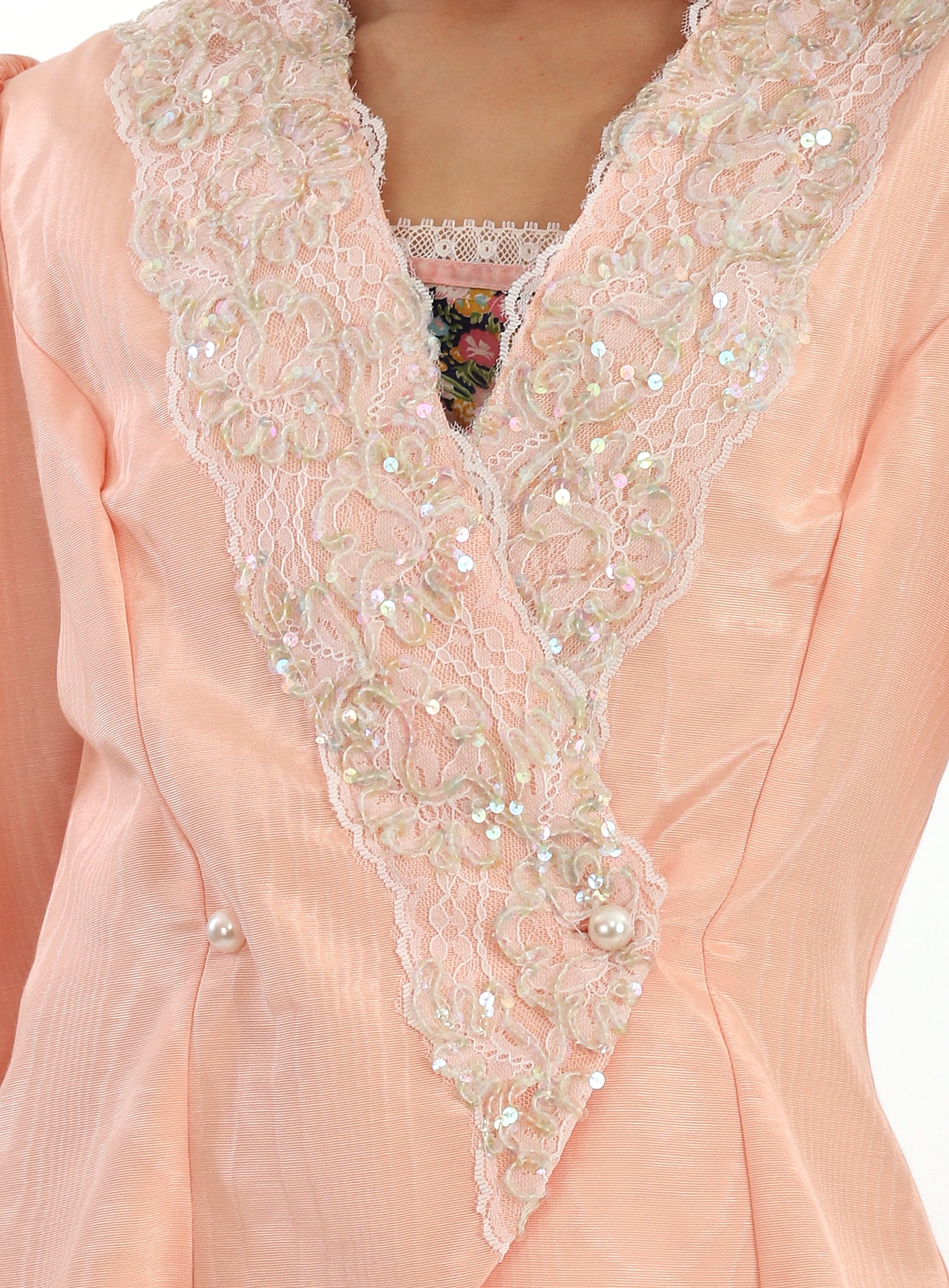 Vintage 1980s Jessica McClintock Pink Lace Sequined Poet Puff Sleeve Jacket with Tapered Sleeves with buttons that run from elbow to wrist, a beautiful Rose Bow at the back, and has a gentle split at the hemline in the back. Has a gentle peplum waist and the jacket crosses over the chest with lace and sequin embellishments and two large Pearlized buttons at the waist and the end of the sleeves. Shoulder pads. Lovely Scalloped back with Rose embellished bow. The fabric has a lovely sheen to it. In excellent condition. Great with a vintage dress, or a pair of jeans. Such a gorgeous ballet peachy pink color. Great as shown with a vintage slip dress, but would also look so cool with a pair of jeans!