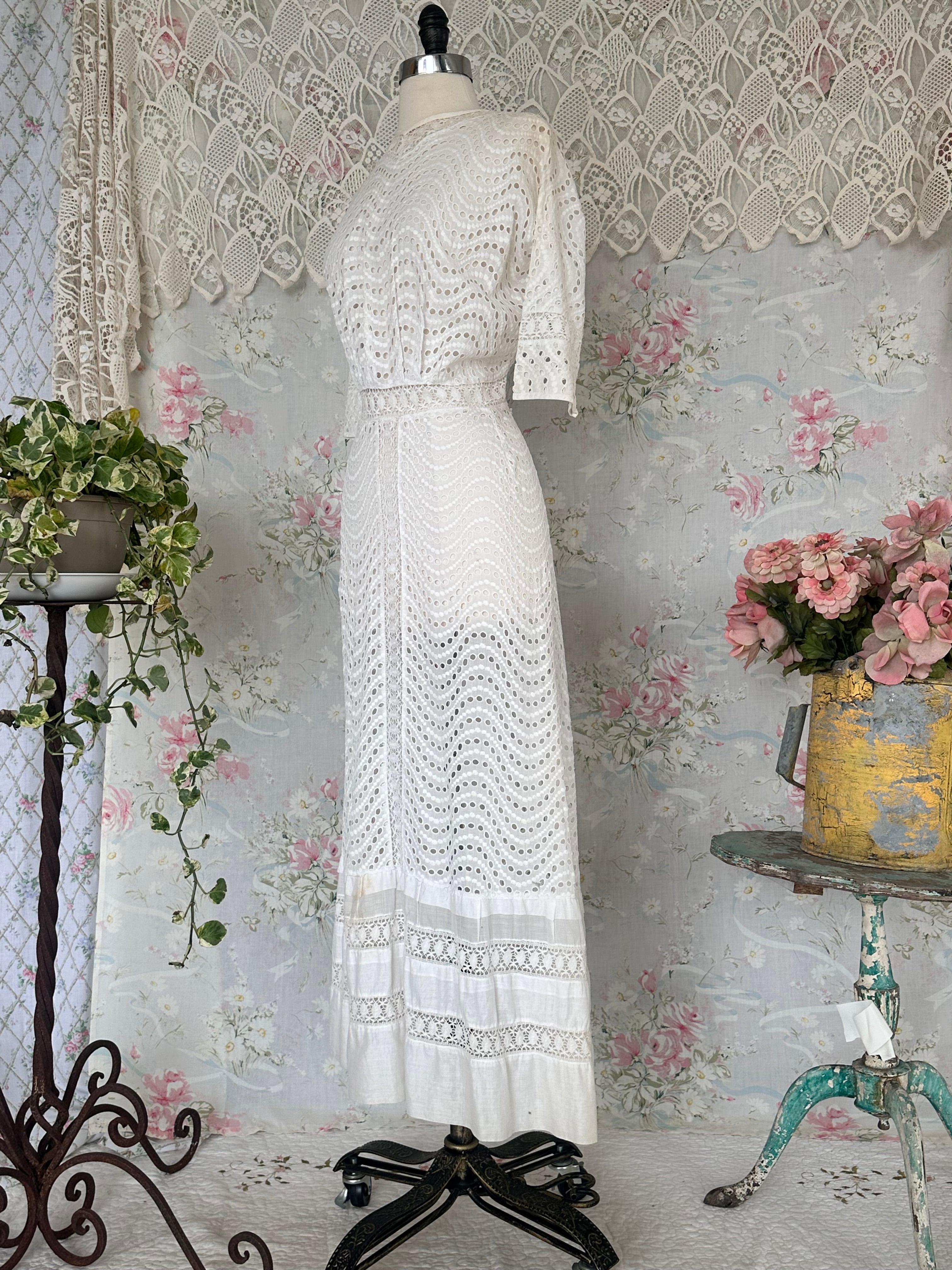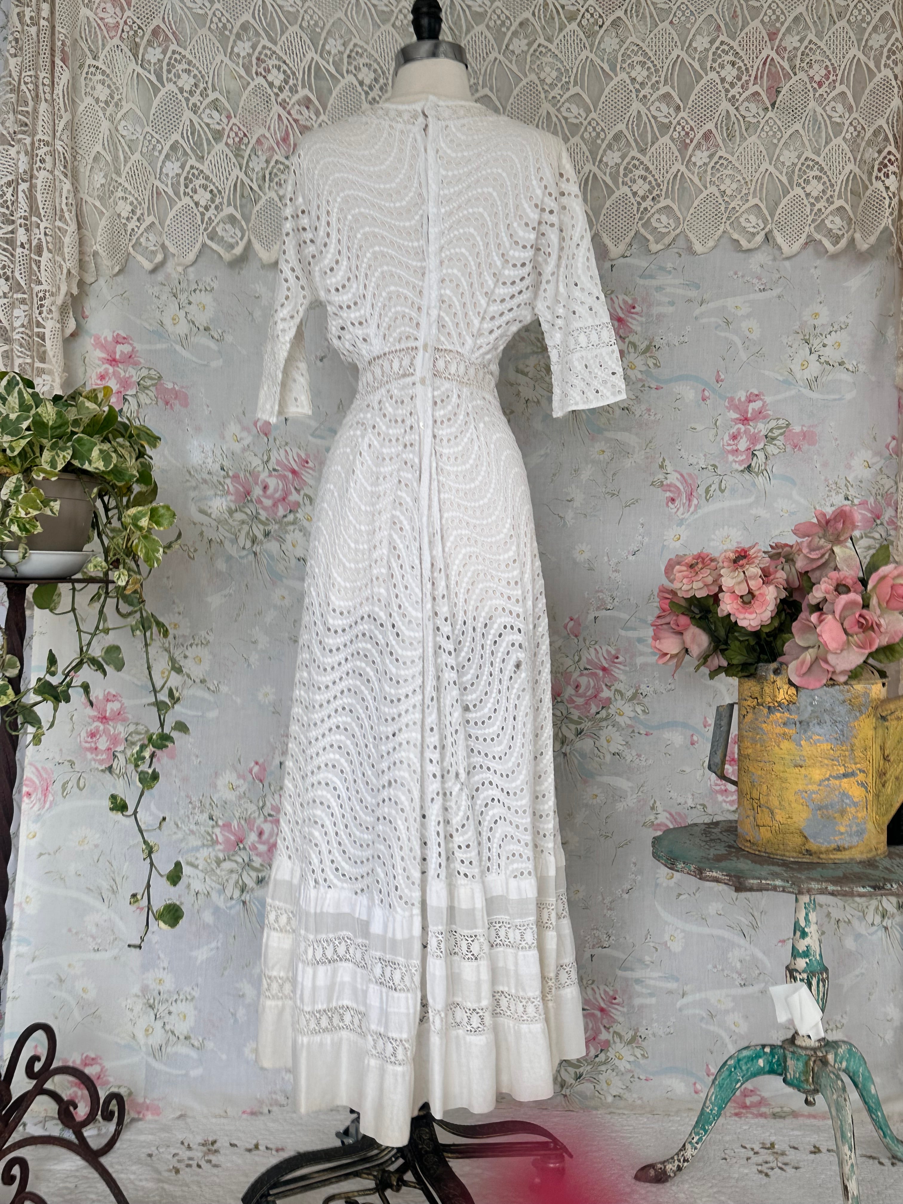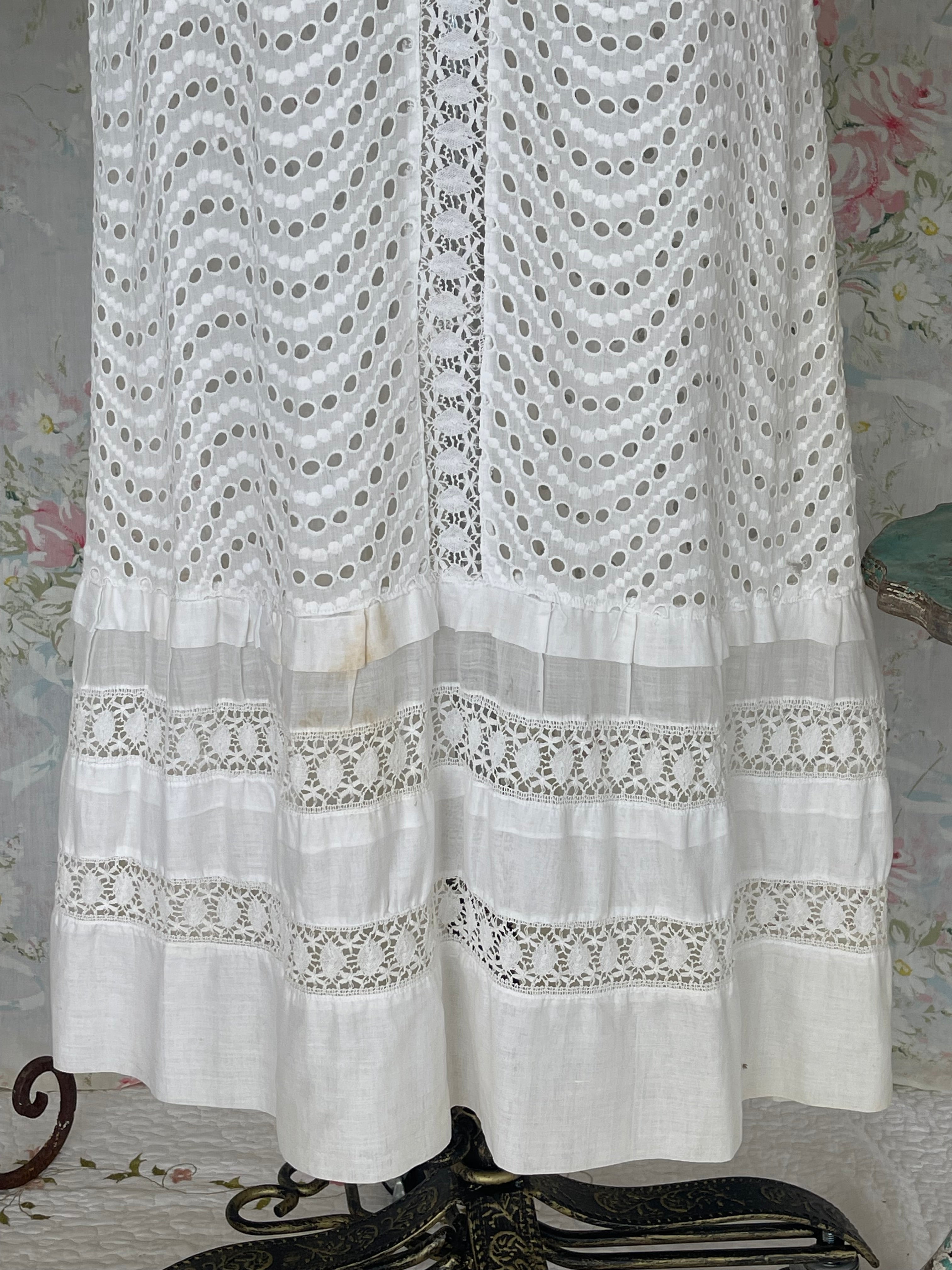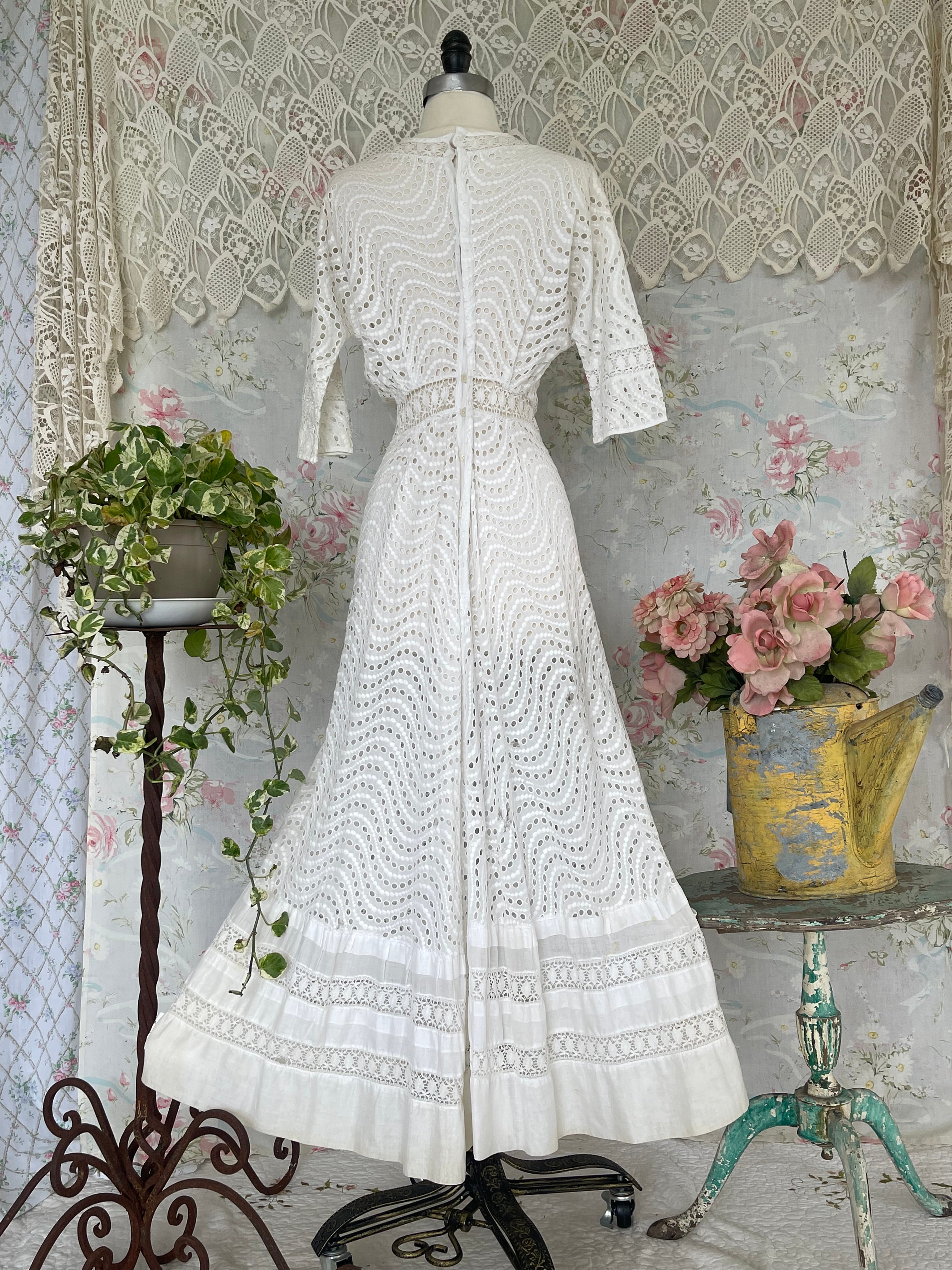Antique early 1900’s White Eyelet Edwardian Day Dress with intricate Handmade Lace Neckline and Waist with swirls of lovely eyelet designs throughout. Three quarter sleeves edged and lace center panel. Hidden panel of buttons in the back. All buttons intact. The bottom is a combination of ruffles and lace. Lovely light weight white vintage cotton.