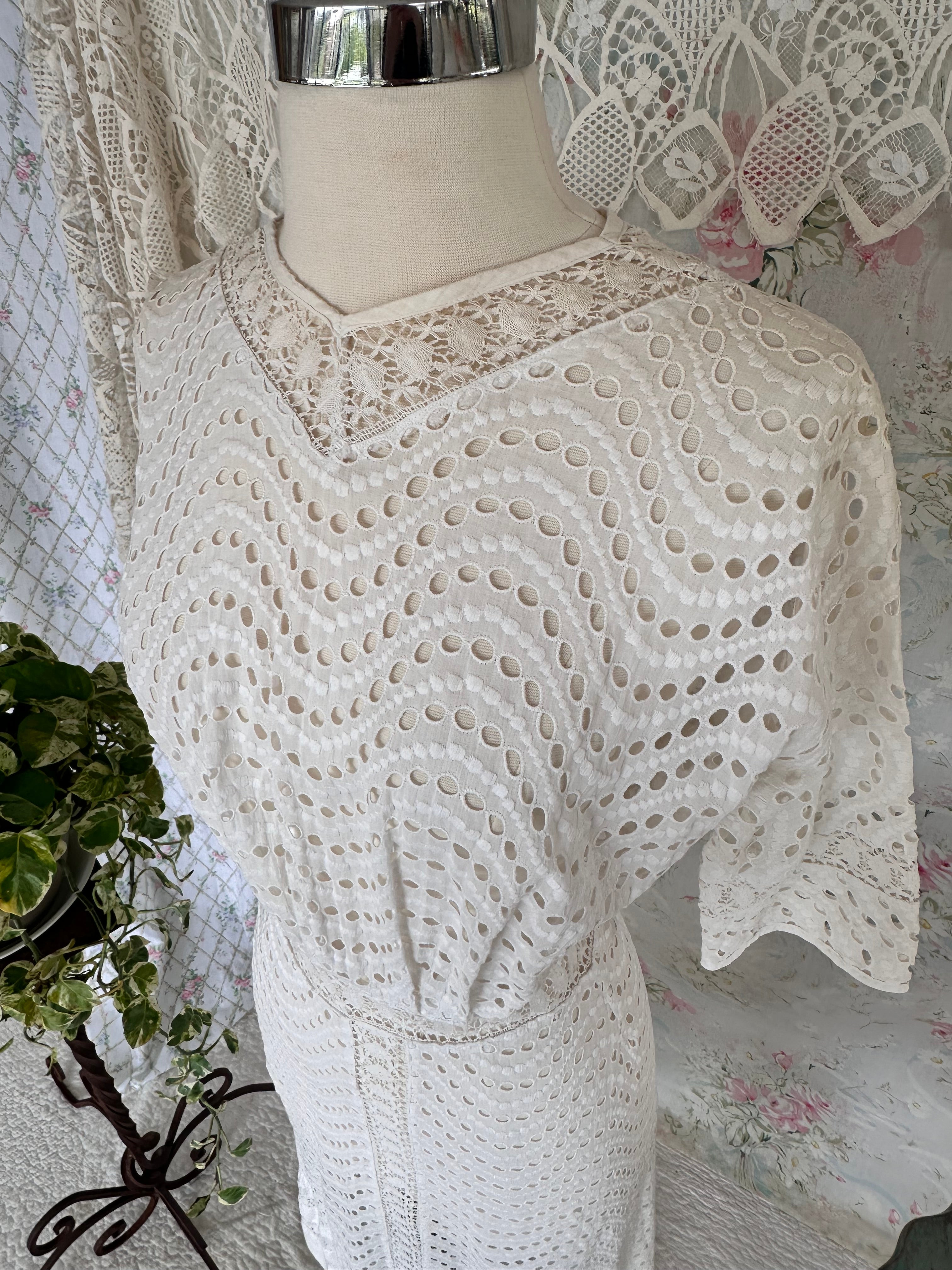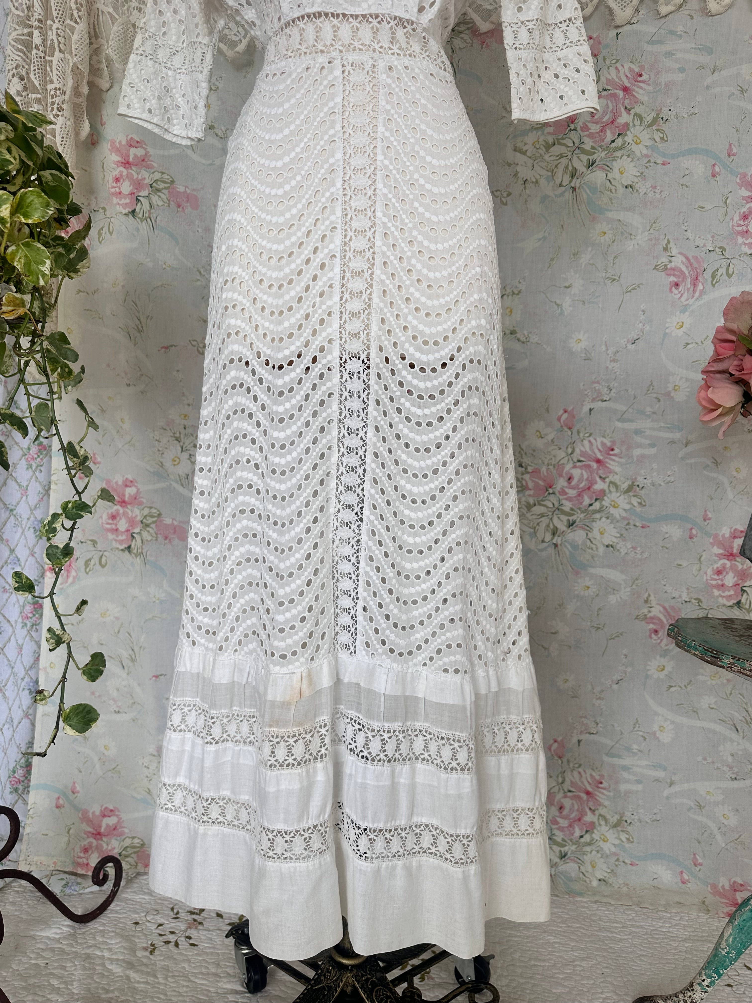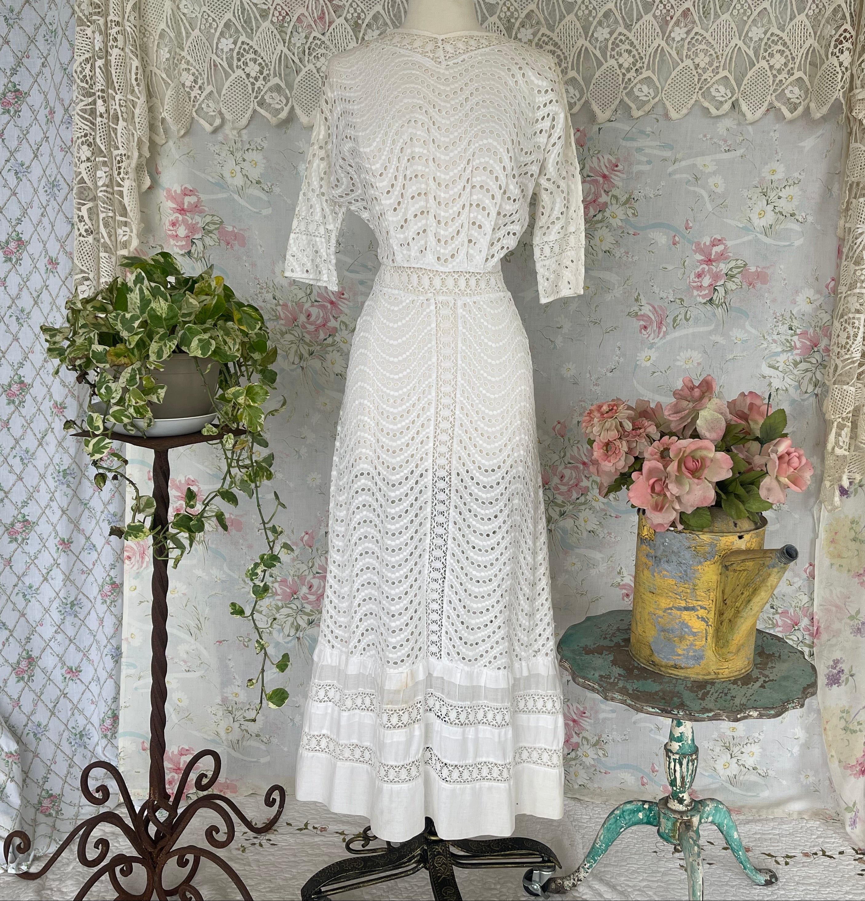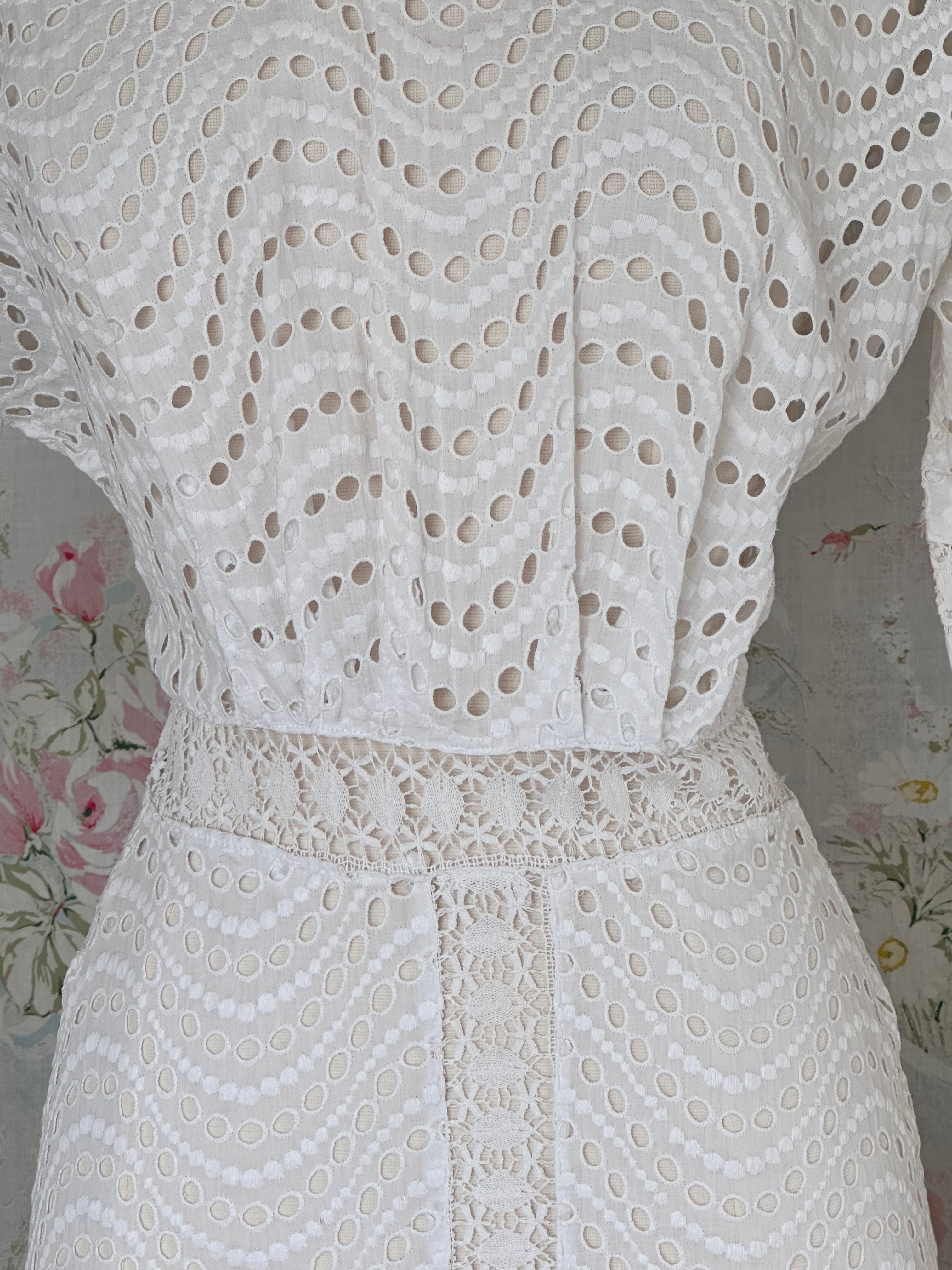 Antique early 1900’s White Eyelet Edwardian Day Dress with intricate Handmade Lace Neckline and Waist with swirls of lovely eyelet designs throughout. Three quarter sleeves edged and lace center panel. Hidden panel of buttons in the back. All buttons intact. The bottom is a combination of ruffles and lace. Lovely light weight white vintage cotton.