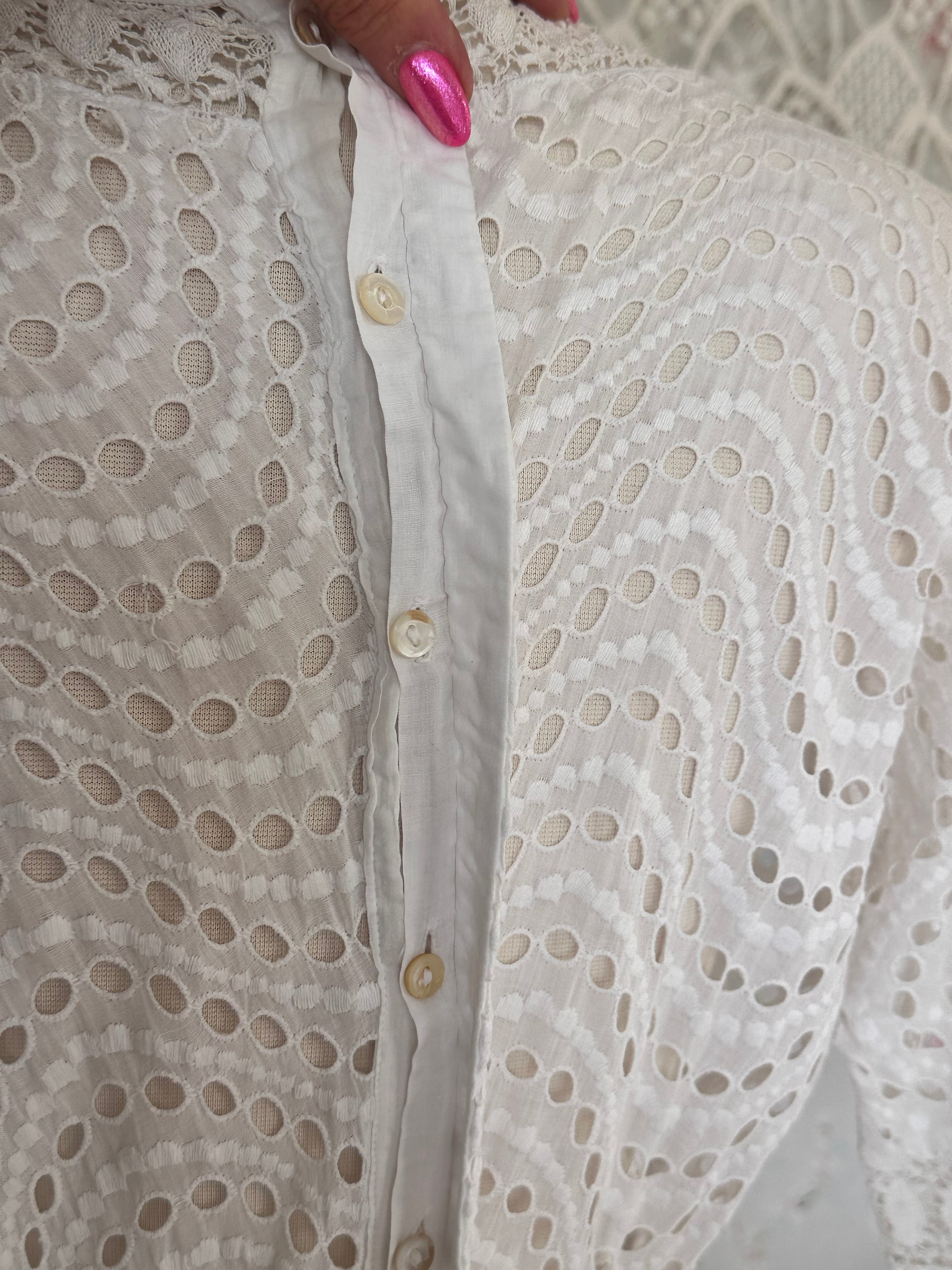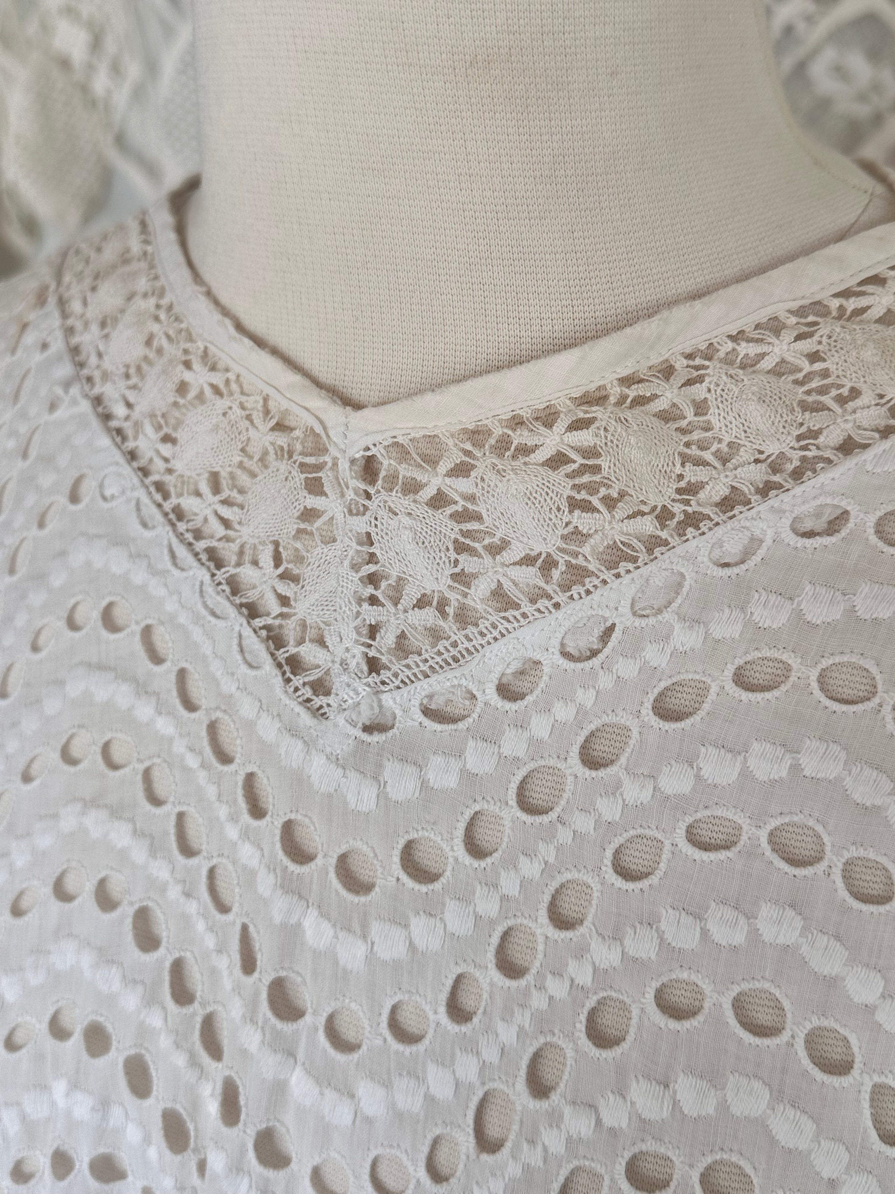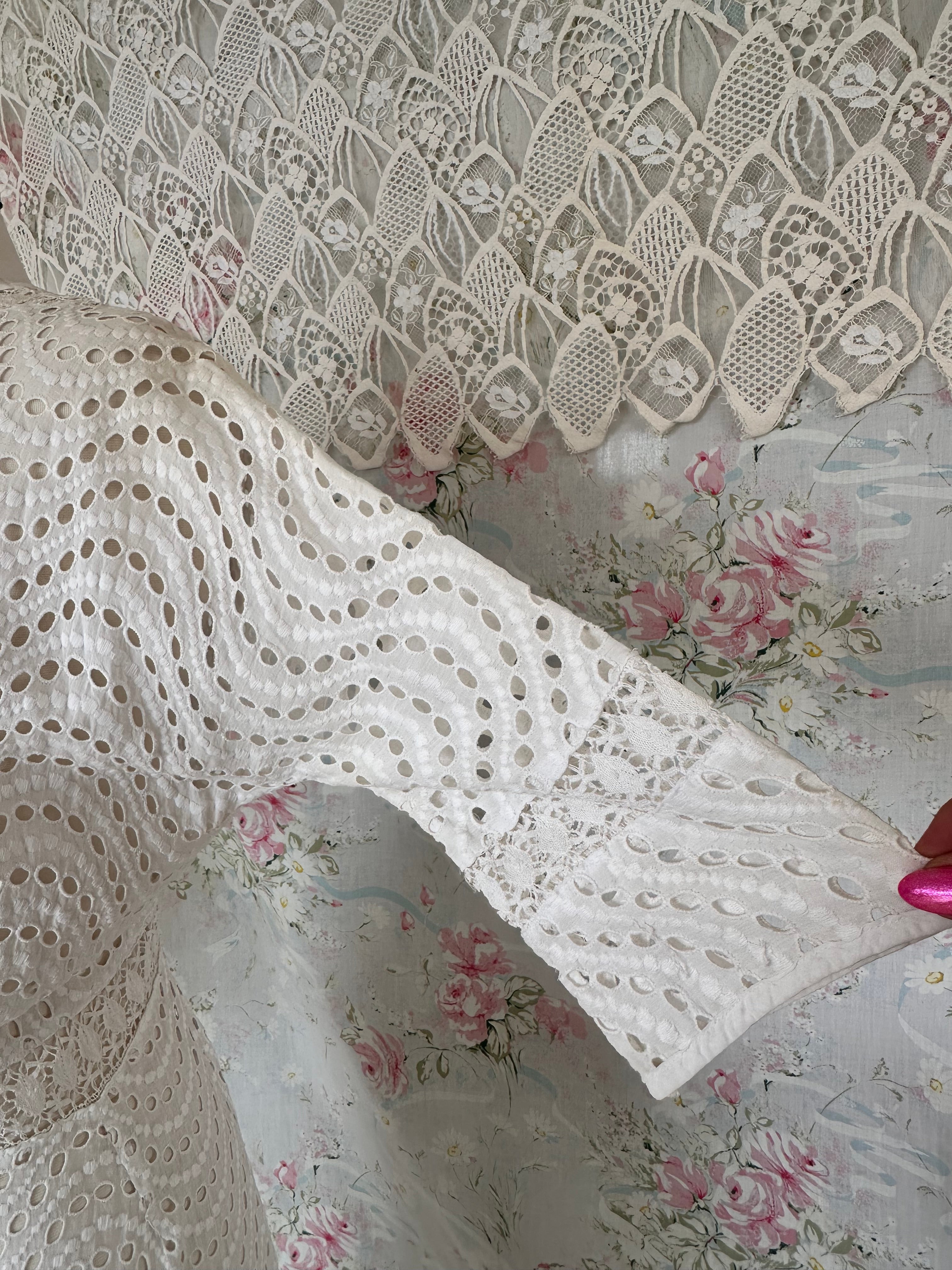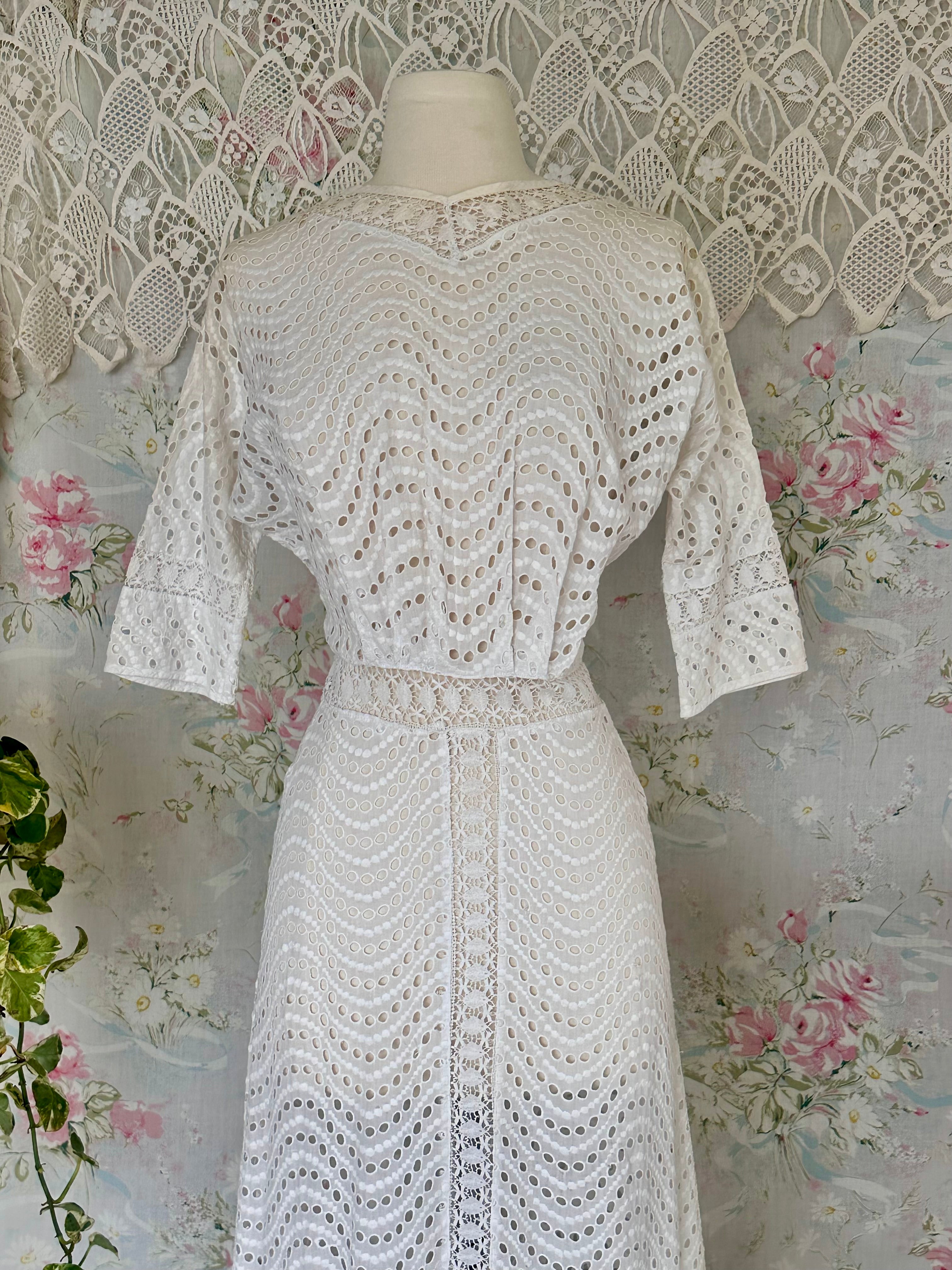 Antique early 1900’s White Eyelet Edwardian Day Dress with intricate Handmade Lace Neckline and Waist with swirls of lovely eyelet designs throughout. Three quarter sleeves edged and lace center panel. Hidden panel of buttons in the back. All buttons intact. The bottom is a combination of ruffles and lace. Lovely light weight white vintage cotton.