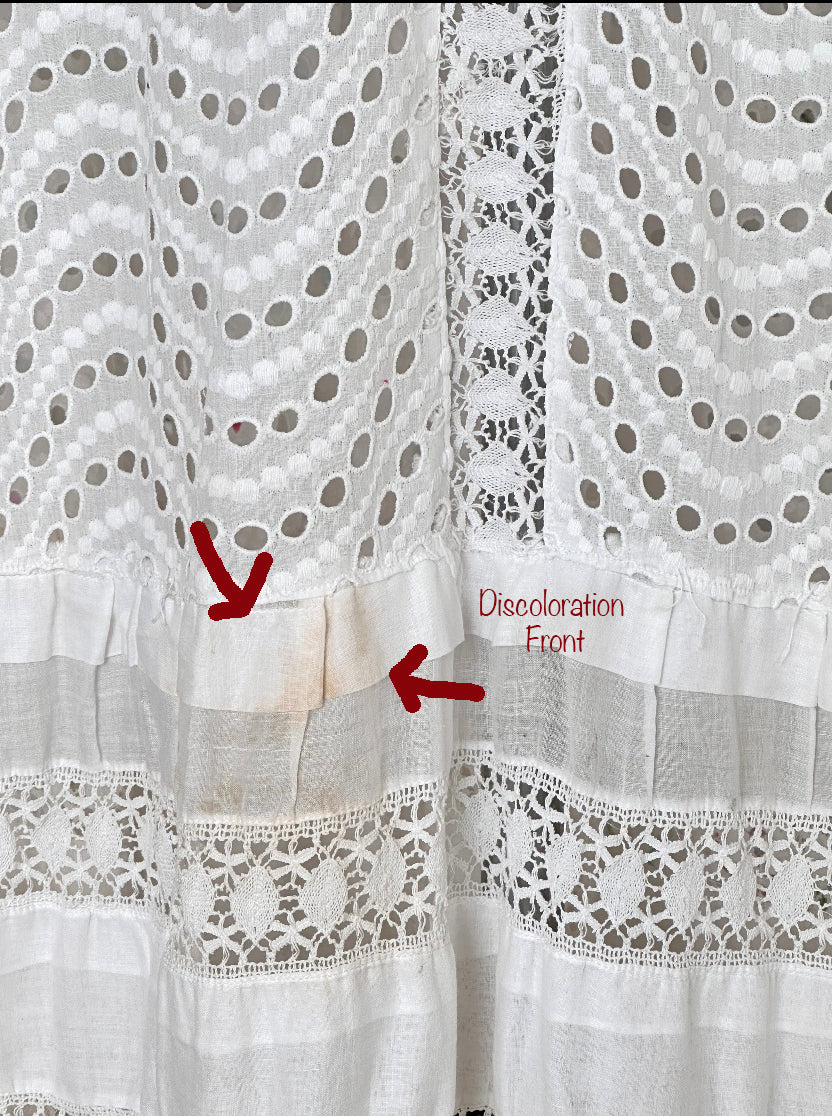 PLEASE NOTE: This dress is in very very good condition for its age, but there are a few holes in the back right lower skirt of the dress. I have mended them to the best of my ability using a vintage cotton fabric swatch. There is also a some slight age discoloration in the front lower ruffle, but it is slight (photos attached to end of listing ). Such a beautiful dress you could wear as a Wedding Dress or add a belt and pair of Cowboy Boots. Despite it's few flaws this is truly a dress you can wear and treasure!