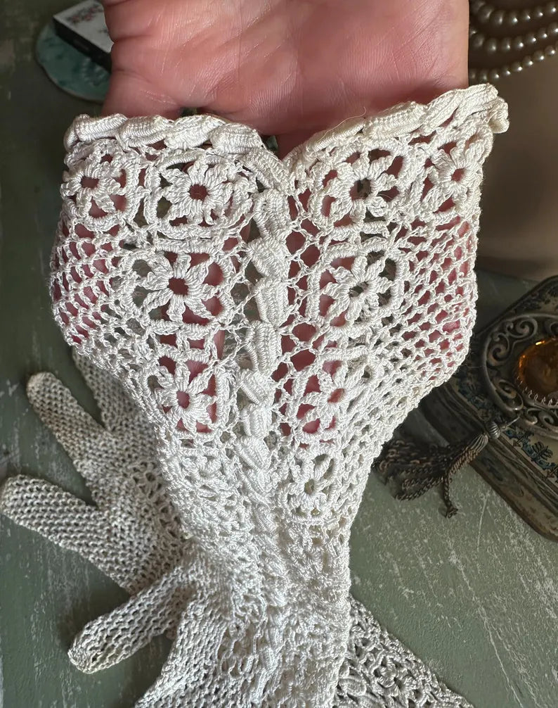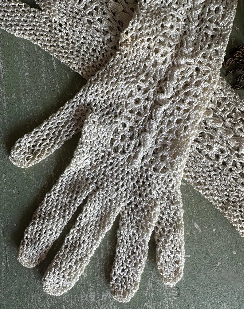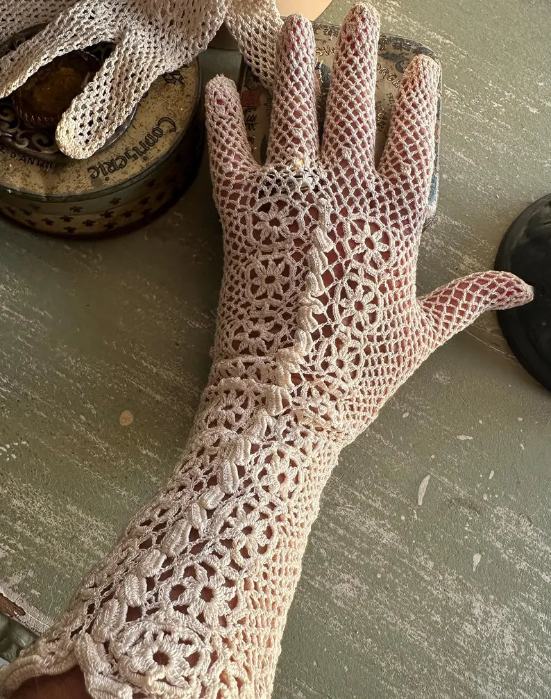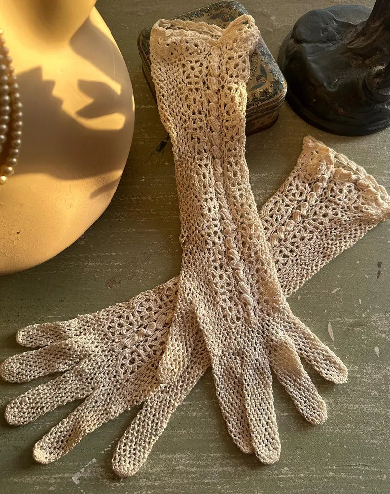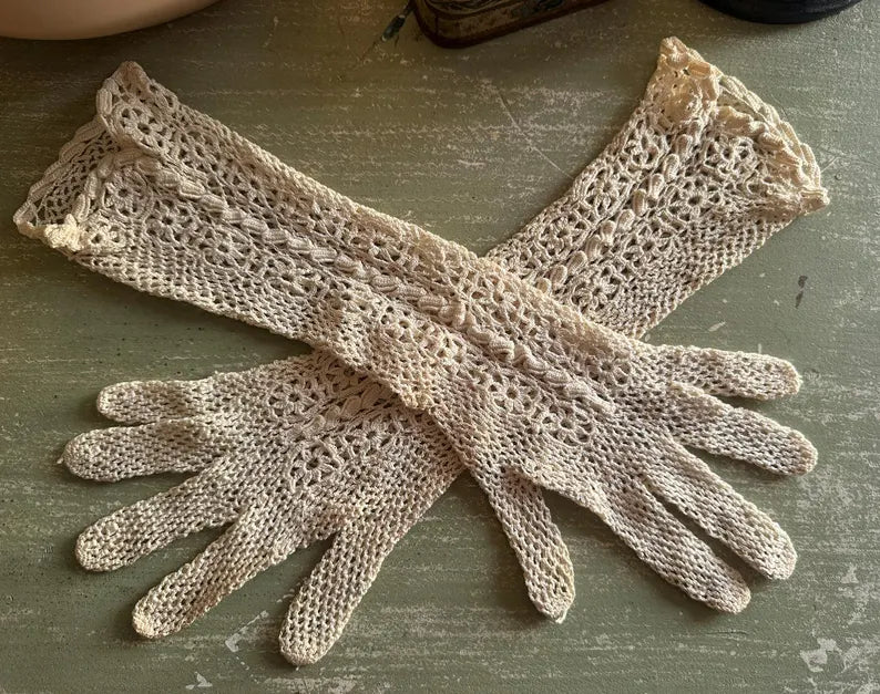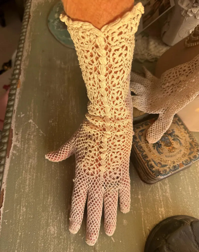 Antique Cream Colored French Antique Long Crochet Gloves in lovely condition.