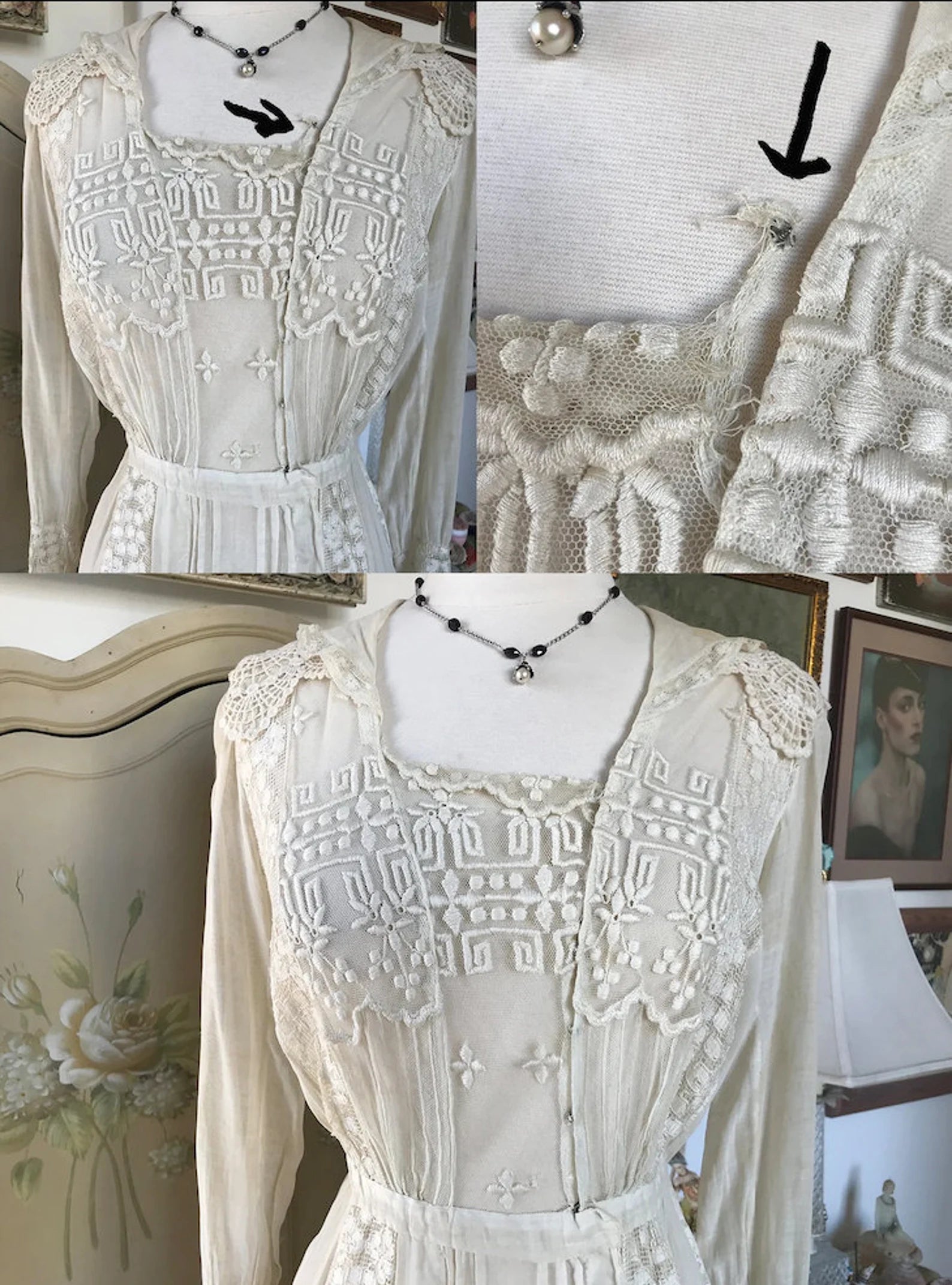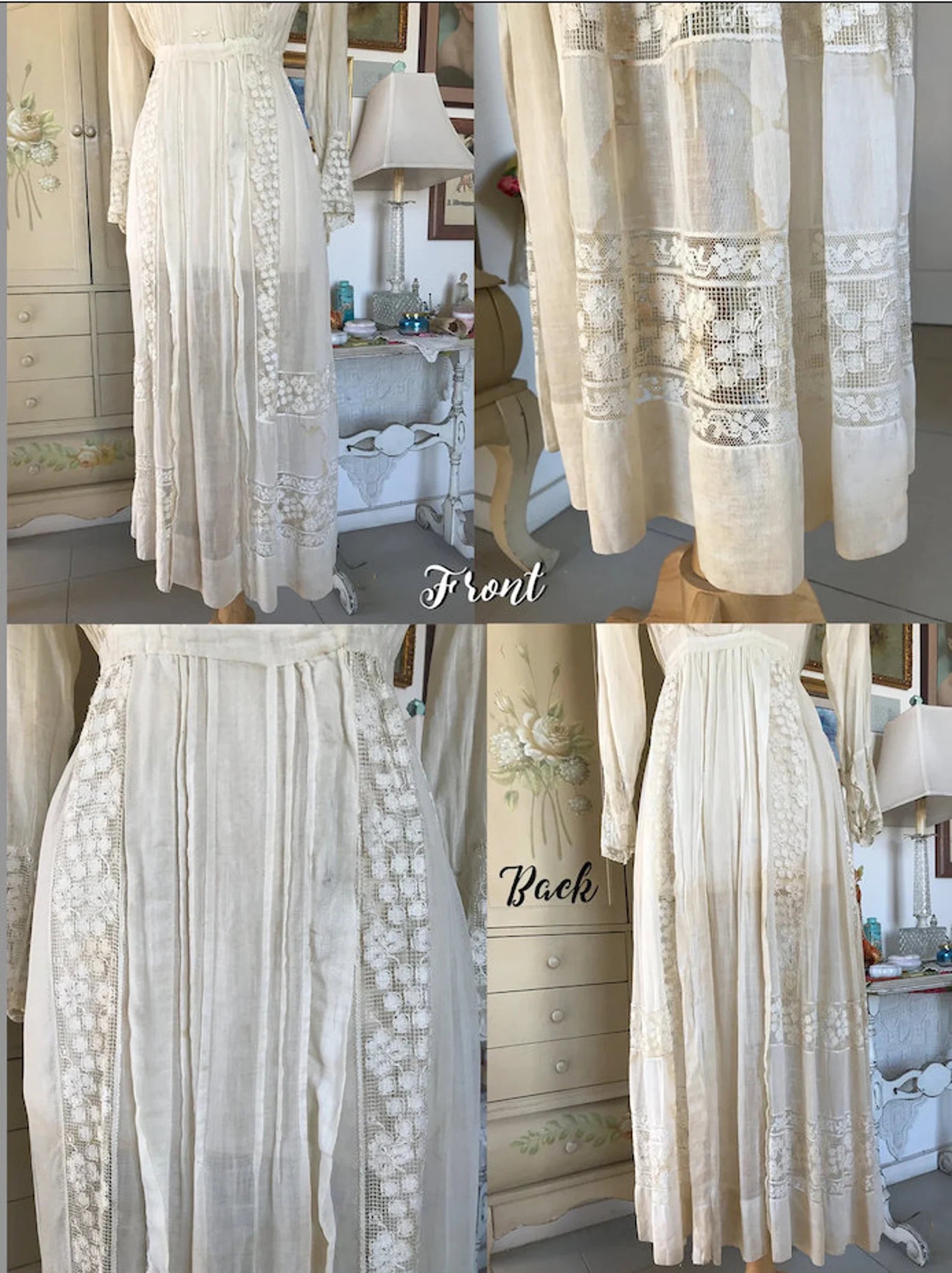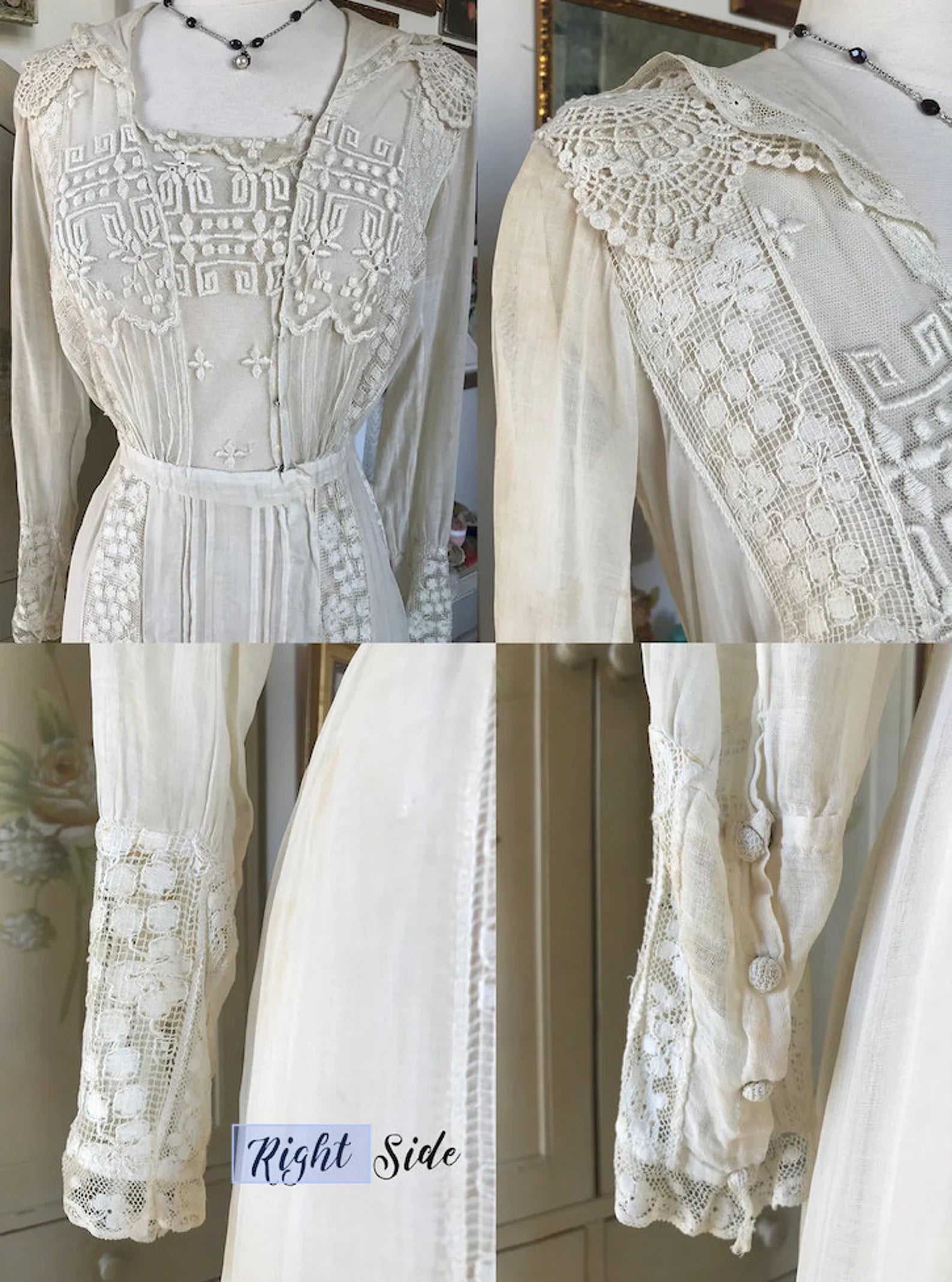 Condition: Very Wearable. All Lace intact except for collar Snap. See photo #9, which can be replaced. There are stains but when the dress is worn they are not highly visible.