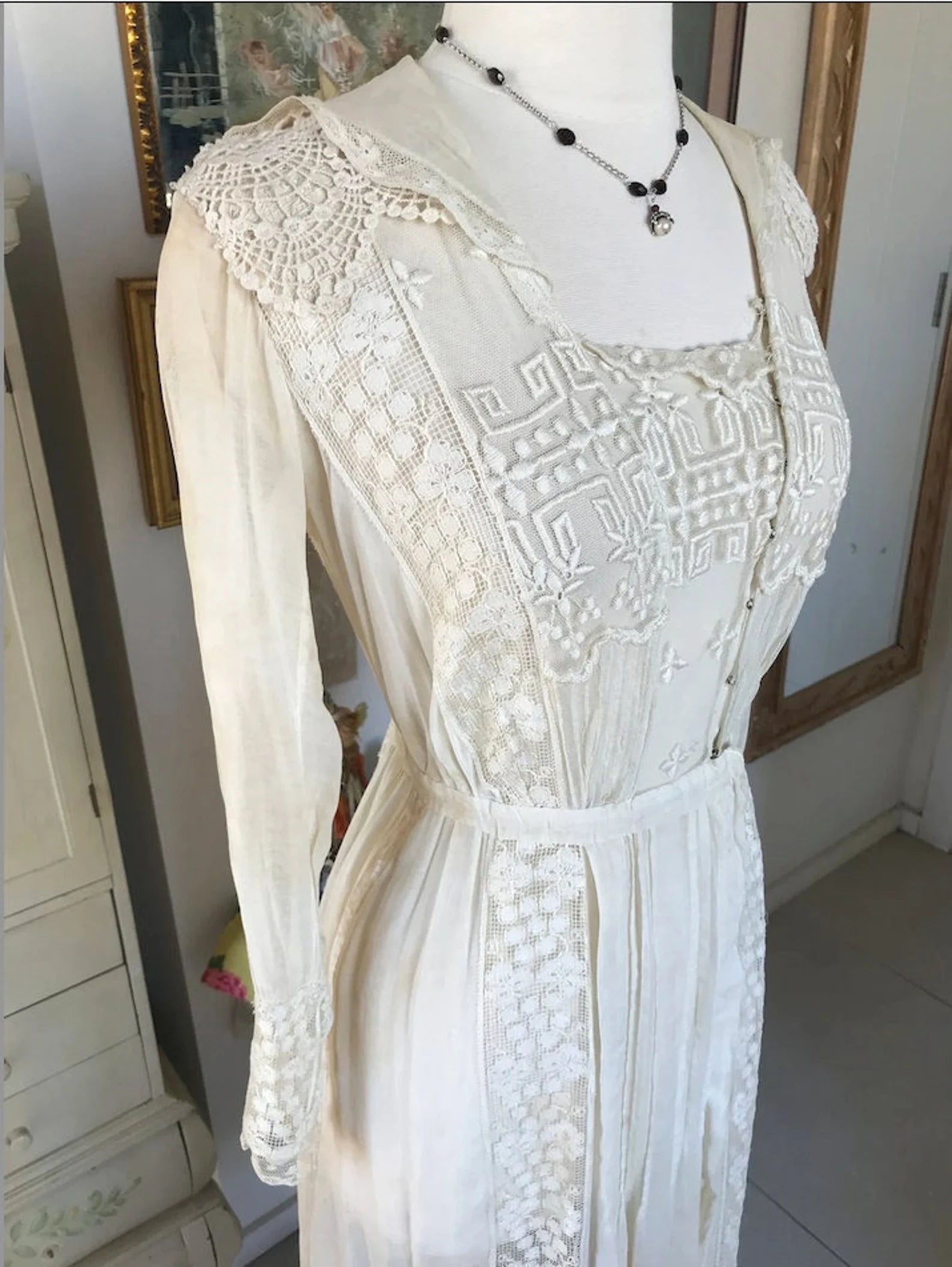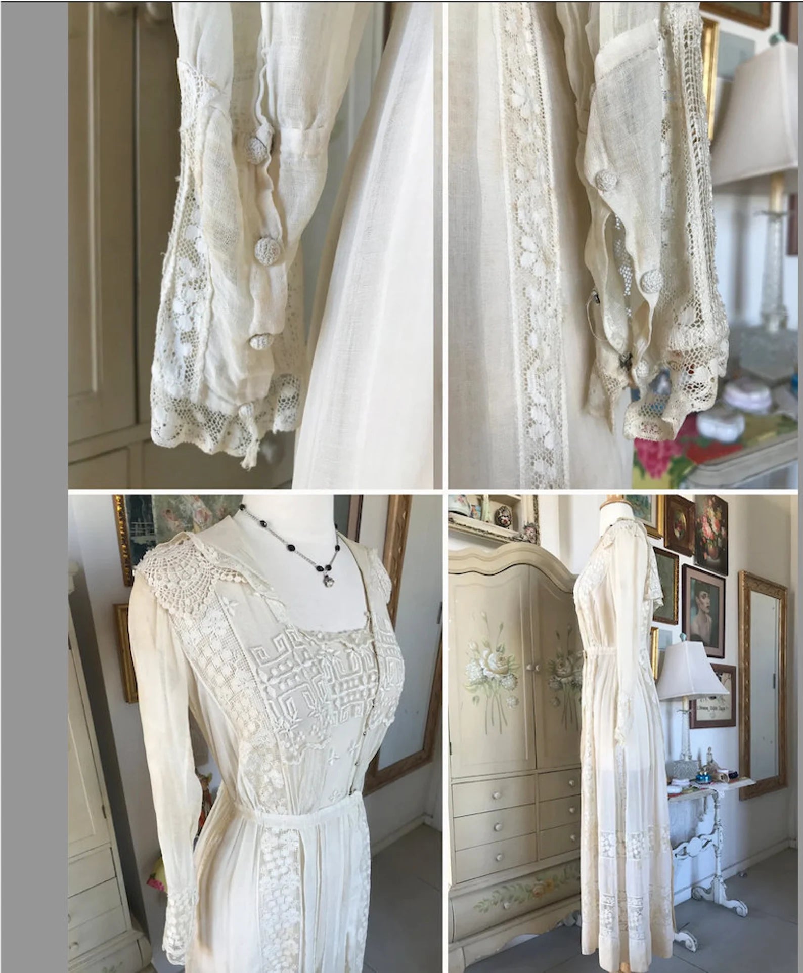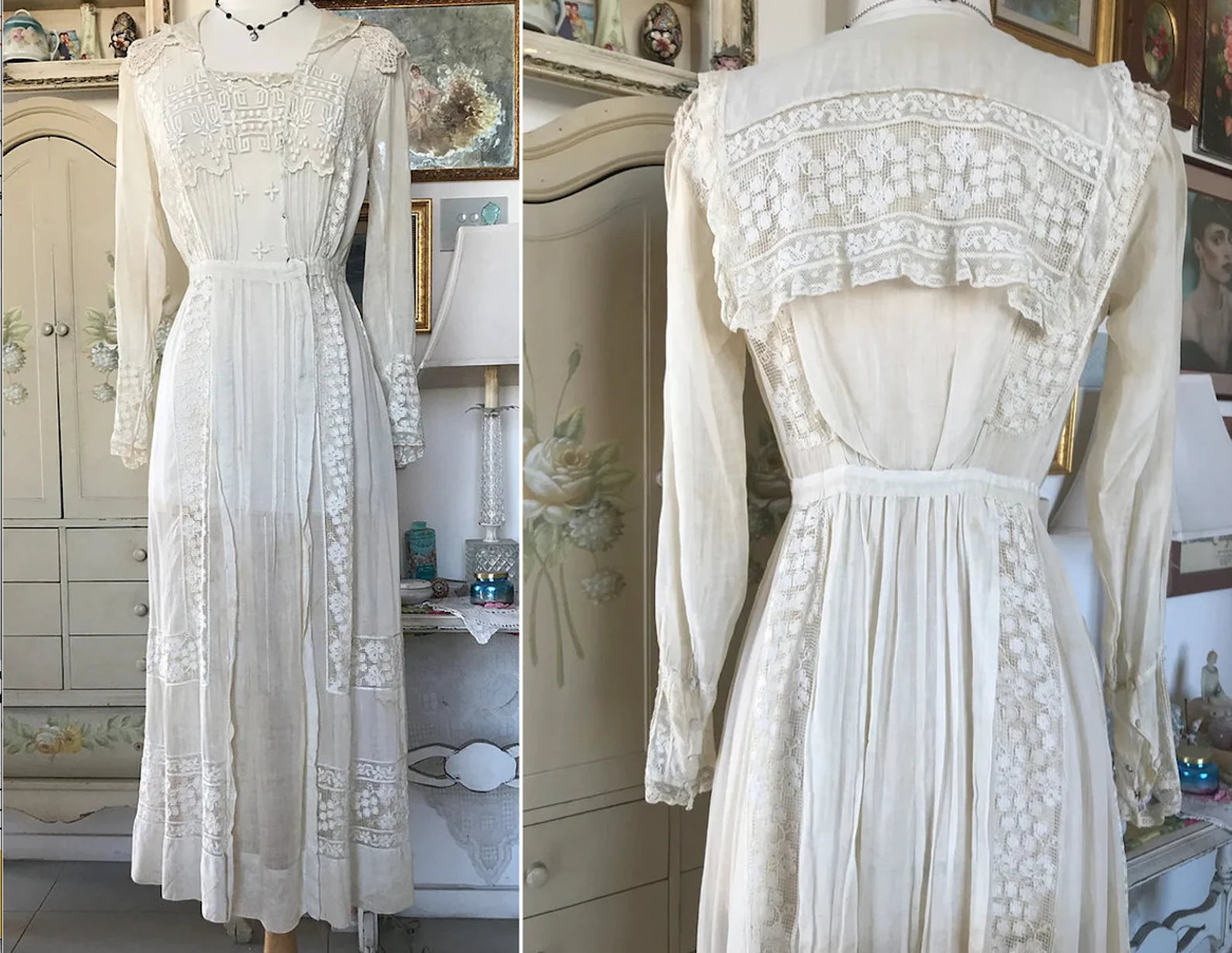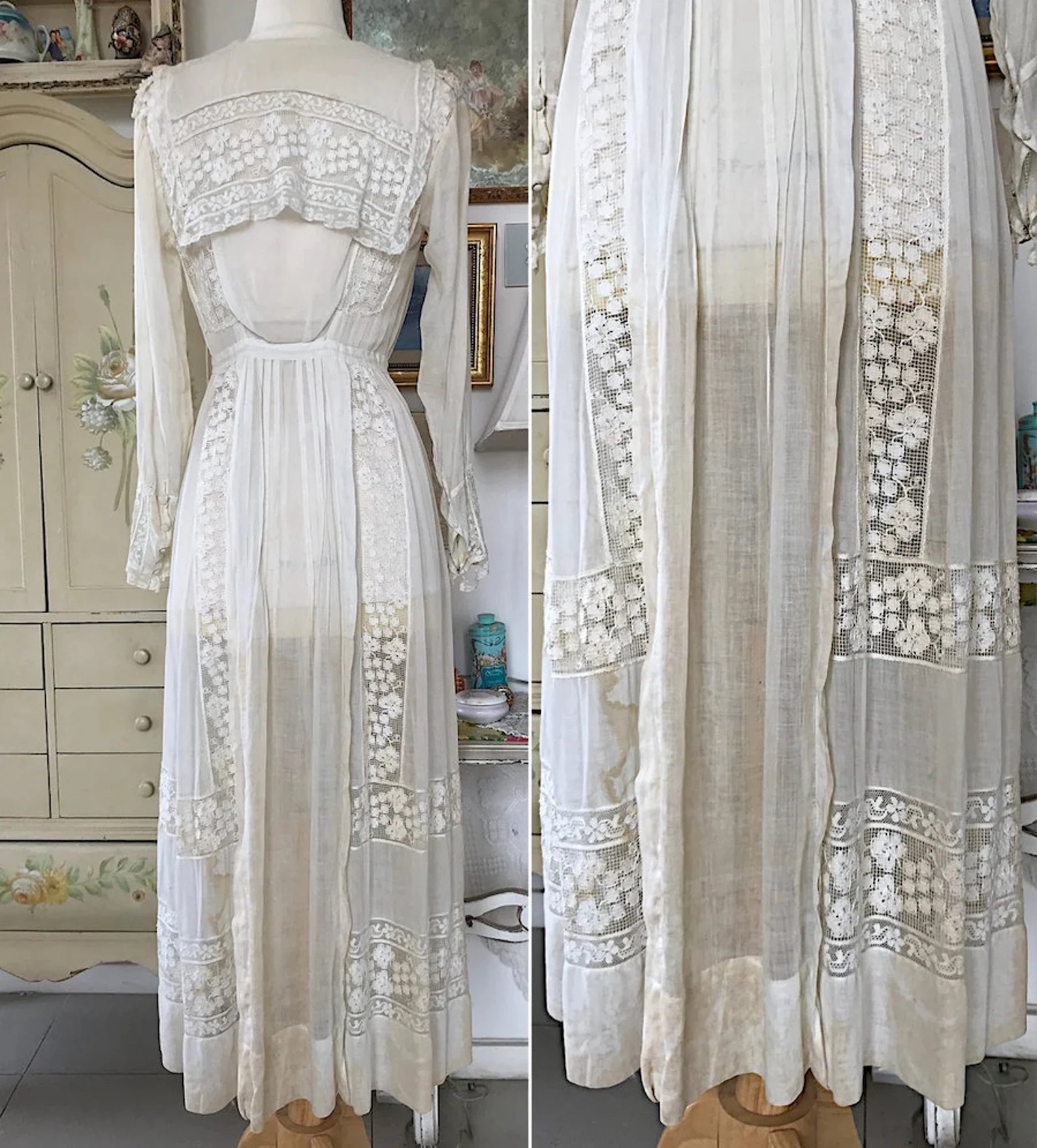 Antique White 1910s Edwardian Bridlemere Dress, Netted Edwardian Lace Embroidered Cotton Heavily Embroidered Lace Tea Dress with button up sleeves, snap open neckline. Crocheted shoulders. Stunning Apron Embroidered Lace Back. So much amazing detail put into this gorgeous dress. There was a bit of tattering at the Shoulders so I added Vintage Embroidered Lace Epaulets, and it matches the dress perfectly! **PLEASE read Condition Below as this dress is NOT Returnable.**
