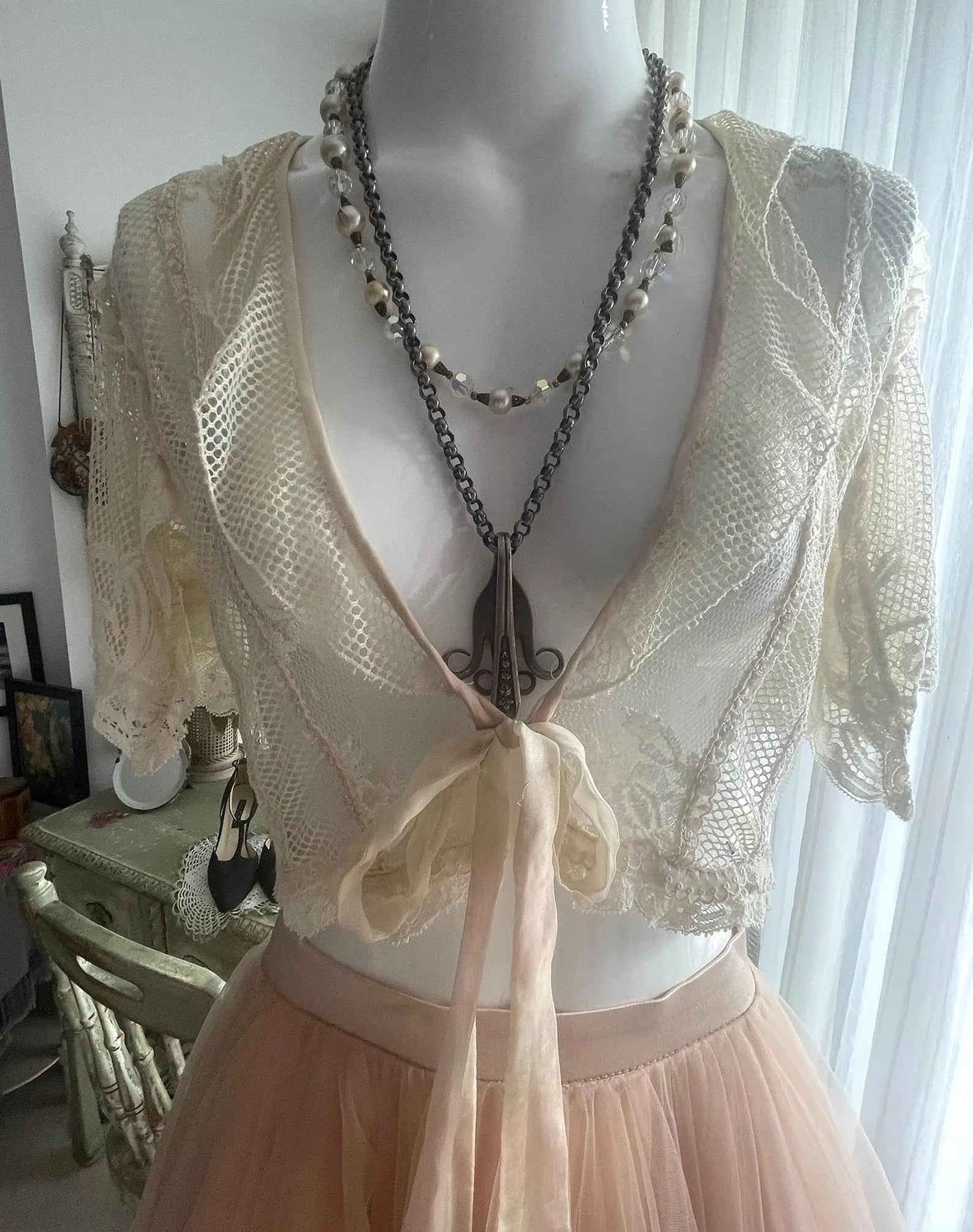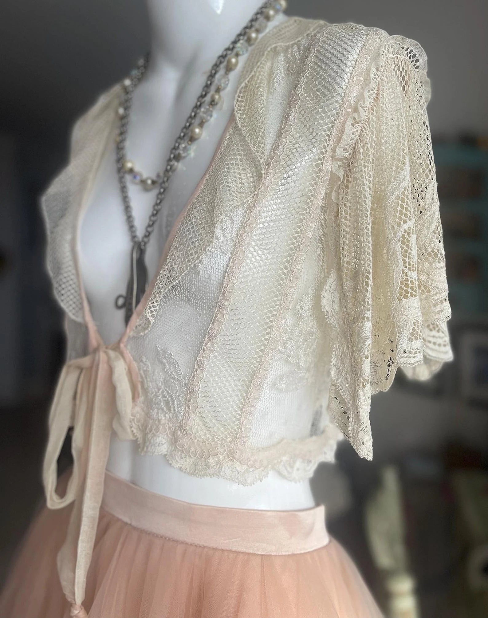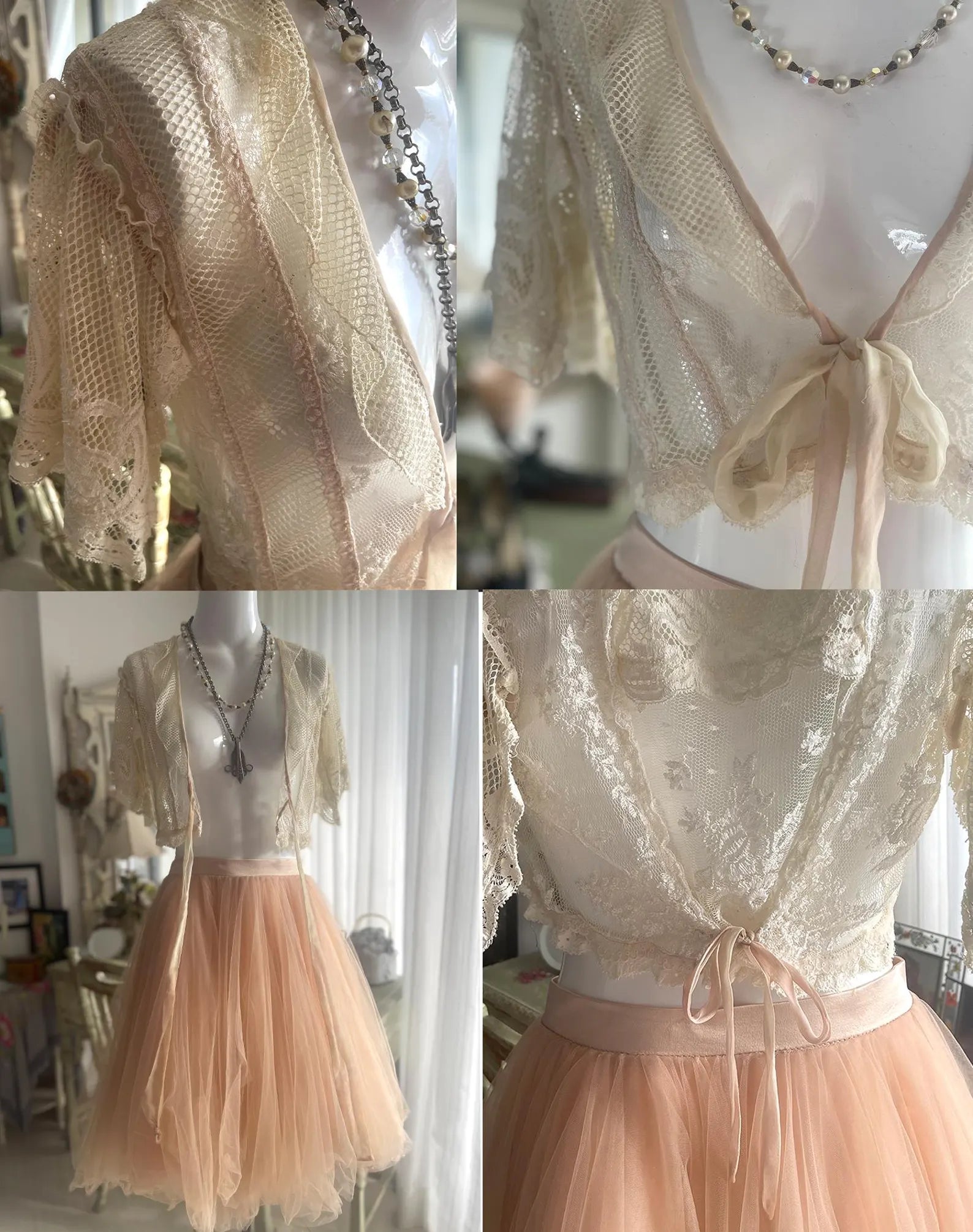 Antique Lace One Of a Kind Handmade Ivory White and Pink Bed Jacket with tie front, lace Flutter sleeves, and Back ribbon Tie that can makes the Bed Jacket adjustable. All of the items I have inherited form this designer were put together with such love and care to detail using the finest materials, al while making the most beautiful, romantic, ethereal and feminine items possible. This is so gorgeous and sensually elegant. The body and fluttery collar is made with a gorgeous netted lace, the center of the front body is a beautiful floral lace, the fluttery sleeves are incredible and edged with a delicate light pink ribbon as is the hemline. The front has a pink has at the edges, closes with a delicate chiffon ribbon, and the back can be tighten up or left loose according to your figure with a ribbon. So much to love about this piece and you will be the only one in the world with it to treasure!