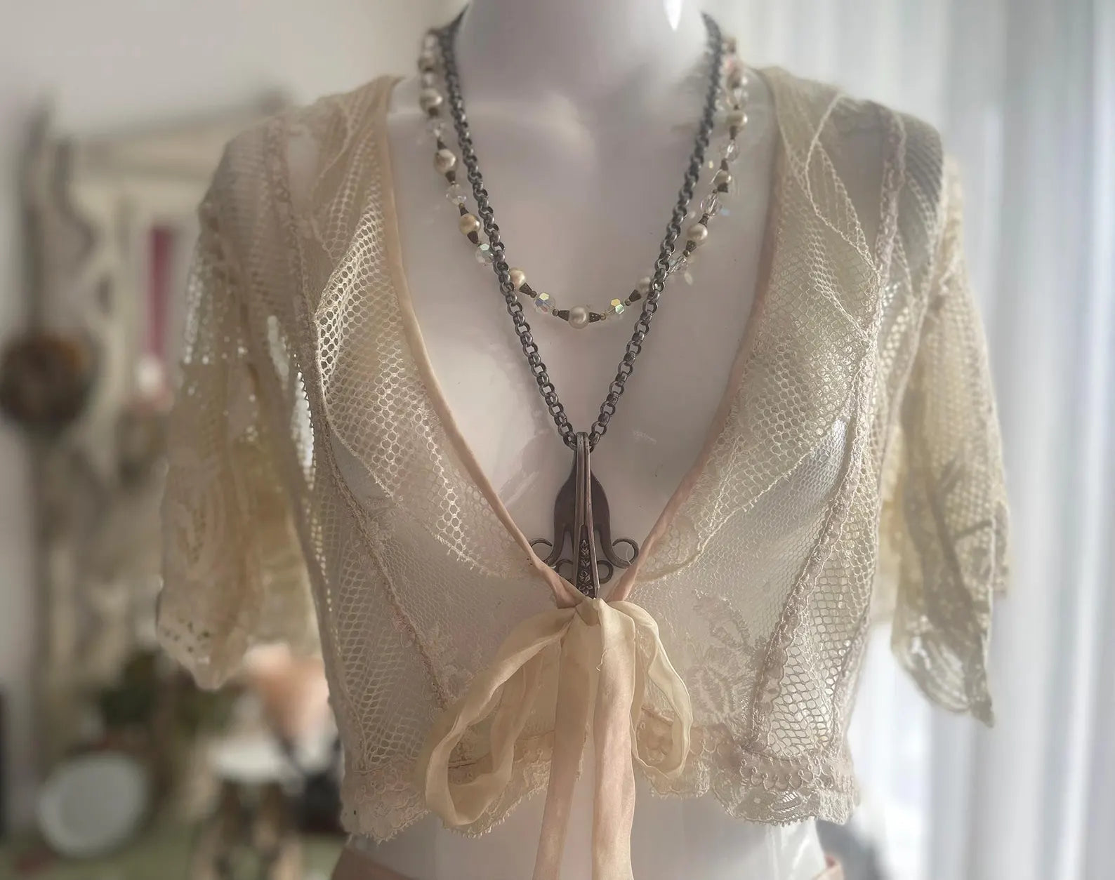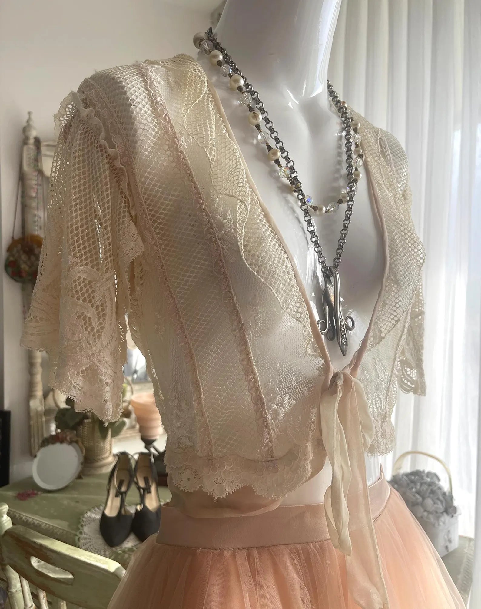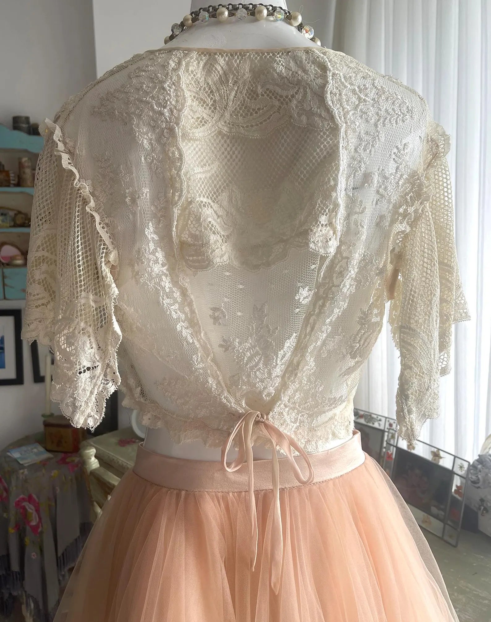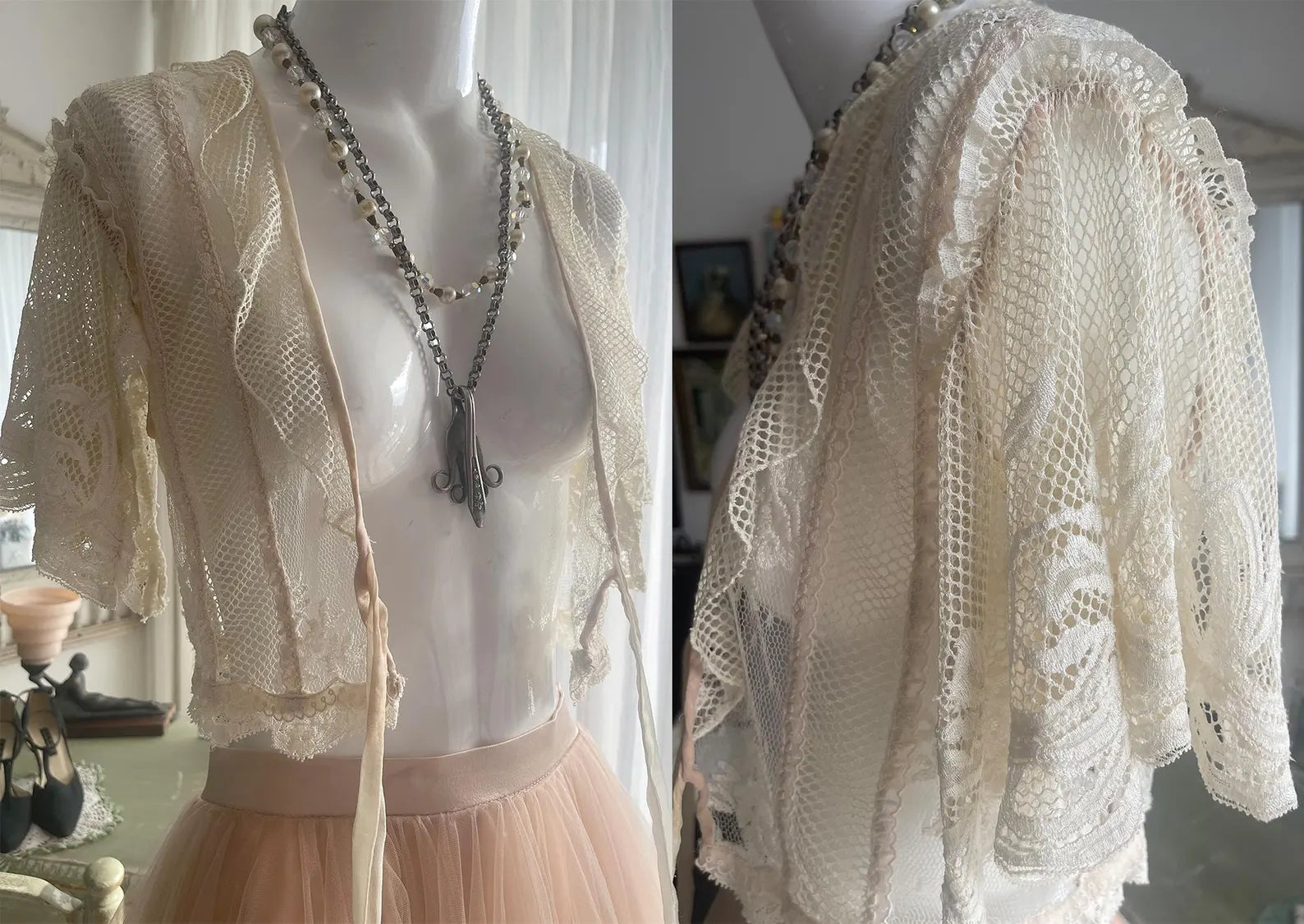 Antique Lace One Of a Kind Handmade Ivory White and Pink Bed Jacket with tie front, lace Flutter sleeves, and Back ribbon Tie that can makes the Bed Jacket adjustable. All of the items I have inherited form this designer were put together with such love and care to detail using the finest materials, al while making the most beautiful, romantic, ethereal and feminine items possible. This is so gorgeous and sensually elegant. The body and fluttery collar is made with a gorgeous netted lace, the center of the front body is a beautiful floral lace, the fluttery sleeves are incredible and edged with a delicate light pink ribbon as is the hemline. The front has a pink has at the edges, closes with a delicate chiffon ribbon, and the back can be tighten up or left loose according to your figure with a ribbon. So much to love about this piece and you will be the only one in the world with it to treasure!