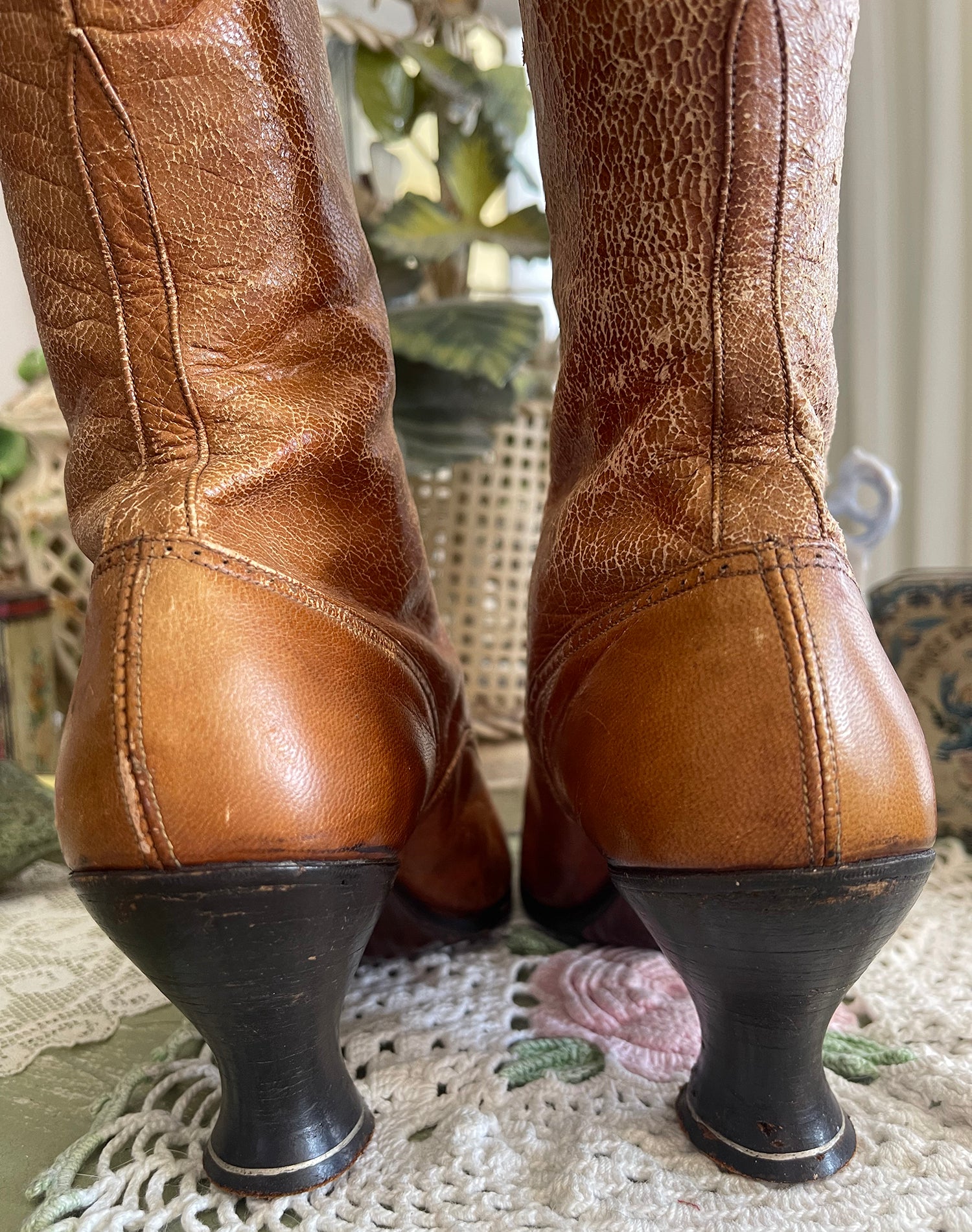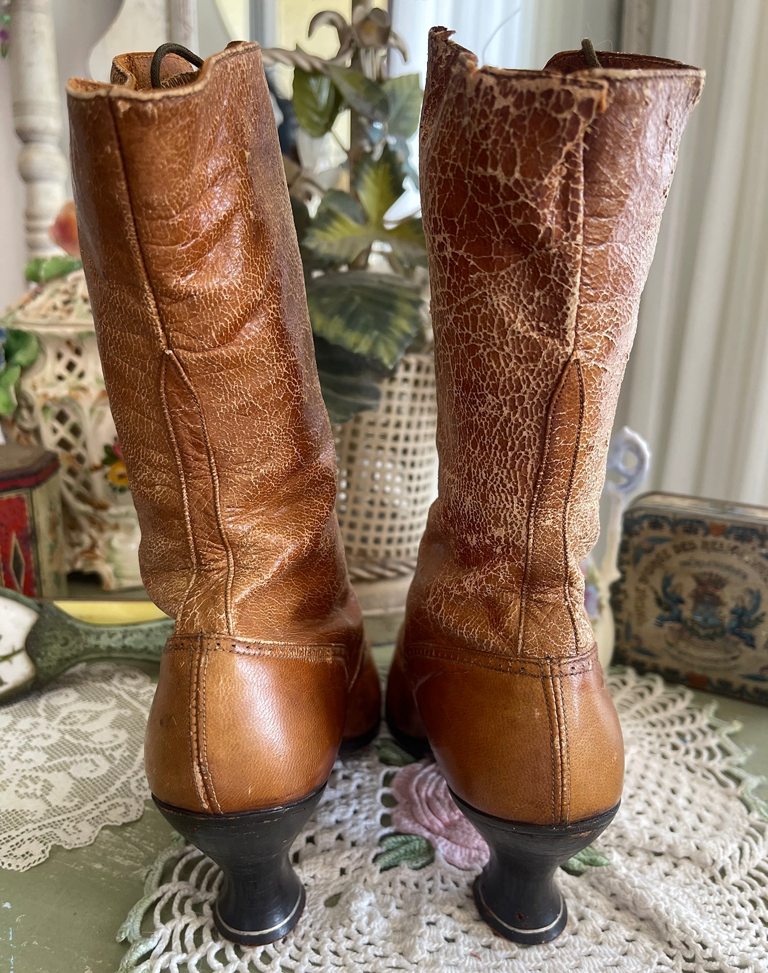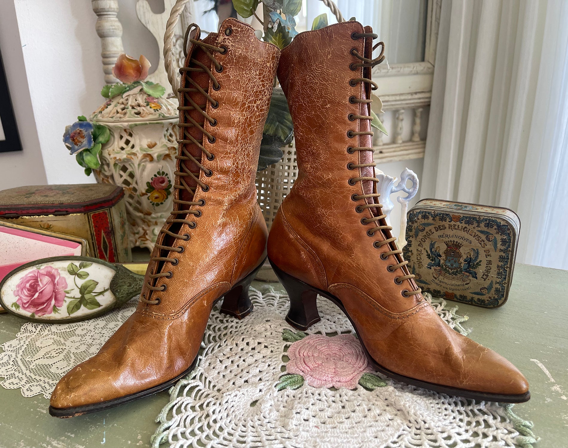 Antique late 1800's early 1900s Cognac distressed Victorian Granny Lace Up Ankle Boots. Sole and Heels in excellent wearable condition. I absolutely love how the Leather has a crackly look to them.