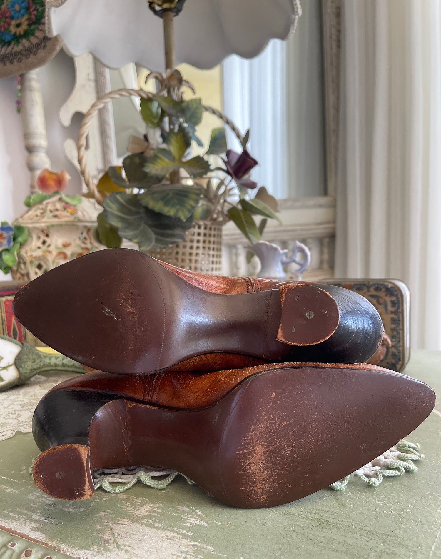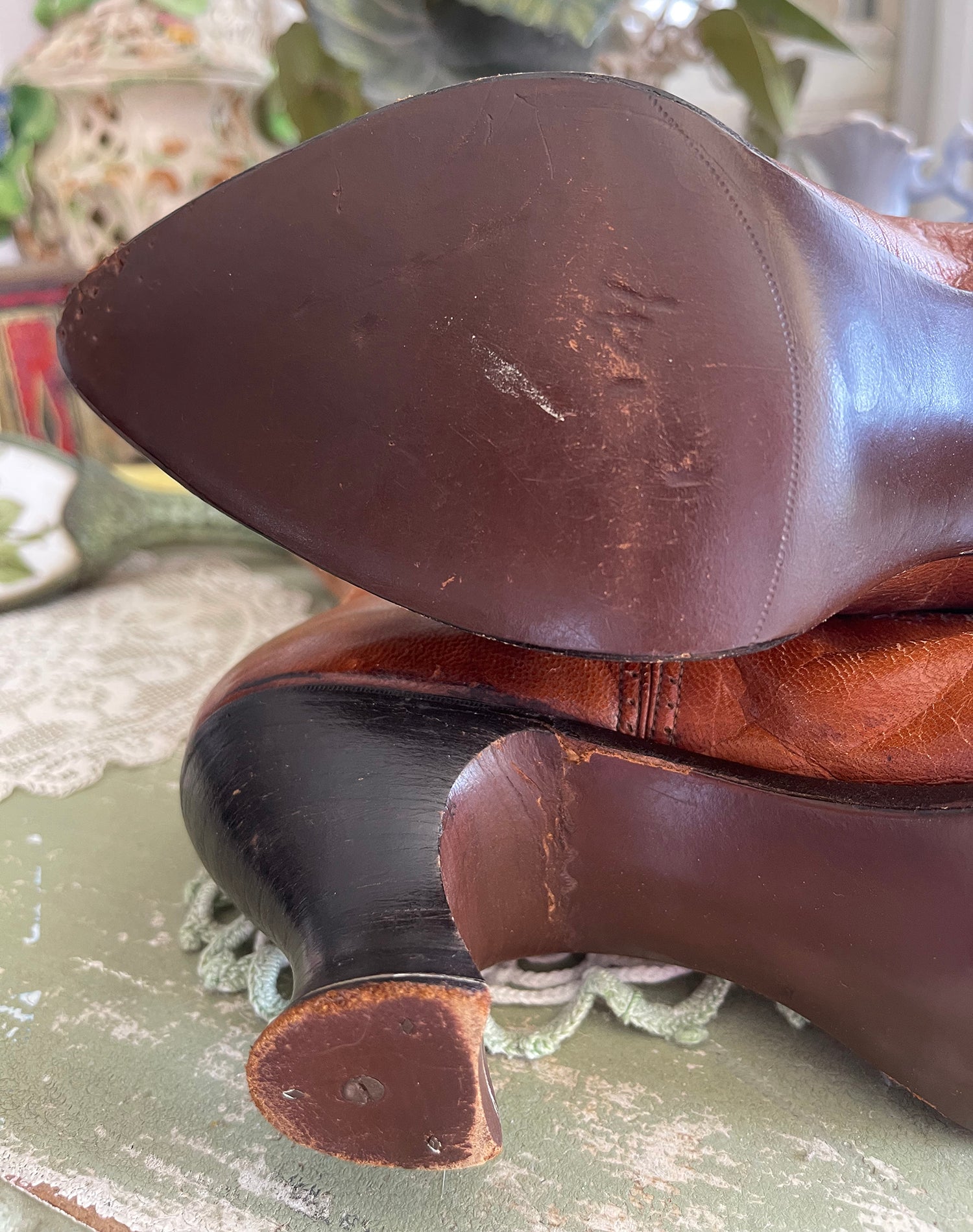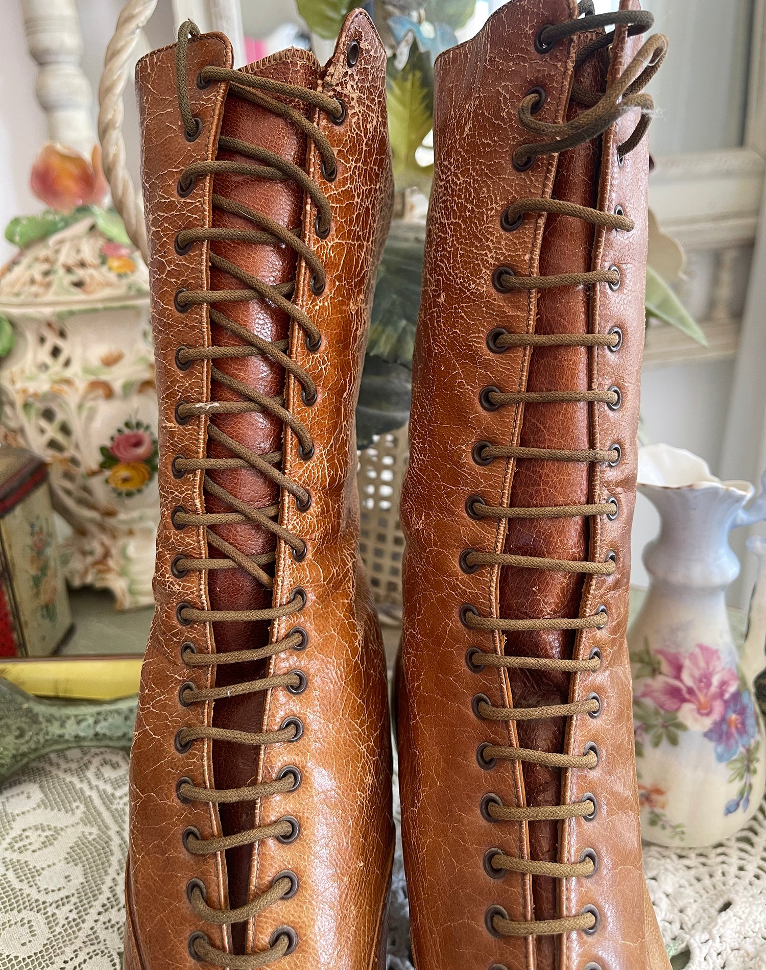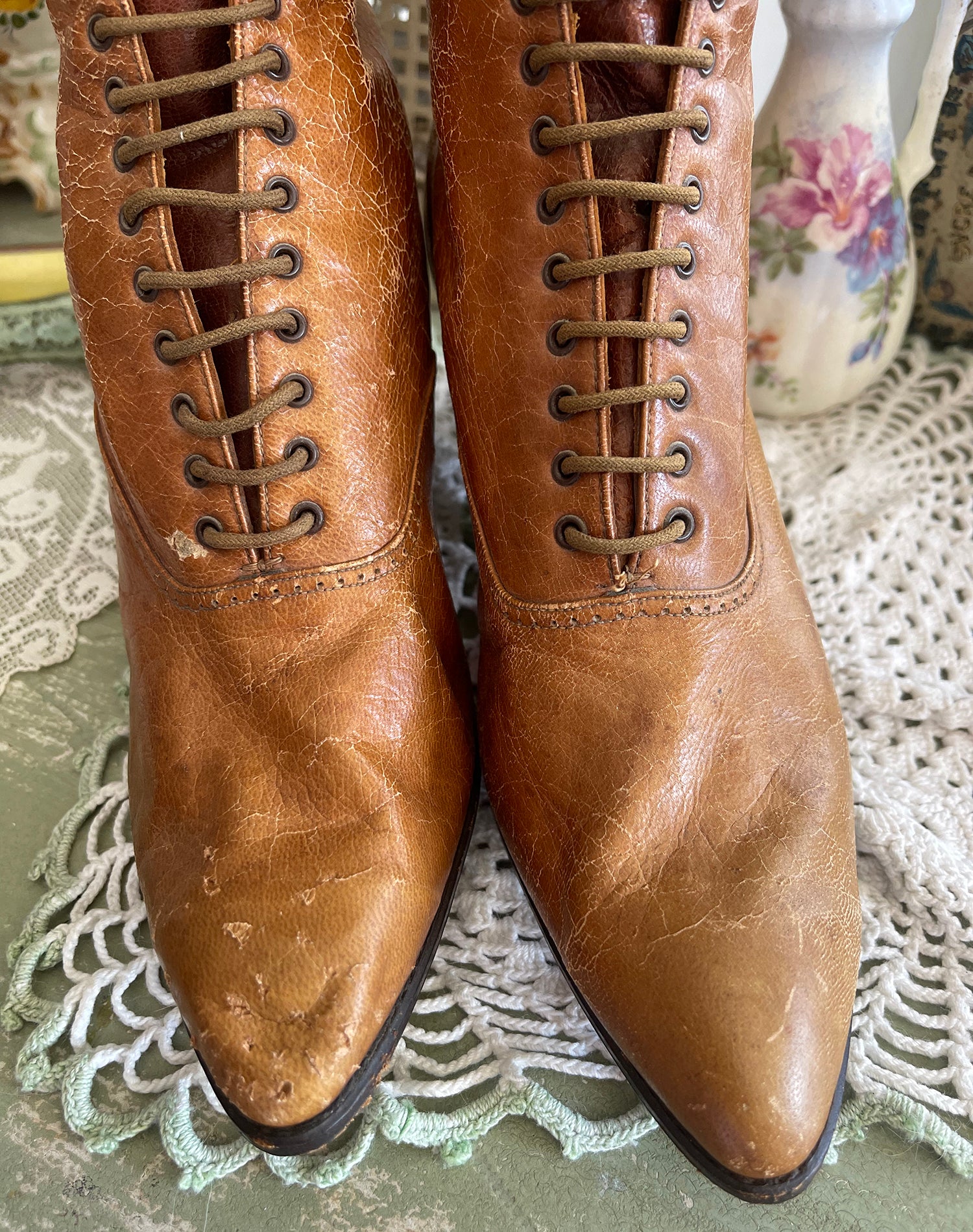 Antique late 1800's early 1900s Cognac distressed Victorian Granny Lace Up Ankle Boots. Sole and Heels in excellent wearable condition. I absolutely love how the Leather has a crackly look to them.