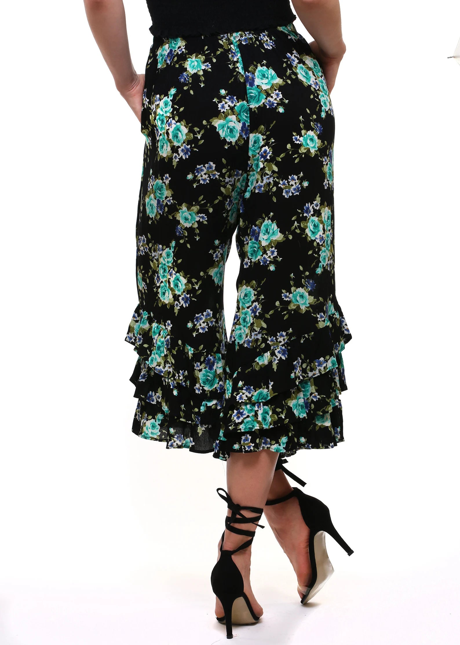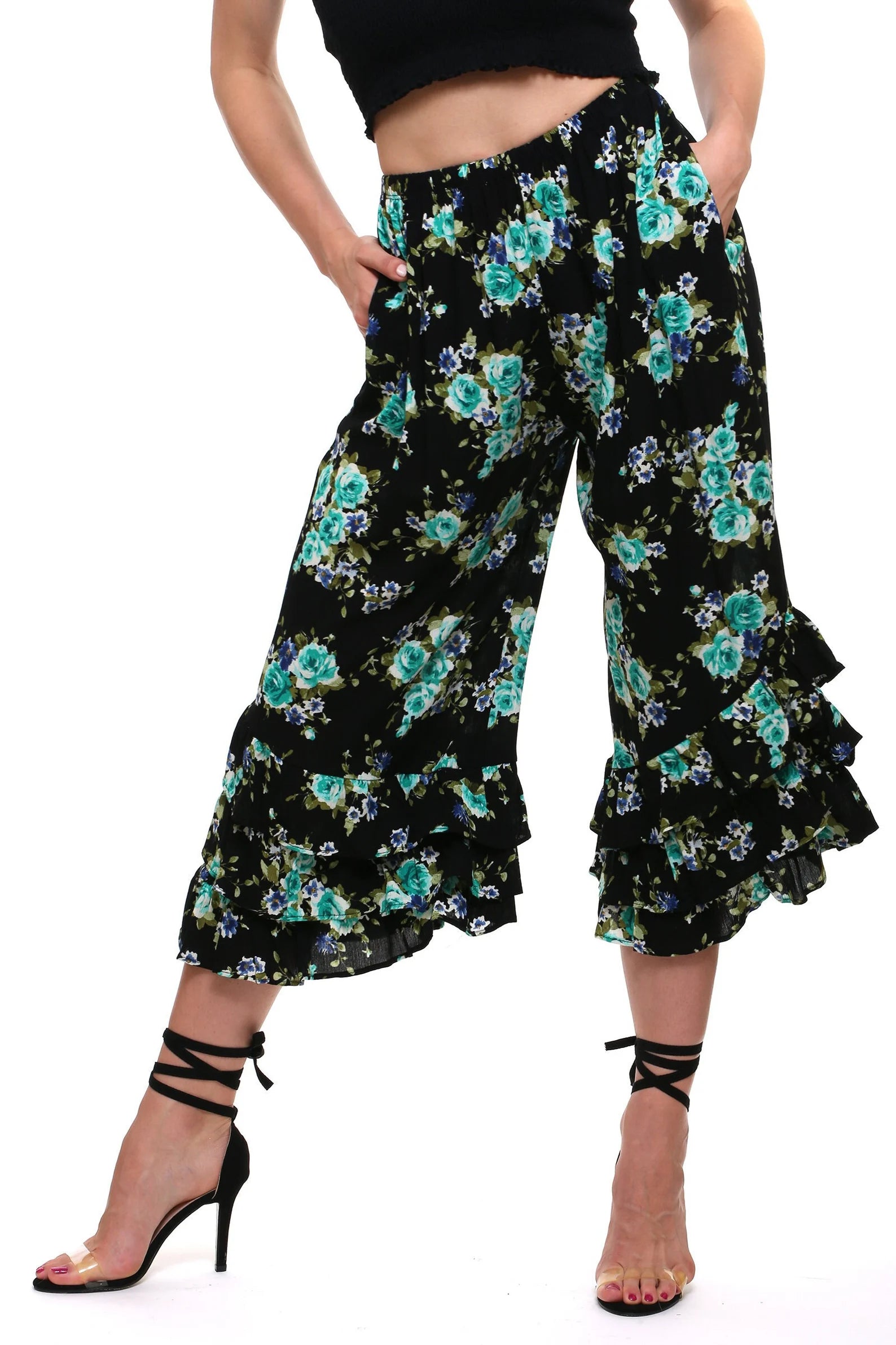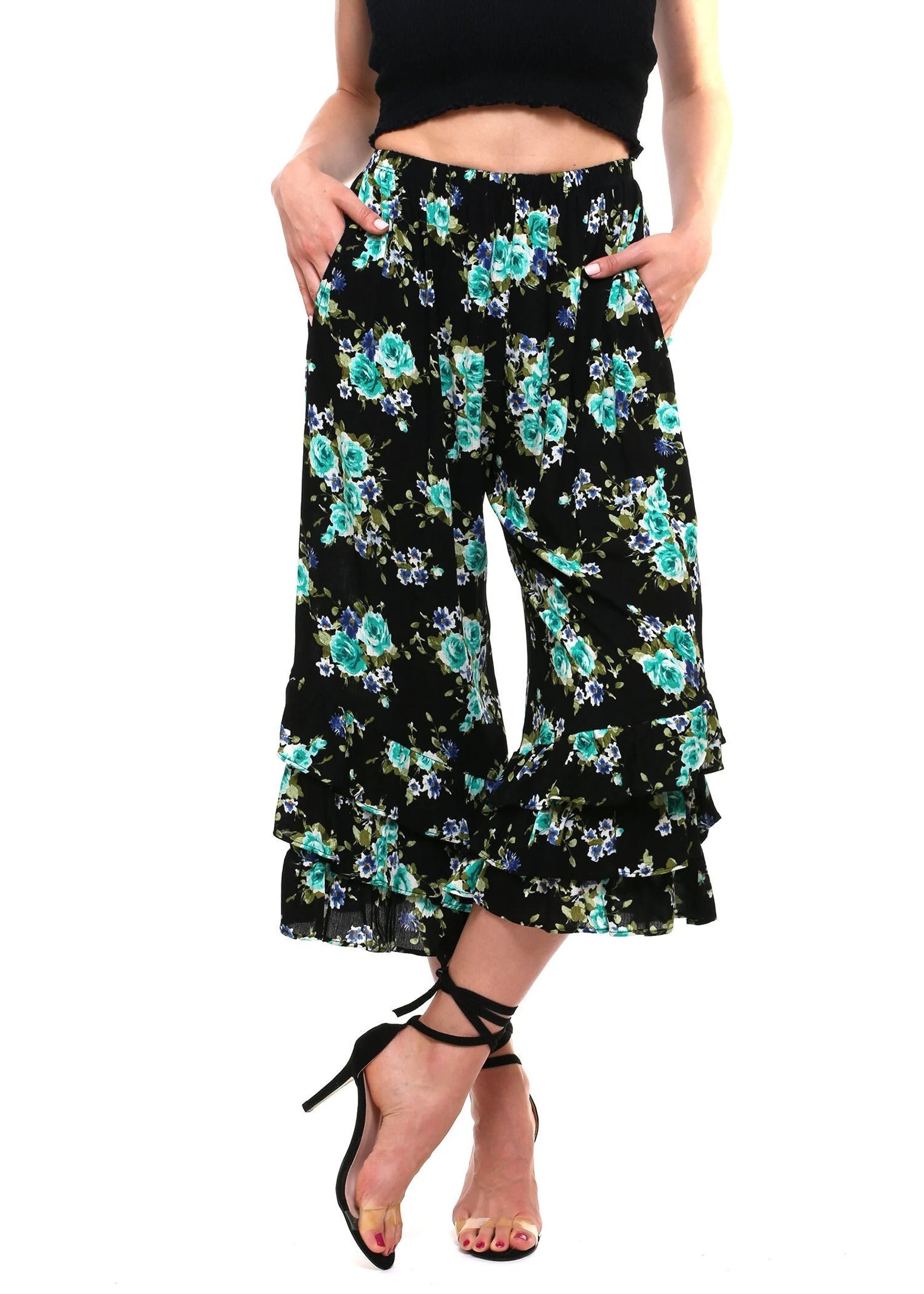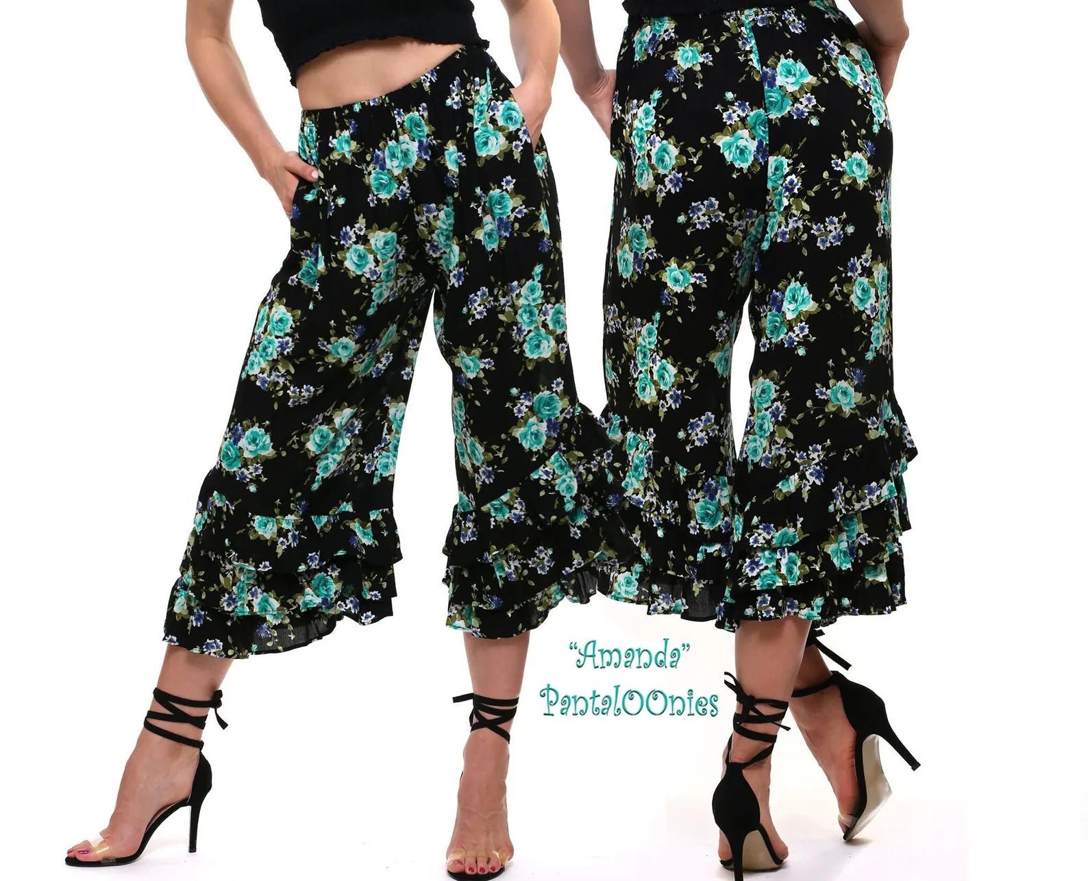 WhatWouldSusieWear Black and Teal Floral "Amanda" Bloomer PantalOOnie Pants with Pockets and Elasticized Waist. Super Cozy, super cool! Lightweight and yummy Rayon Spandex. So comfortable and easy breezy to wear in so many ways. Perfect for everyday wear or to take on vacation when you want something that you can wear over a bathing suit, then change it up for evening with a pair of cool heels. So mushy you could even wear them to sleep in! The Body of the PantalOOnies on both sizes is the same. The only difference in size is the Elastic. Please double measurements of elastic to get full circumference of elastic. I detail the elastic measurements flat and stretched out.