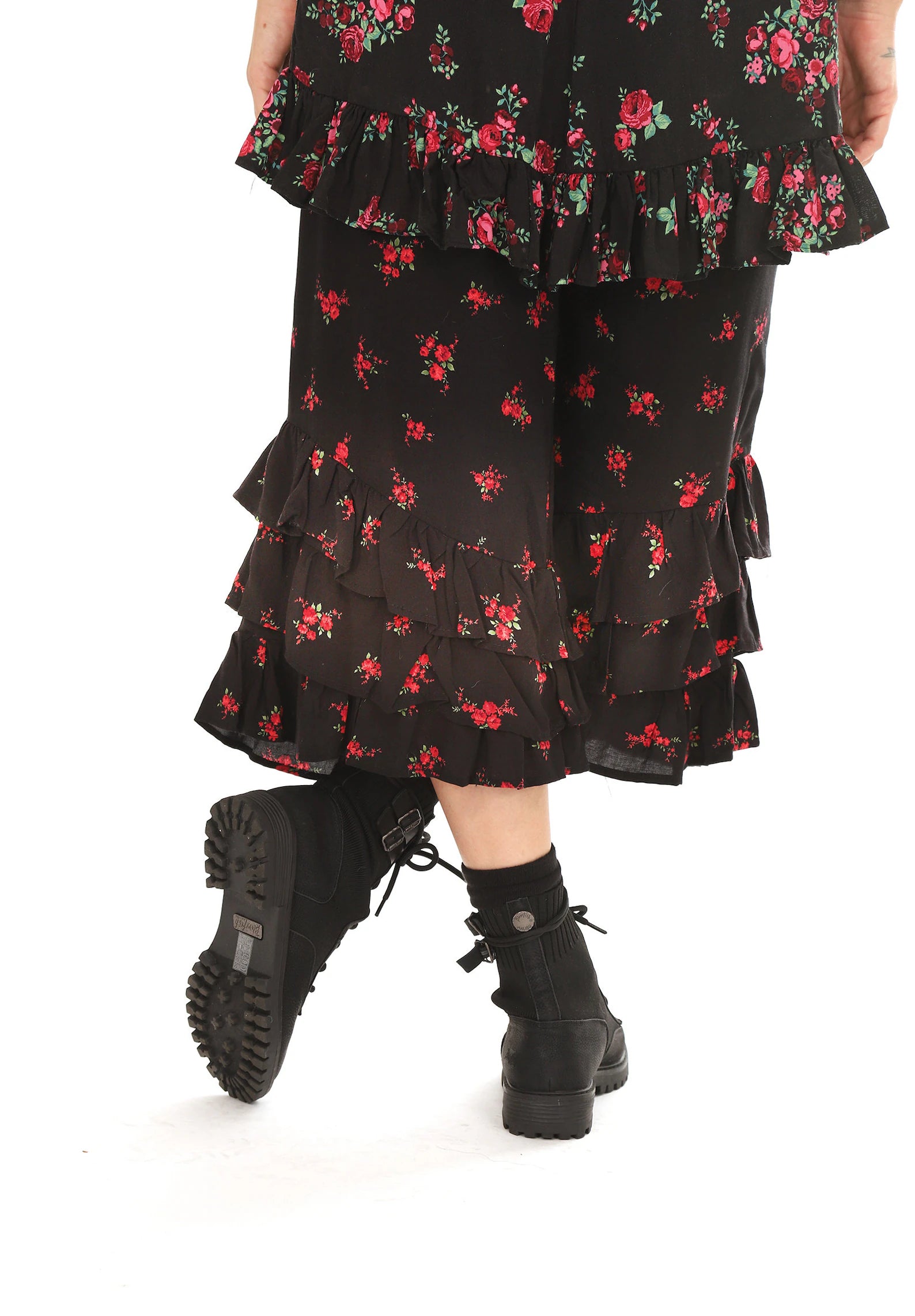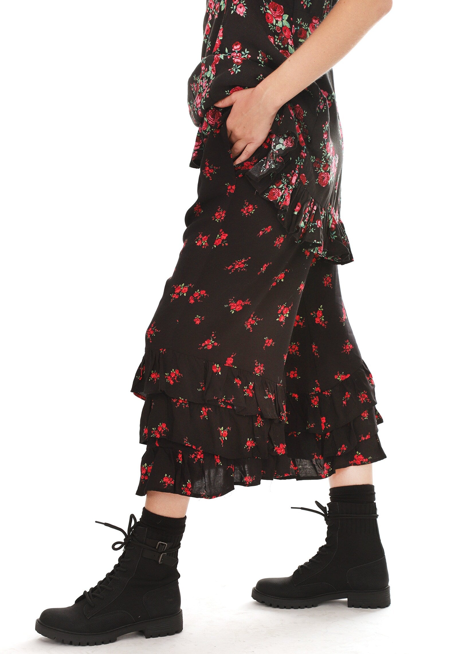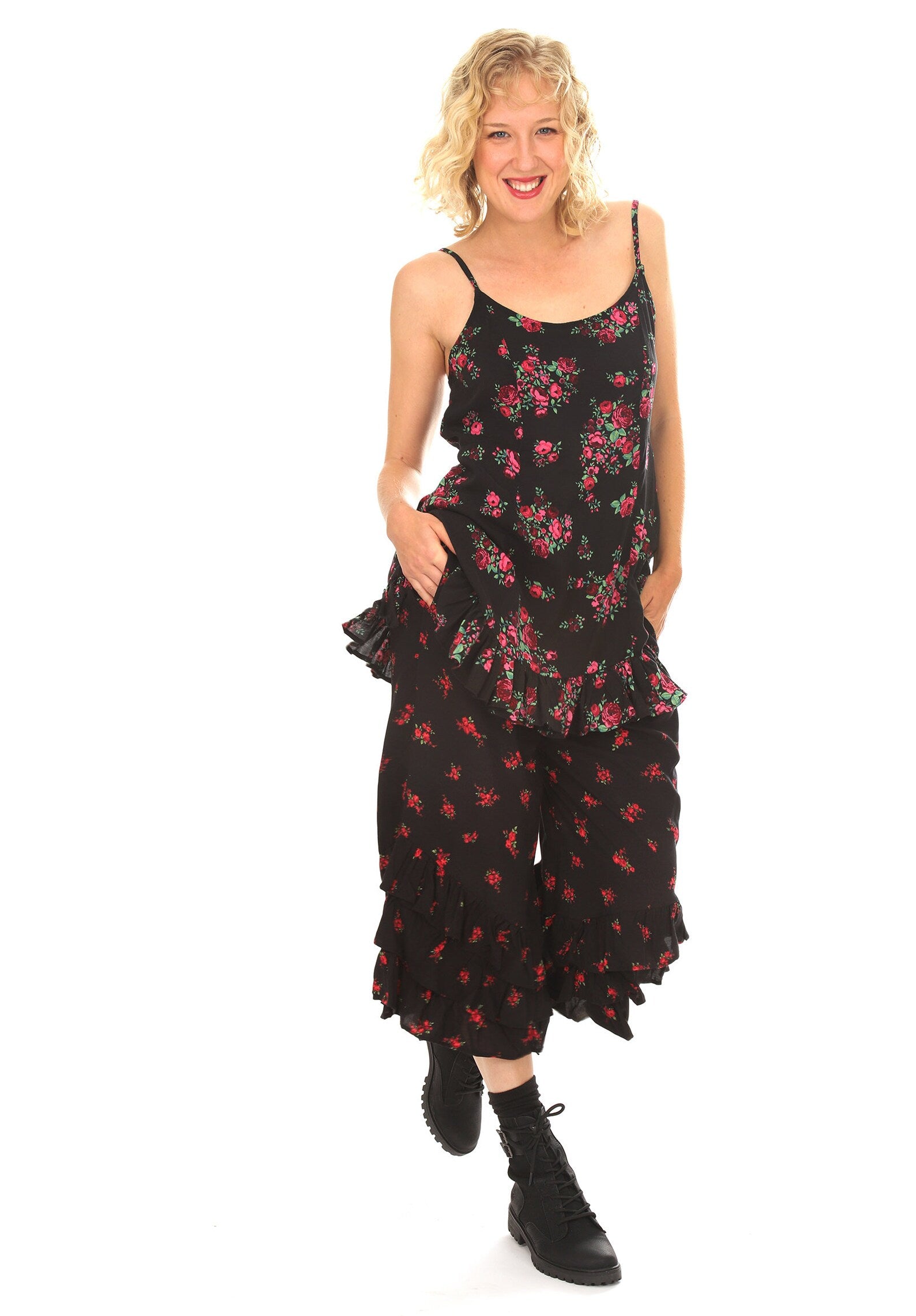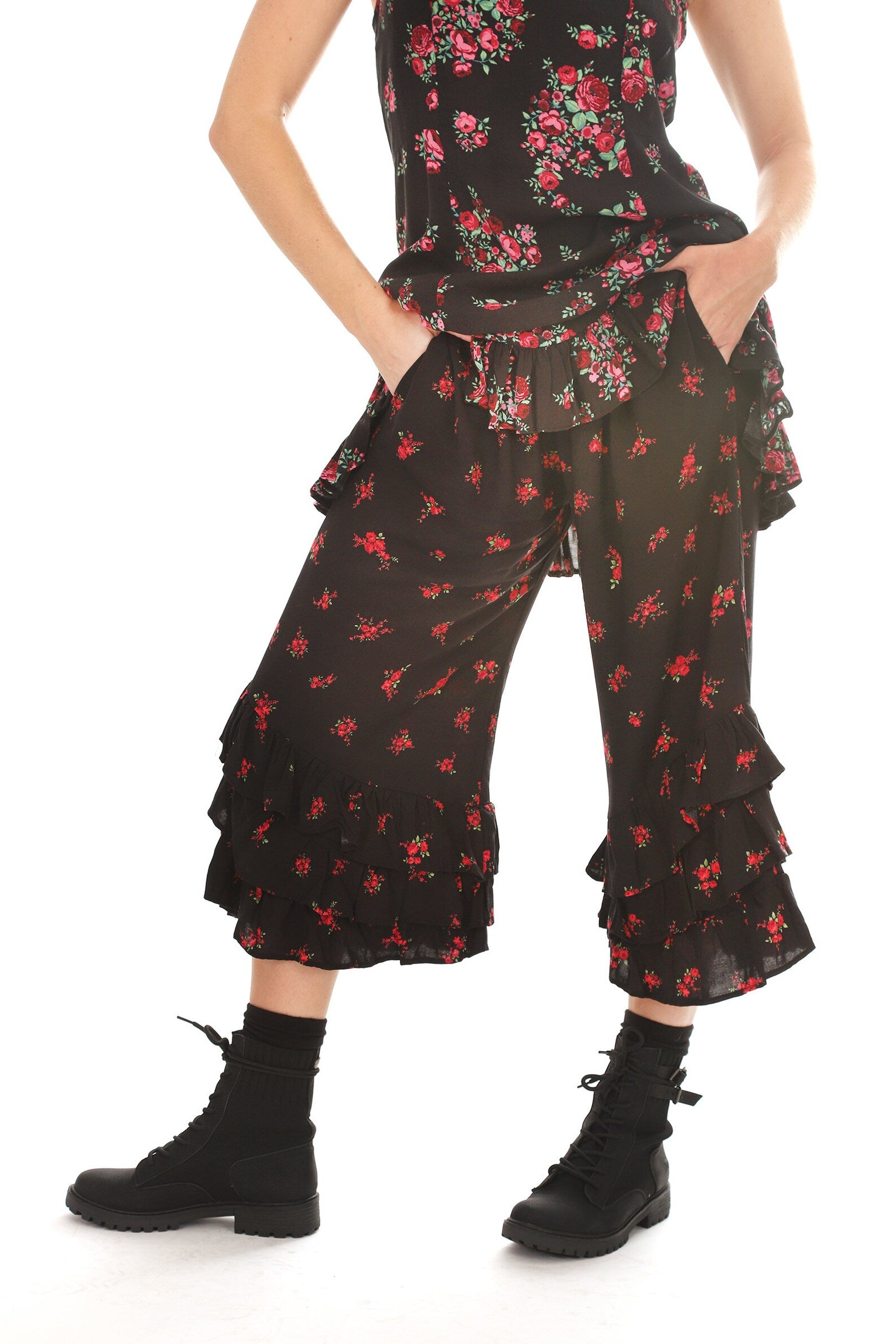 Black and Red Rose Floral Ruffled Bloomer Pants. Add a pop of color to your black outfit! Our new Hannah Bloomers are So gorgeous, SO COZY and so much fun! Wear Casually with a pair of boots, or Dressed peaking out from under a dress, or with a silky Top. Beautiful small bouquets of red roses in a super soft Lovely Rayon Challis Fabric is so comfy and flows so beautifully when you move! Fabulous with our Black Flare Top Thumbhole Frenchie's too!