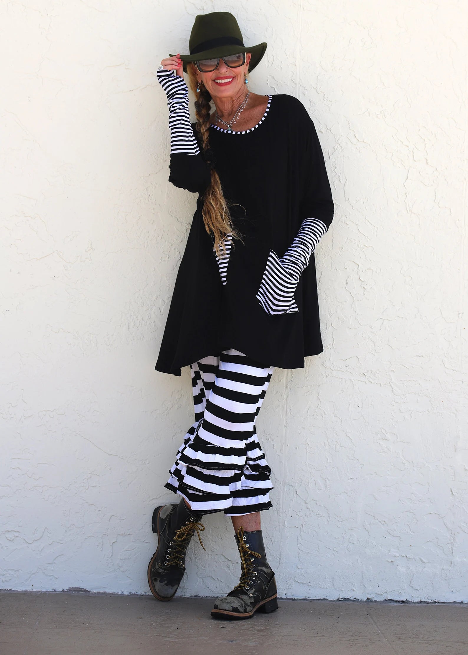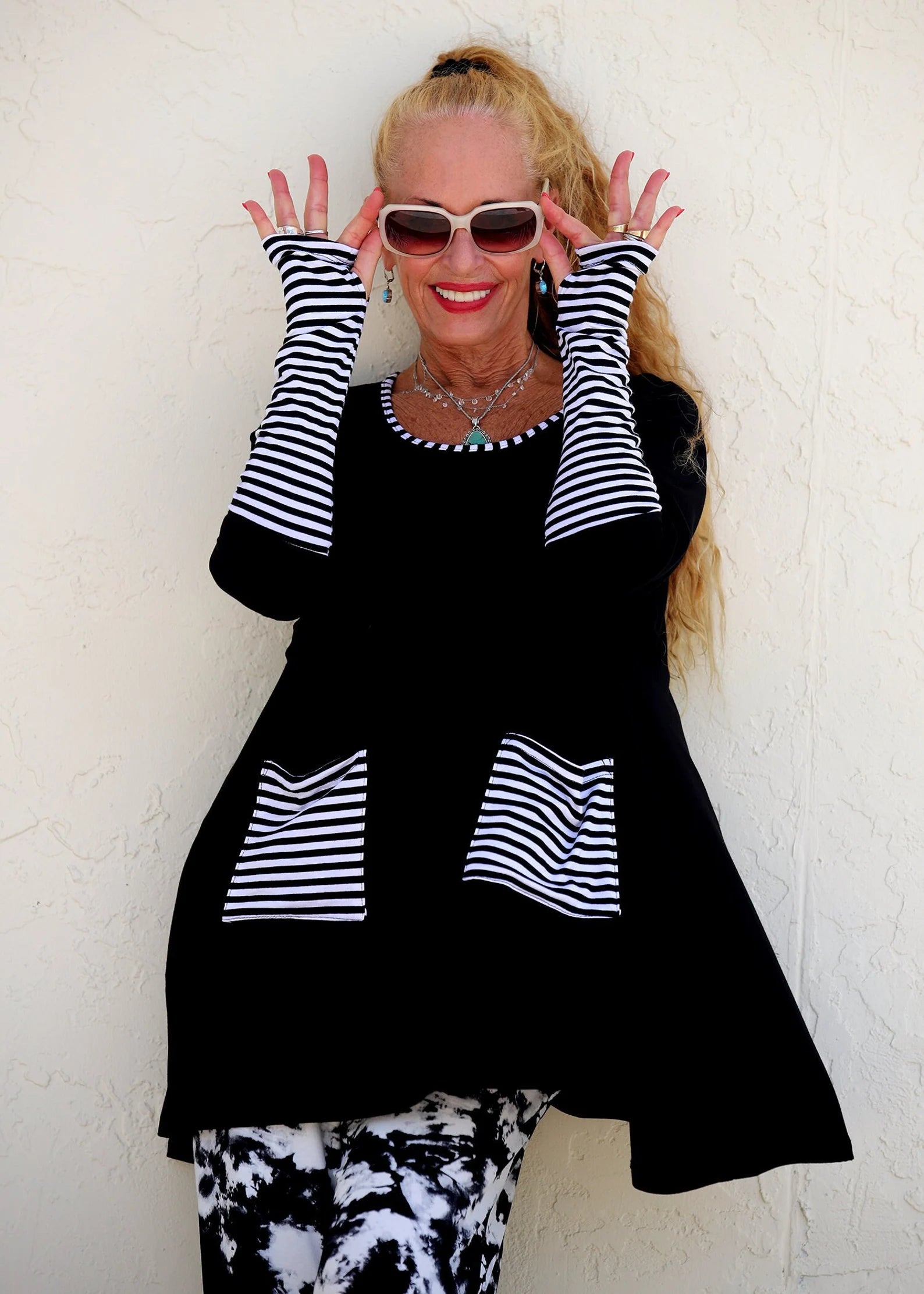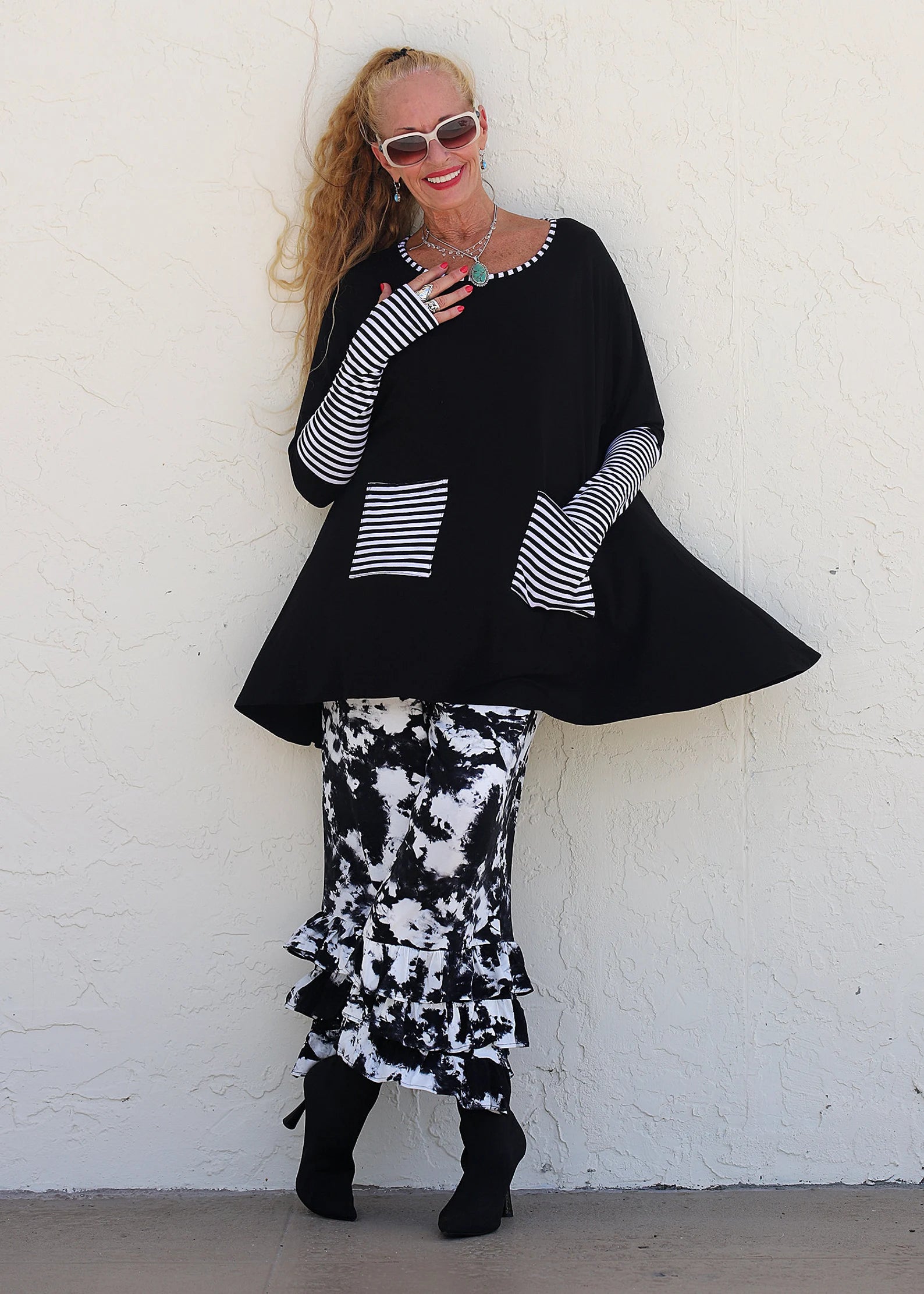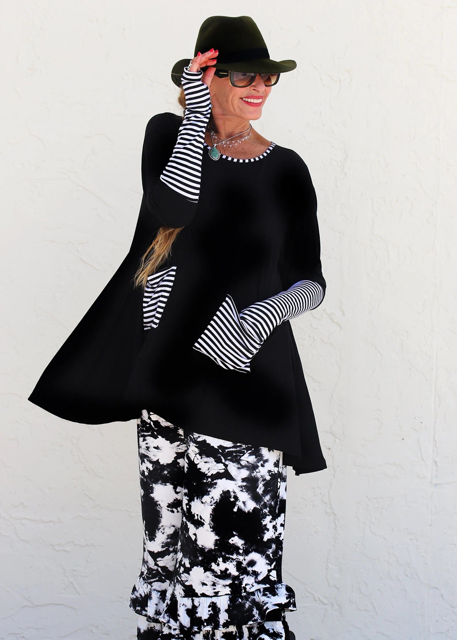 Black and White "Stripie" Flare Top with Striped Cuffs, Pockets and trim around the neckline, and of course the cuffs have Thumbholes! I have been wanting to make this top forever and finally took the plunge, and I love it and think you will too! So much fun to wear, in the softest Rayon Spandex Material, and the fit is classic Frenchie! Just the perfect top to go with all my Black and White goodies, and you will definitely have plenty in your own closet to match with this adorably comfy top. Super flattering. Covers you in all the right places, and the wide bottom gives the top beautiful movement and coverage.