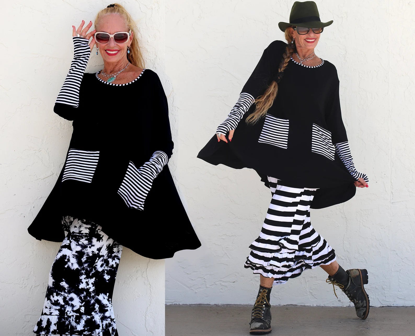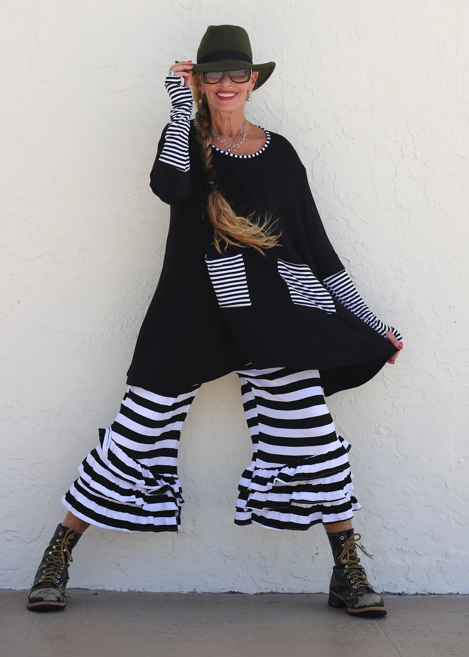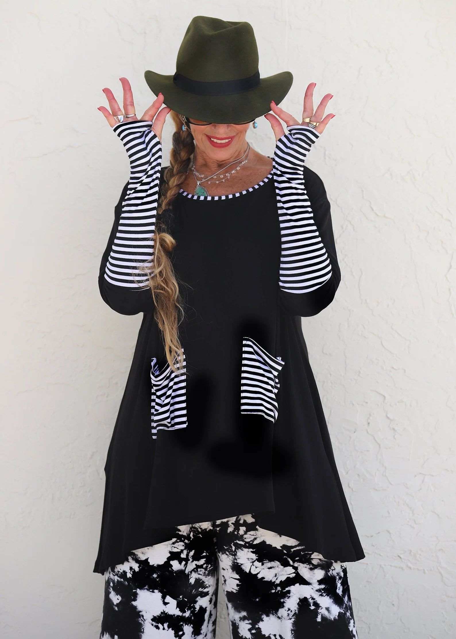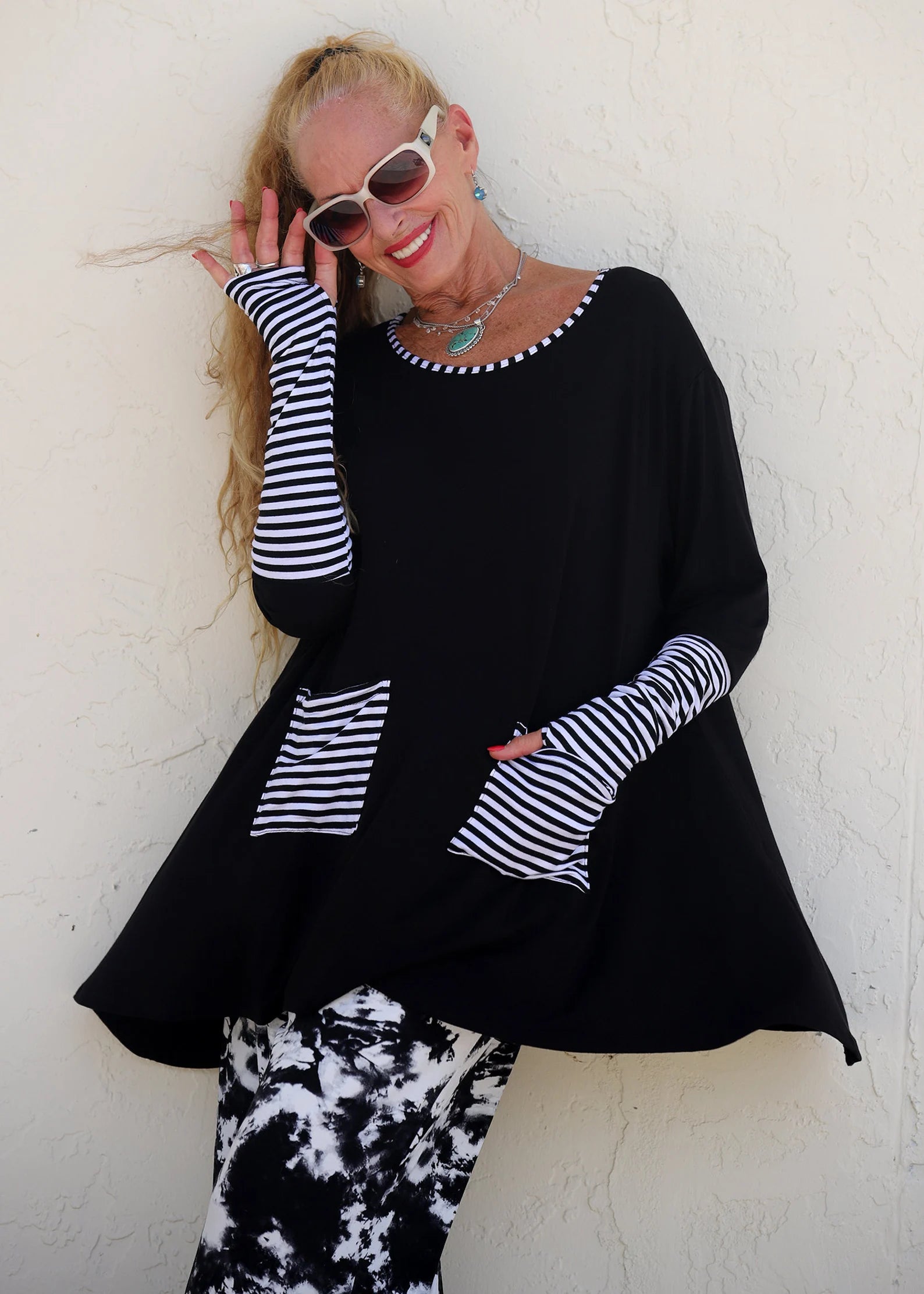 Black and White "Stripie" Flare Top with Striped Cuffs, Pockets and trim around the neckline, and of course the cuffs have Thumbholes! I have been wanting to make this top forever and finally took the plunge, and I love it and think you will too! So much fun to wear, in the softest Rayon Spandex Material, and the fit is classic Frenchie! Just the perfect top to go with all my Black and White goodies, and you will definitely have plenty in your own closet to match with this adorably comfy top. Super flattering. Covers you in all the right places, and the wide bottom gives the top beautiful movement and coverage.