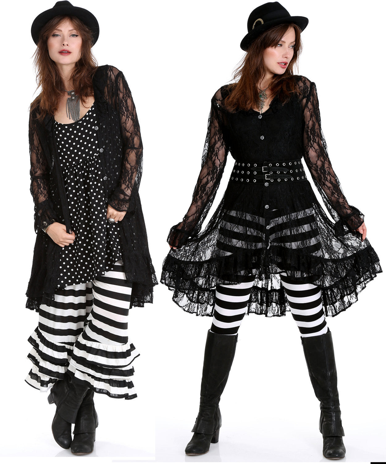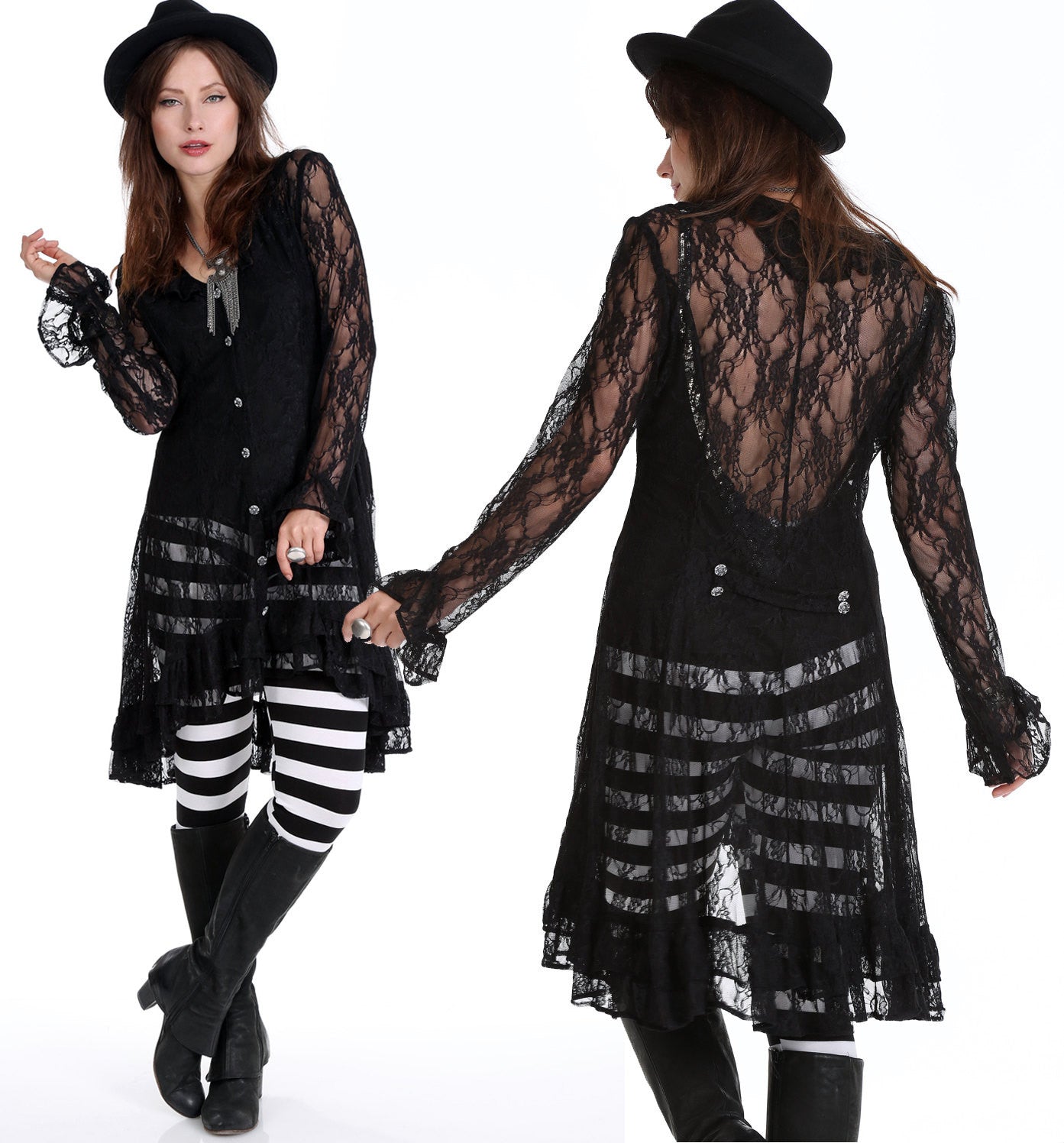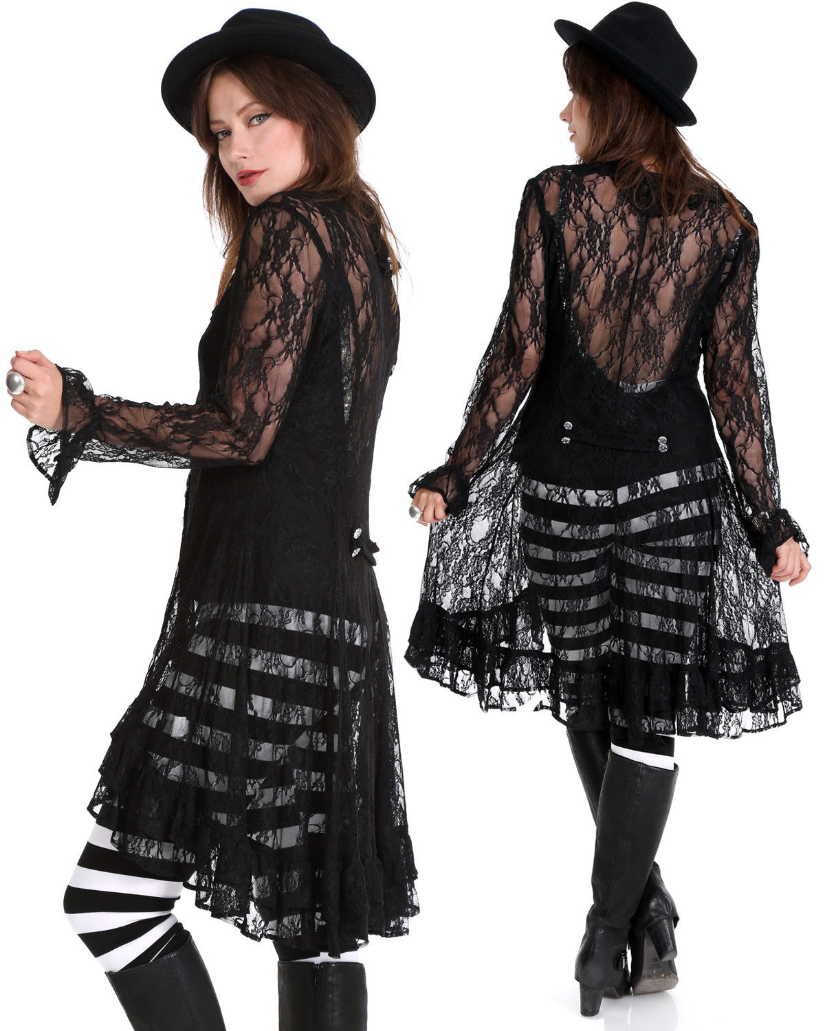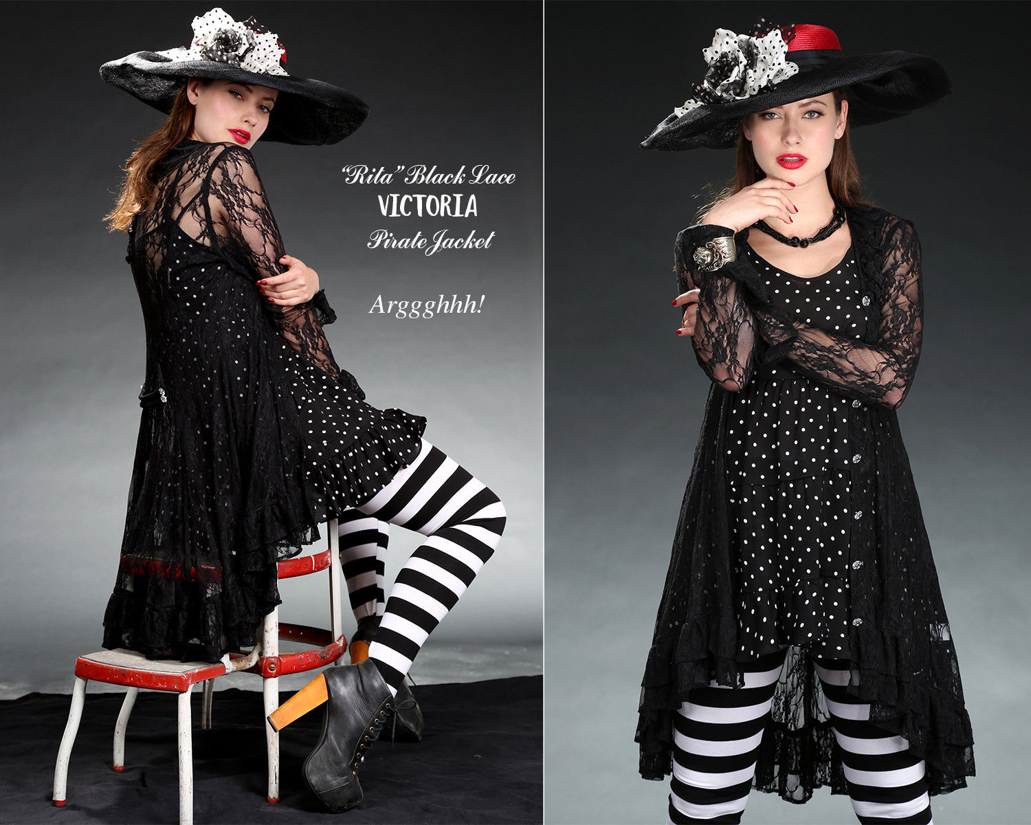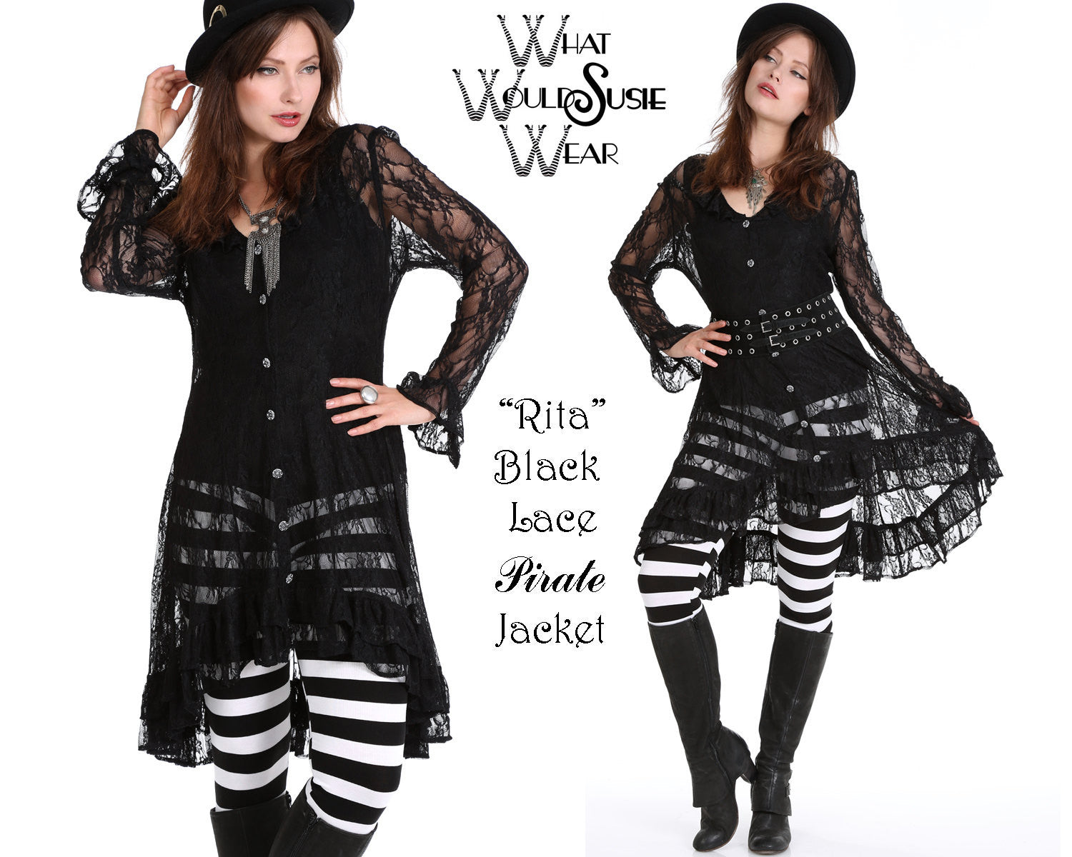 Black Lace Pirate Jacket. Made with soft Nylon Spandex Lace with oodles of panels for major flow and fit at the waist, with ruffle color, ruffle sleeves and hemline. Longer in the back than front for Uber Coolness and flow. Wear closed, with a slip as a Dress, or wear it as a Jacket, open it up and let it fly! Closes in the front with Glasslike Flower buttons, and has a Petite sash with buttons at the back. Wear as shown with our Striped DaddyLongLegz Leggings, Dotty Mica Dress, Susie Stripe PantalOOnies or whatever is in your closet! Fab Vintage Bohemian look! Looks perfect with a T-Shirt or Silk teddy and distressed jeans or shorts and grungy boots, or flowy Skirt. No matter how you wear it you will feel fab and it will become on e of your go to pieces for sure!