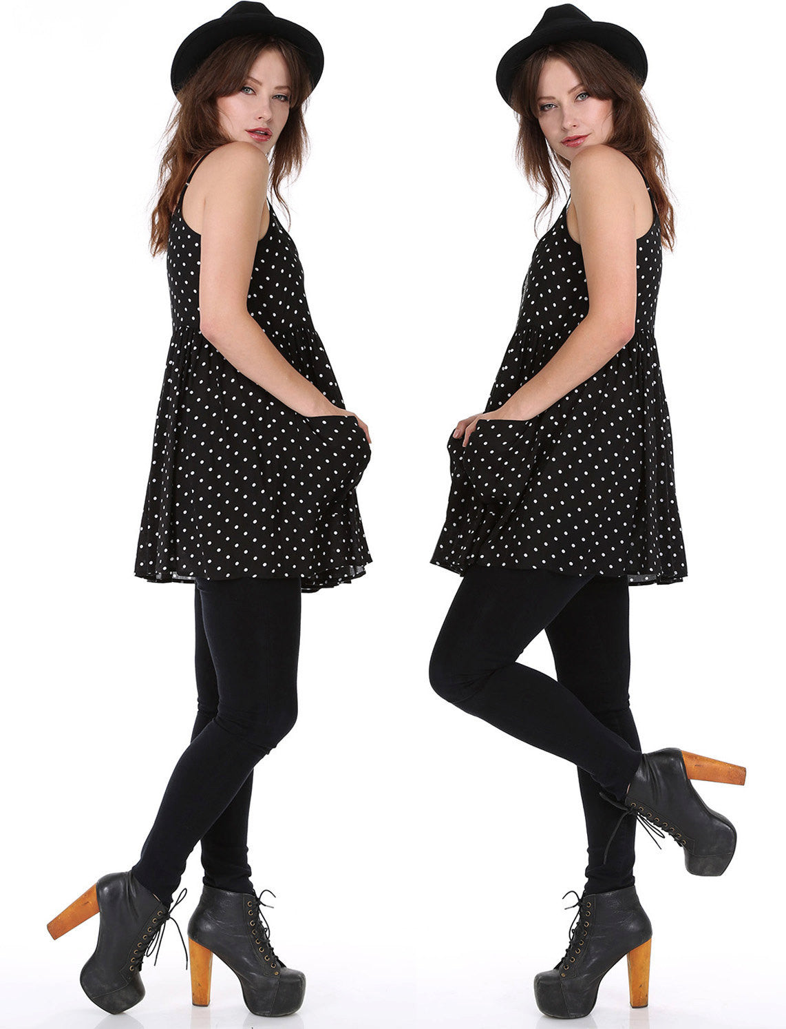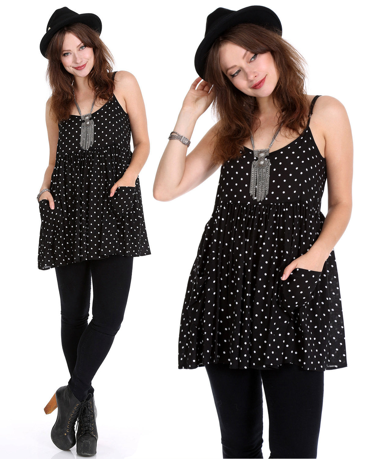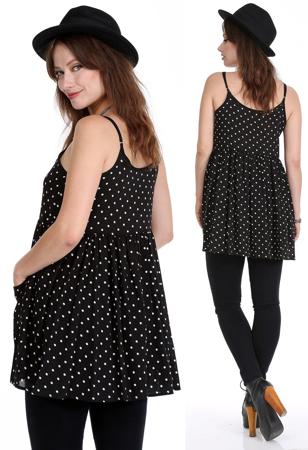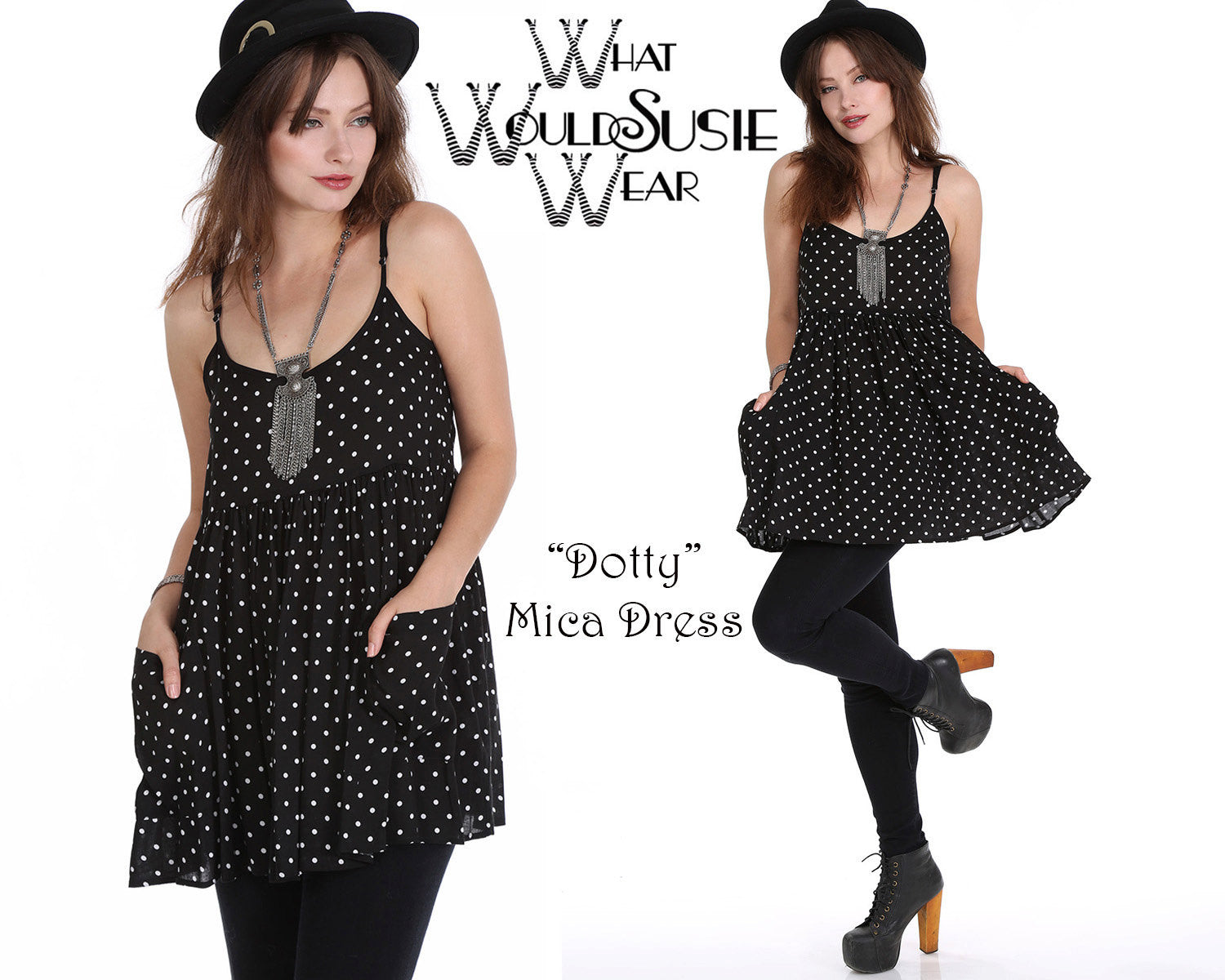 WhatWouldSusieWear Black and White Polka Dot Mini Dress with Pockets and Adjustable Straps! Great alone or with a pair of Pants, Shorts, or Our Black Lace or Striped or Floral PantalOOnies! Perfect to wear to the beach over your bathing sit, then just grab a pair of heels or boots and you are ready to go out for the night! Made in super soft, light and cozy Rayon Challis! Just a perfect easy breezy dress that you will wear again and again! Great for Pregnancy also!