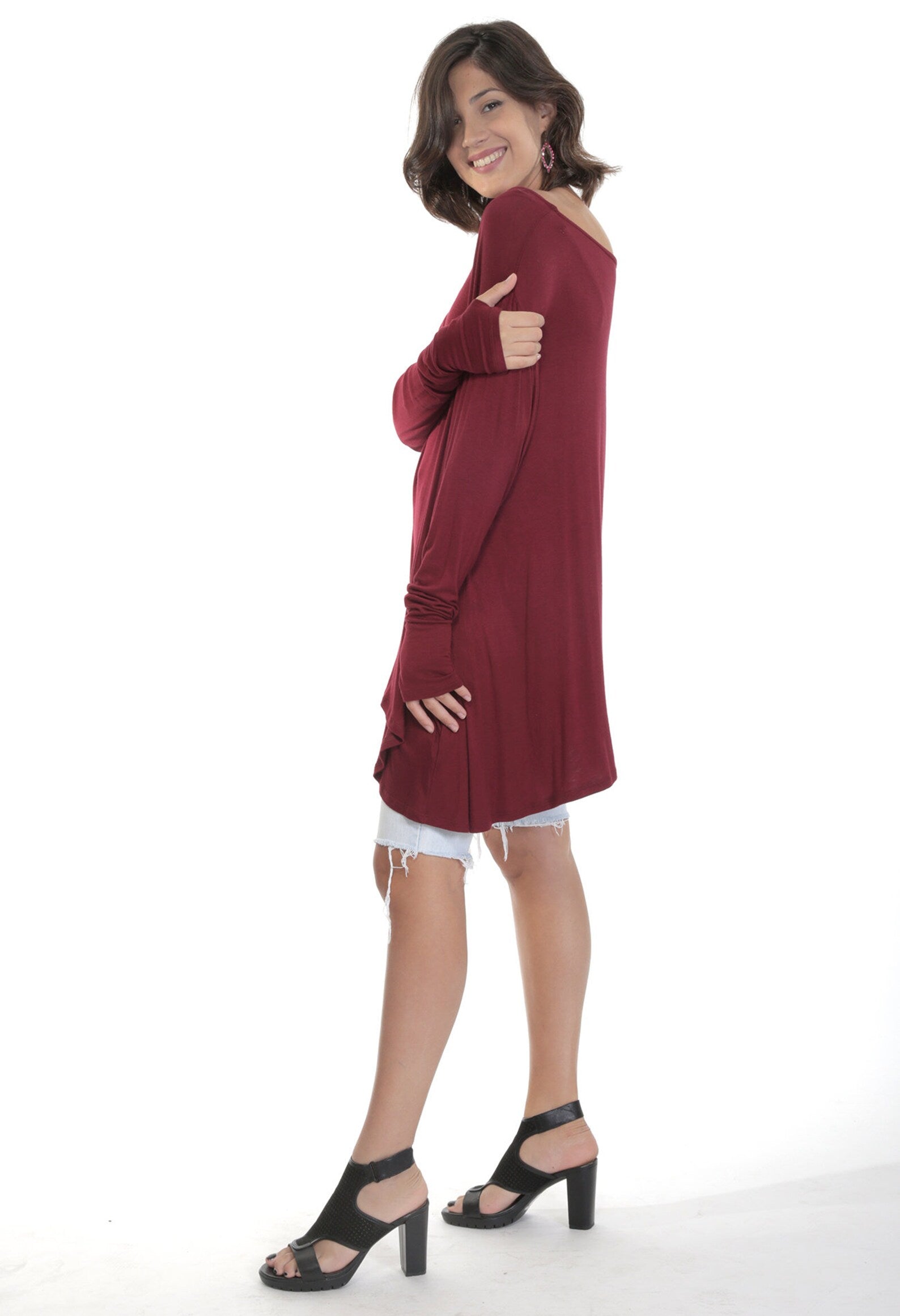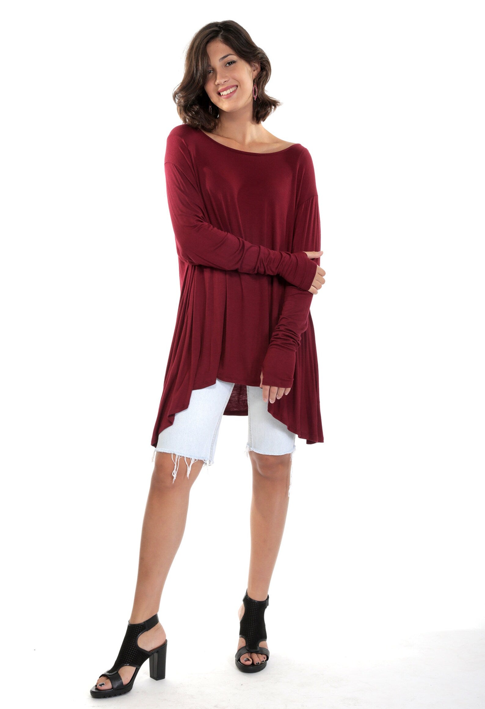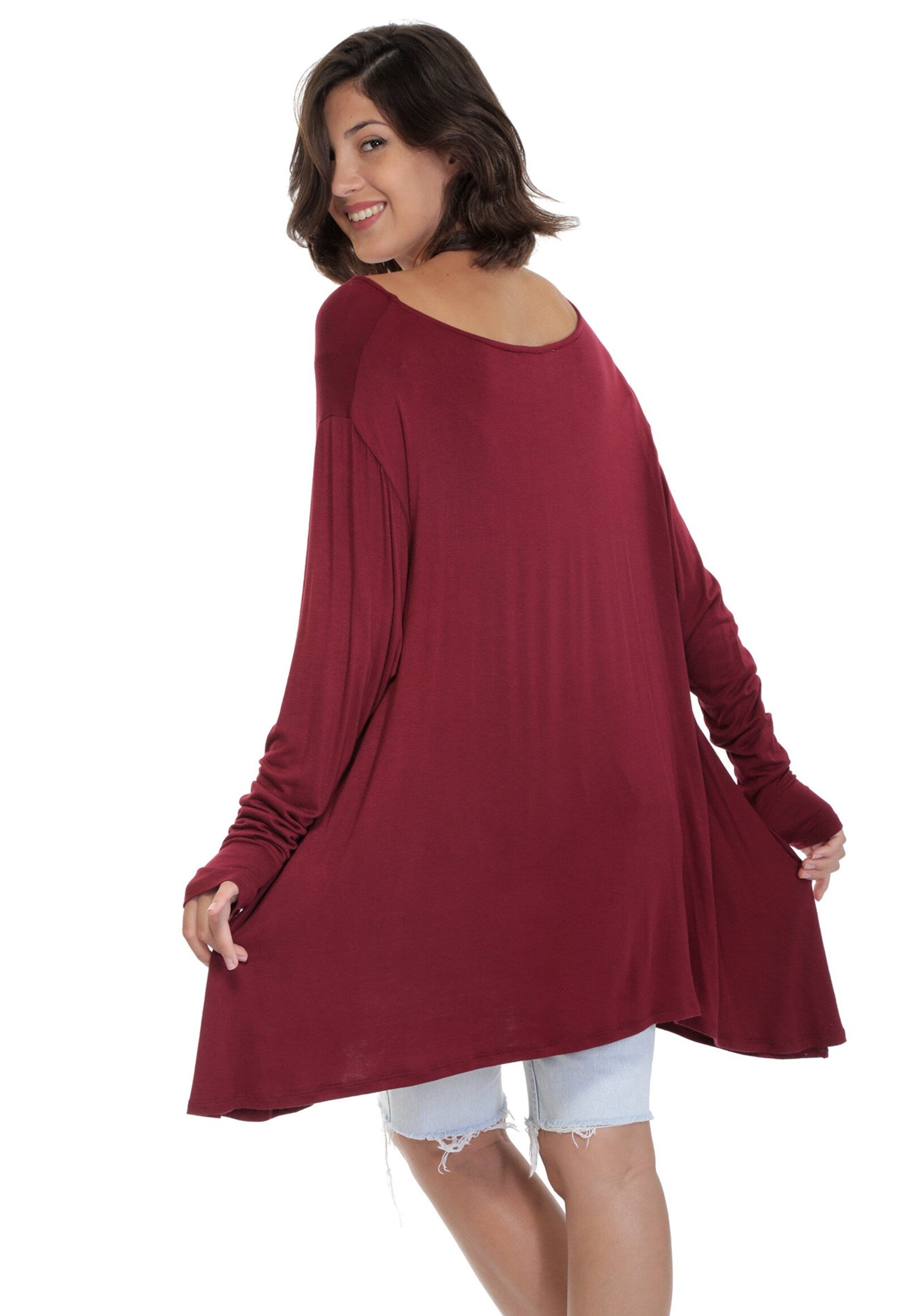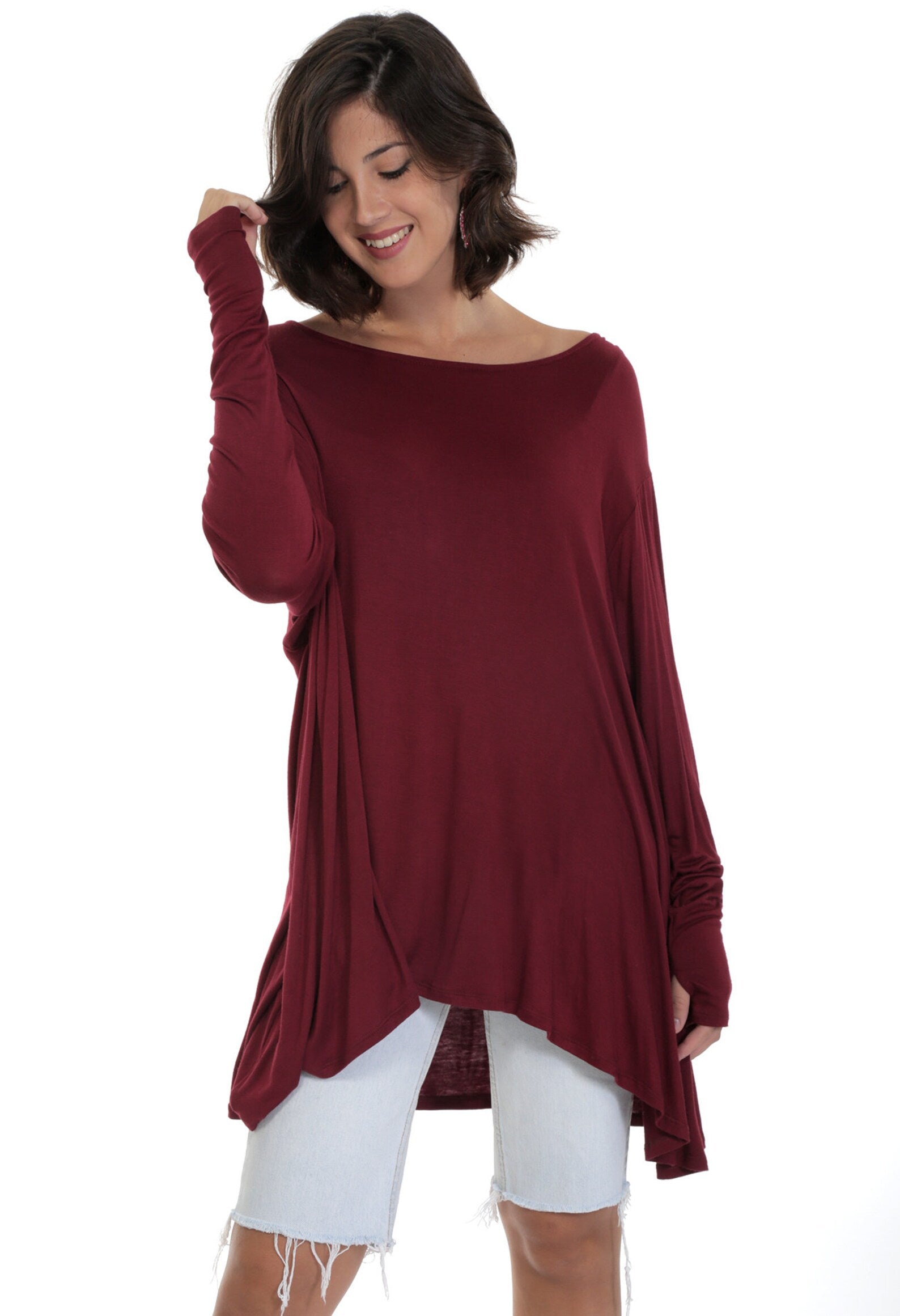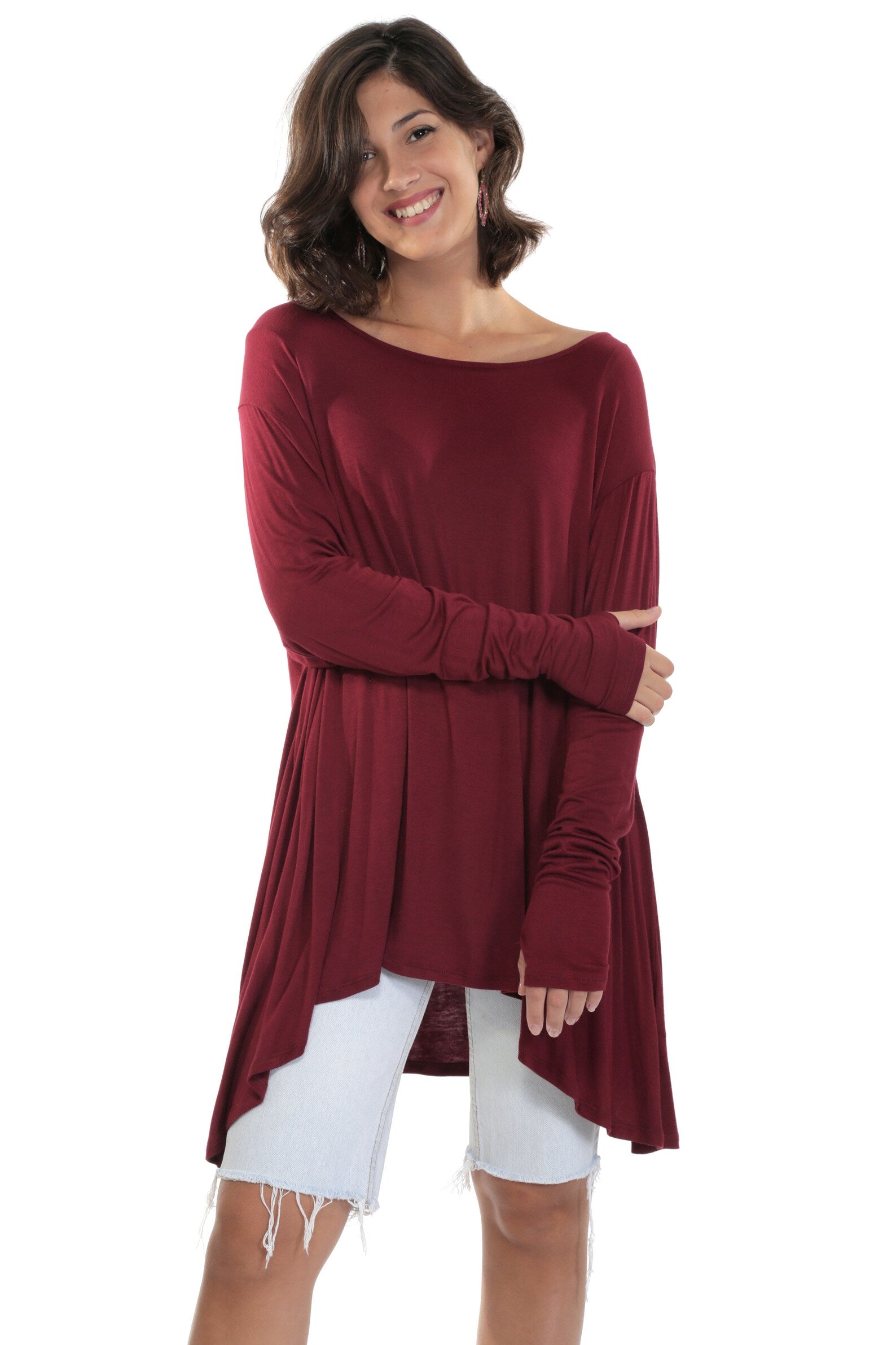 Burgundy Flared Bottom FRENCHIE Top with Long Sleeves and Thumbholes. Made of Mushy soft, feels like Cashmere delicious brushed Rayon Spandex. Full swing bottom is a bit shorter in the front than the sides and back, and super flattering for all body types. Great with Jeans, Shorts, Skirts and so comfy you'll wanna sleep in it! Great to throw in your bag when for the evening, or just when you need something light, yummy and fashionable to throw over you at the Beach or dinner. Join the Frenchie Brigade! Once you wear one you want a Frenchie in all the fabrics WhatWouldSusieWear has to offer! Just the Perfect Top!
