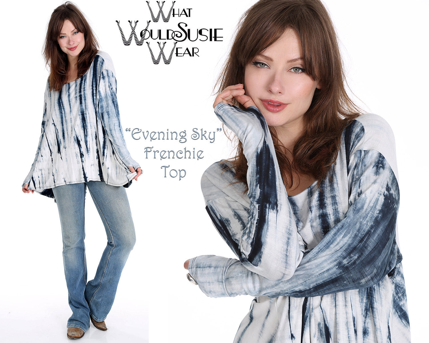WhatWouldSusieWear's Cobalt Blue-Navy and White "Evening Sky" Frenchie Top with Wide Flared Bottom and thumbholes. These tops are so chic, comfy and easy to wear with jeans, skirts or leggings. They cover all the important places with a shorter front swooping into a longer back, covering what you want covered, and the thumb holes are so cool and add a bit of warmth to your hands. So cozy you could easily sleep in it!