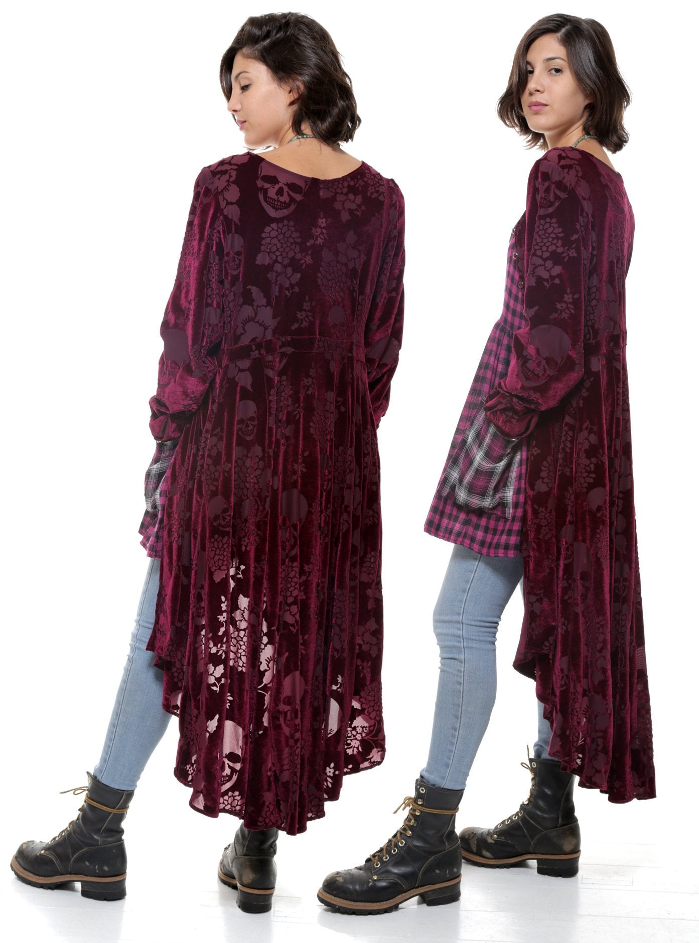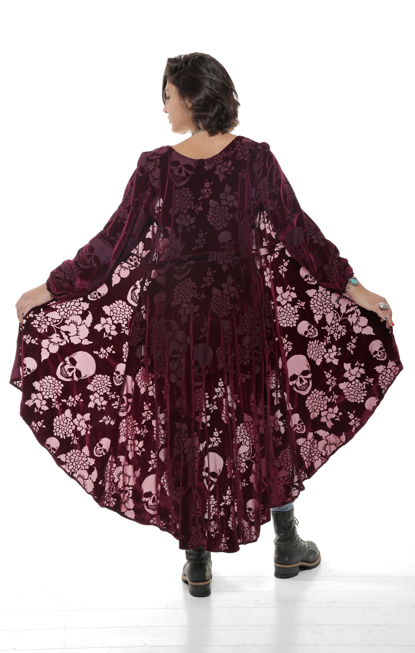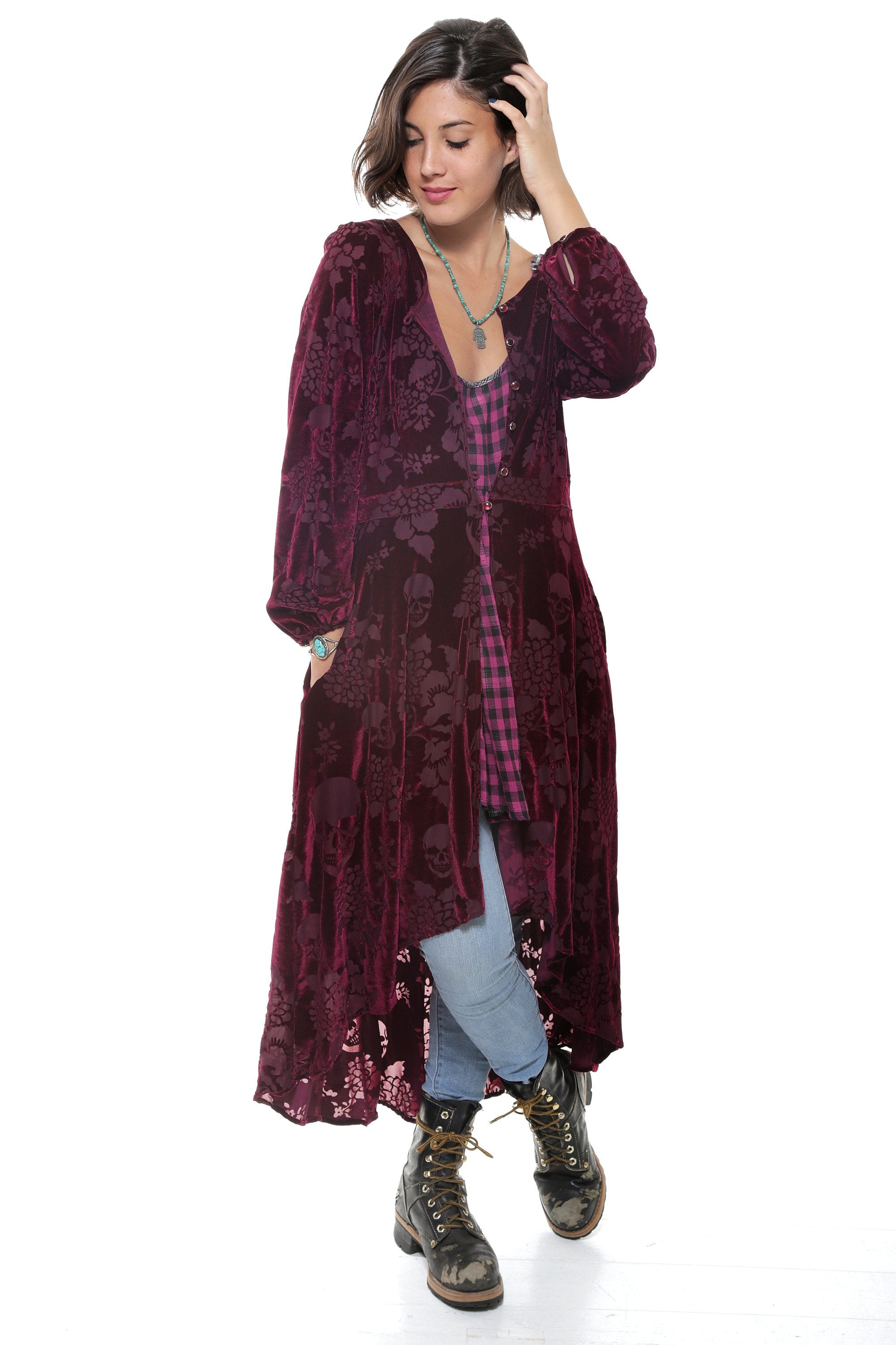WhatWouldSusieWear's Burgundy Burnout Velvet Rose and Skull Duster Jacket with Burgundy Buttons on the front and sleeves. Longer in the back then front for maximum movement and flow. The Burnout Pattern is at once beautiful and surprising. Looks great dressy or dressed down. Super Kool either way! The fabric is so soft! It is stretchy and has plenty of give. Open it and let it fly!!! You will definitely turn heads with this piece!