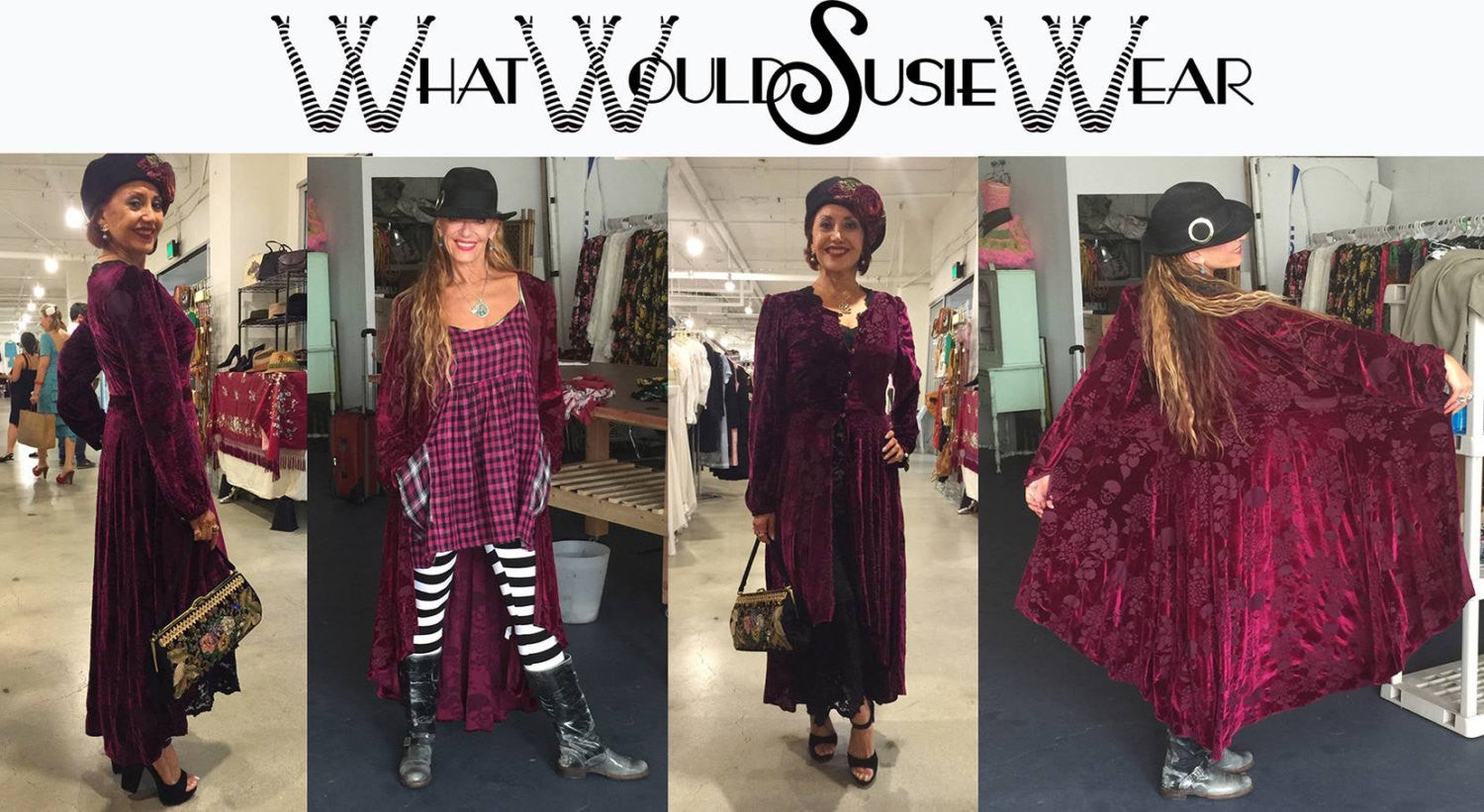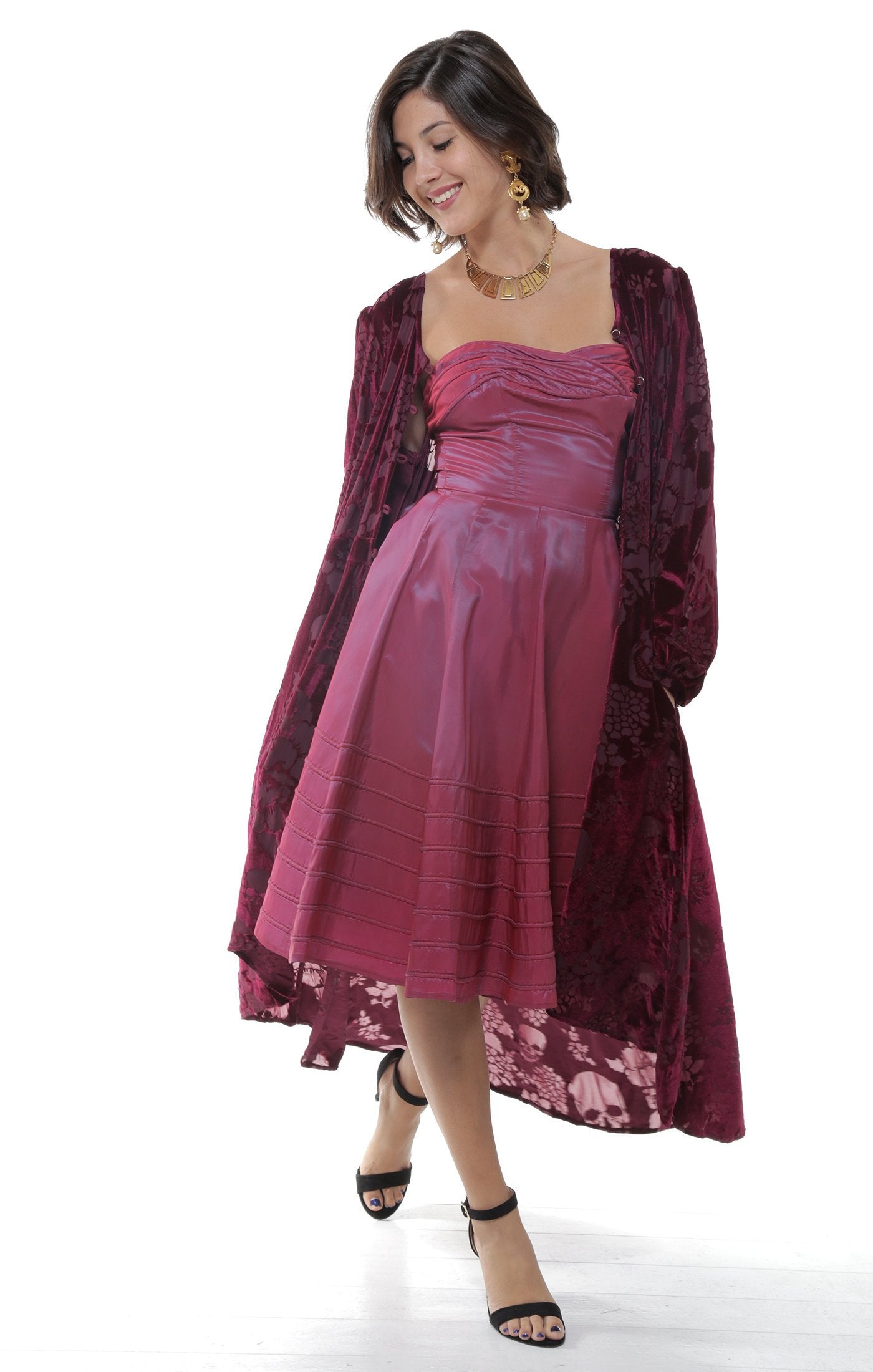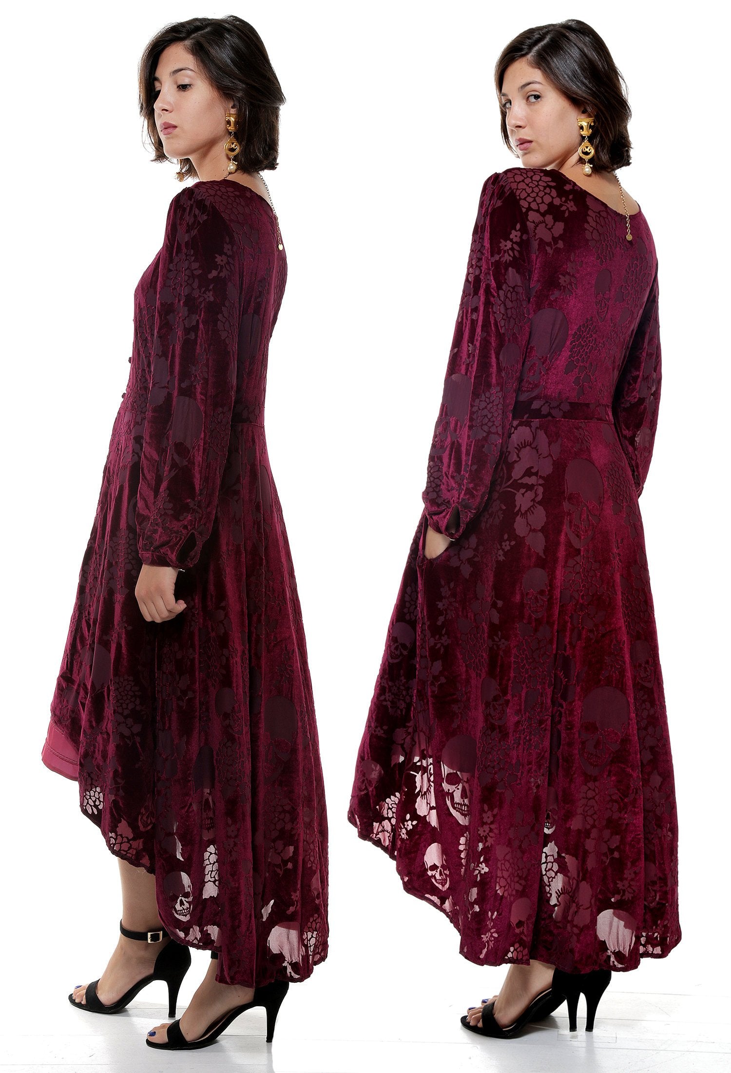 WhatWouldSusieWear's Burgundy Burnout Velvet Rose and Skull Duster Jacket with Burgundy Buttons on the front and sleeves. Longer in the back then front for maximum movement and flow. The Burnout Pattern is at once beautiful and surprising. Looks great dressy or dressed down. Super Kool either way! The fabric is so soft! It is stretchy and has plenty of give. Open it and let it fly!!! You will definitely turn heads with this piece!