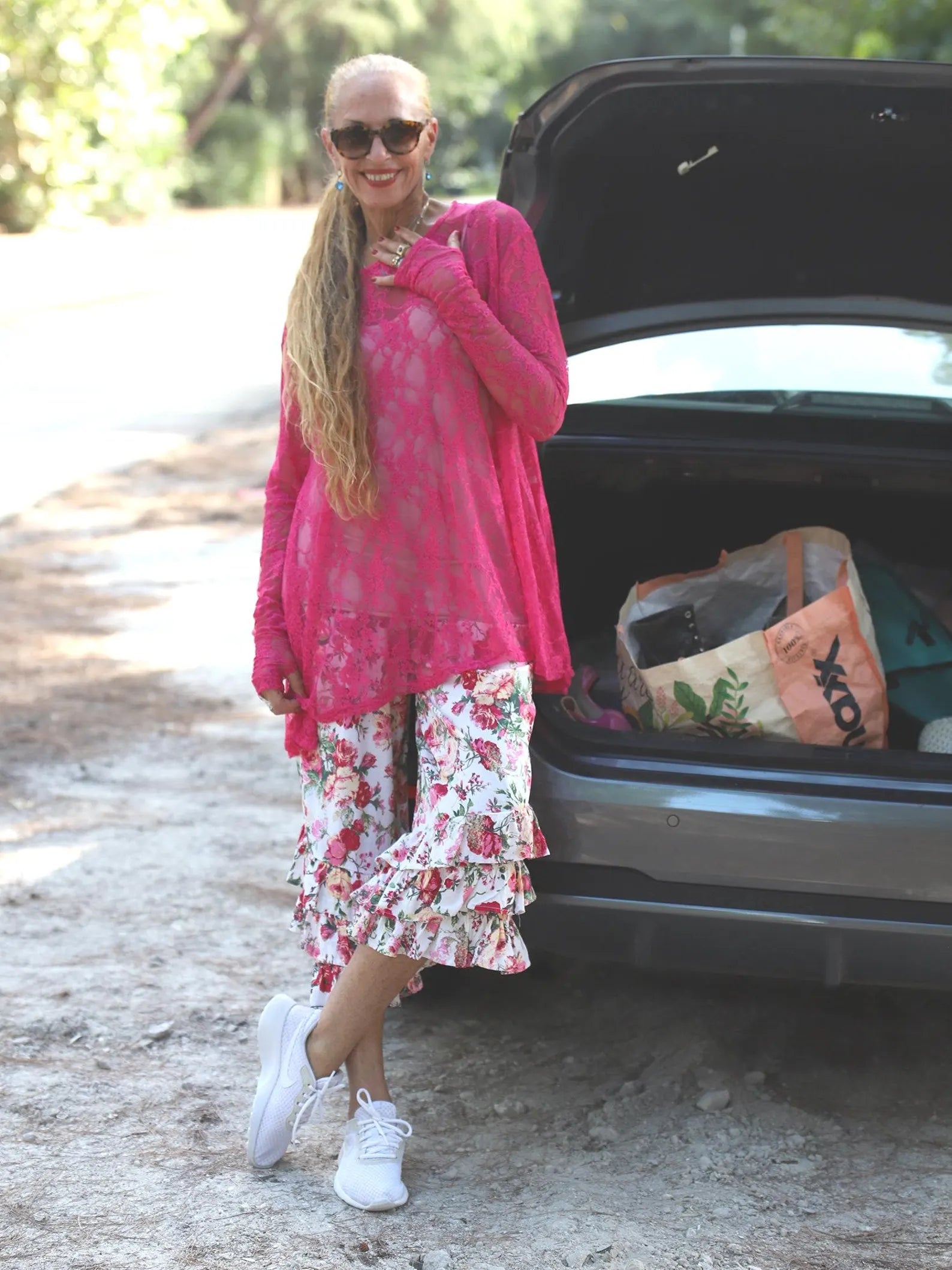 Fuchsia Lace Flare Frenchie Top with thumbholes. So soft, fun and flattering. So whimsical and such a great color top add some Pizazz and a funky feminine touch to your outfit! So much fun and purty to boot!