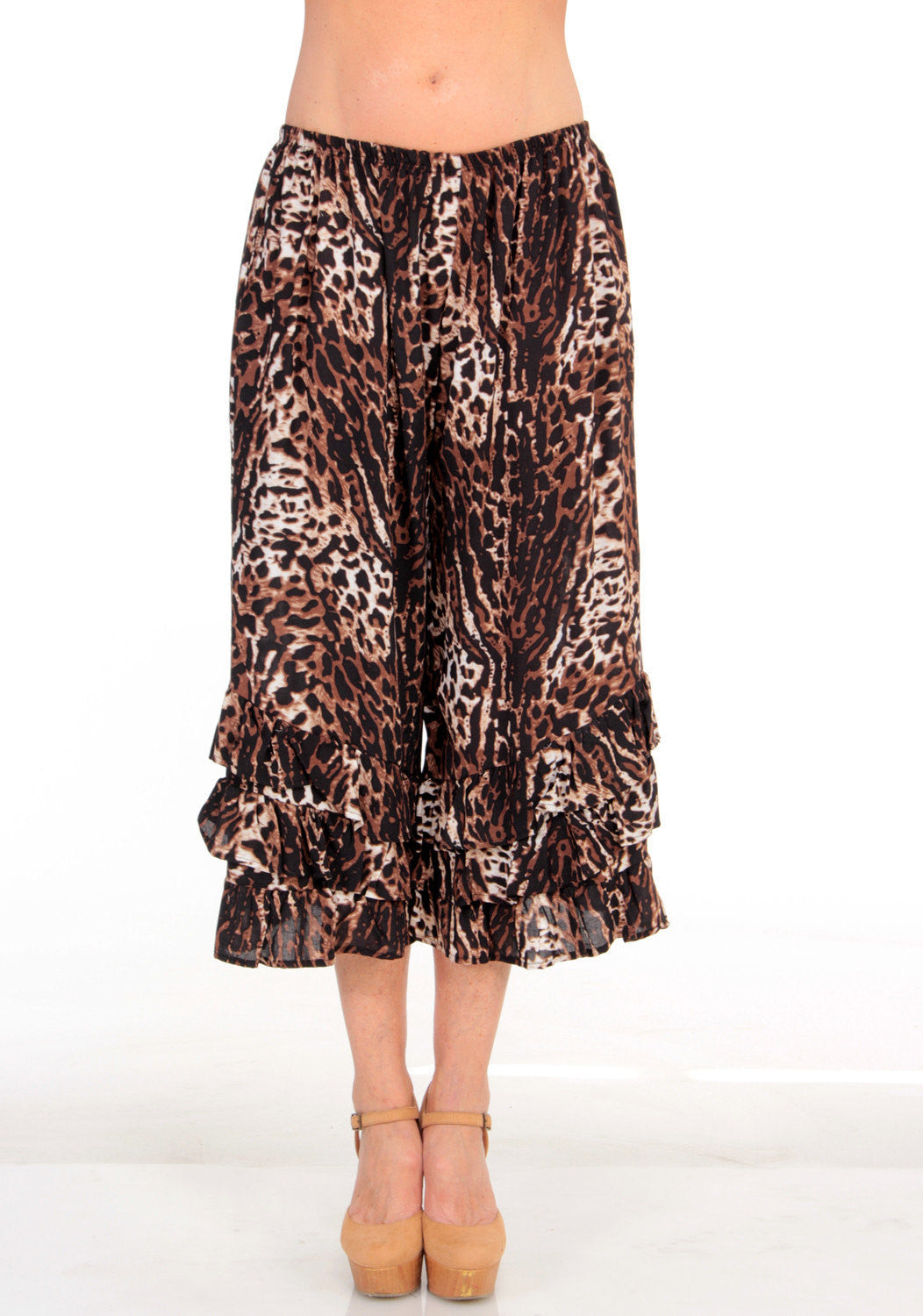 Leopard "Kitty" Ruffle PantalOONie Bloomers have Pockets and are made with soft, lightweight, cool, chic and easy to wear Rayon Challis with elasticized waist. So many ways to wear them! Look great with our Black Lace or Black Rayon MICA Dress, your Mini dresses or with a crop top!